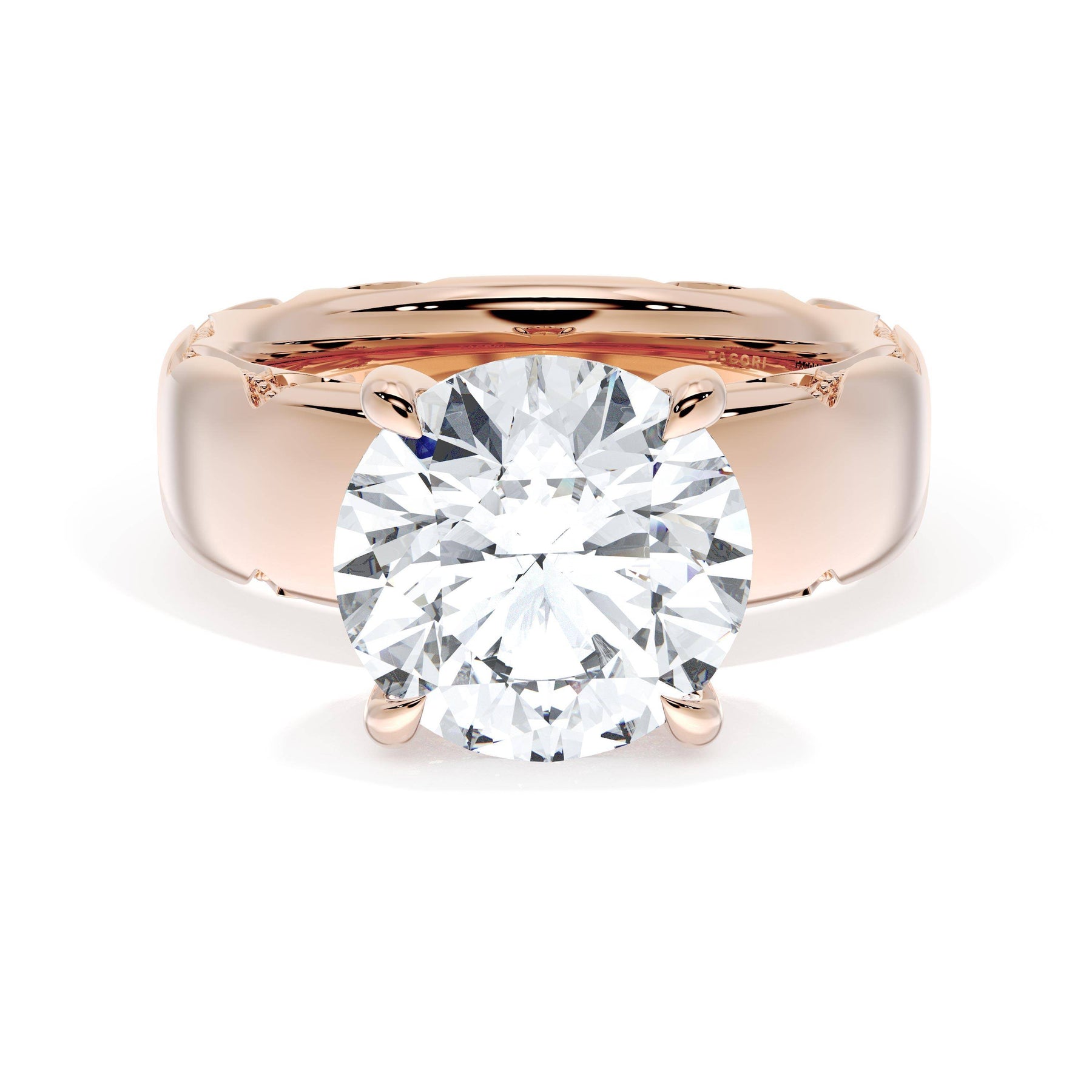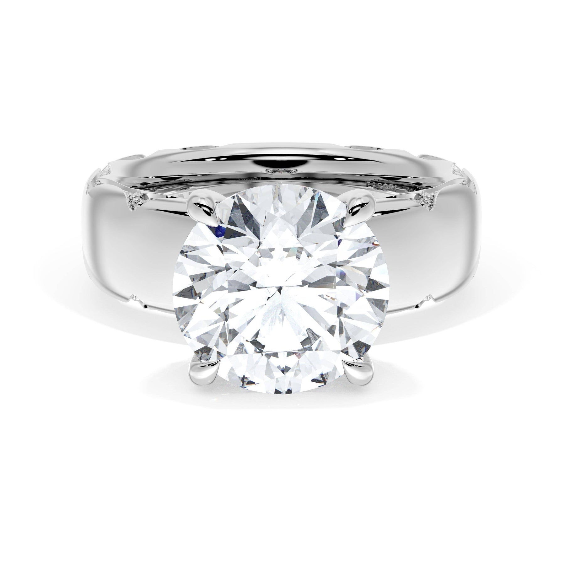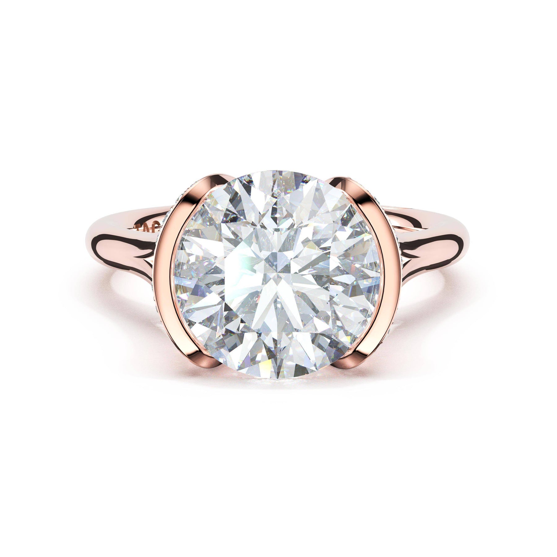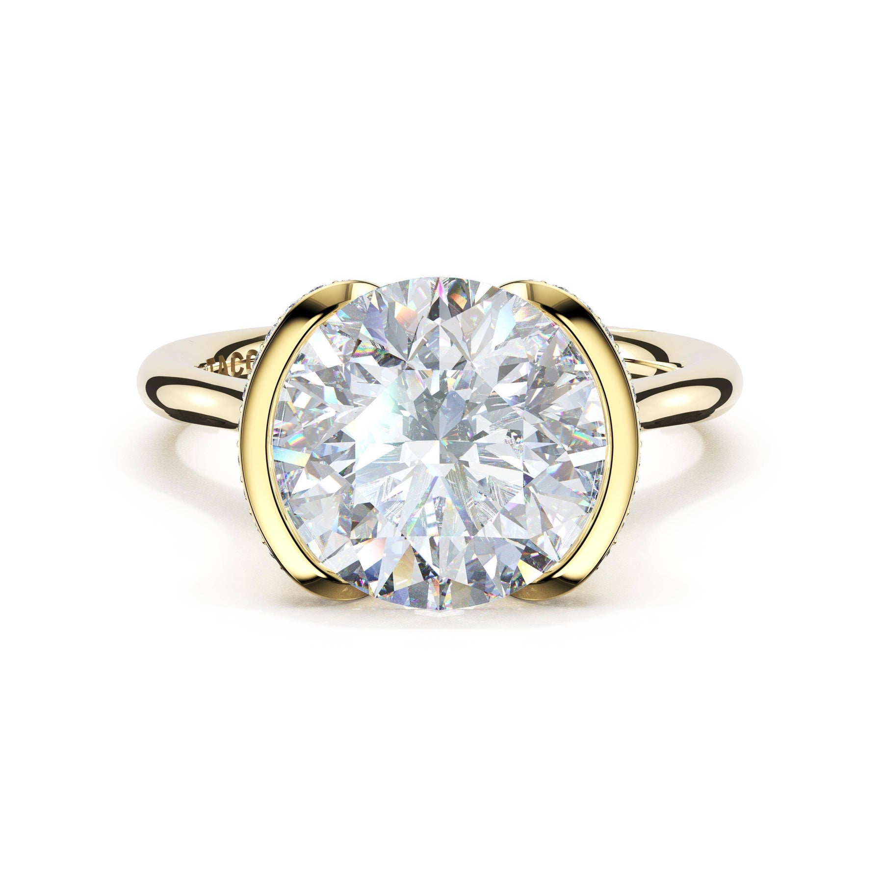 The round-brilliant solitaire sits on a Cathedral foundation with a hidden bloom, which adds the TACORI touch. A high-polish band of premium metals is studded with a diamond-studded Signature Crescent at the foundation