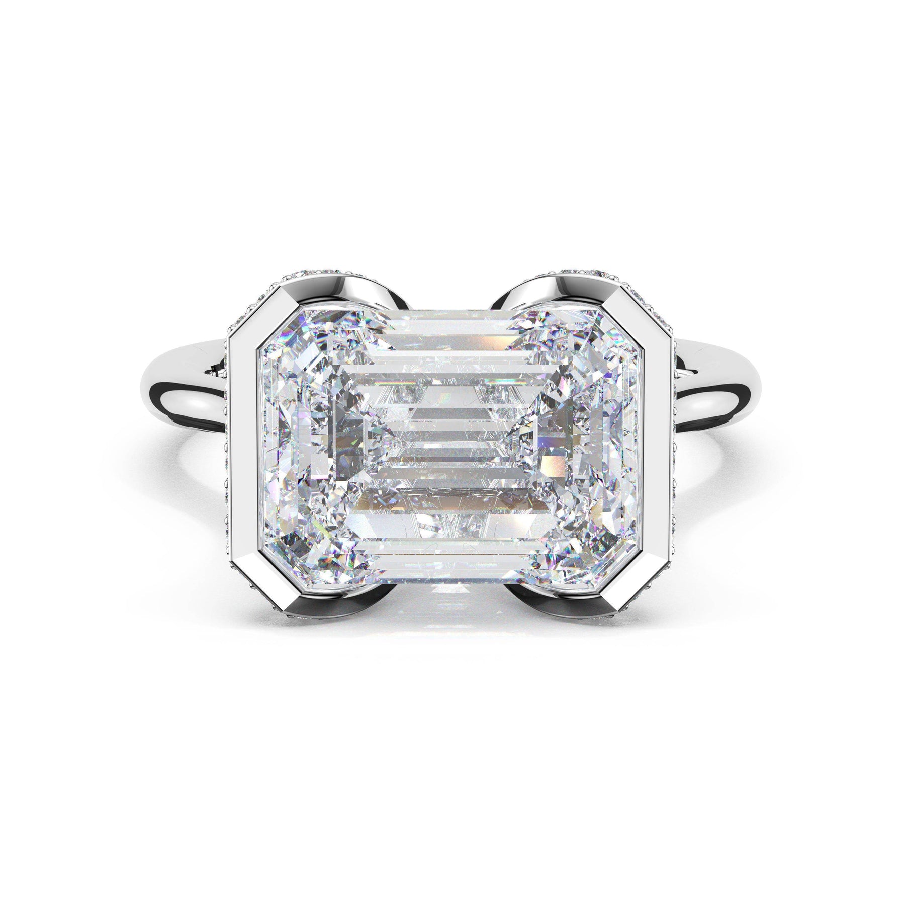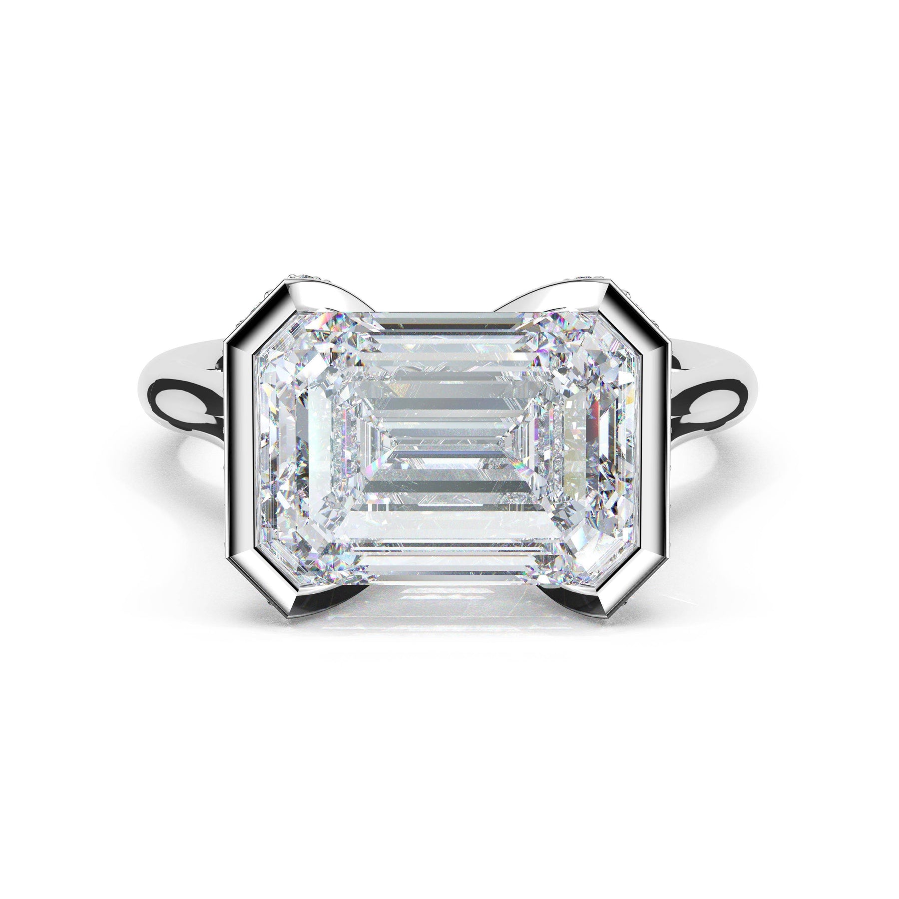 A tapering pavé halo outlines the girdle of a horizontally-set emerald-cut diamond. A diamond-studded Crescent accents the high-polish premium metal band.