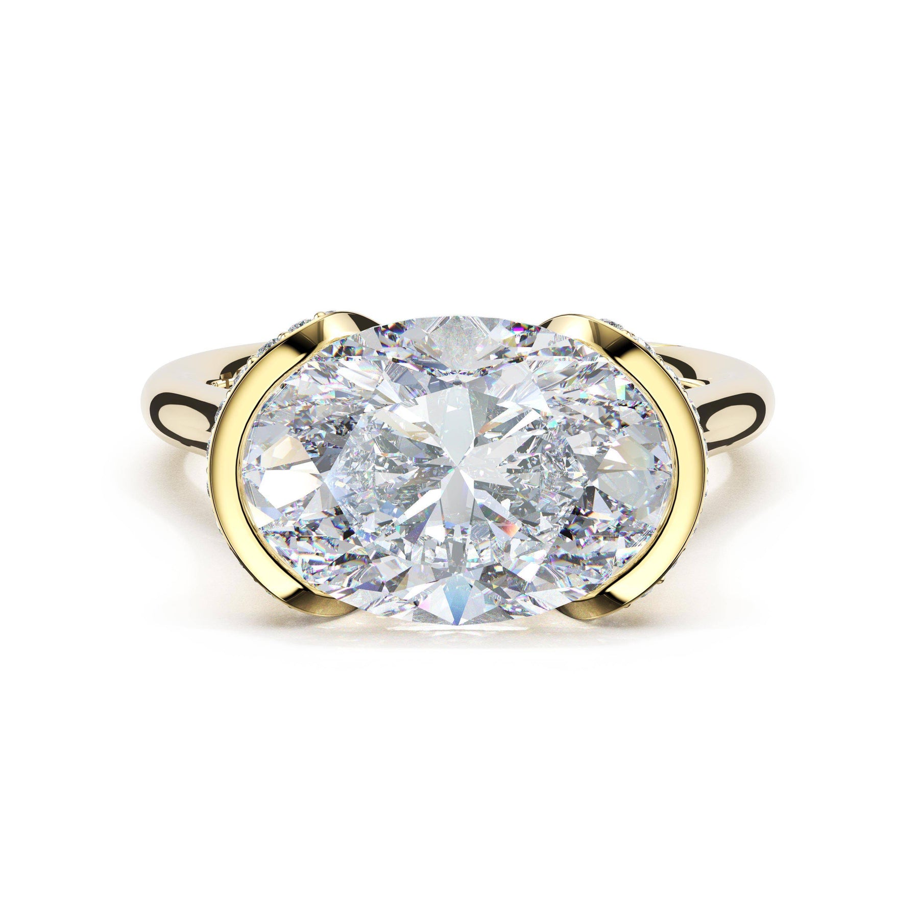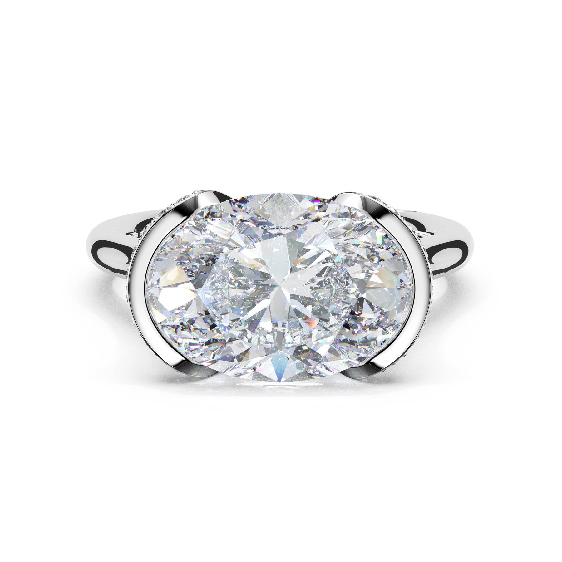 A tapering pavé halo outlines the girdle of a horizontally-set oval-cut diamond. A diamond-studded Crescent accents the high-polish premium metal band.