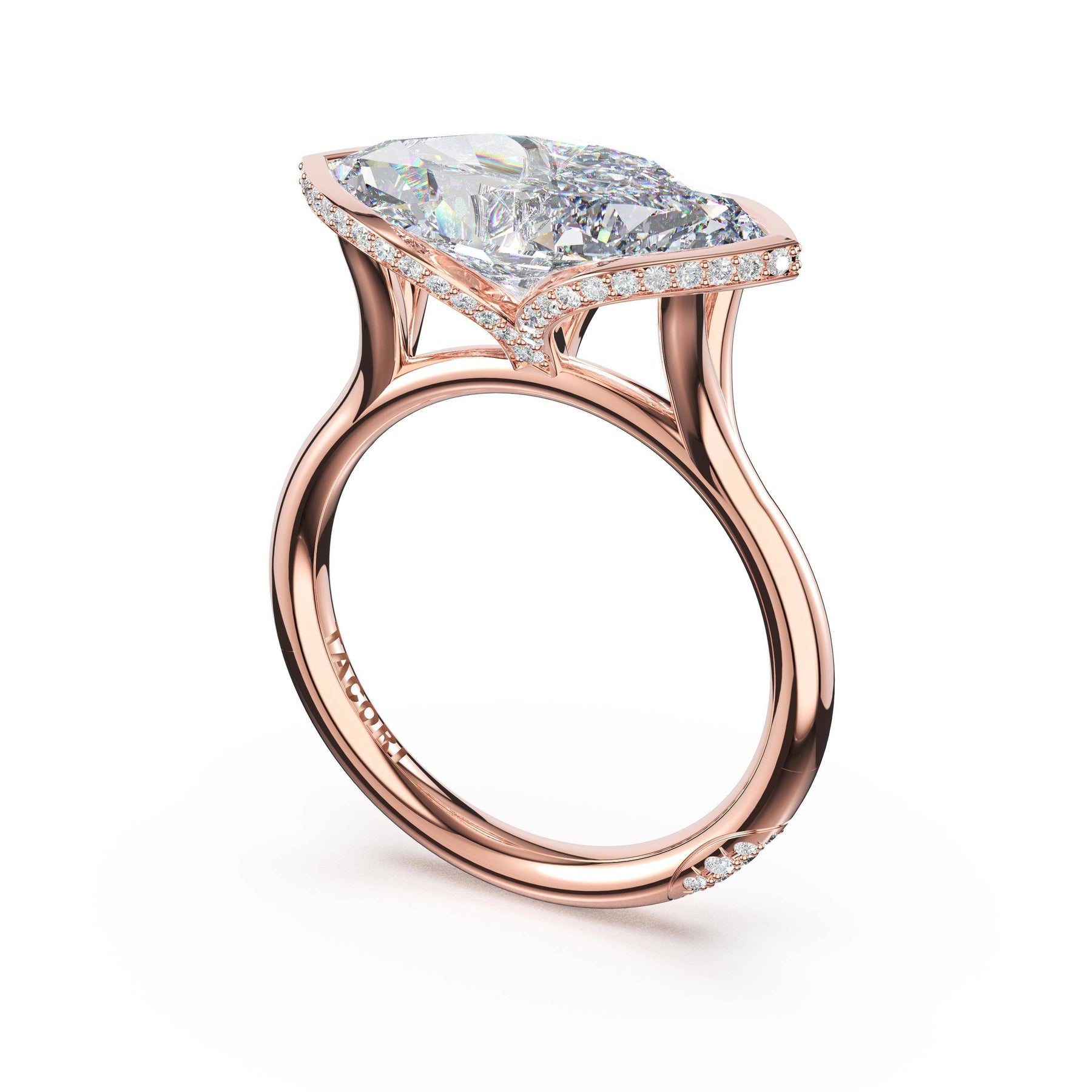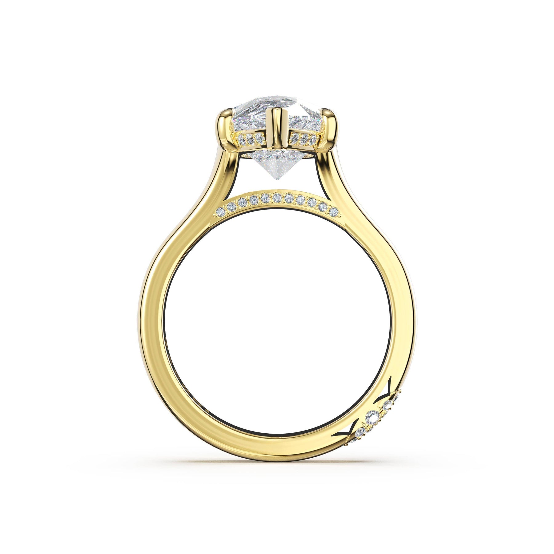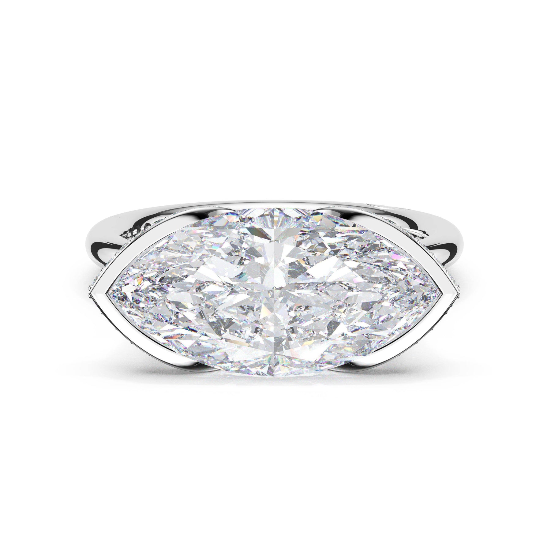 A tapering pavé halo outlines the girdle of a horizontally-set marquise-cut diamond. A diamond-studded Crescent accents the high-polish premium metal band.