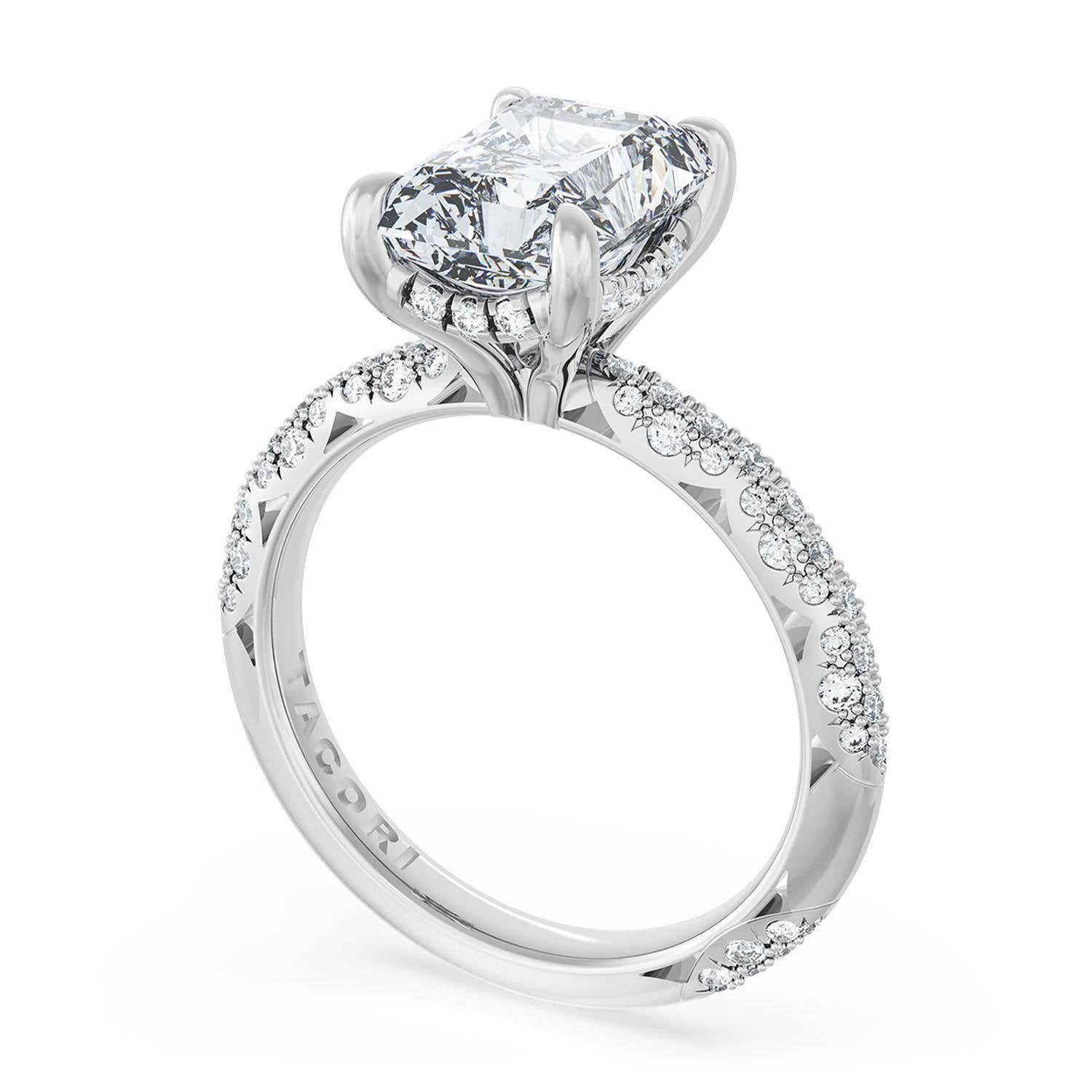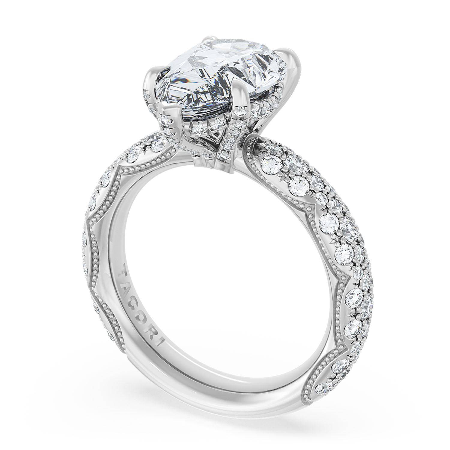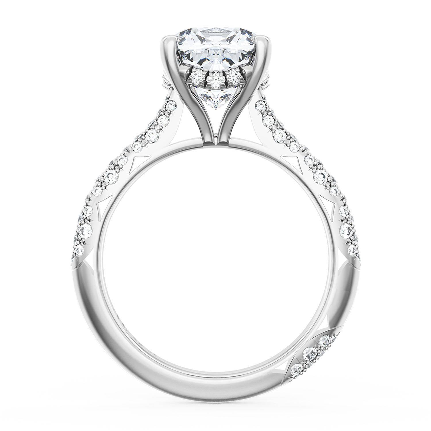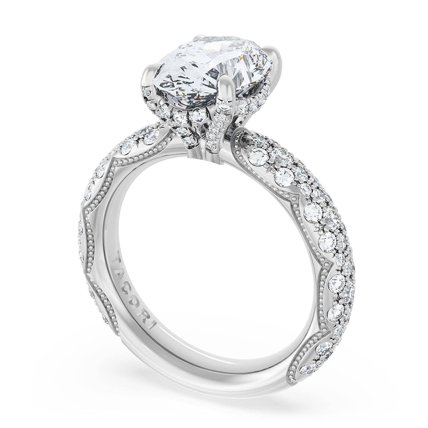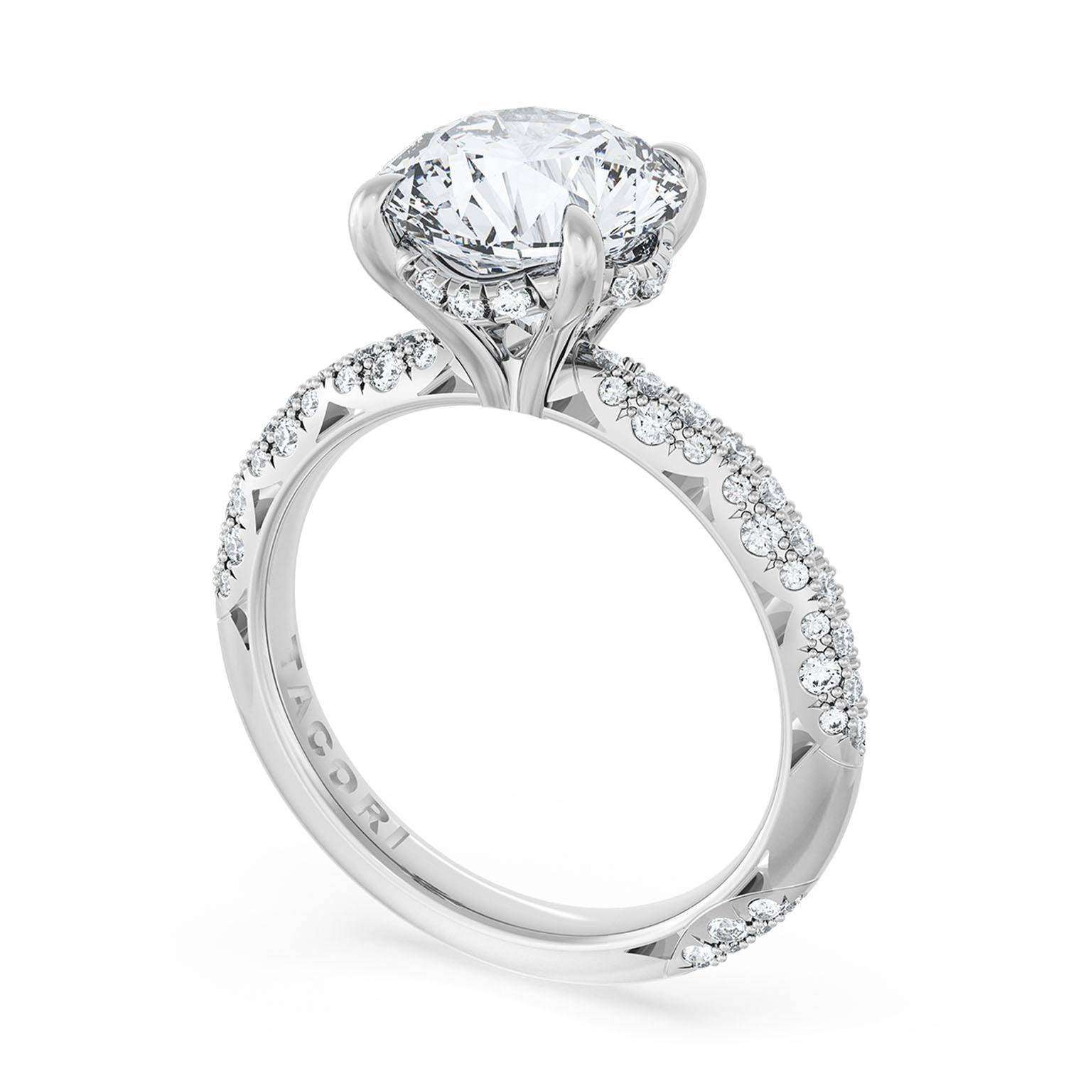 A cathedral foundation is accented with a hidden bloom of diamonds, while the Founder's Crescent Fabric wraps around the ceiling of the ring. The ring is finished with a diamond-studded Signature Crescent.