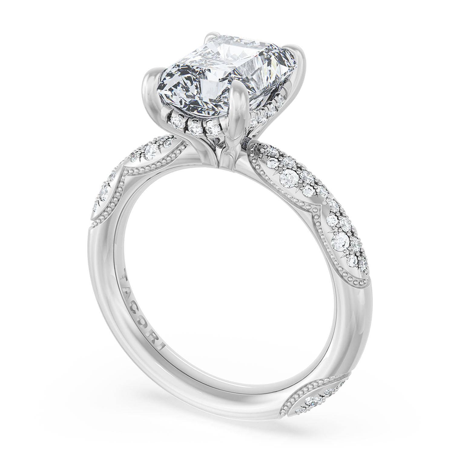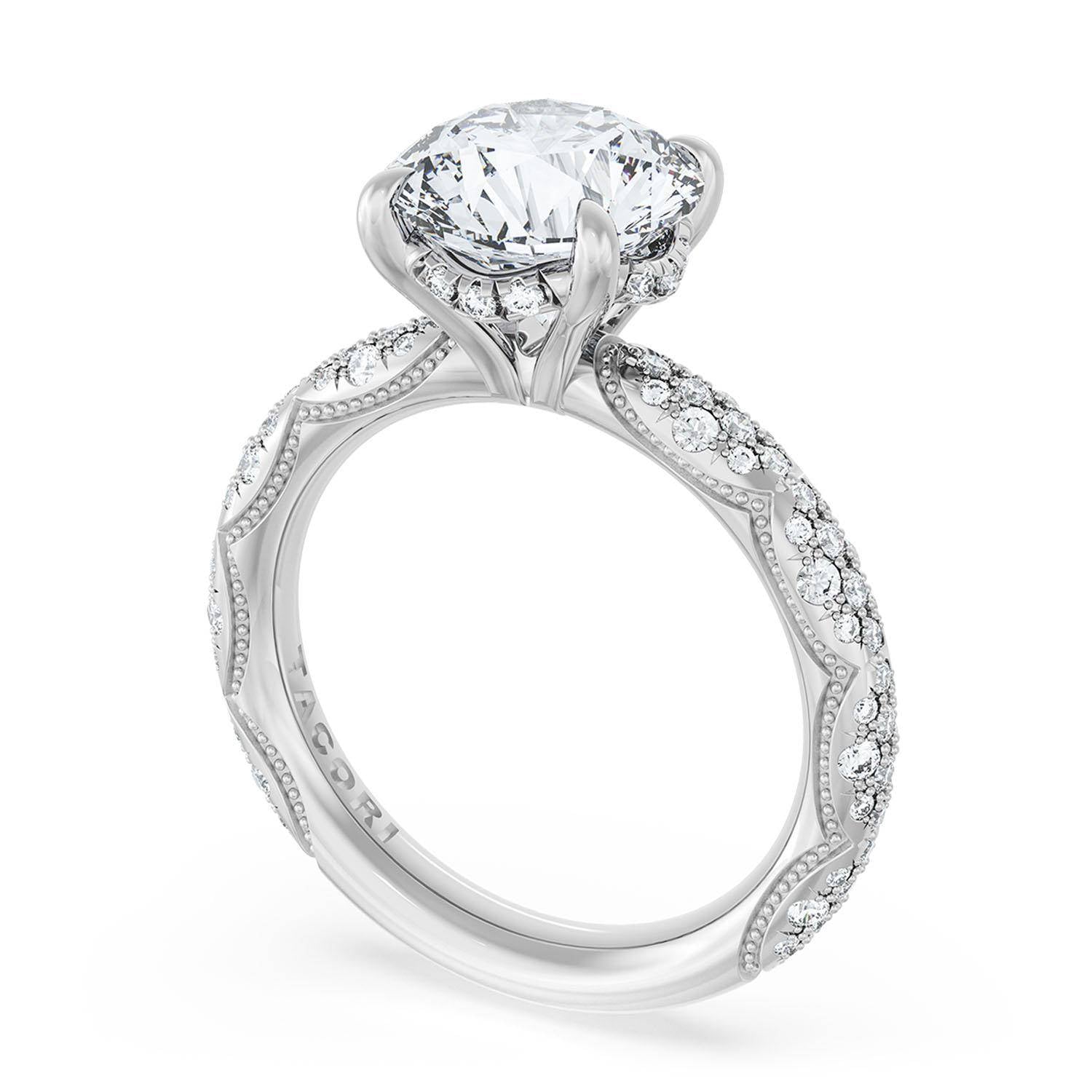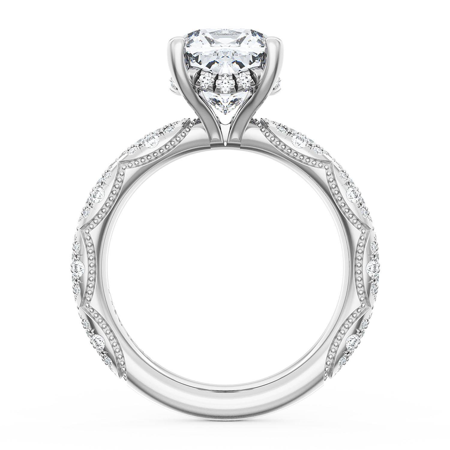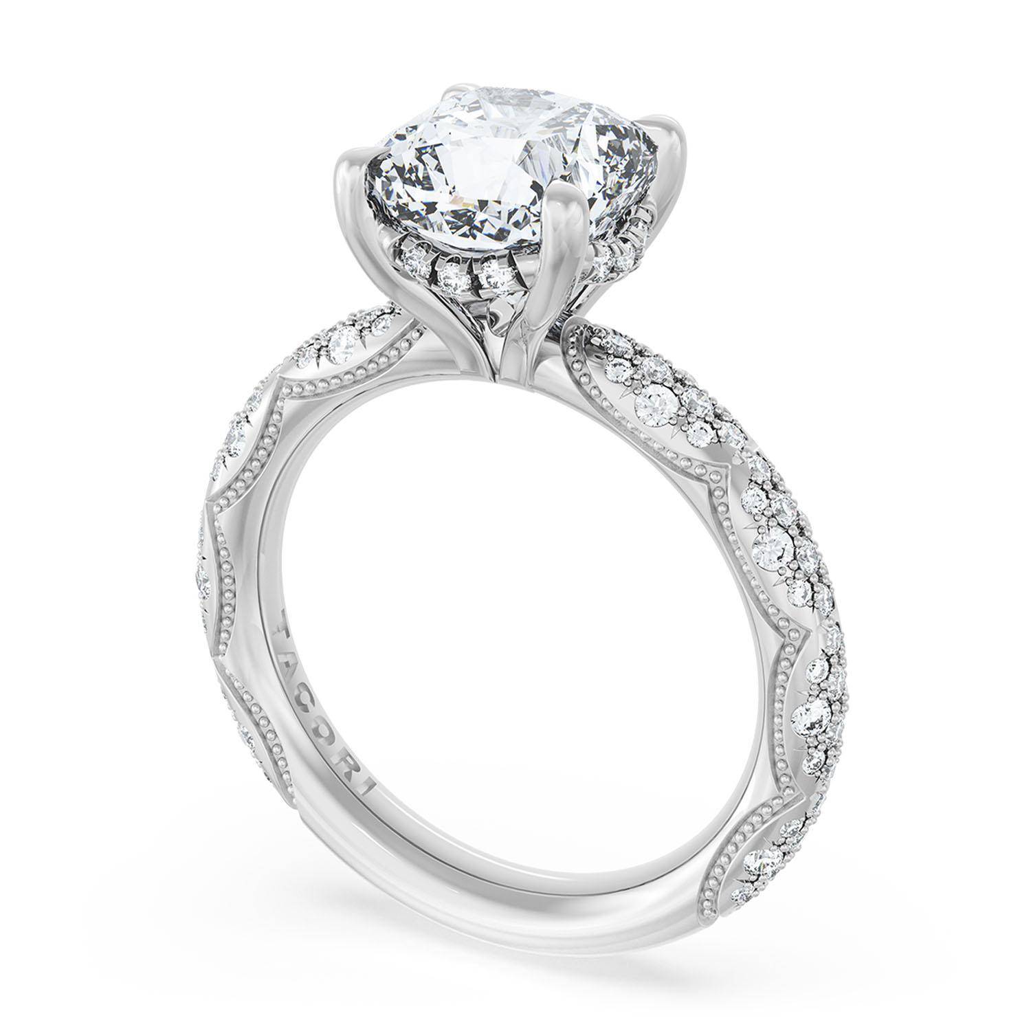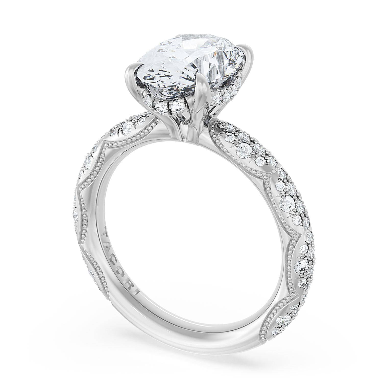 A cathedral foundation is accented with a hidden bloom of diamonds, while the Founder's Crescent Fabric wraps around the ceiling of the ring. The ring is finished with a diamond-studded Signature Crescent.