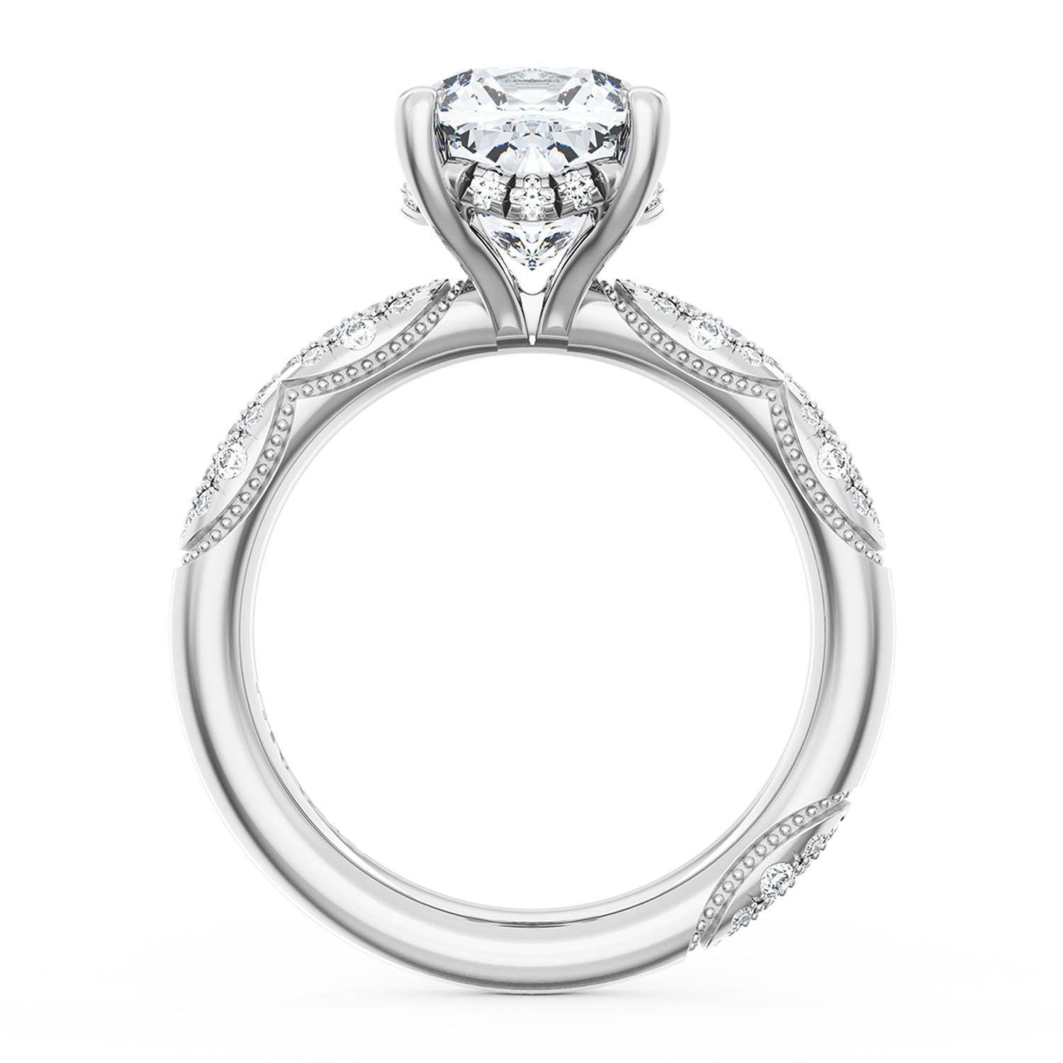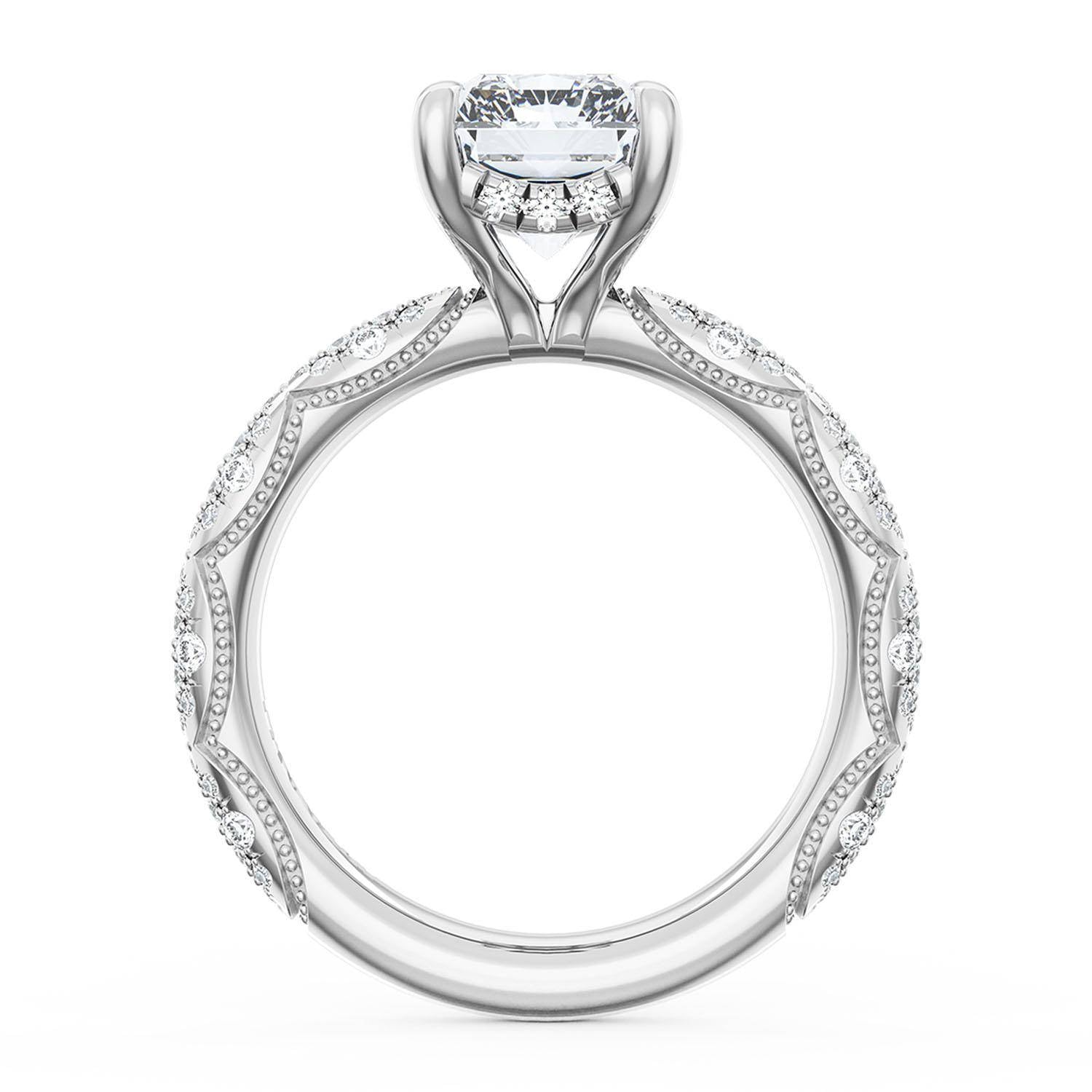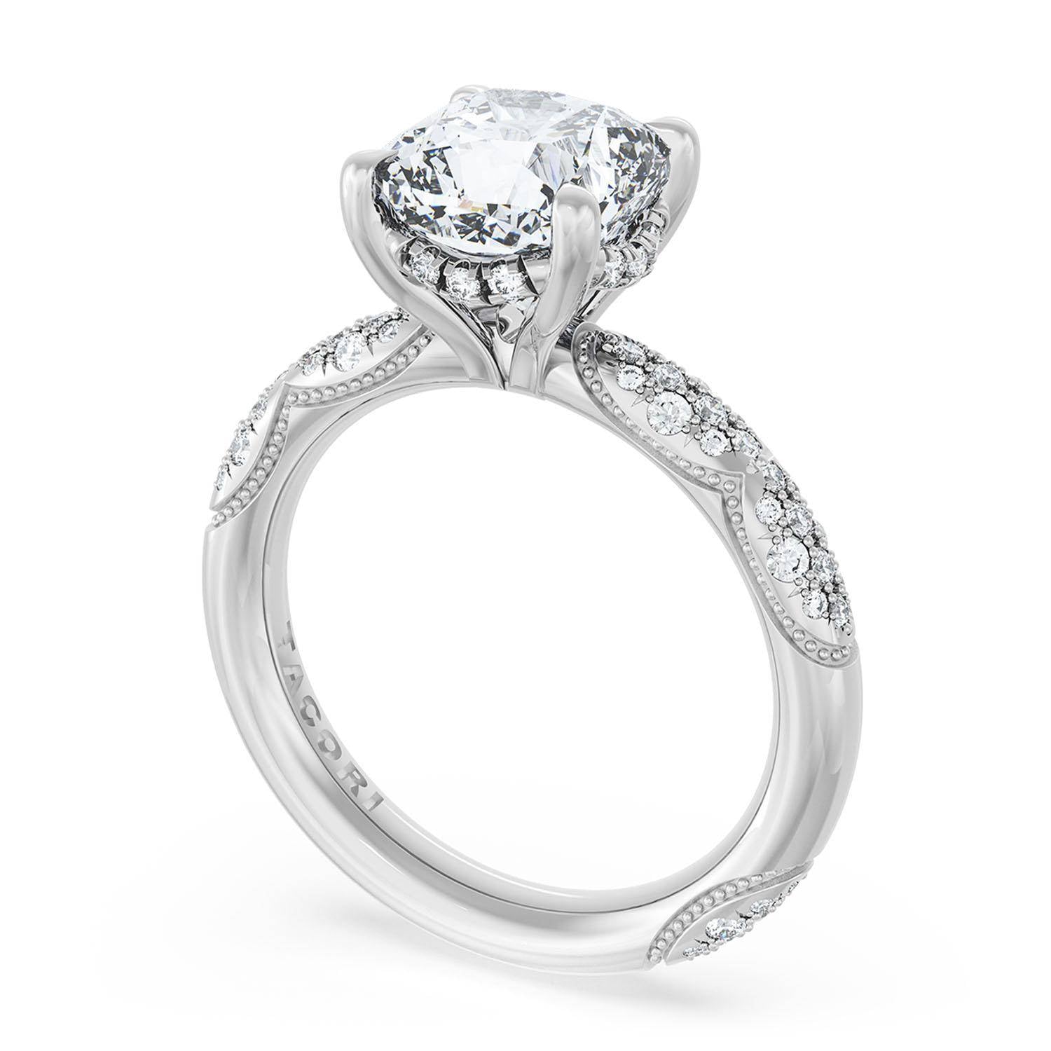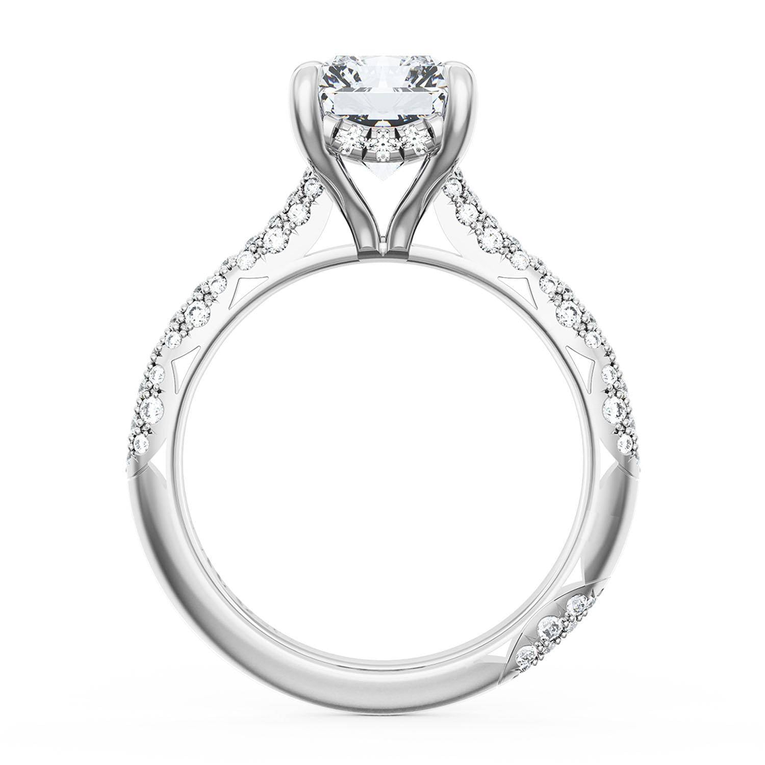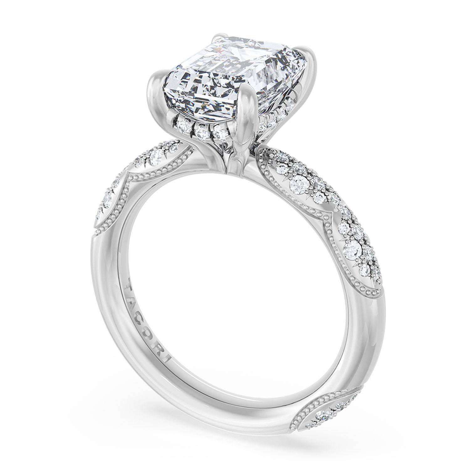 A cathedral foundation is accented with a hidden bloom of diamonds, while the Founder's Crescent Fabric wraps around the ceiling of the ring. The ring is finished with a diamond-studded Signature Crescent.