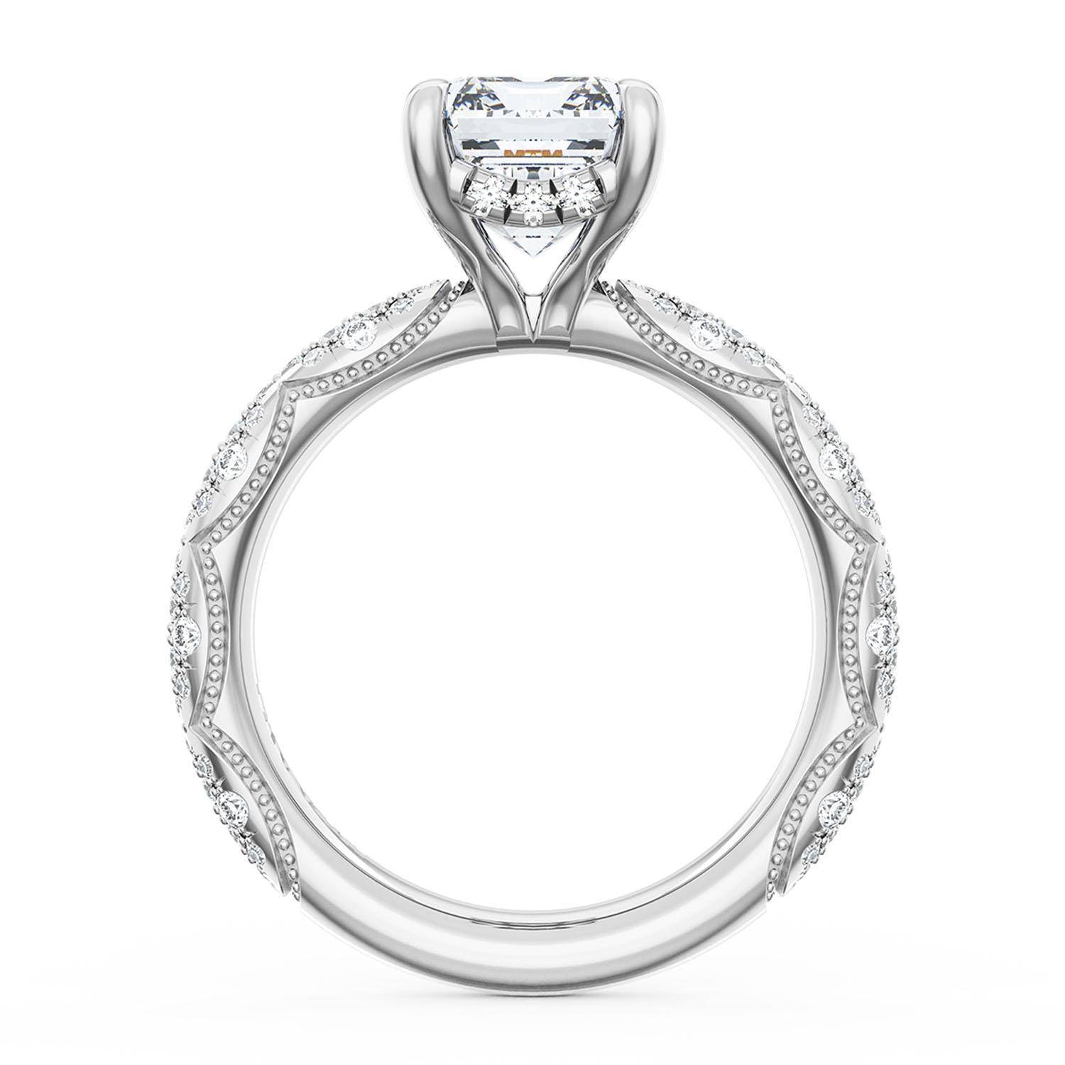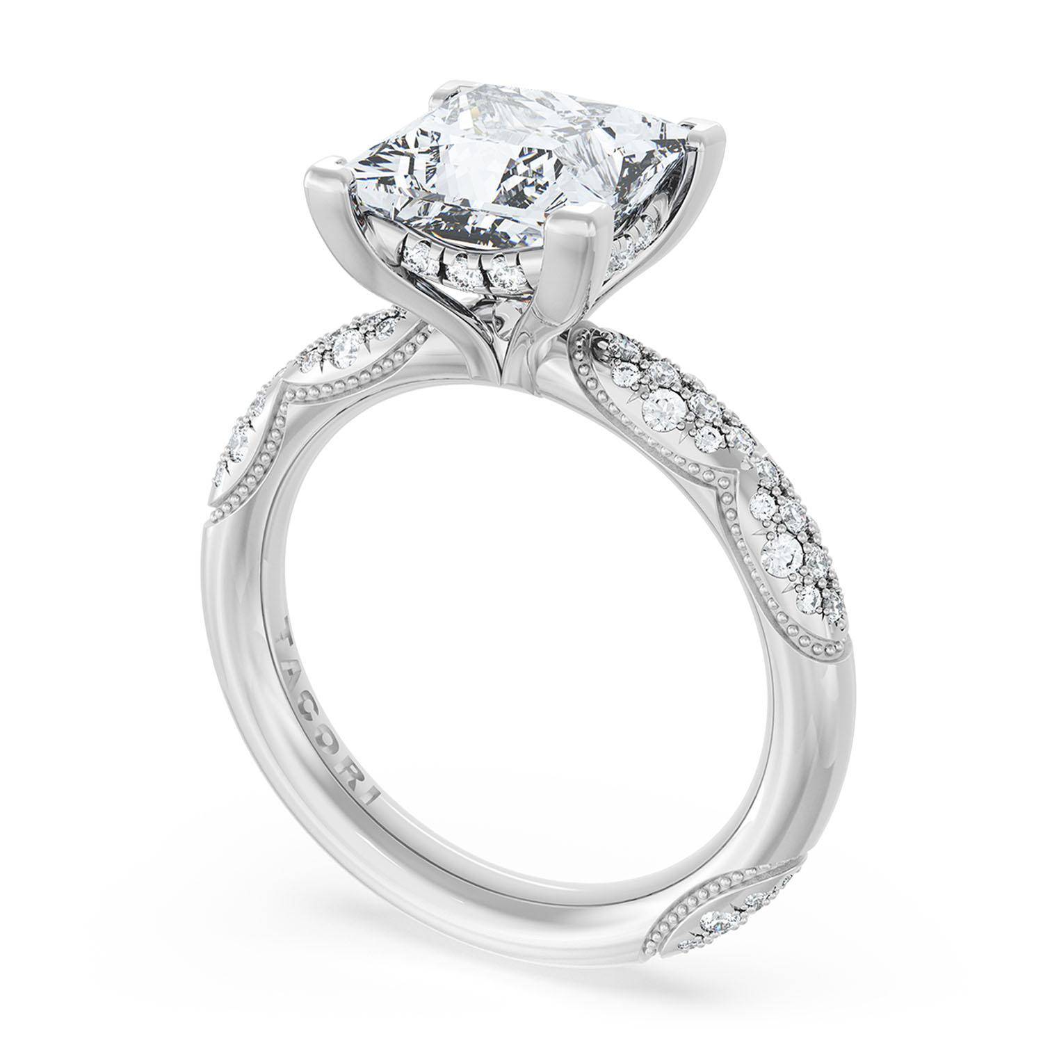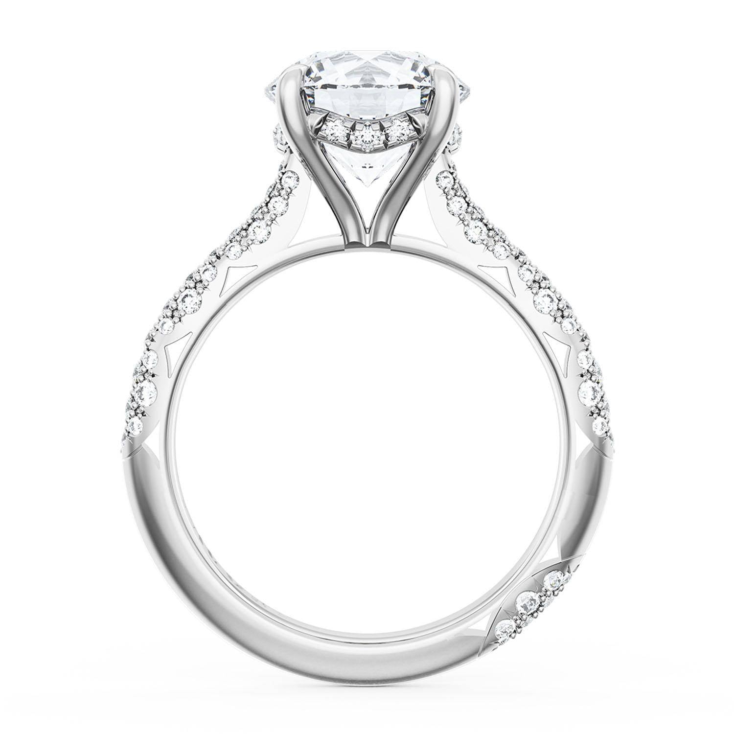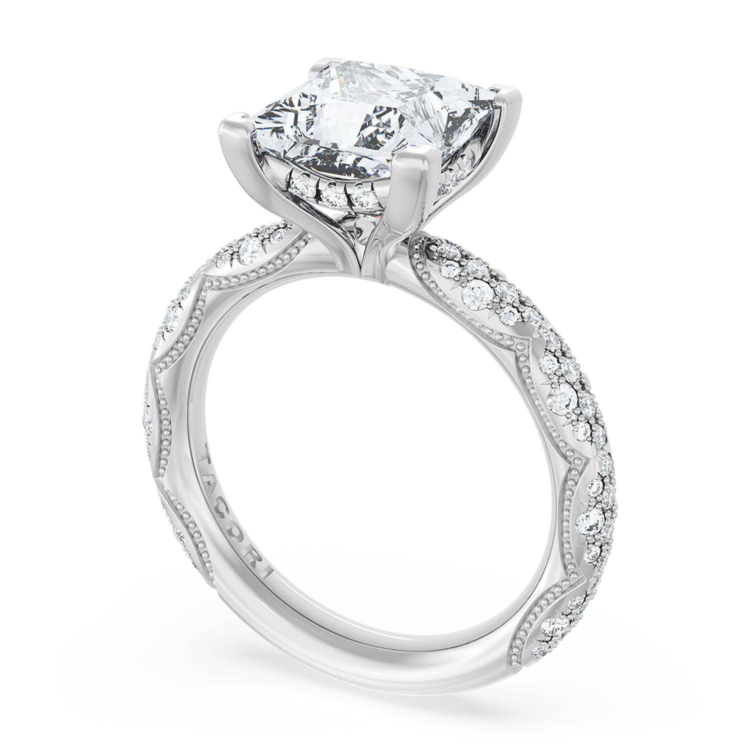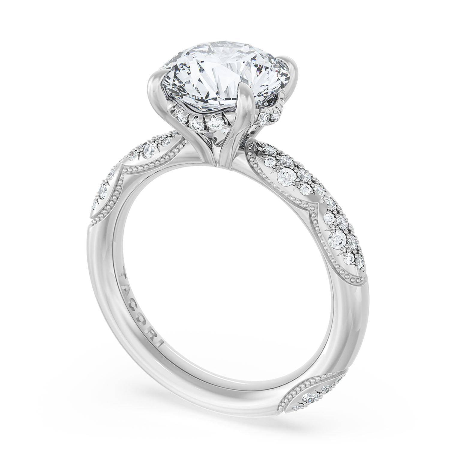 A cathedral foundation is accented with a hidden bloom of diamonds, while the Founder's Crescent Fabric wraps around the ceiling of the ring. The ring is finished with a diamond-studded Signature Crescent.
