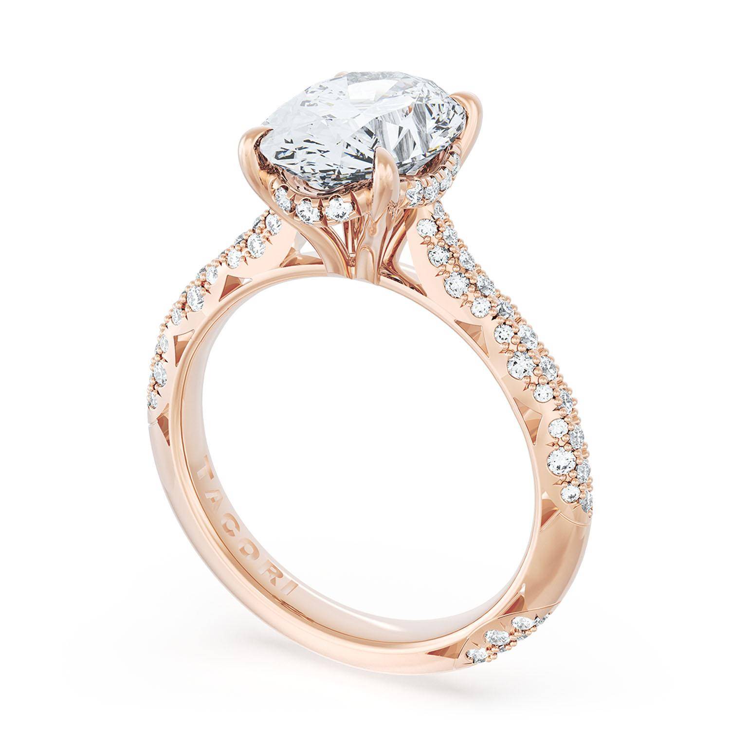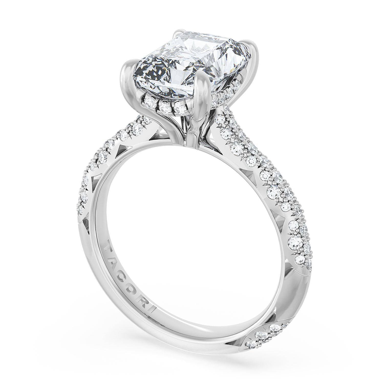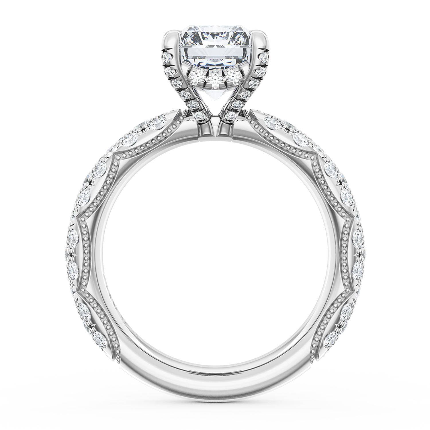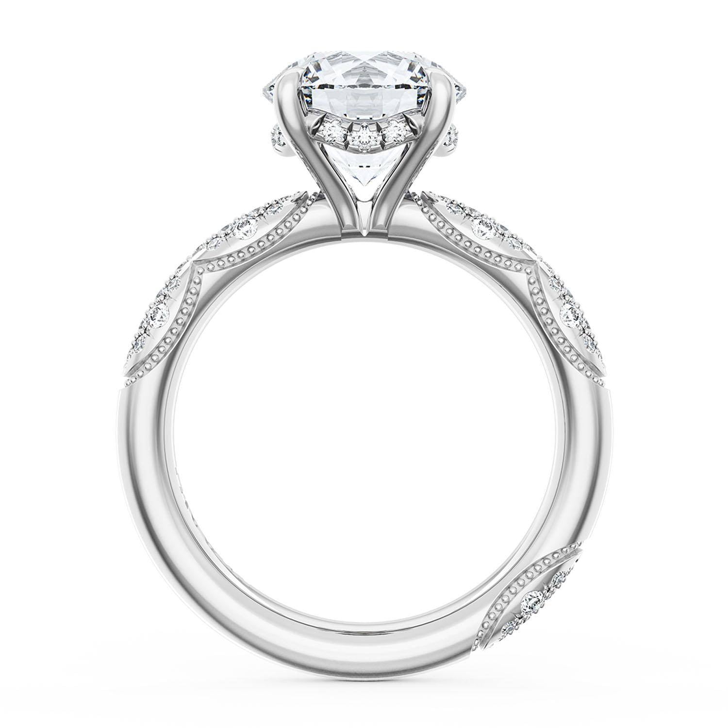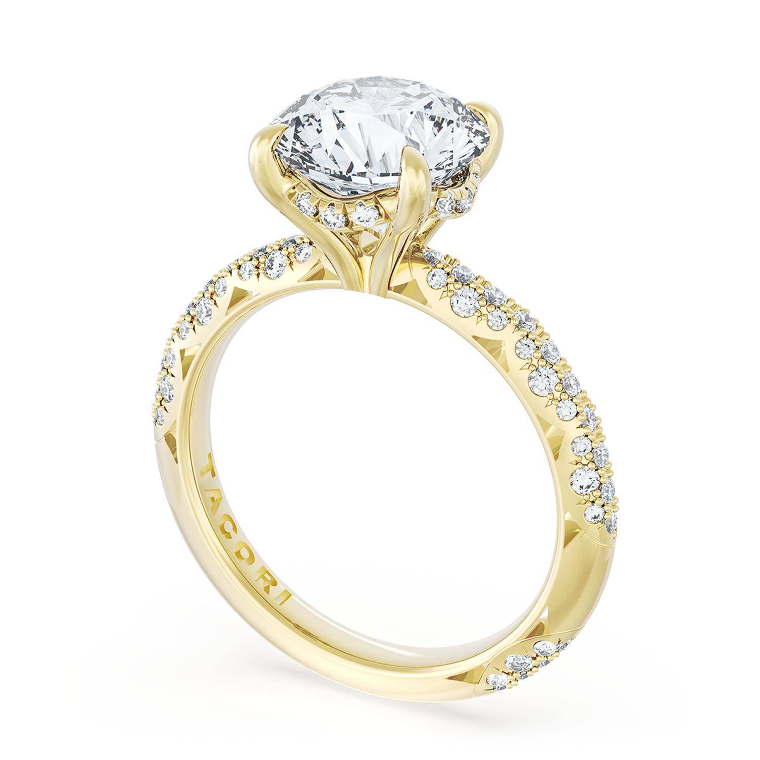 A cathedral foundation is accented with a hidden bloom of diamonds, while the Founder's Crescent Fabric wraps around the ceiling of the ring. The ring is finished with a diamond-studded Signature Crescent.