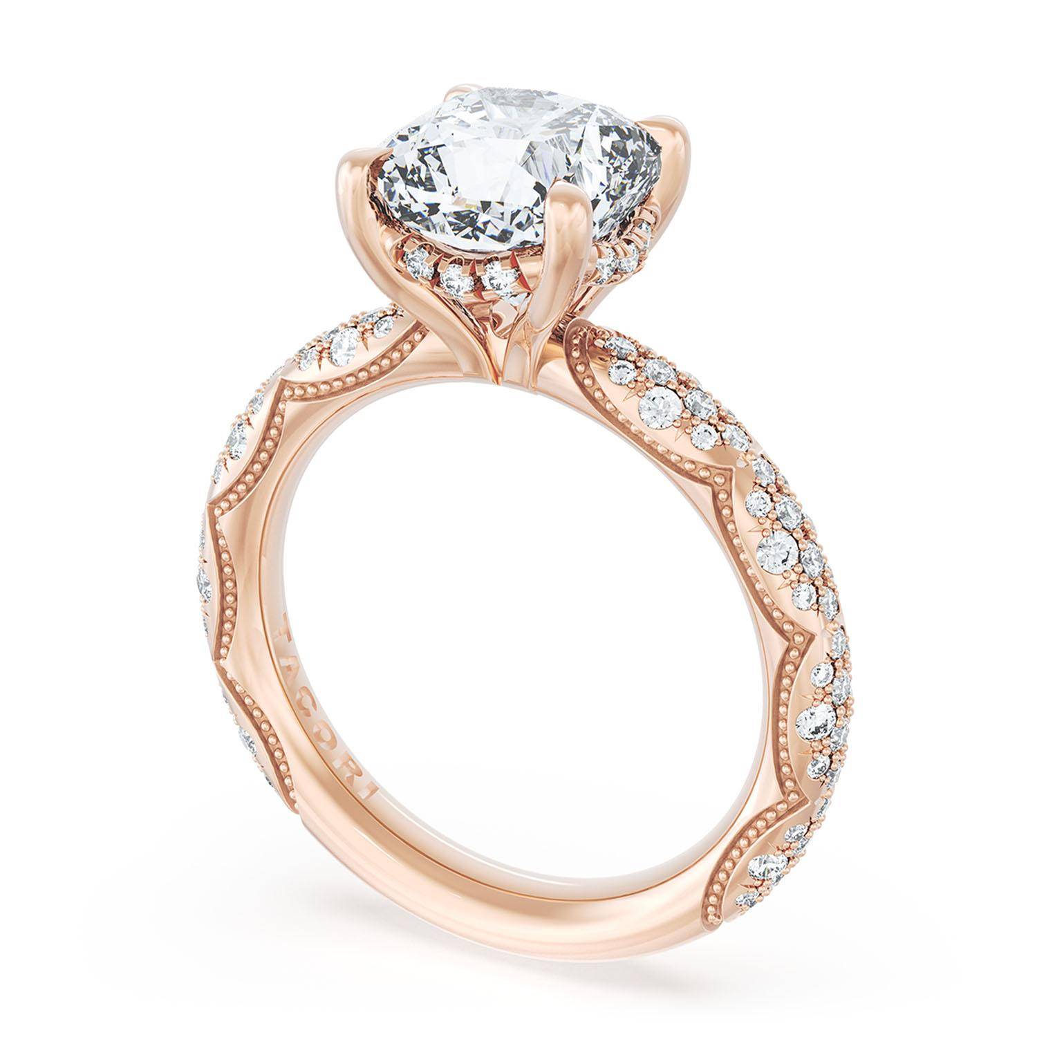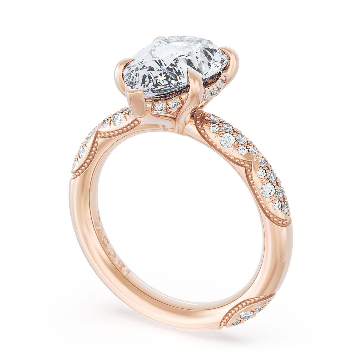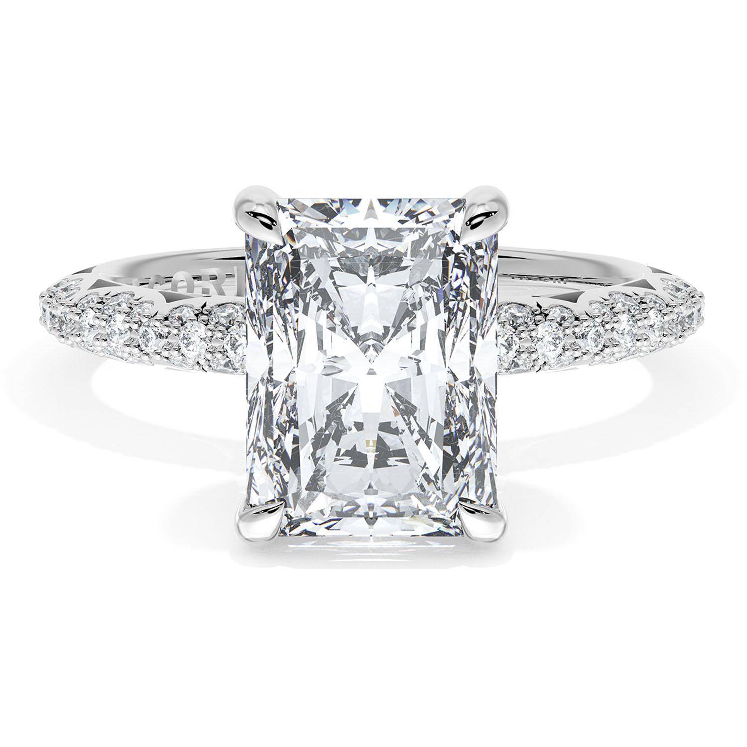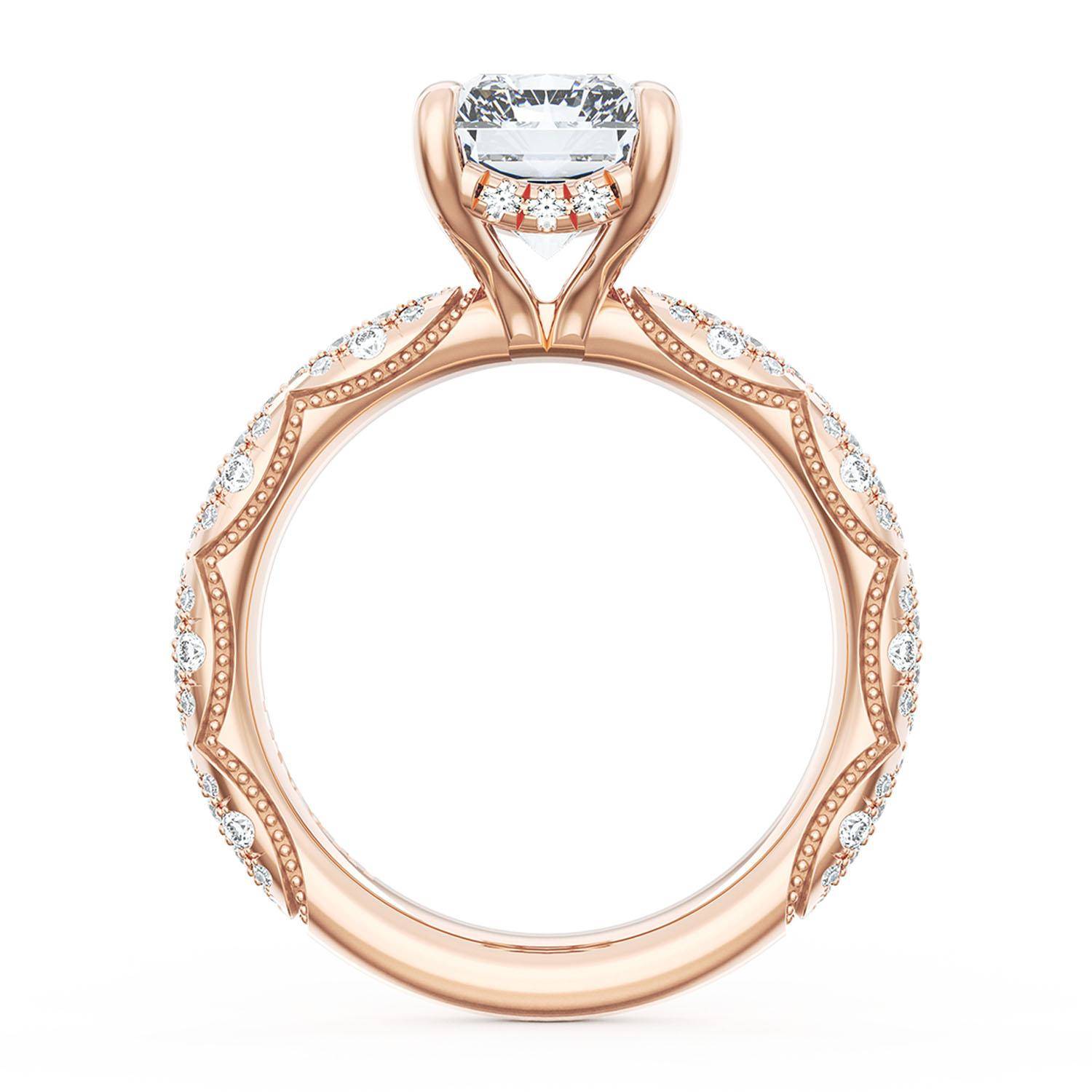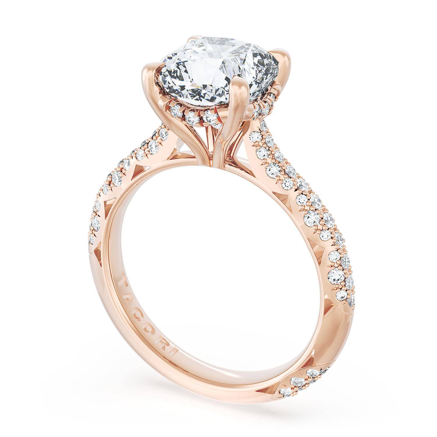A cathedral foundation is accented with a hidden bloom of diamonds, while the Founder's Crescent Fabric wraps around the ceiling of the ring. The ring is finished with a diamond-studded Signature Crescent.