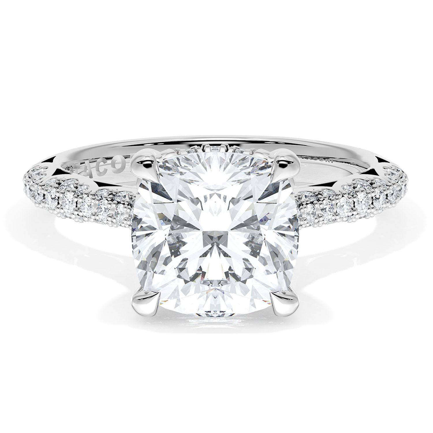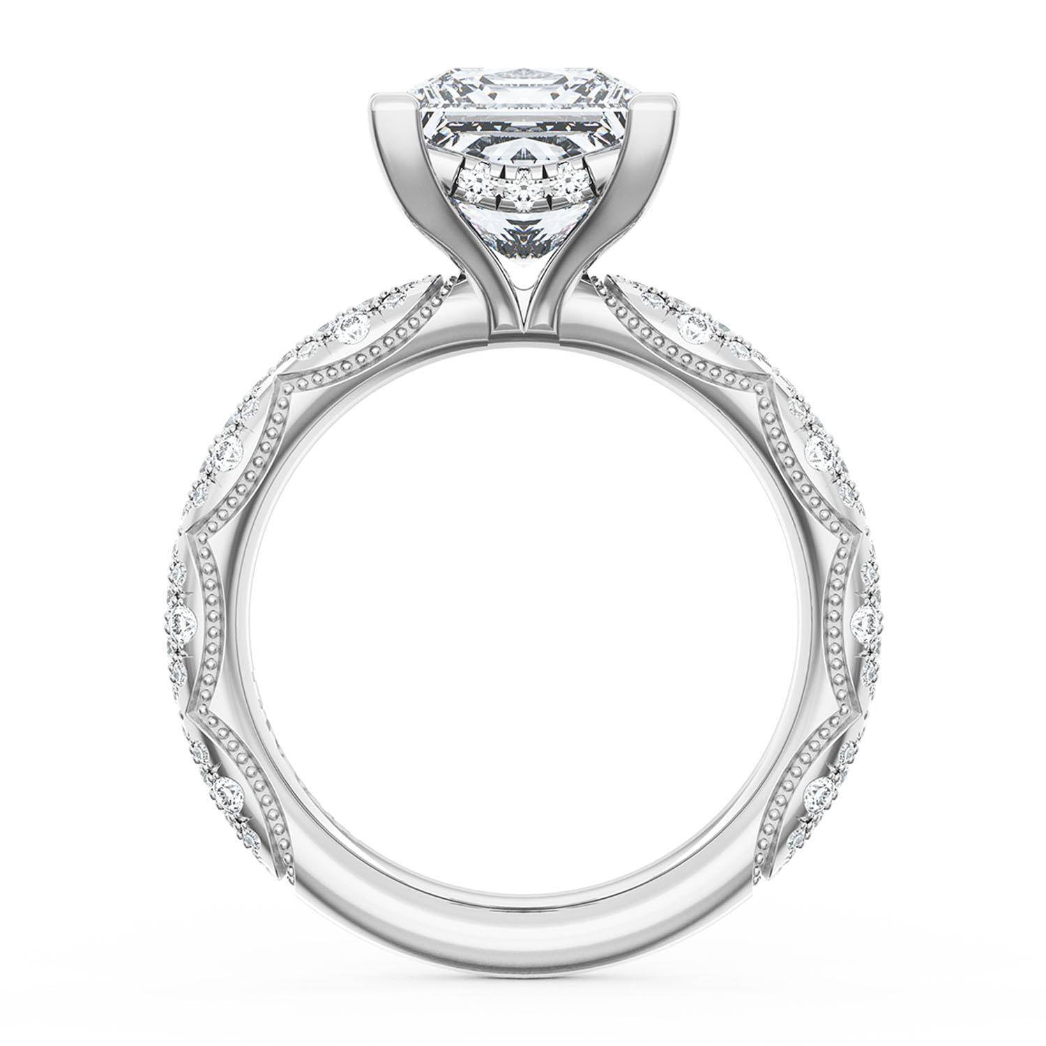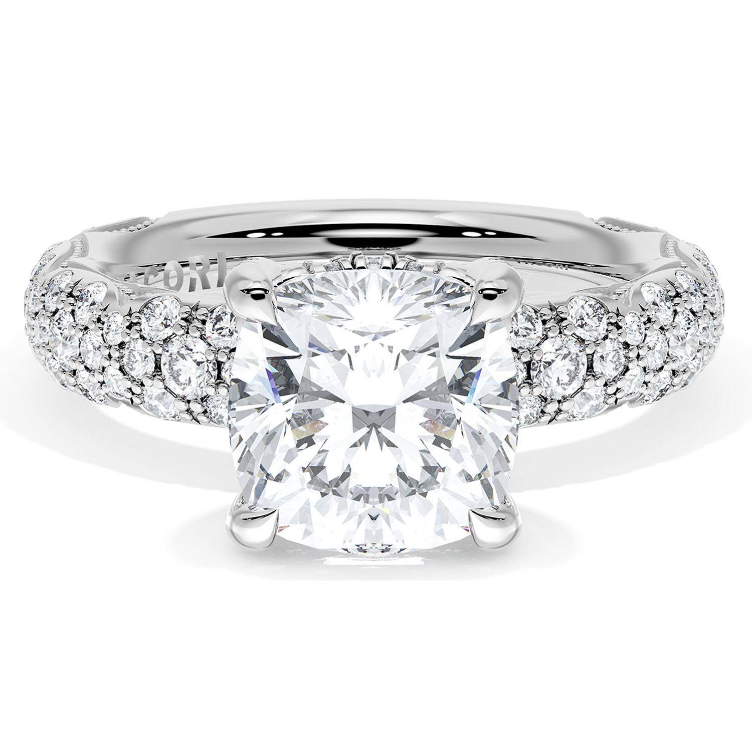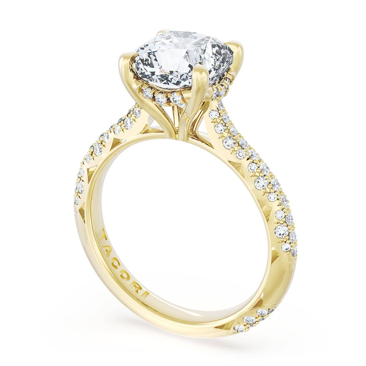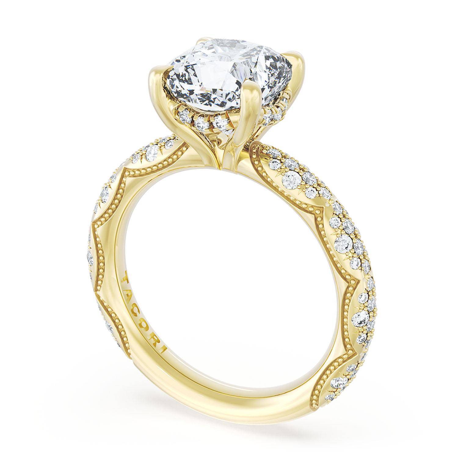 A cathedral foundation is accented with a hidden bloom of diamonds, while the Founder's Crescent Fabric wraps around the ceiling of the ring. The ring is finished with a diamond-studded Signature Crescent.