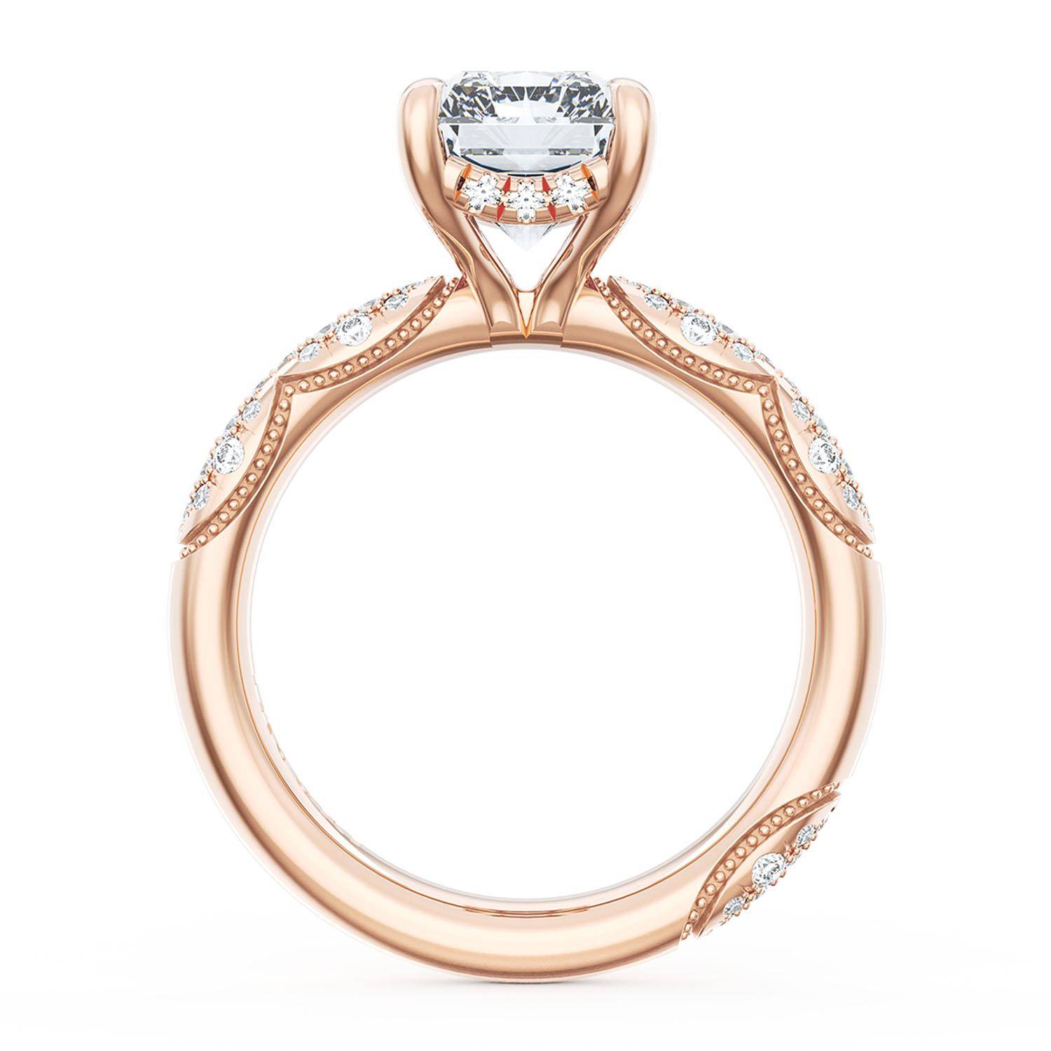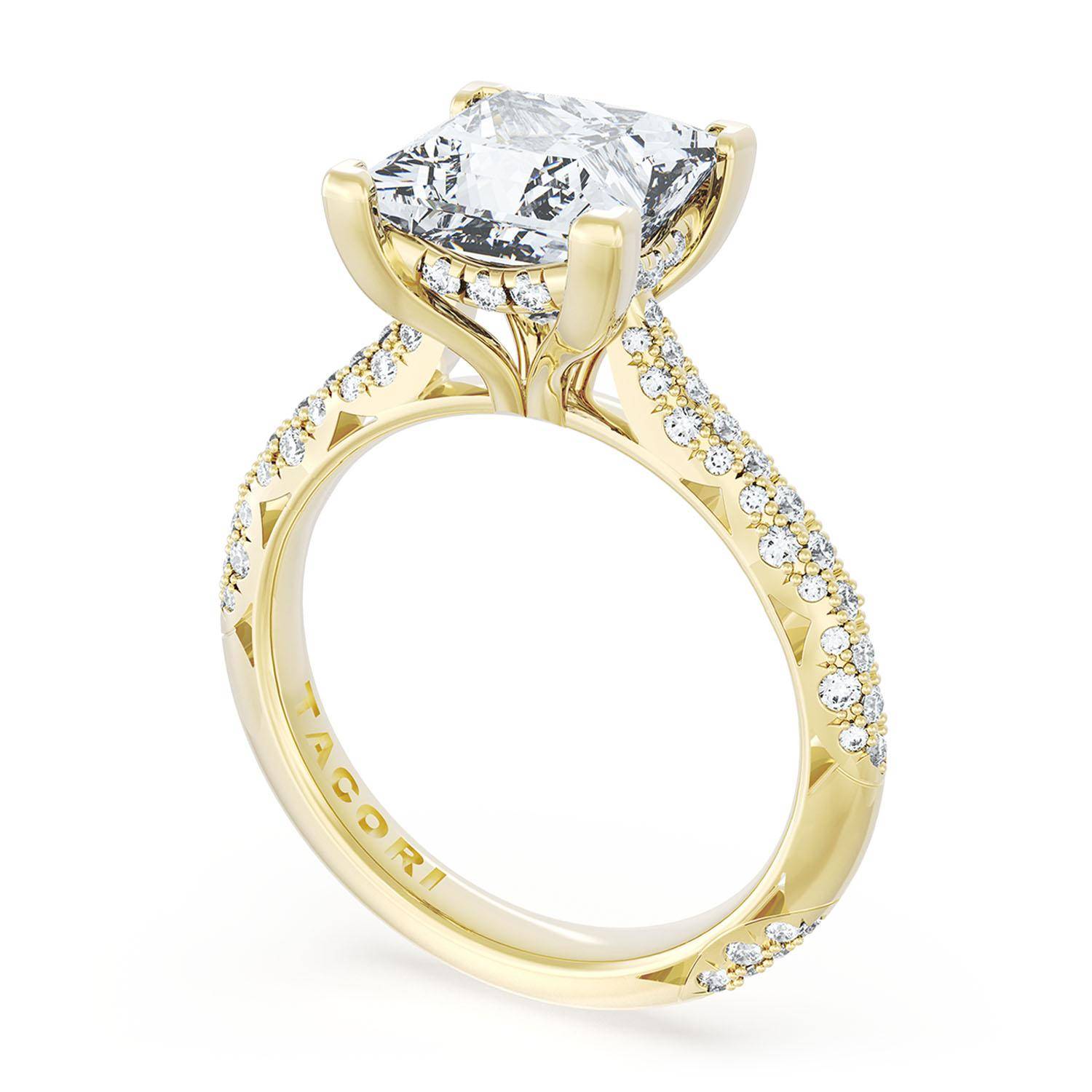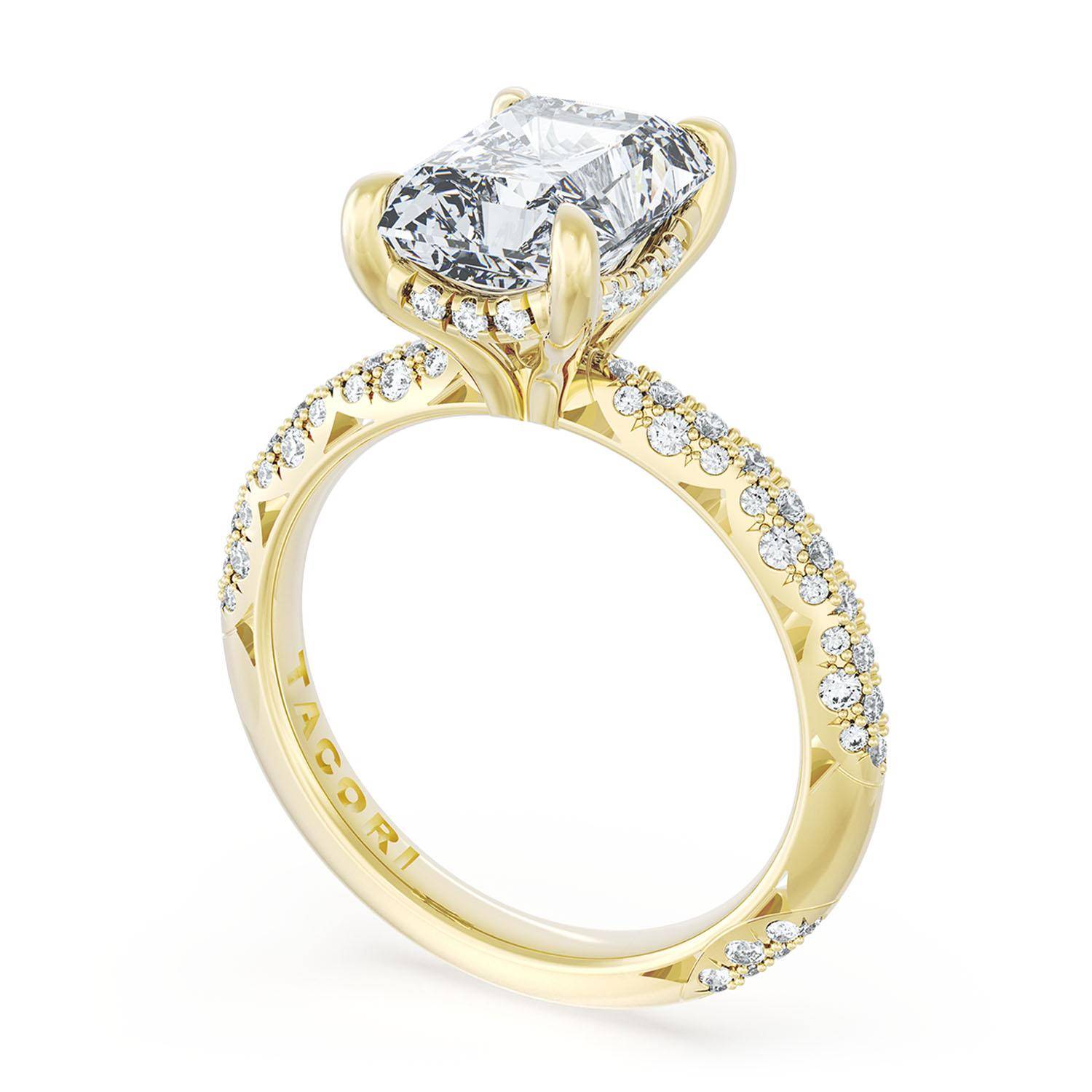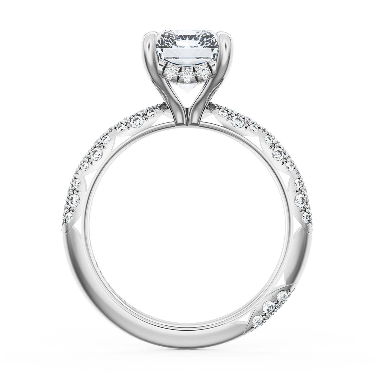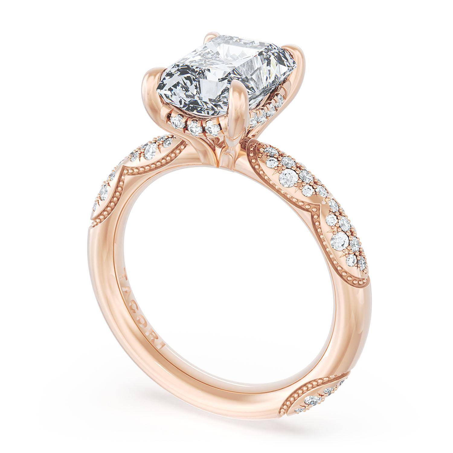A cathedral foundation is accented with a hidden bloom of diamonds, while the Founder's Crescent Fabric wraps around the ceiling of the ring. The ring is finished with a diamond-studded Signature Crescent.