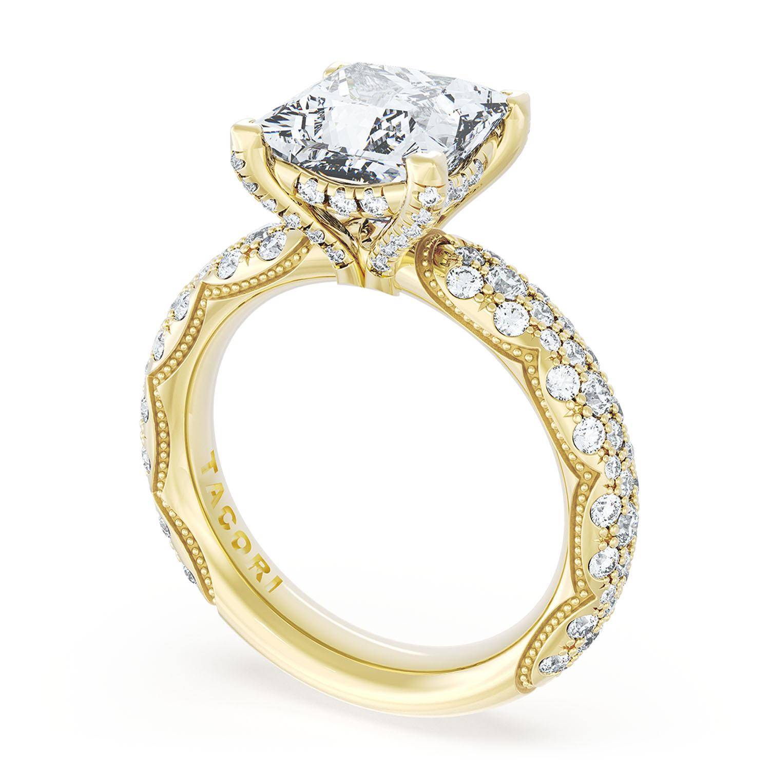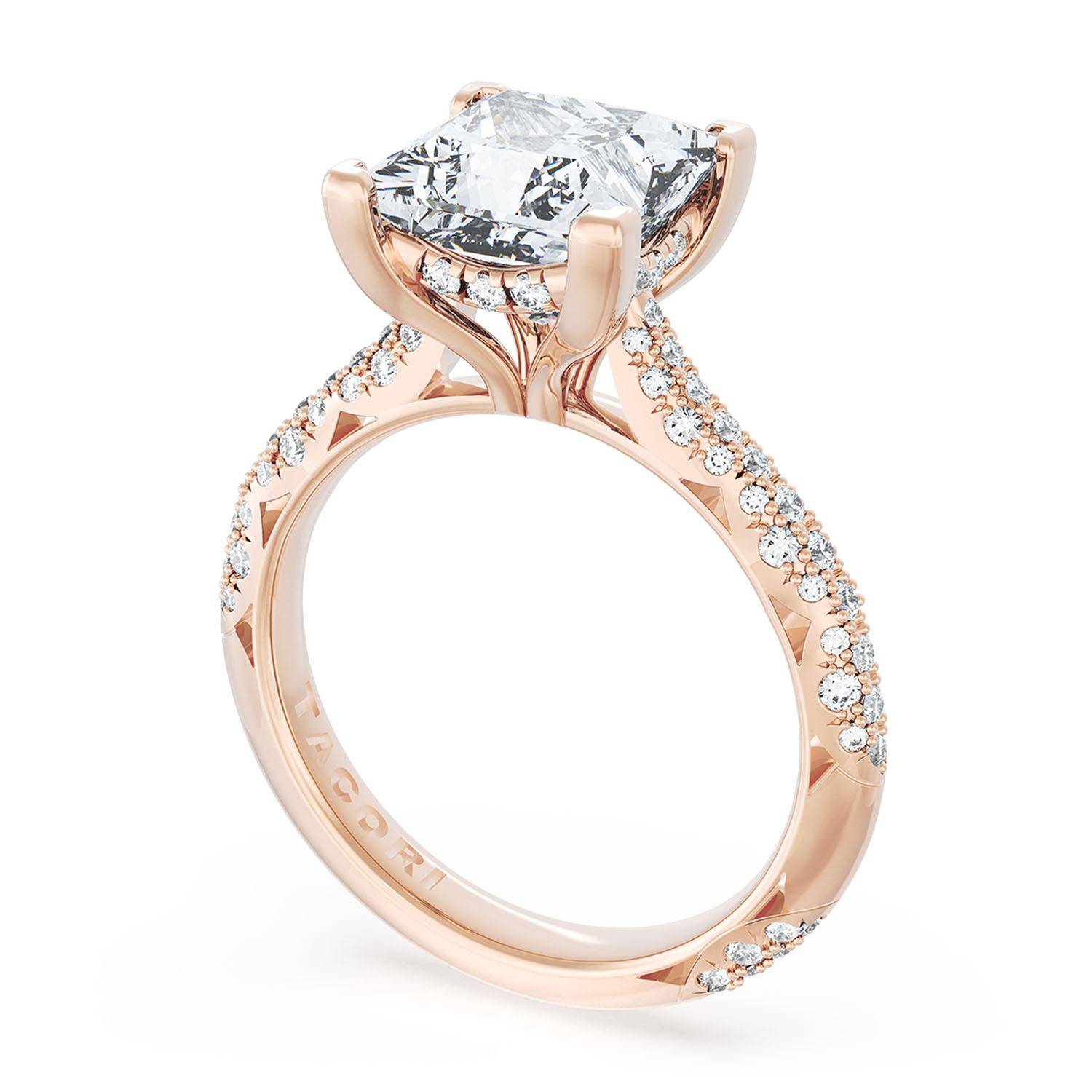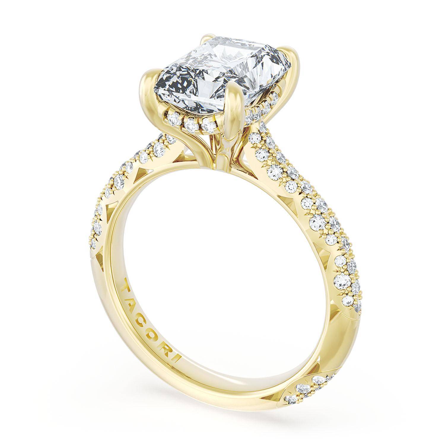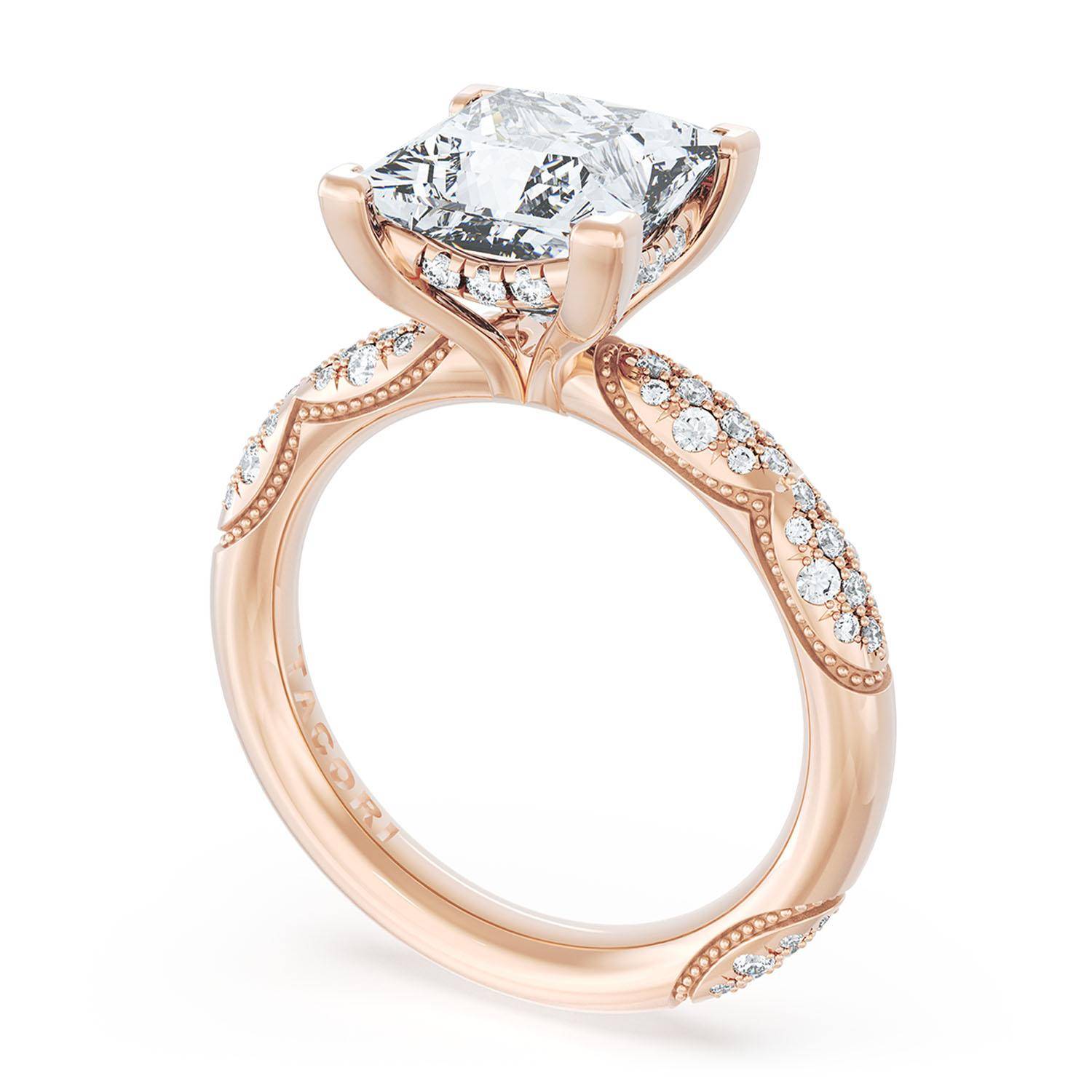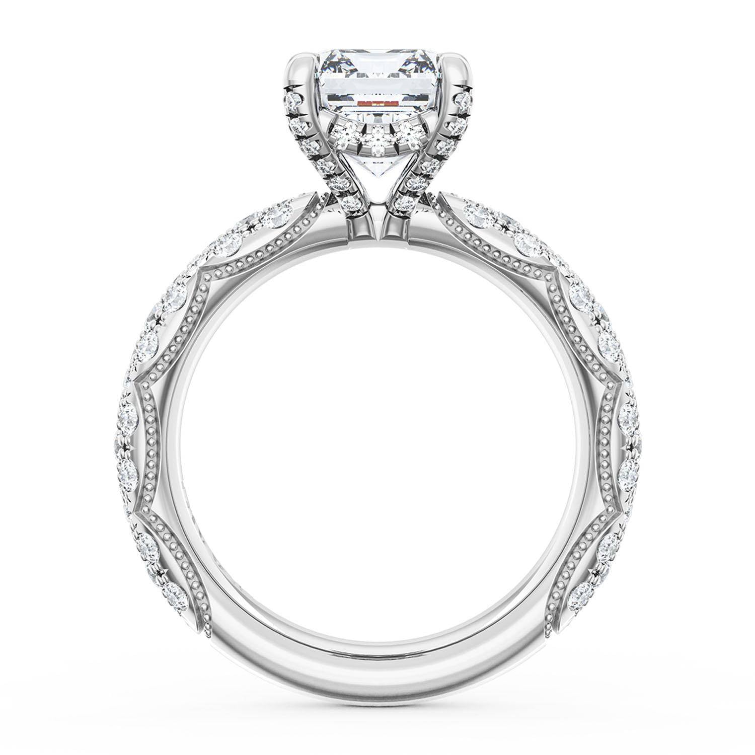 A cathedral foundation is accented with a hidden bloom of diamonds, while the Founder's Crescent Fabric wraps around the ceiling of the ring. The ring is finished with a diamond-studded Signature Crescent.