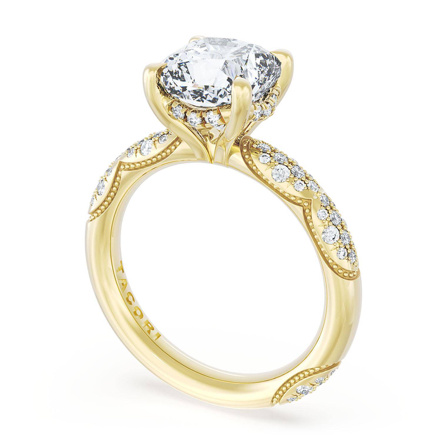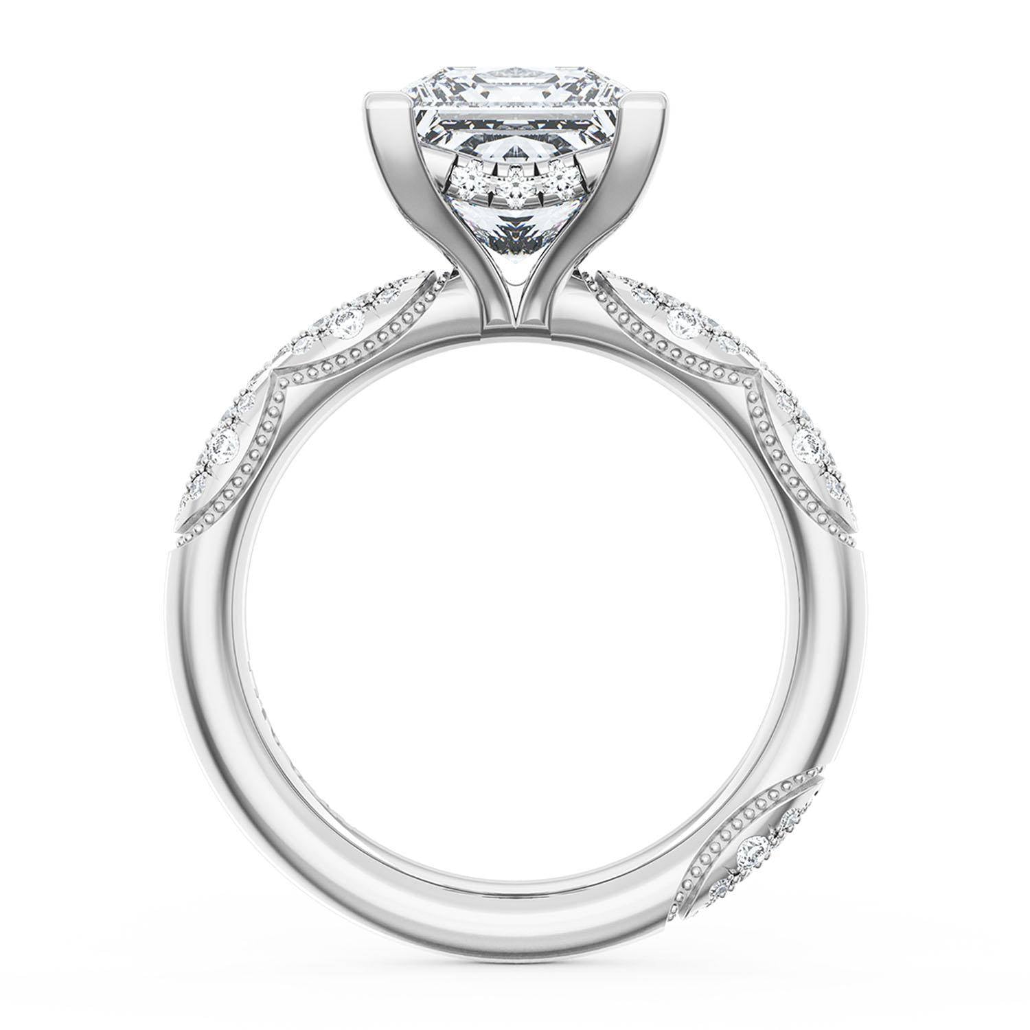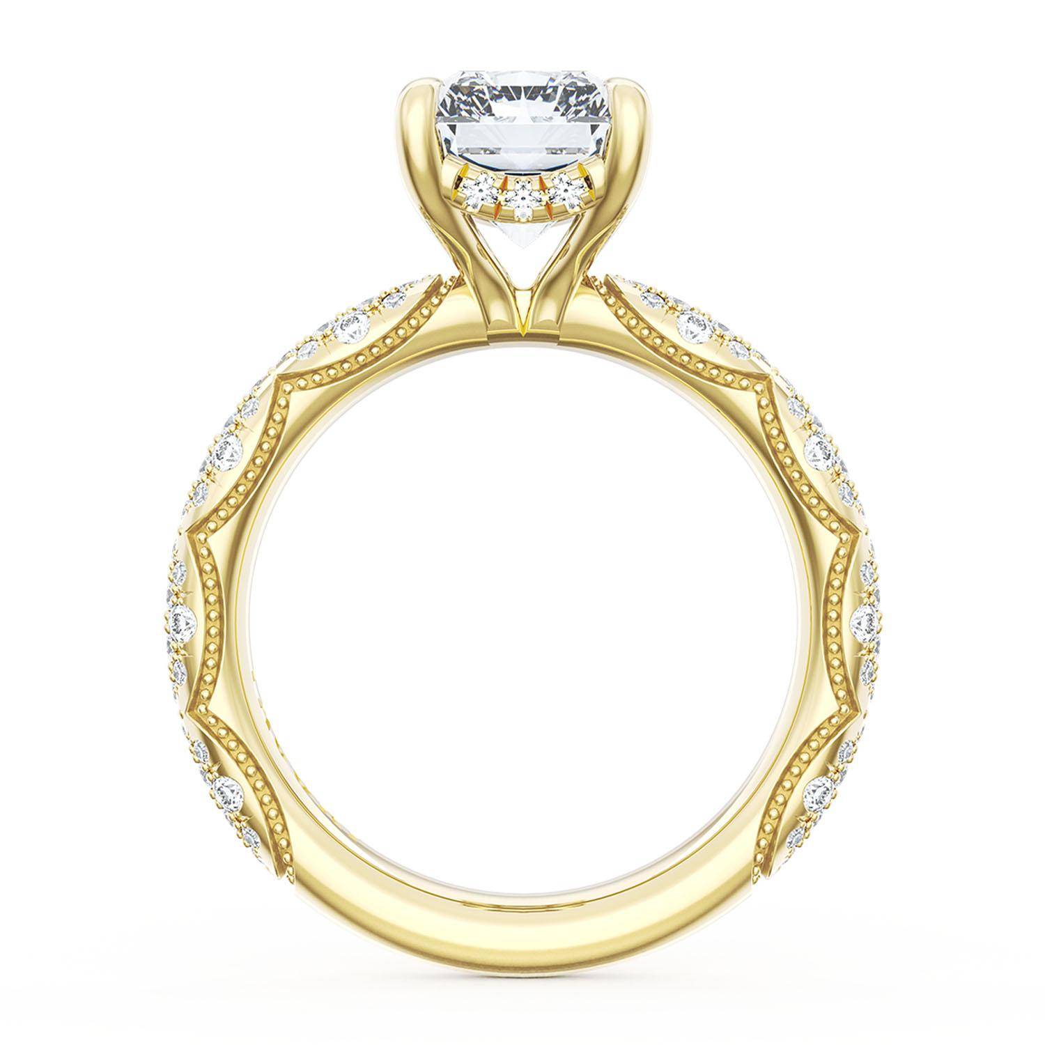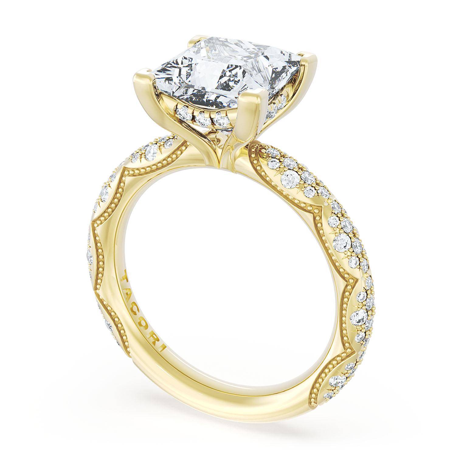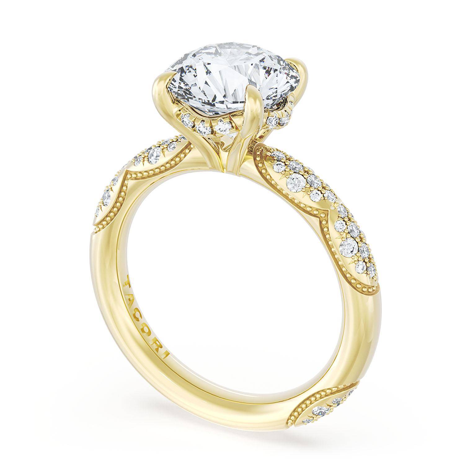 A cathedral foundation is accented with a hidden bloom of diamonds, while the Founder's Crescent Fabric wraps around the ceiling of the ring. The ring is finished with a diamond-studded Signature Crescent.