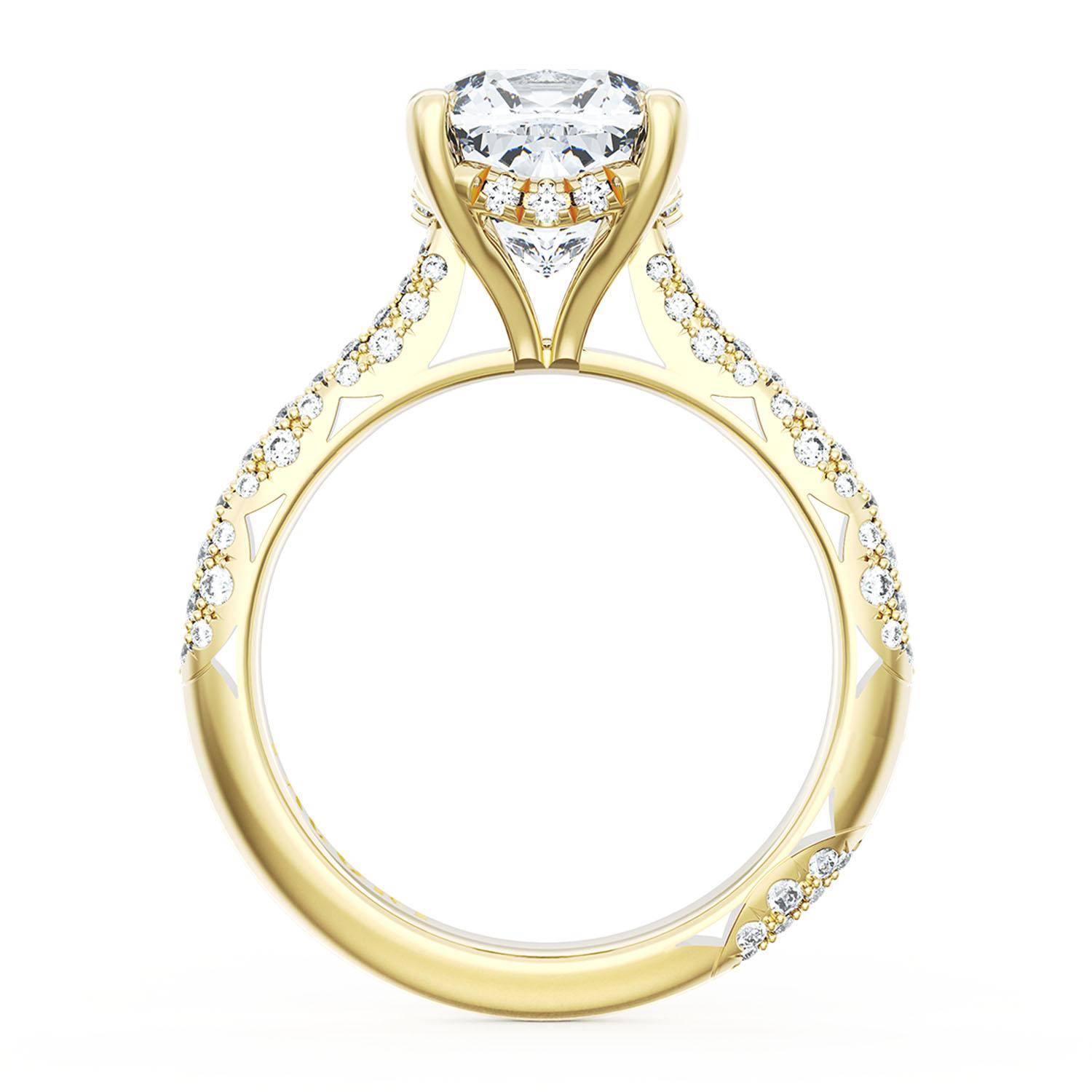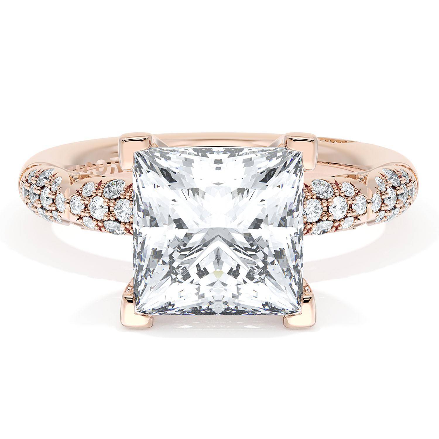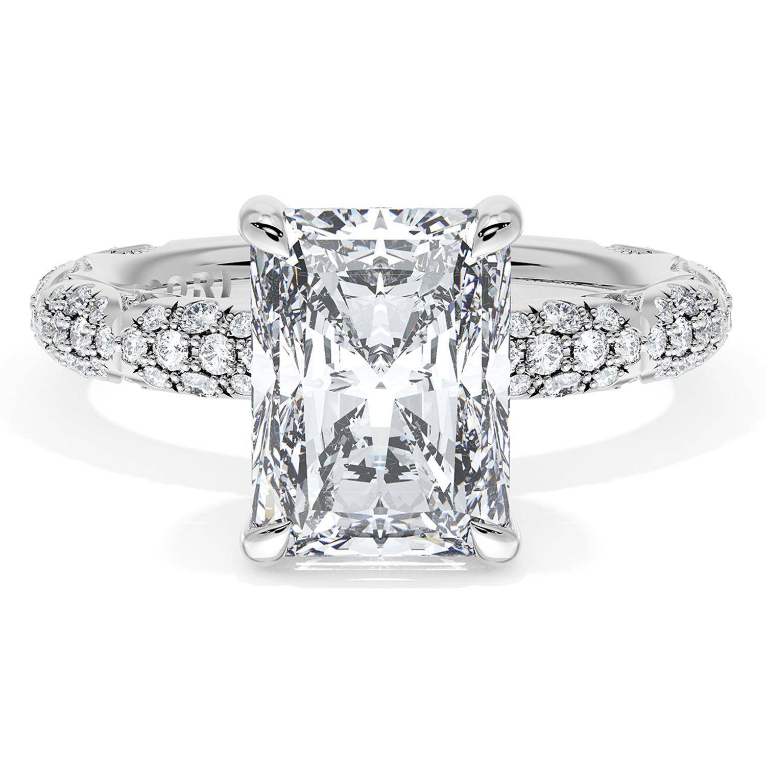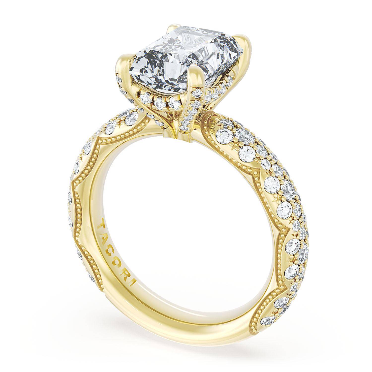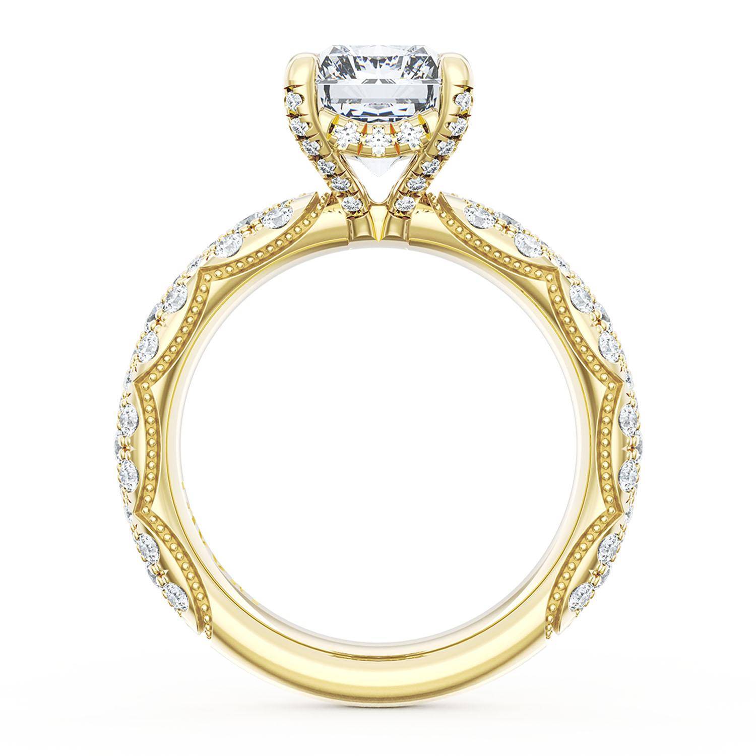 A cathedral foundation is accented with a hidden bloom of diamonds, while the Founder's Crescent Fabric wraps around the ceiling of the ring. The ring is finished with a diamond-studded Signature Crescent.