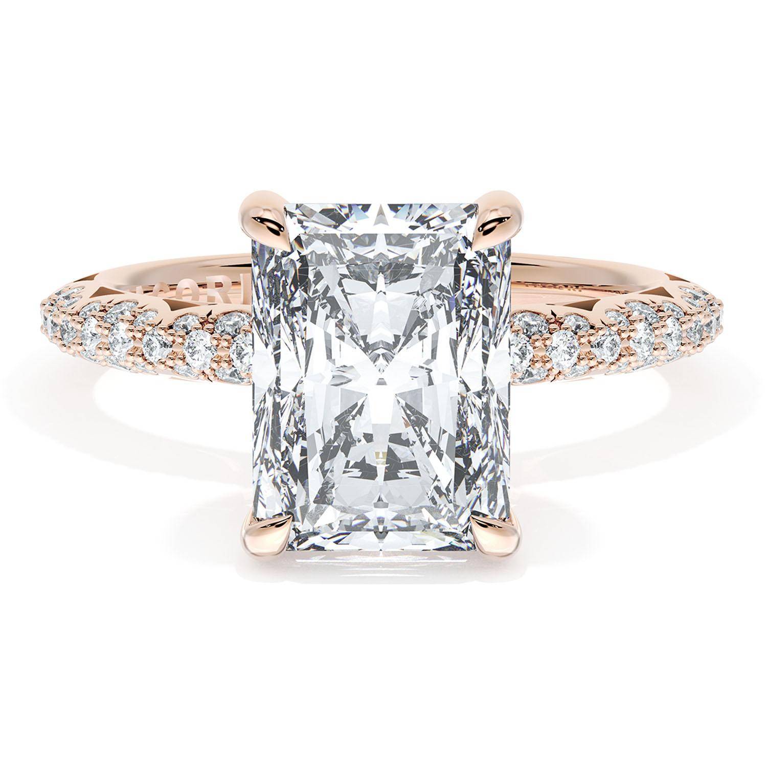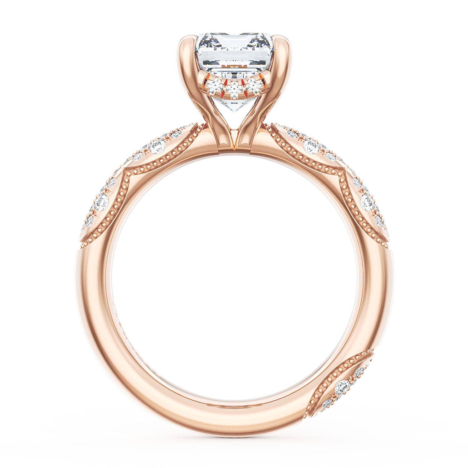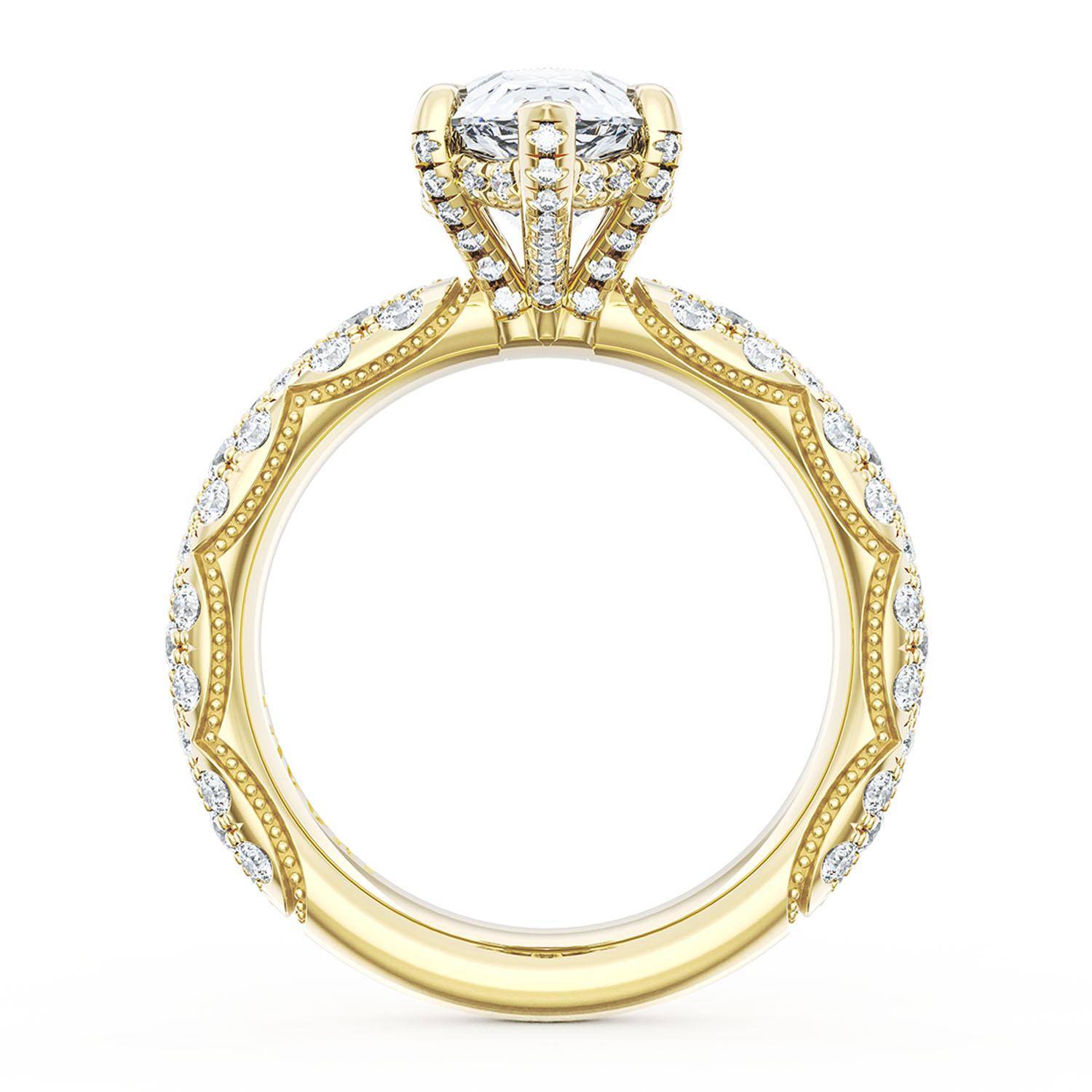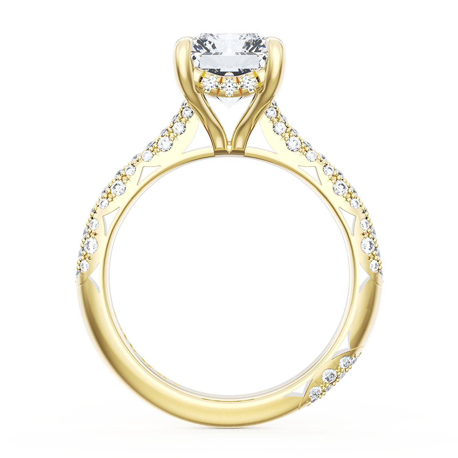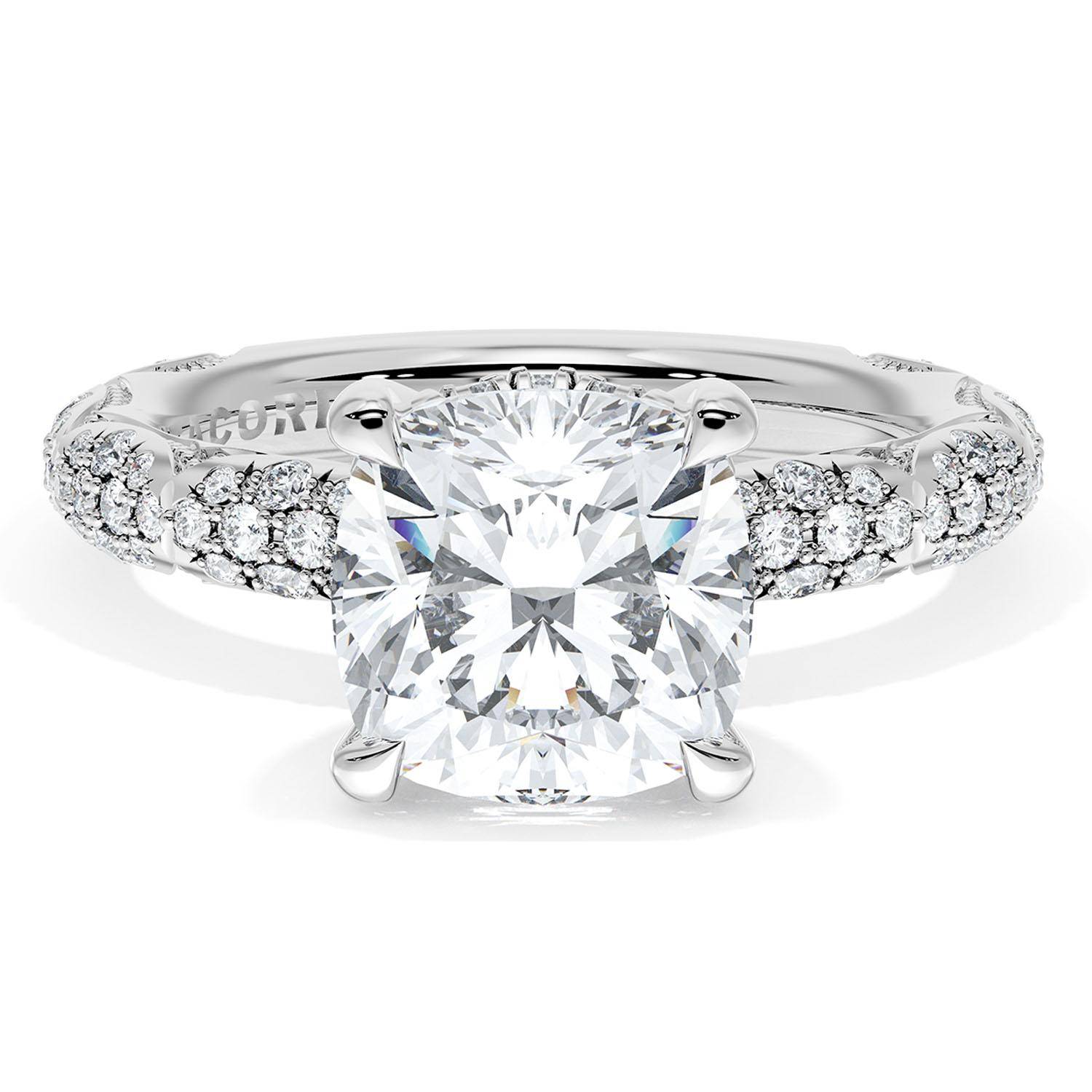 A cathedral foundation is accented with a hidden bloom of diamonds, while the Founder's Crescent Fabric wraps around the ceiling of the ring. The ring is finished with a diamond-studded Signature Crescent.