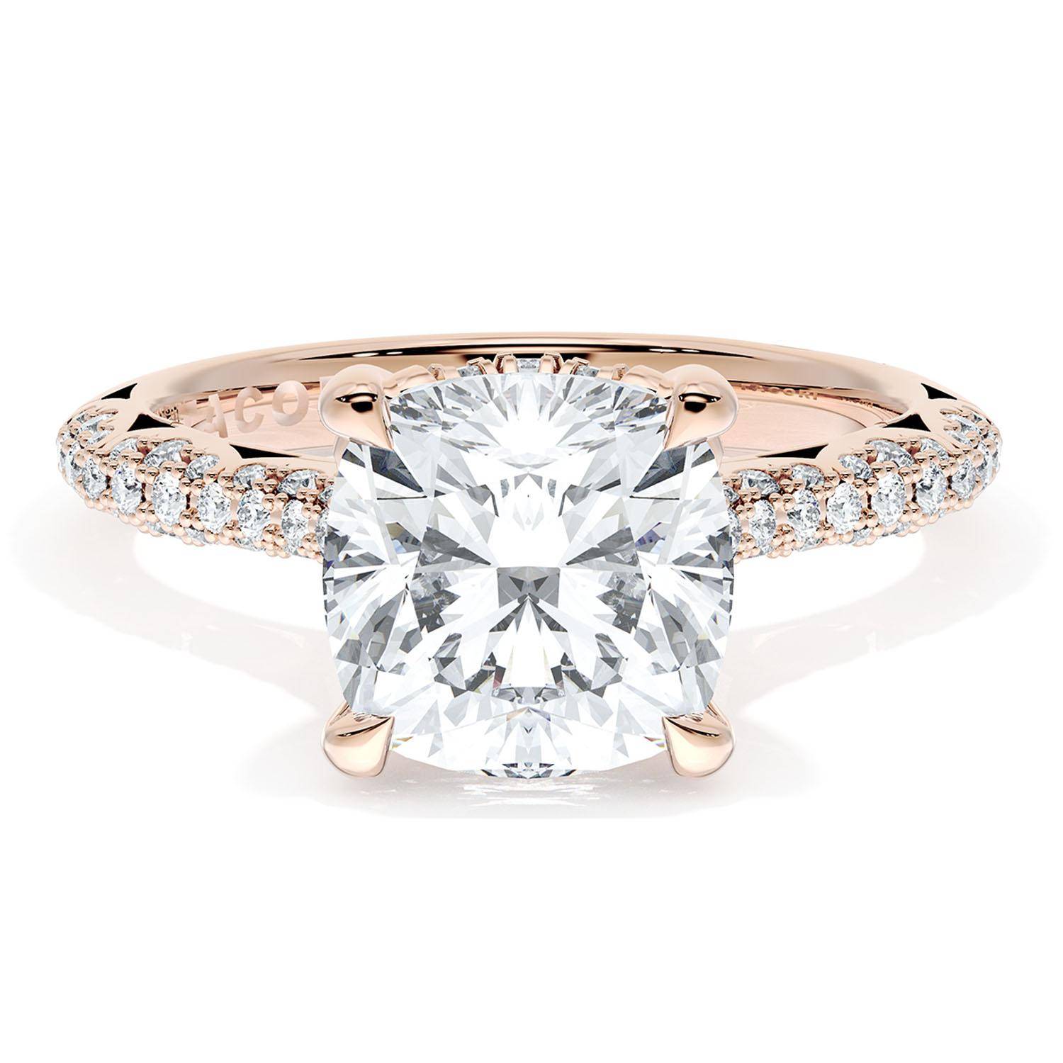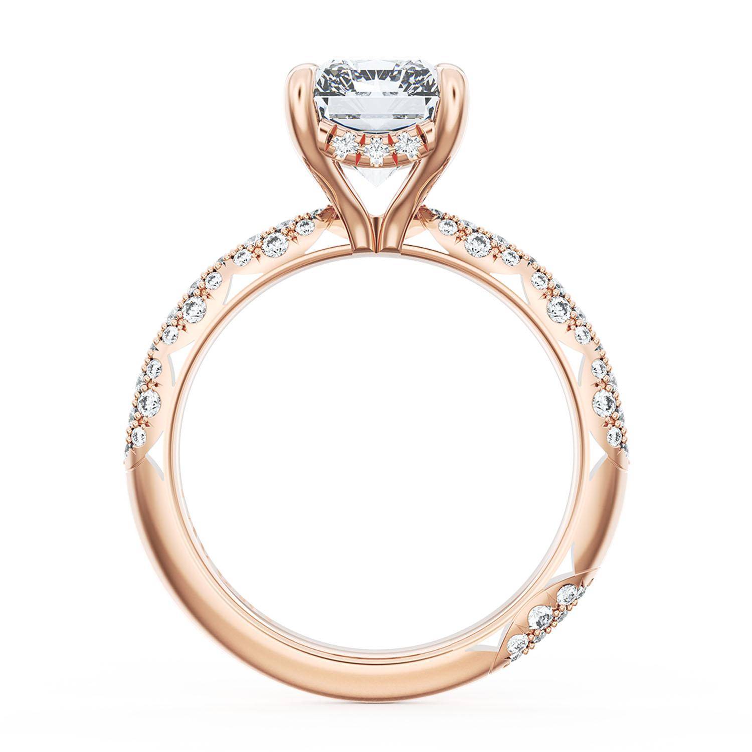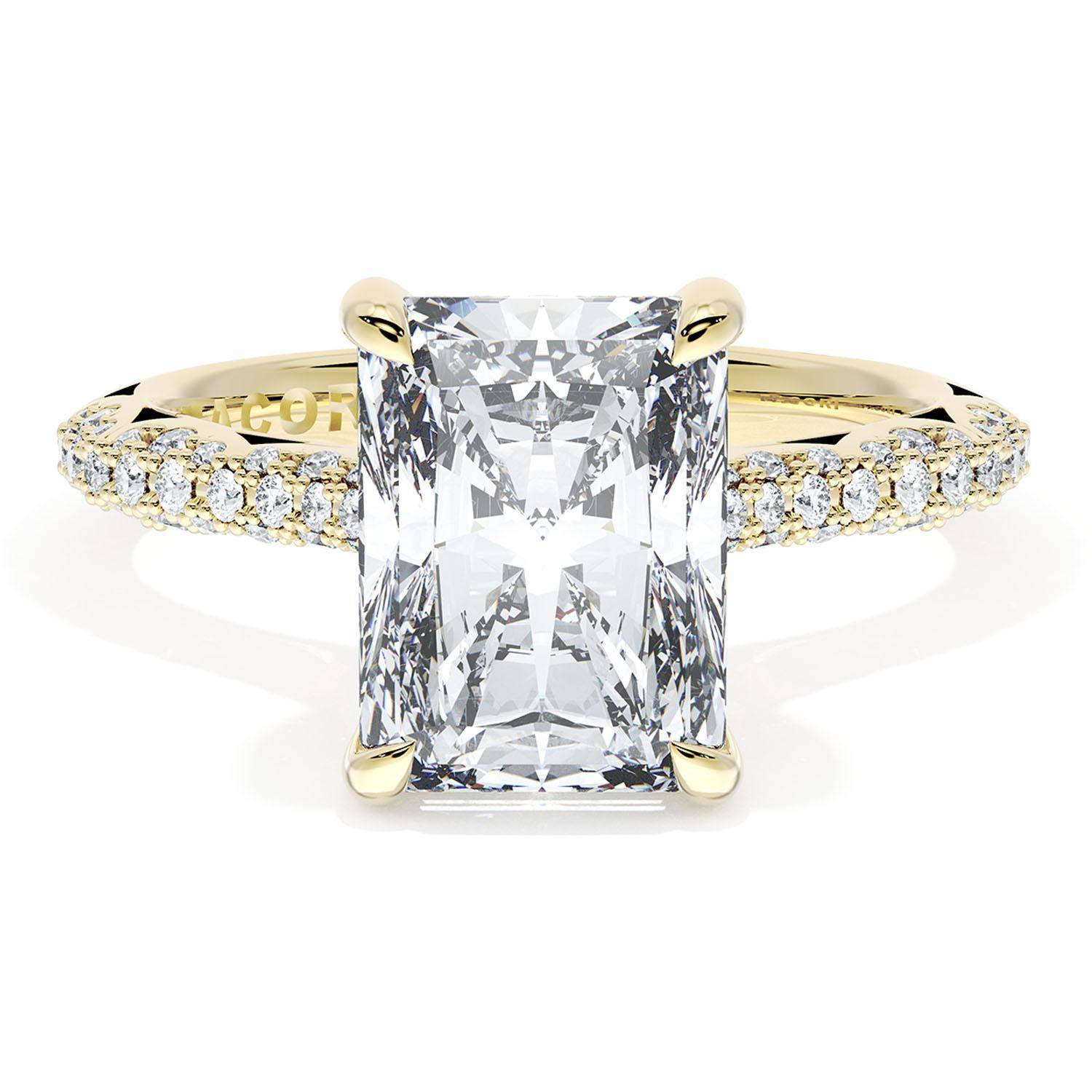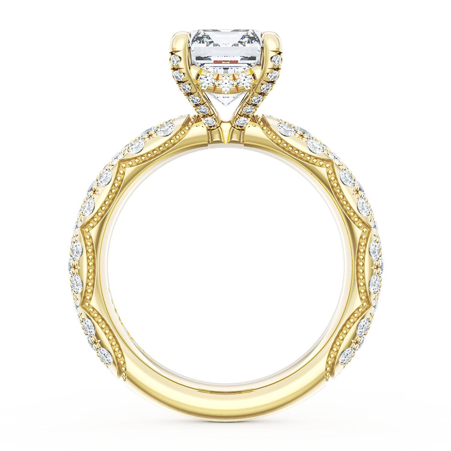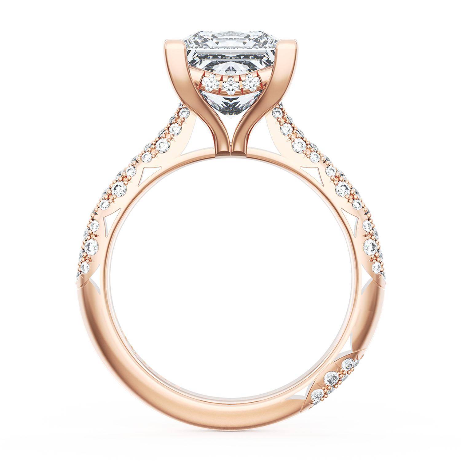 A cathedral foundation is accented with a hidden bloom of diamonds, while the Founder's Crescent Fabric wraps around the ceiling of the ring. The ring is finished with a diamond-studded Signature Crescent.