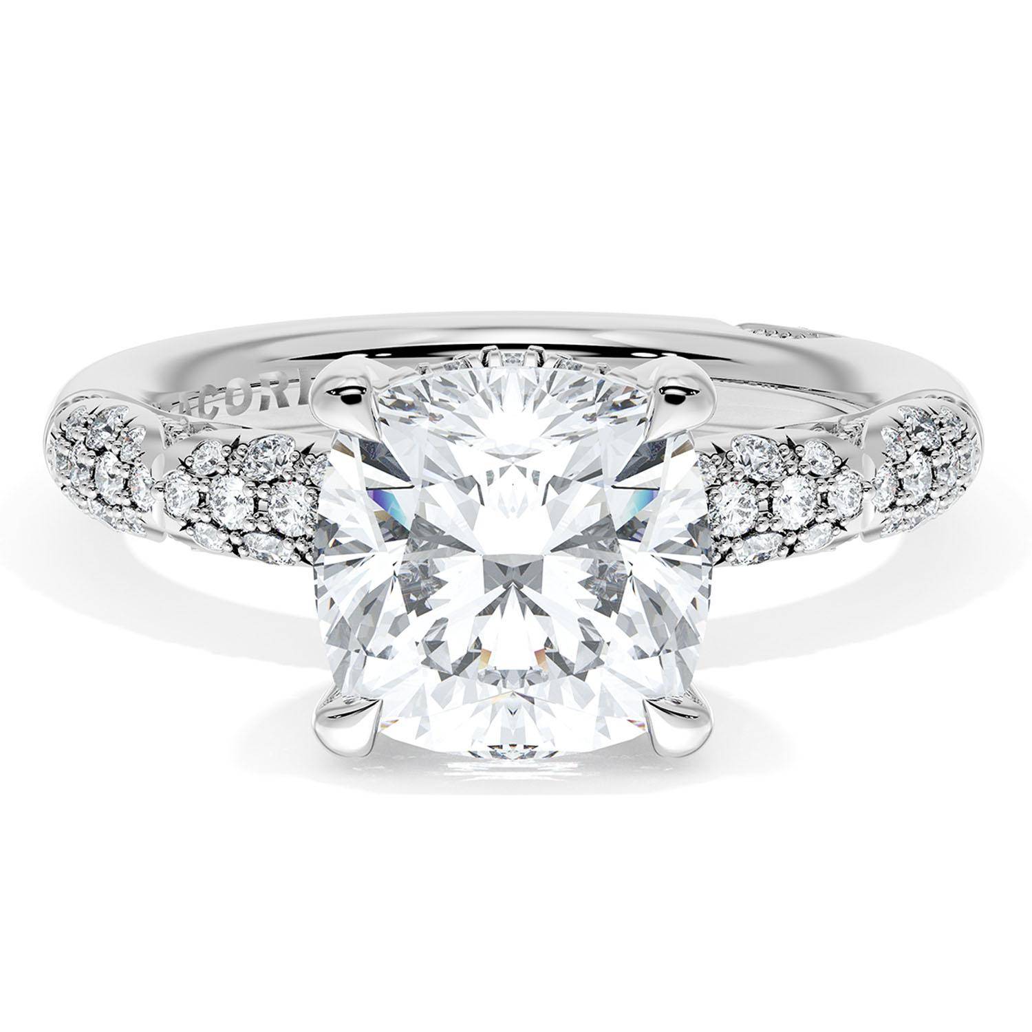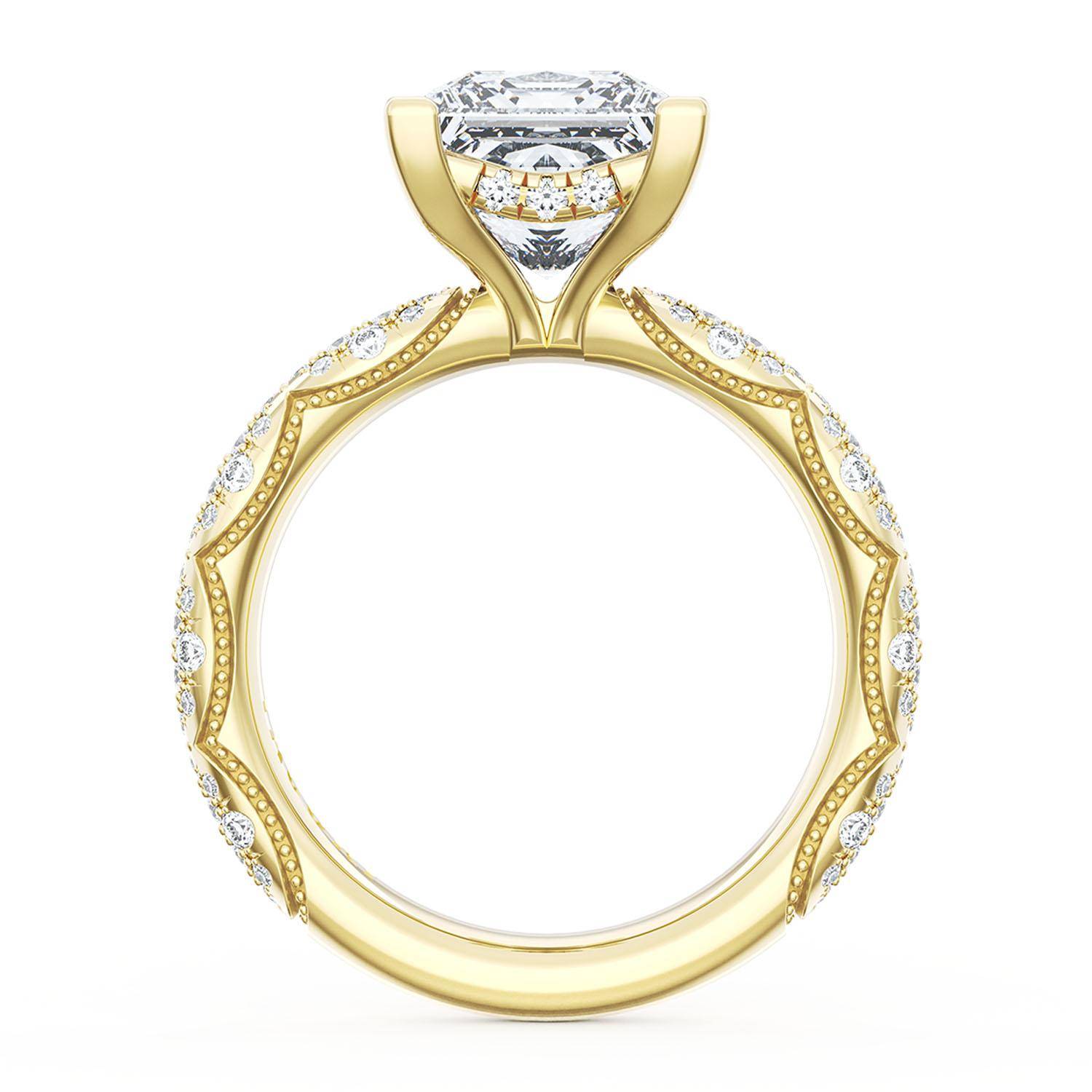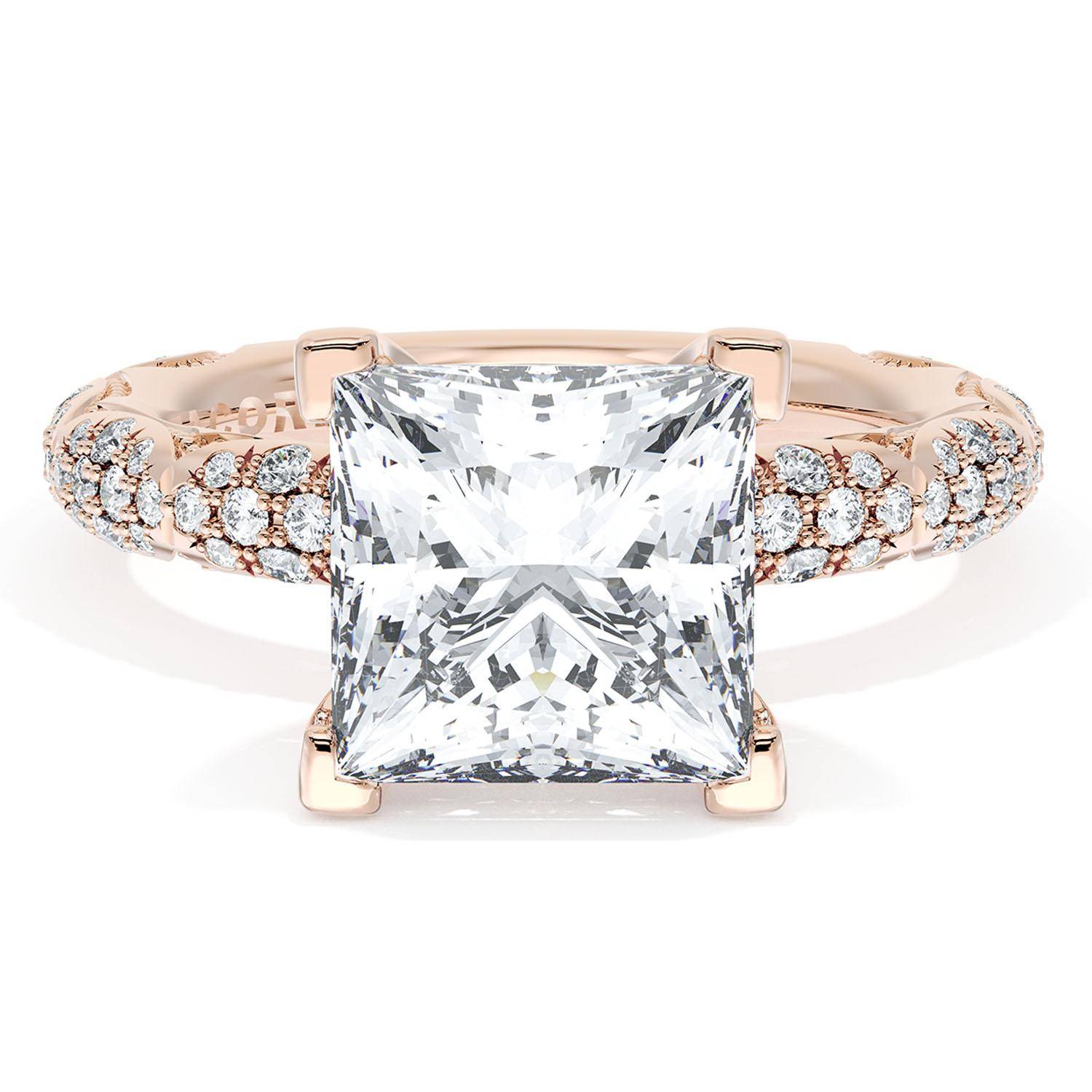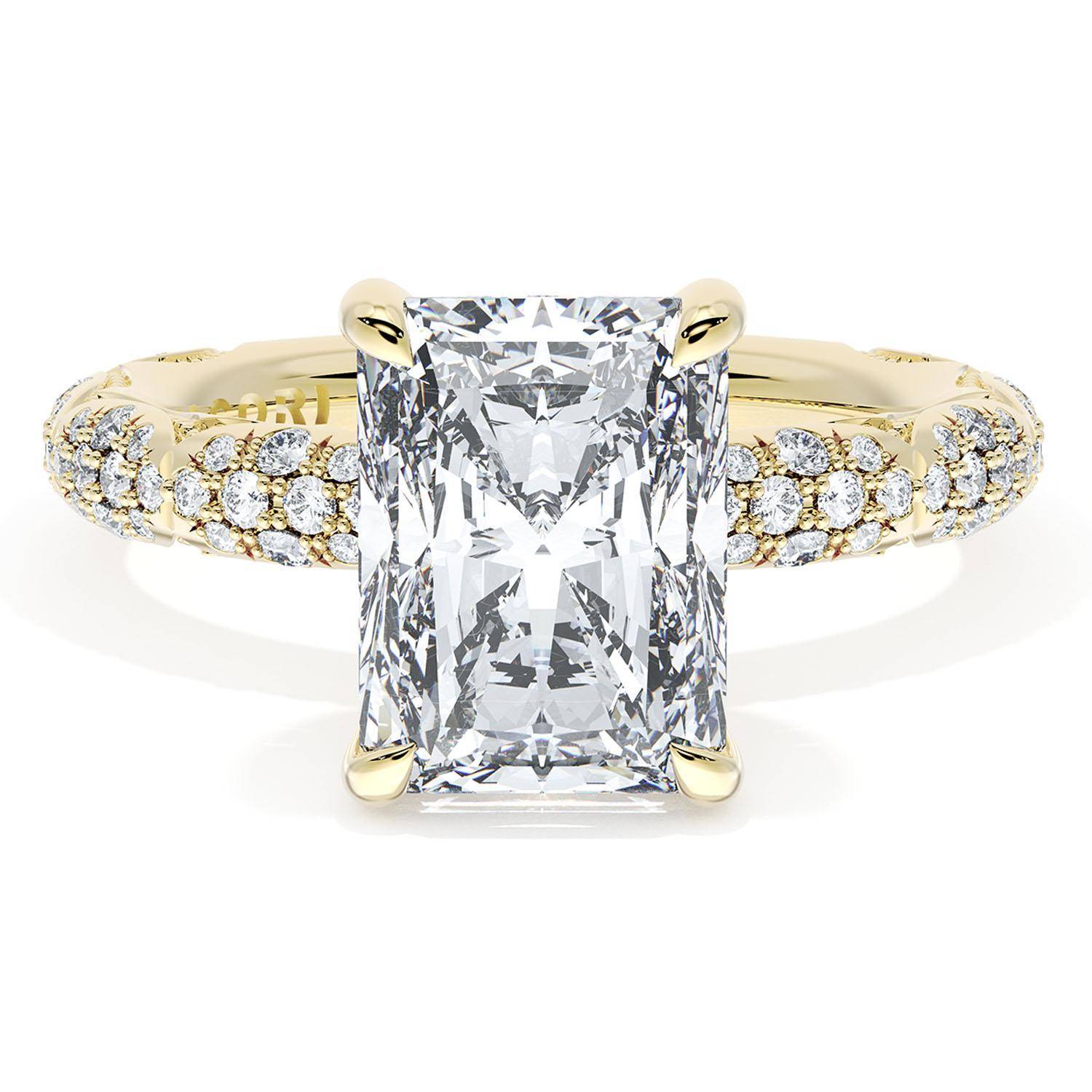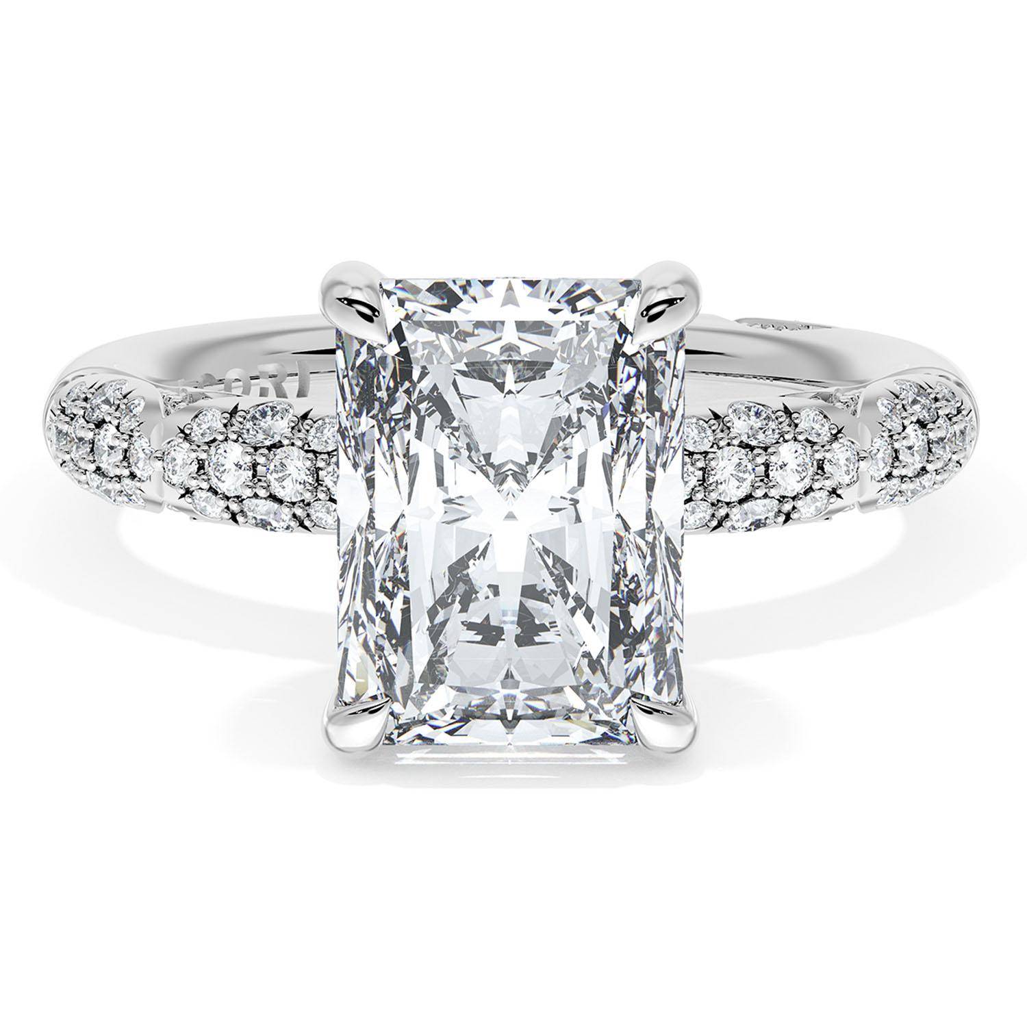 A cathedral foundation is accented with a hidden bloom of diamonds, while the Founder's Crescent Fabric wraps around the ceiling of the ring. The ring is finished with a diamond-studded Signature Crescent.