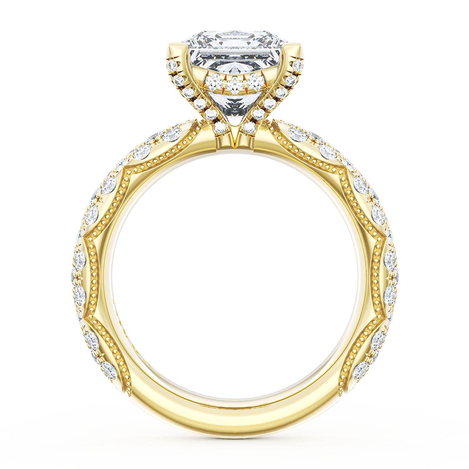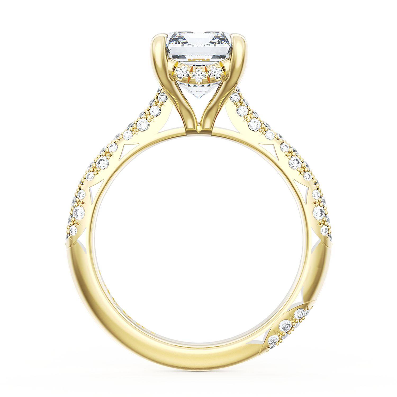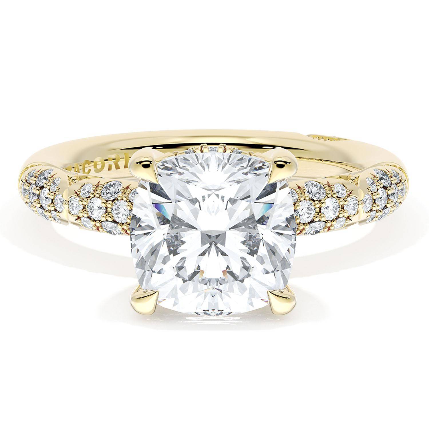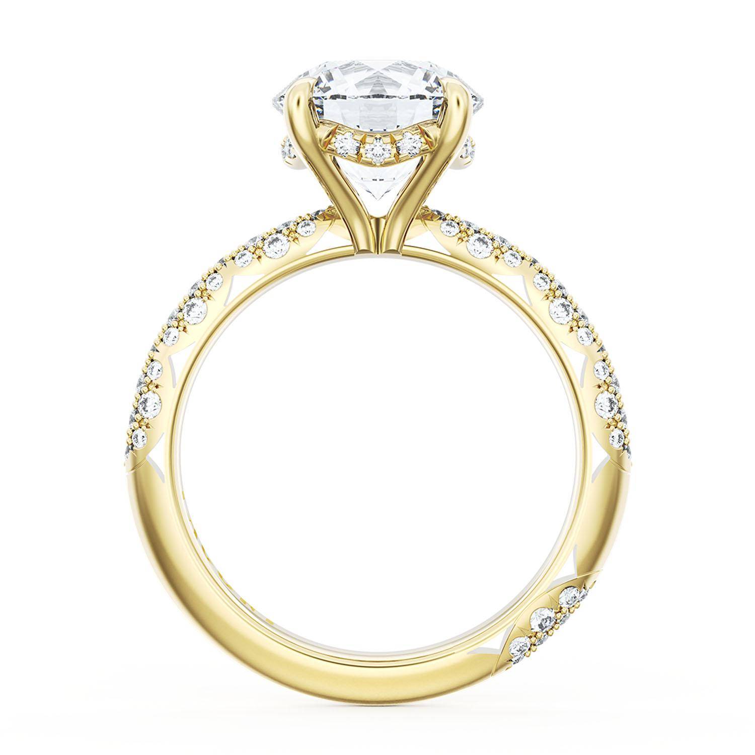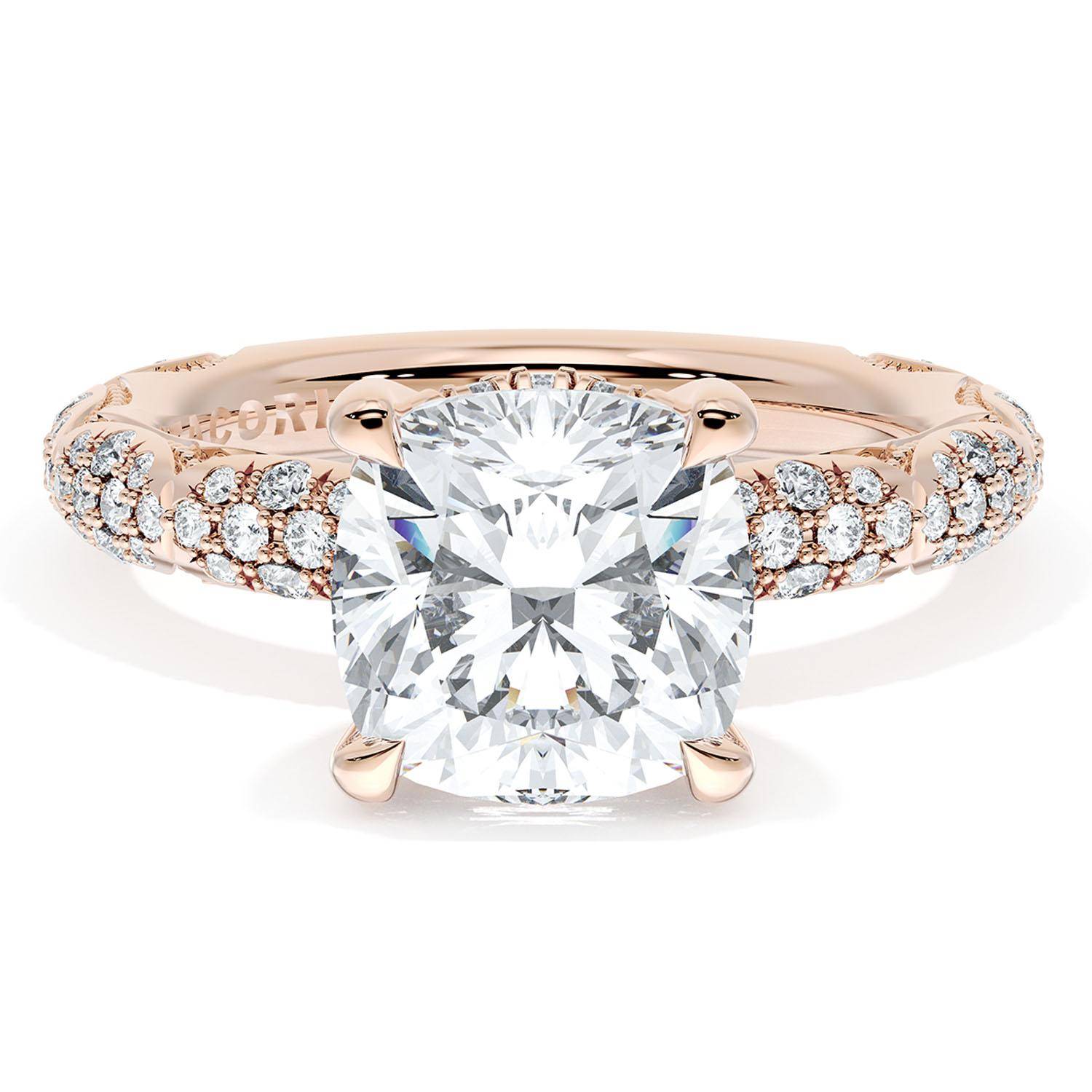 A cathedral foundation is accented with a hidden bloom of diamonds, while the Founder's Crescent Fabric wraps around the ceiling of the ring. The ring is finished with a diamond-studded Signature Crescent.
