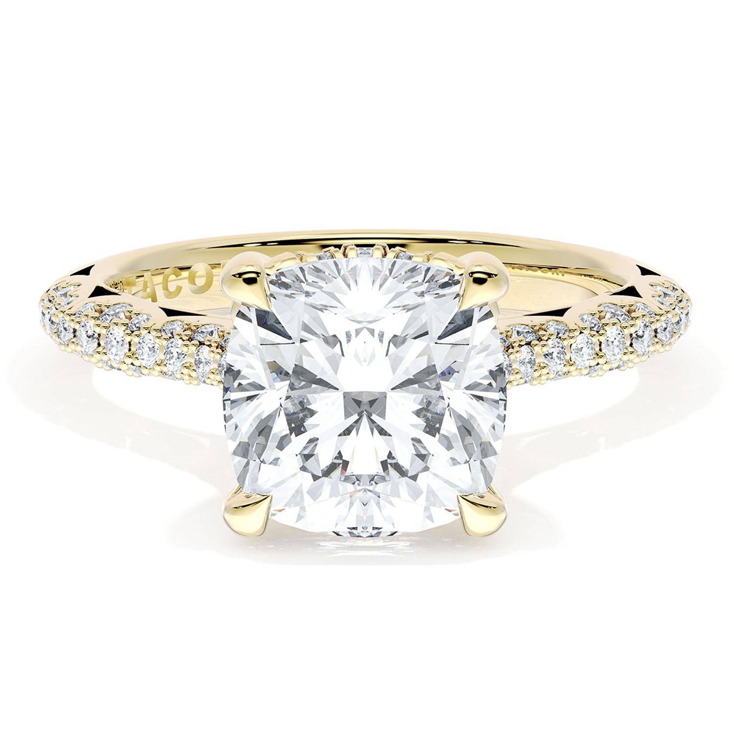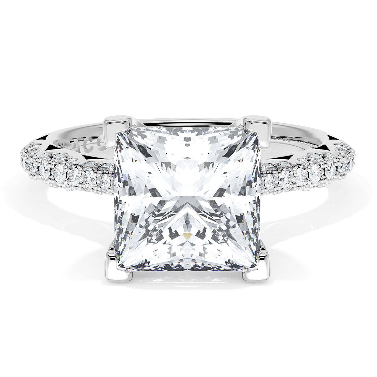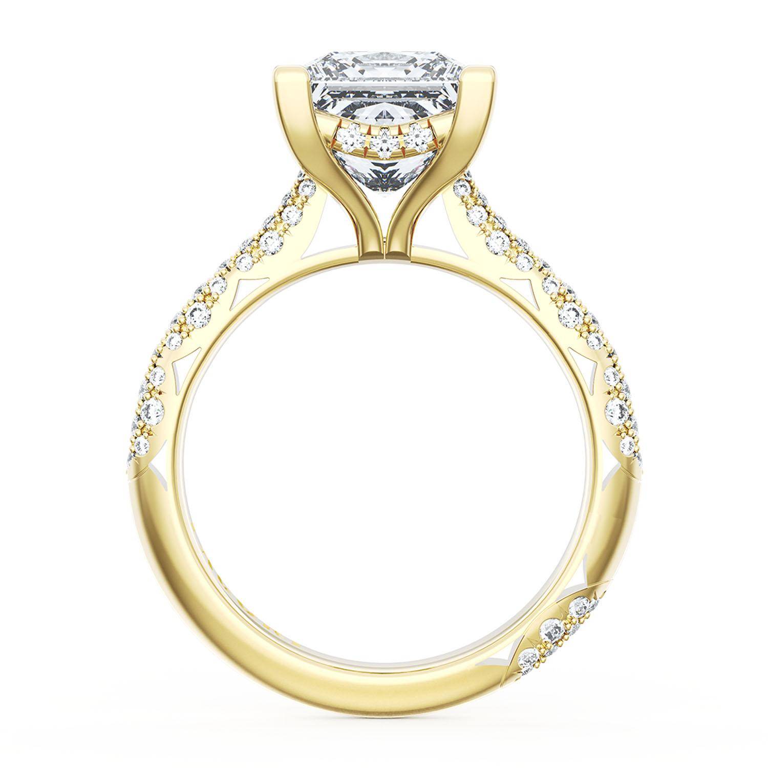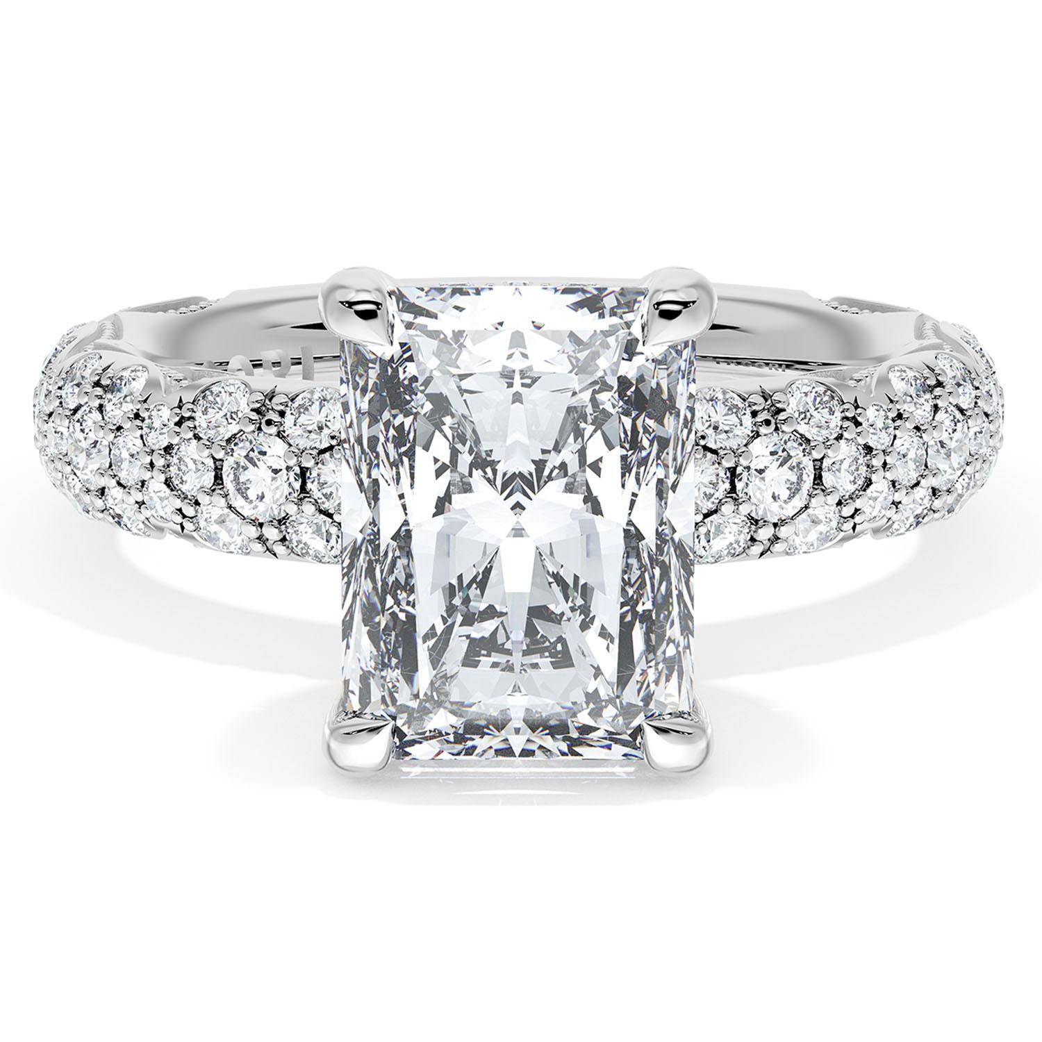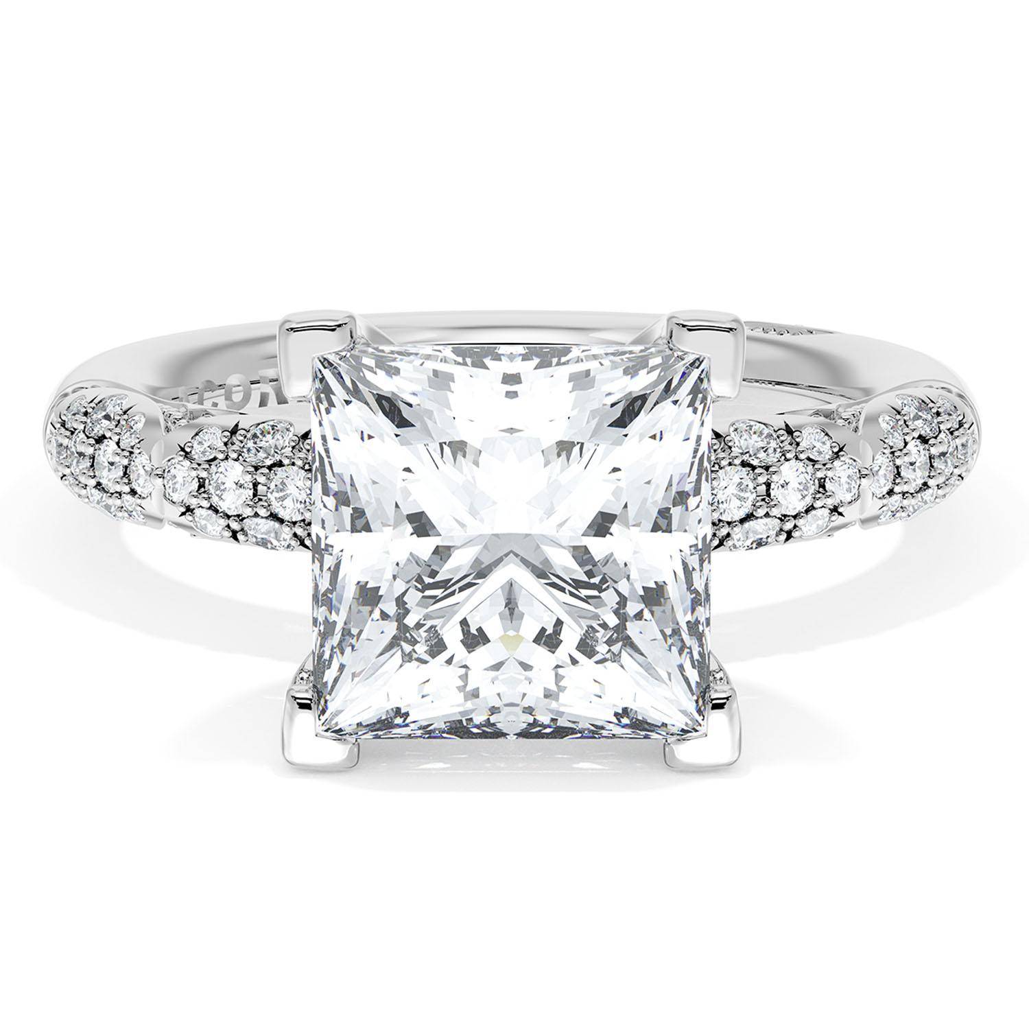 A cathedral foundation is accented with a hidden bloom of diamonds, while the Founder's Crescent Fabric wraps around the ceiling of the ring. The ring is finished with a diamond-studded Signature Crescent.