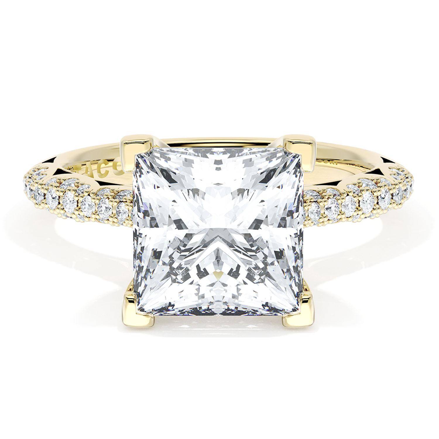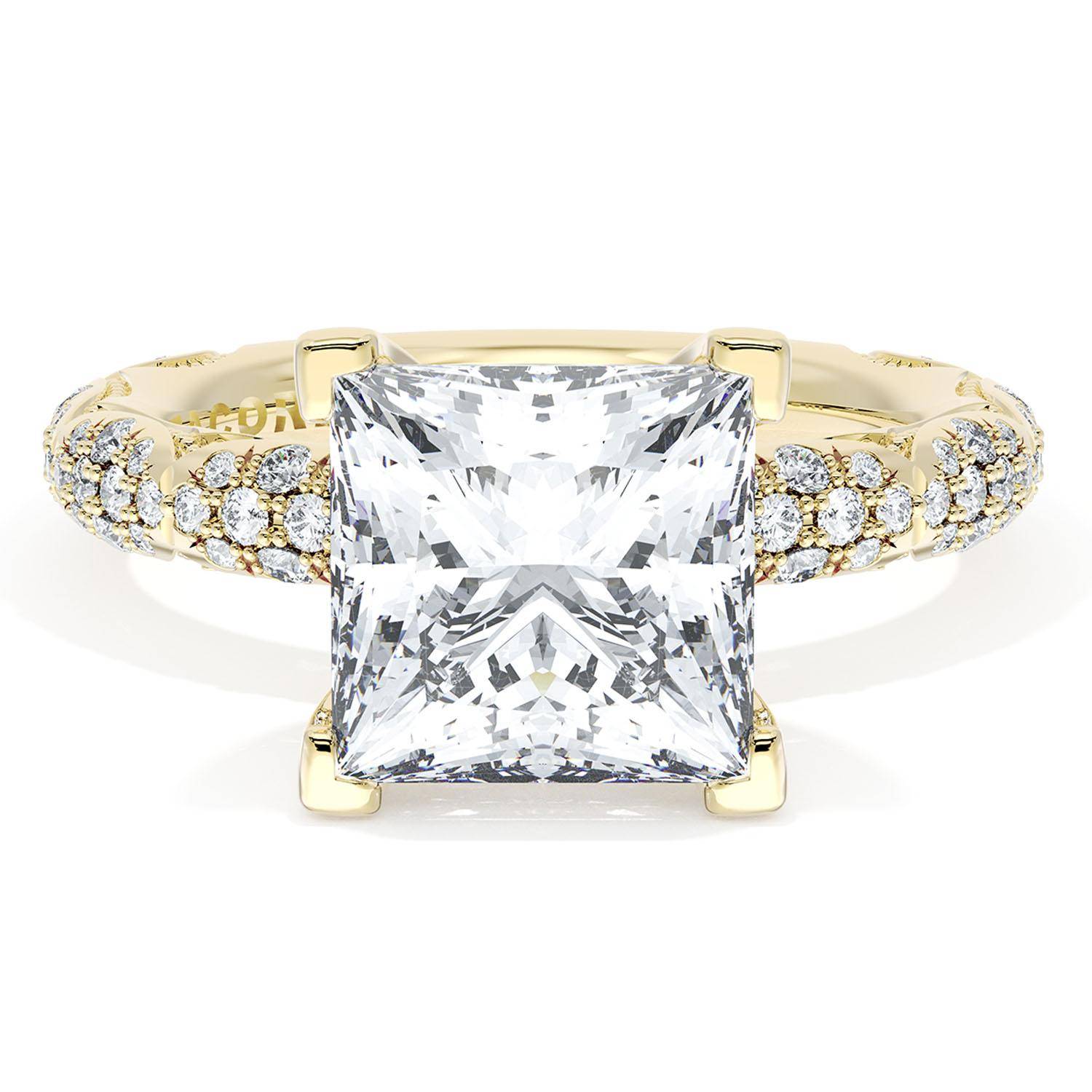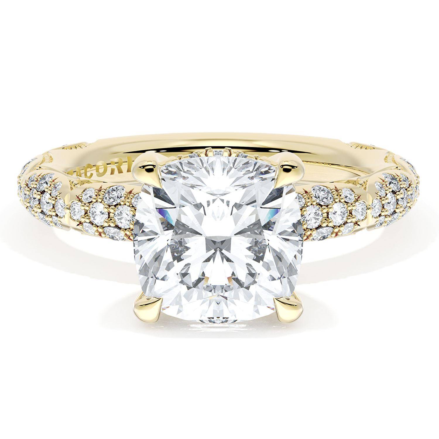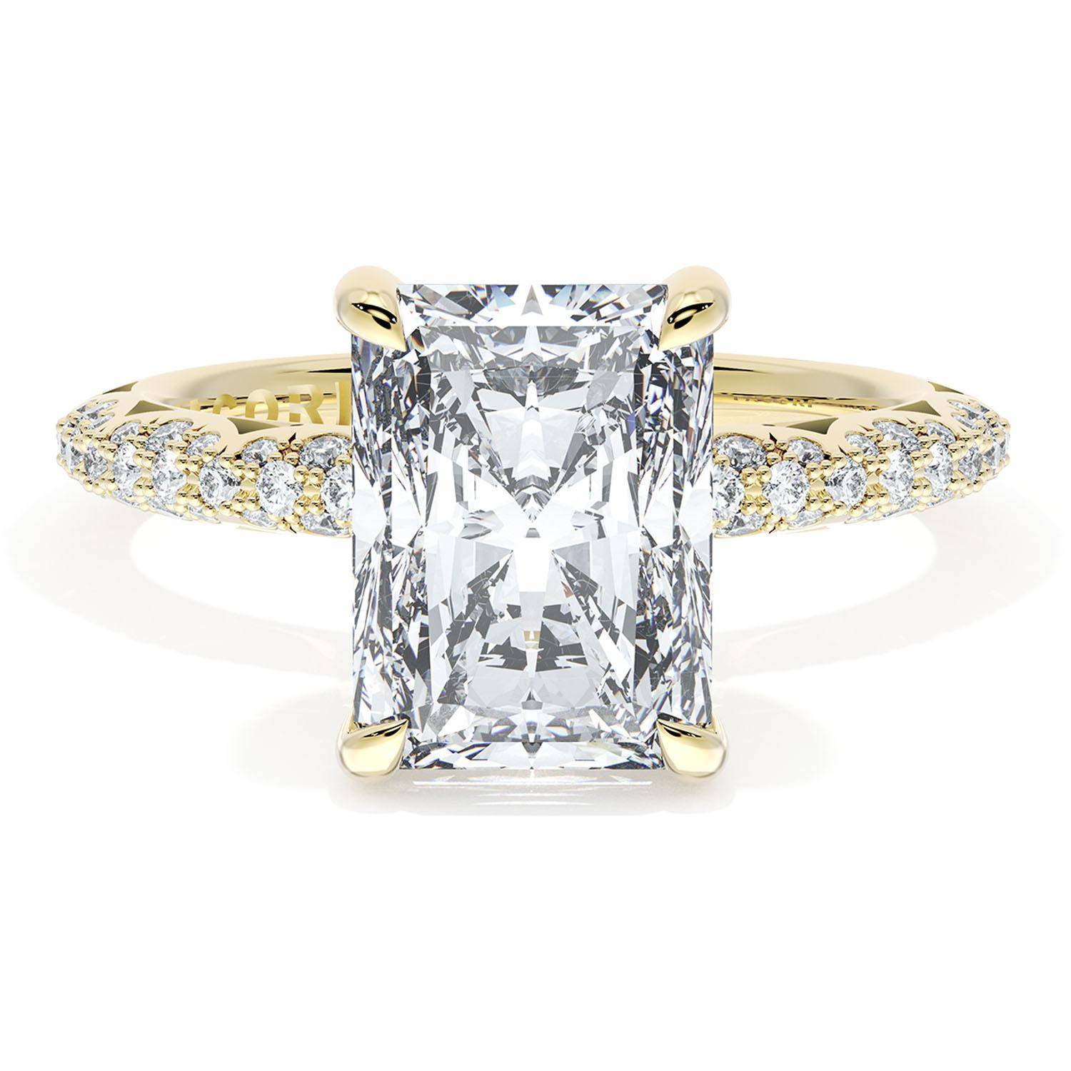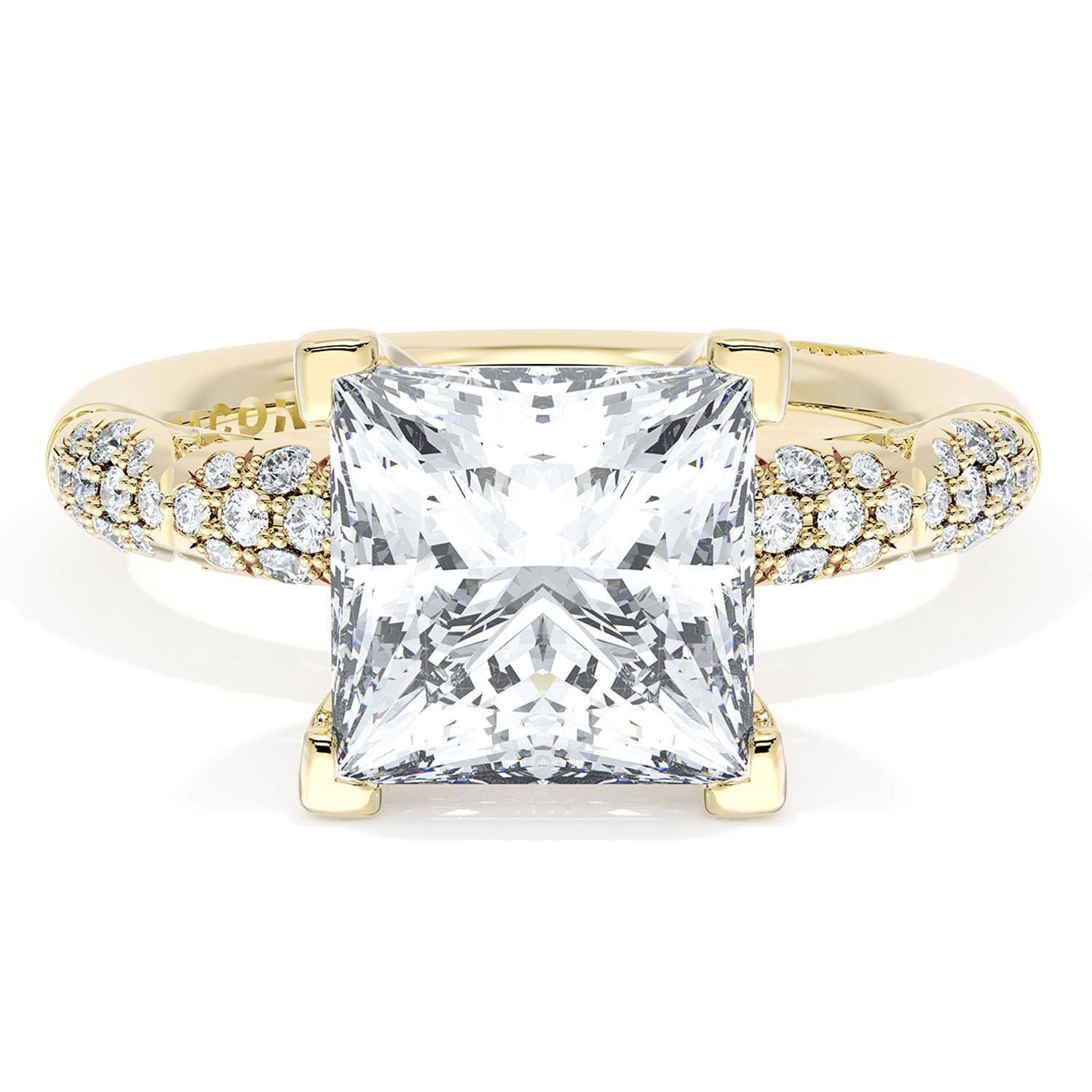 A cathedral foundation is accented with a hidden bloom of diamonds, while the Founder's Crescent Fabric wraps around the ceiling of the ring. The ring is finished with a diamond-studded Signature Crescent.