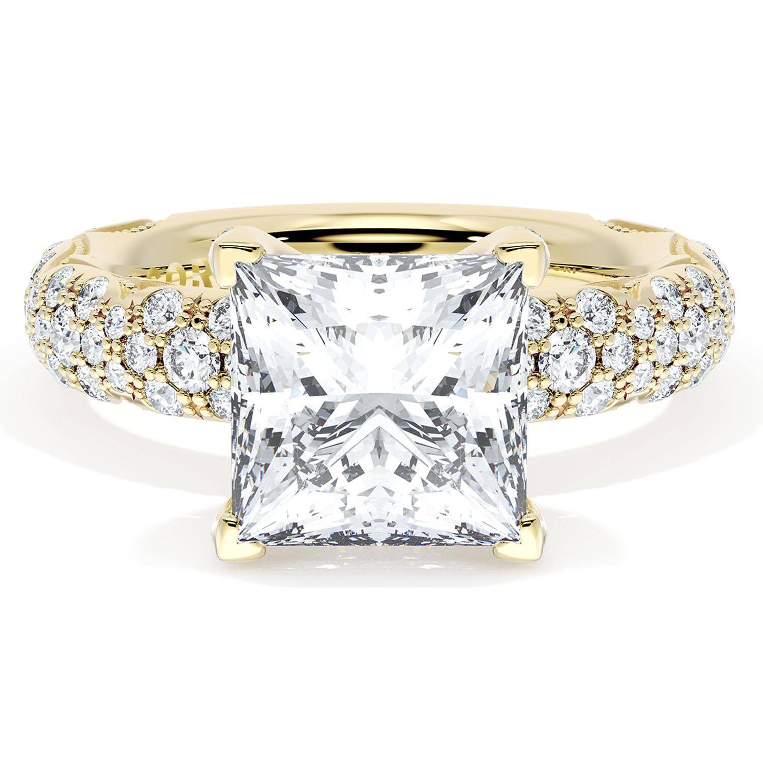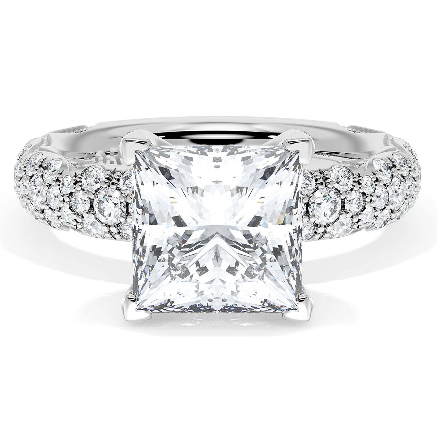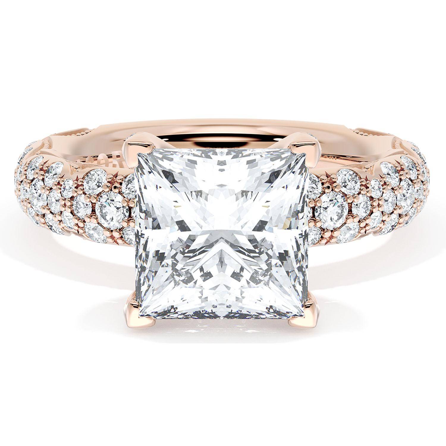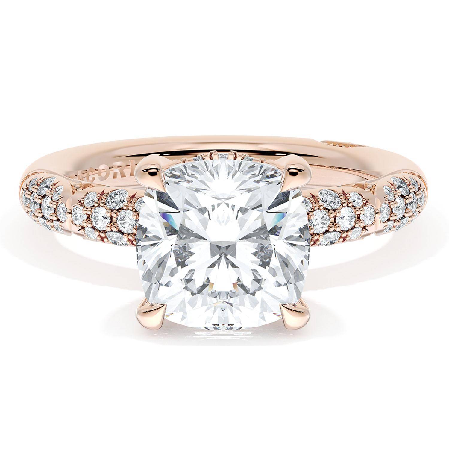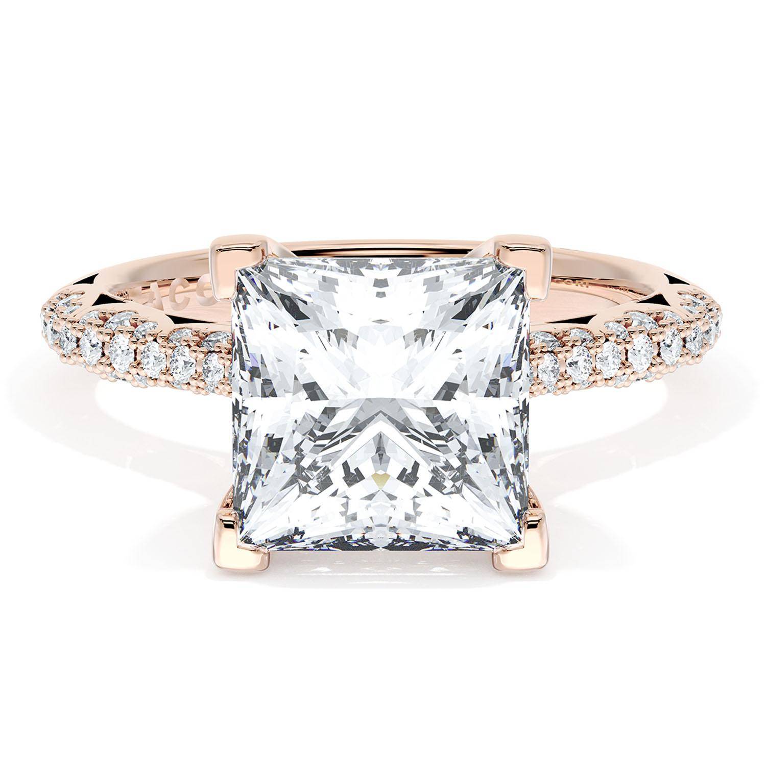 A cathedral foundation is accented with a hidden bloom of diamonds, while the Founder's Crescent Fabric wraps around the ceiling of the ring. The ring is finished with a diamond-studded Signature Crescent.