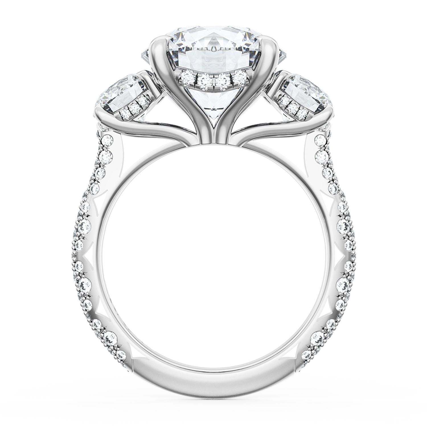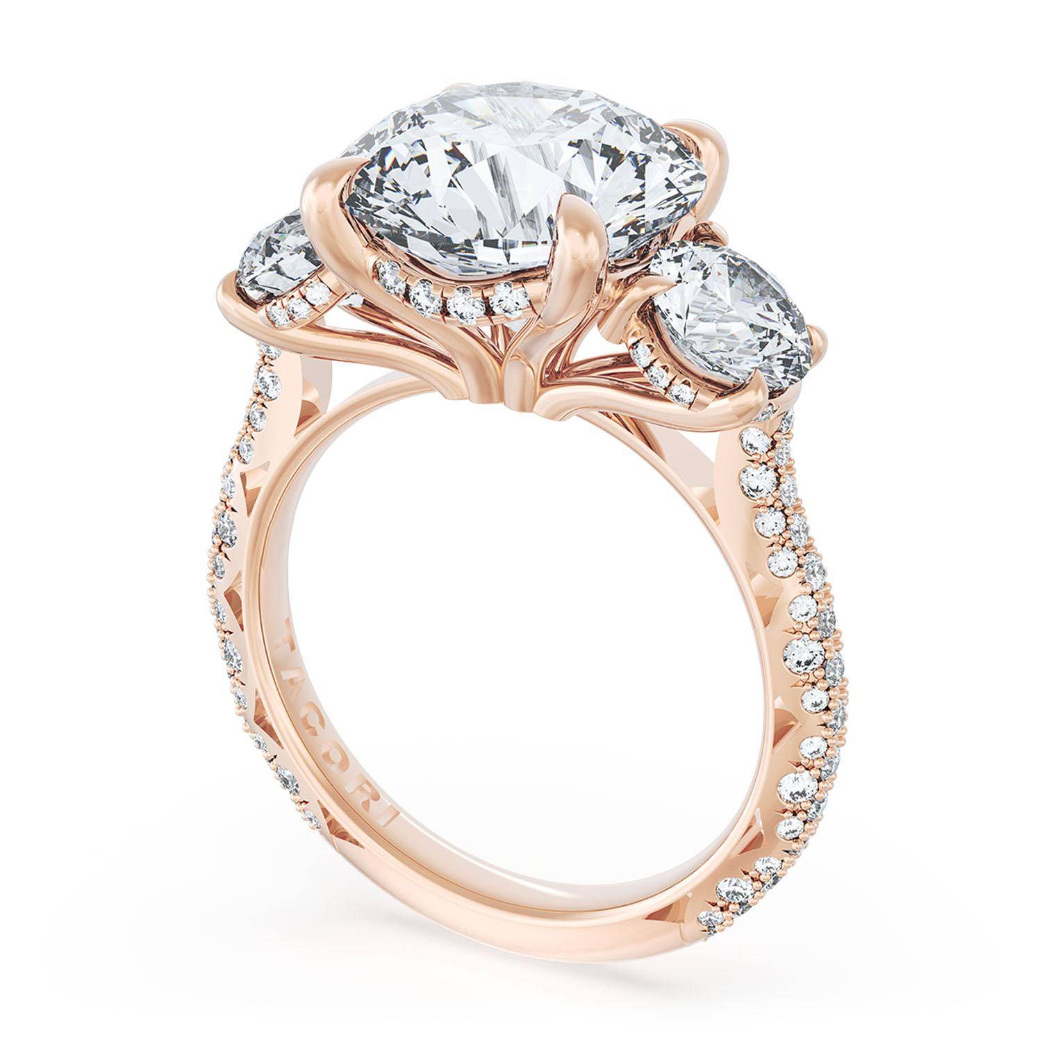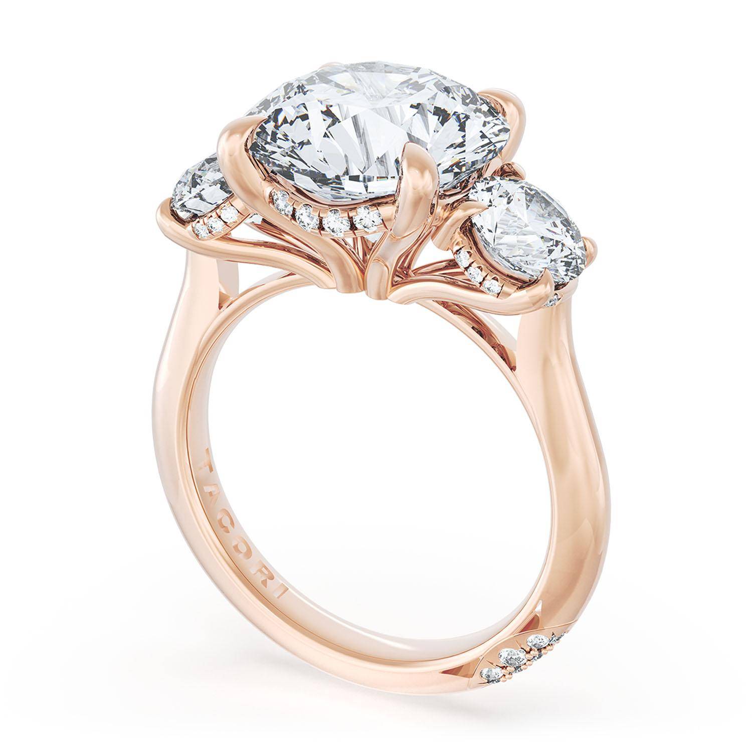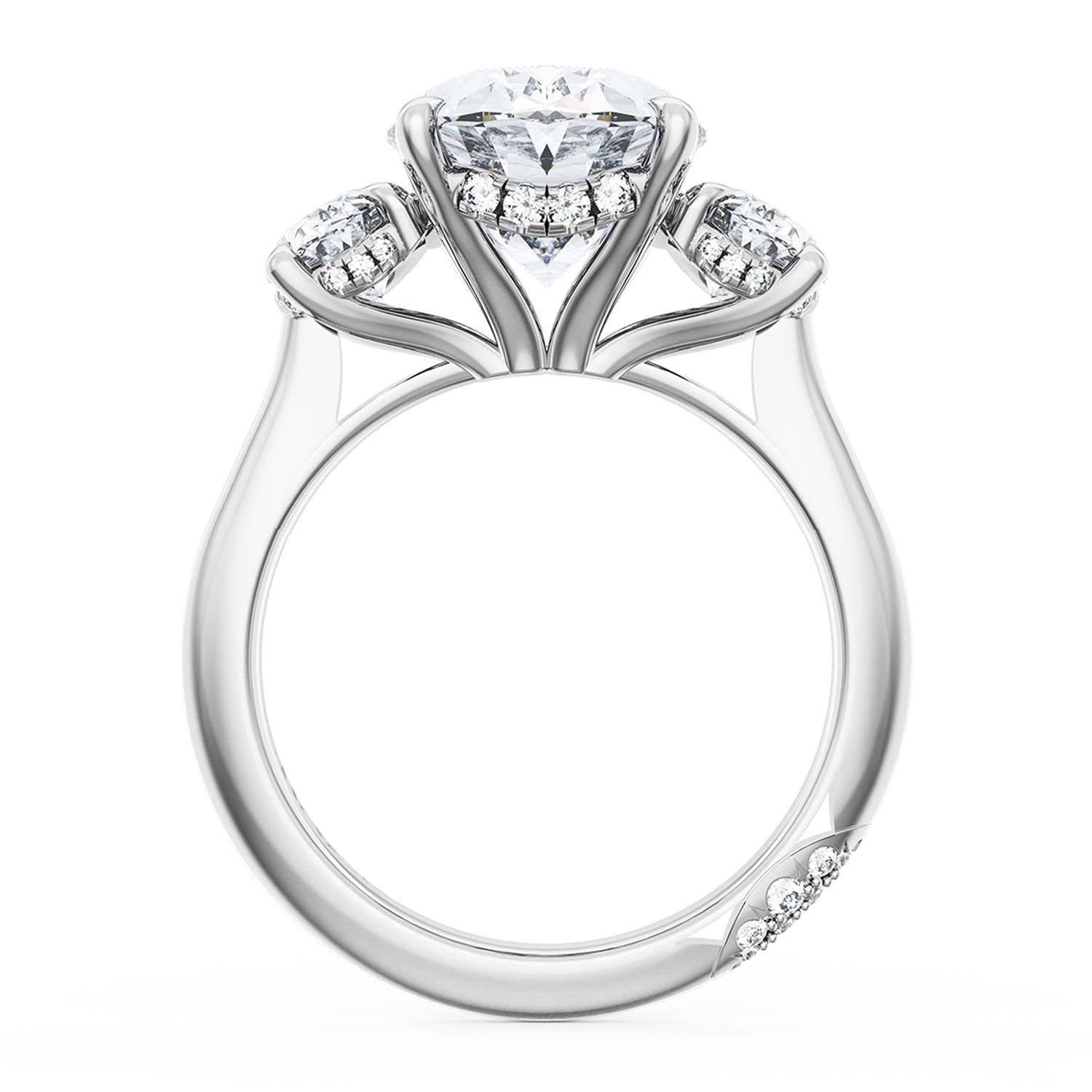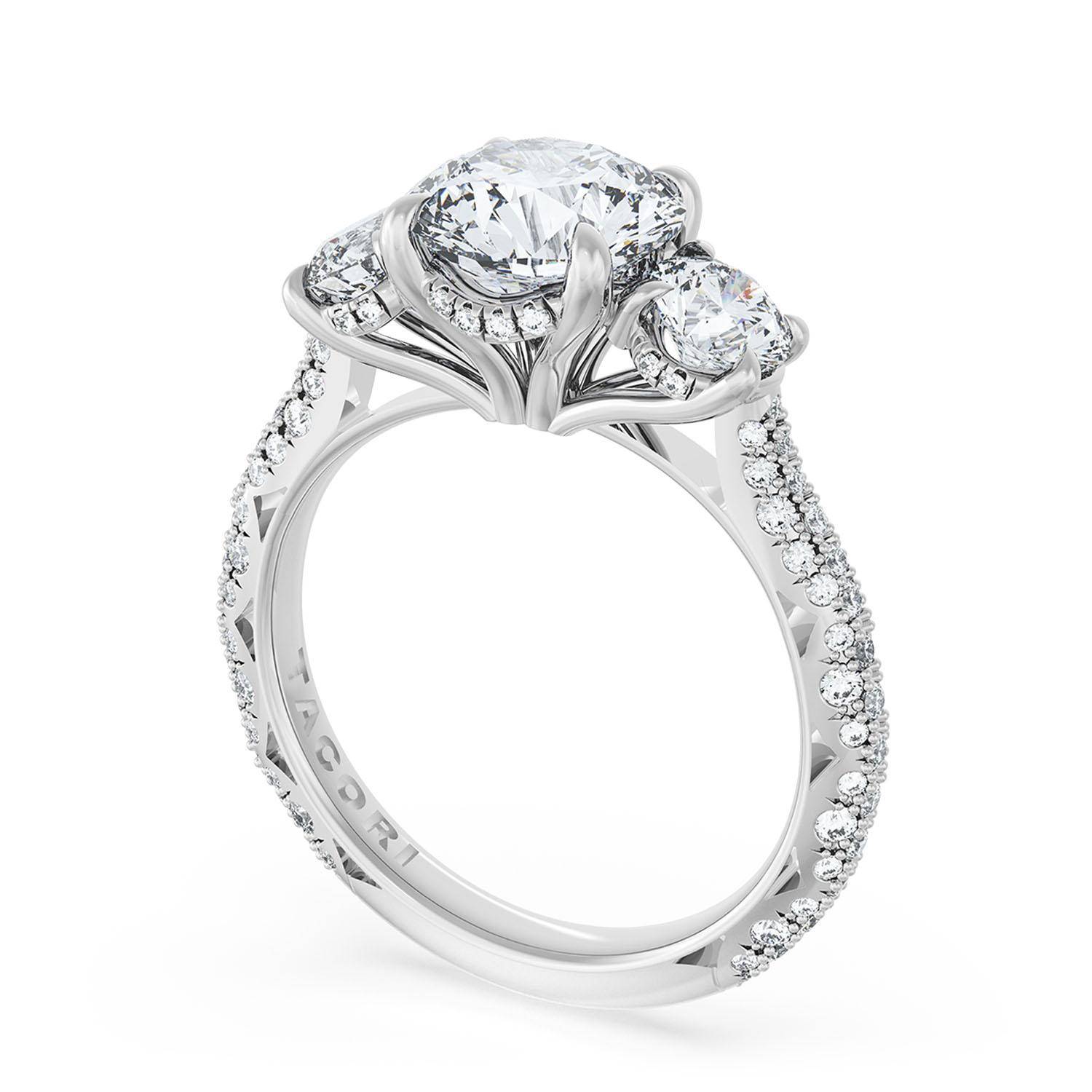 This 3-stone ring features a round brilliant center and matching round side stones, each accented with a hidden bloom. The Founder's Crescent Fabric wraps around the ceiling of the ring and continues for 3/4 diamond coverage.