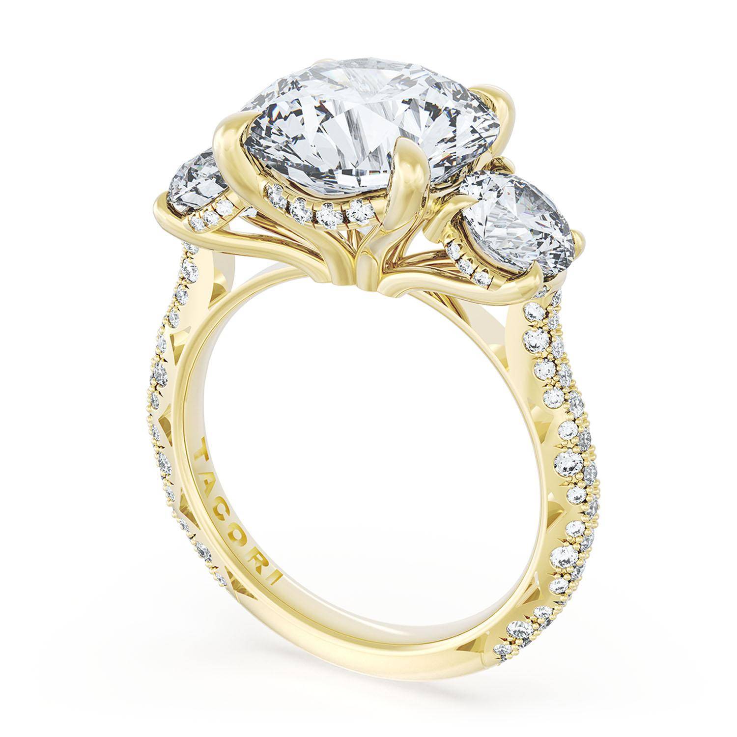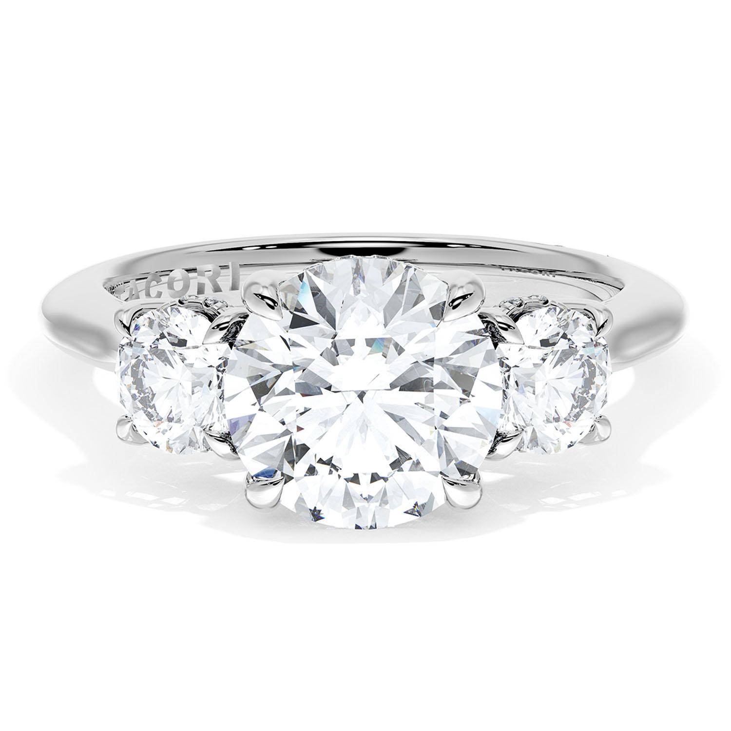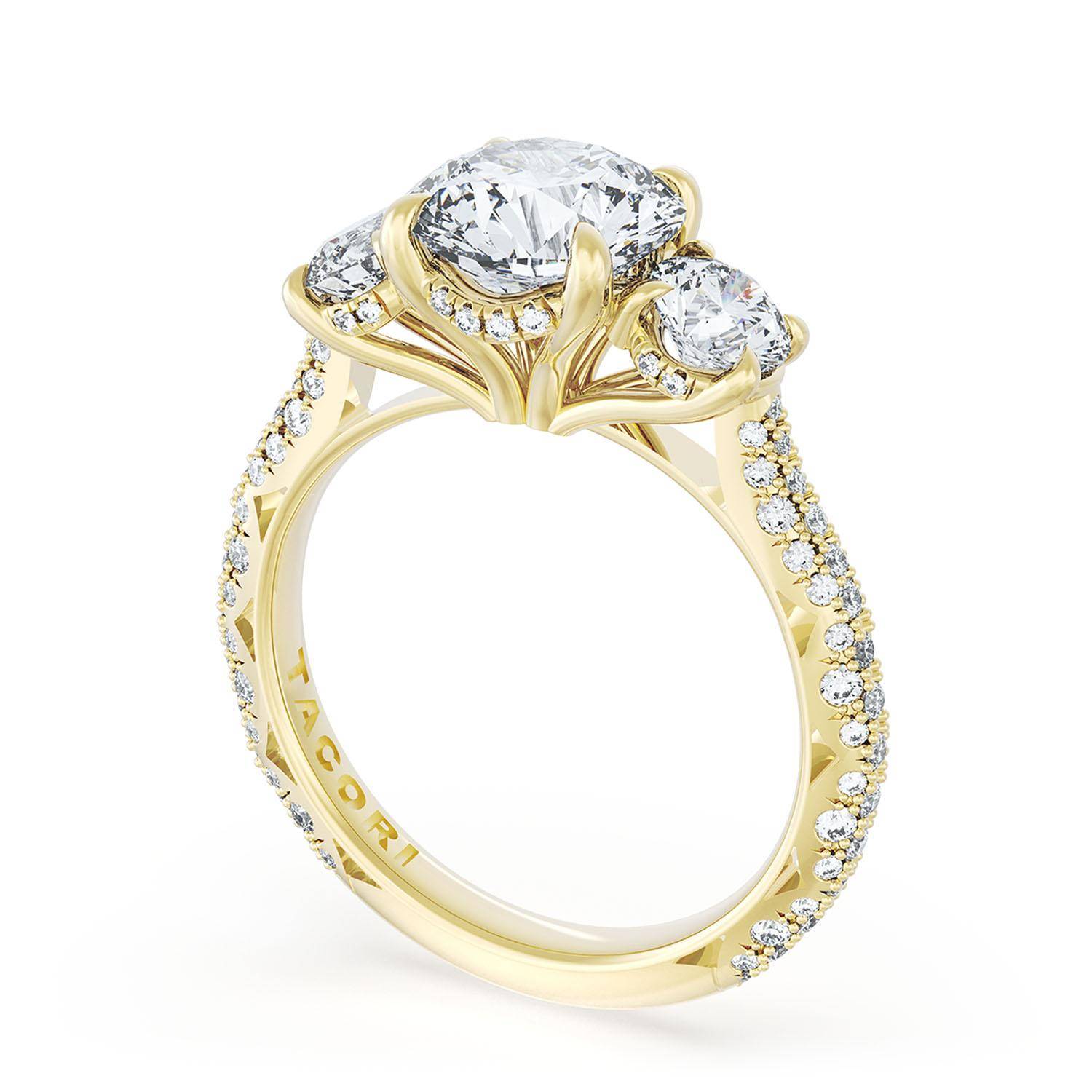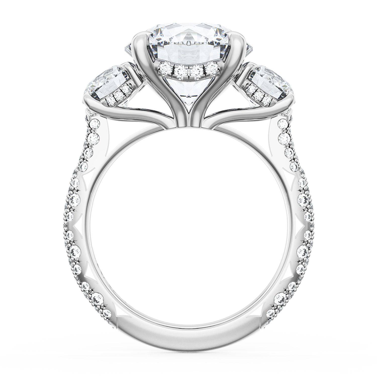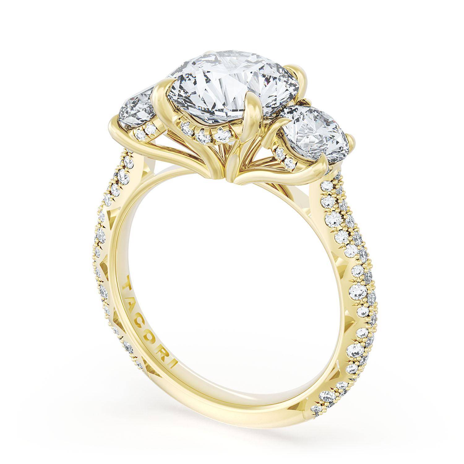 This 3-stone ring features a round brilliant center and matching round side stones, each accented with a hidden bloom. The Founder's Crescent Fabric wraps around the ceiling of the ring and continues for 3/4 diamond coverage.