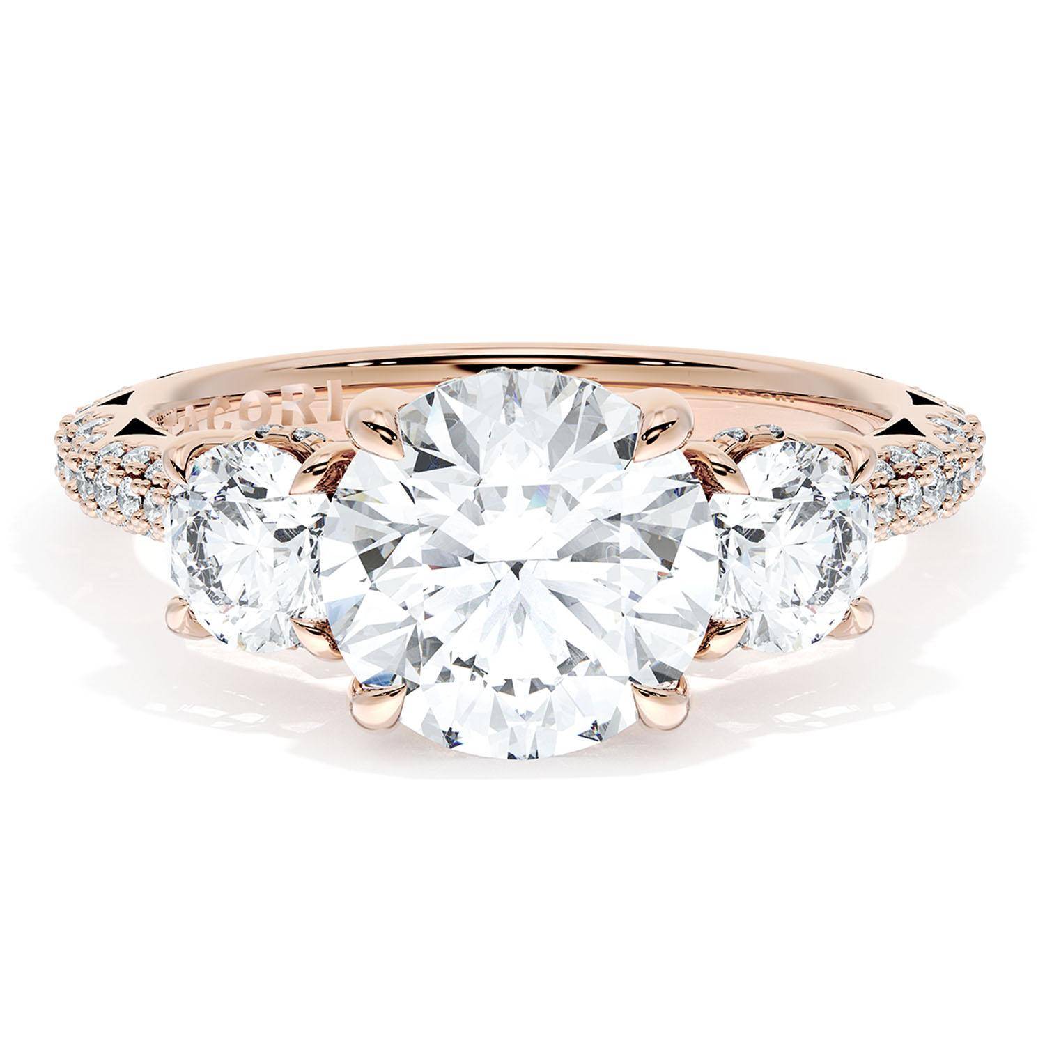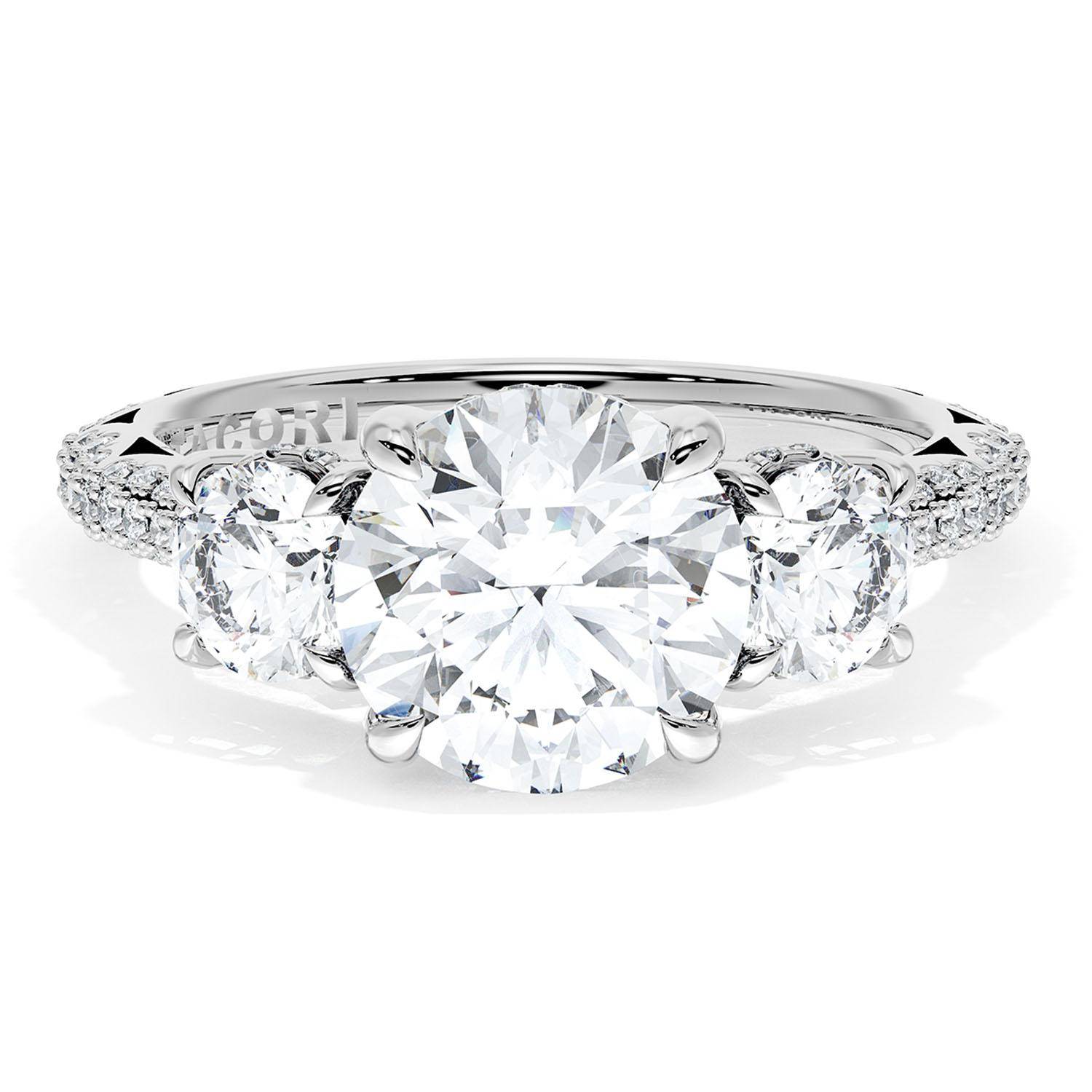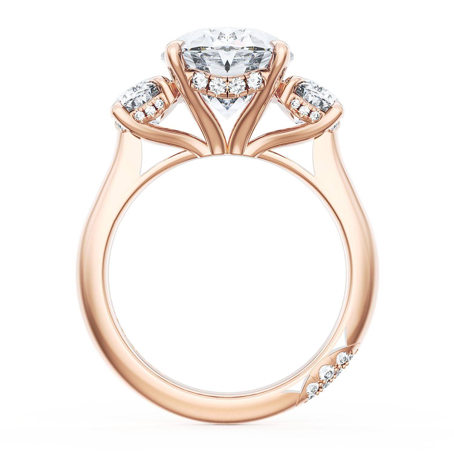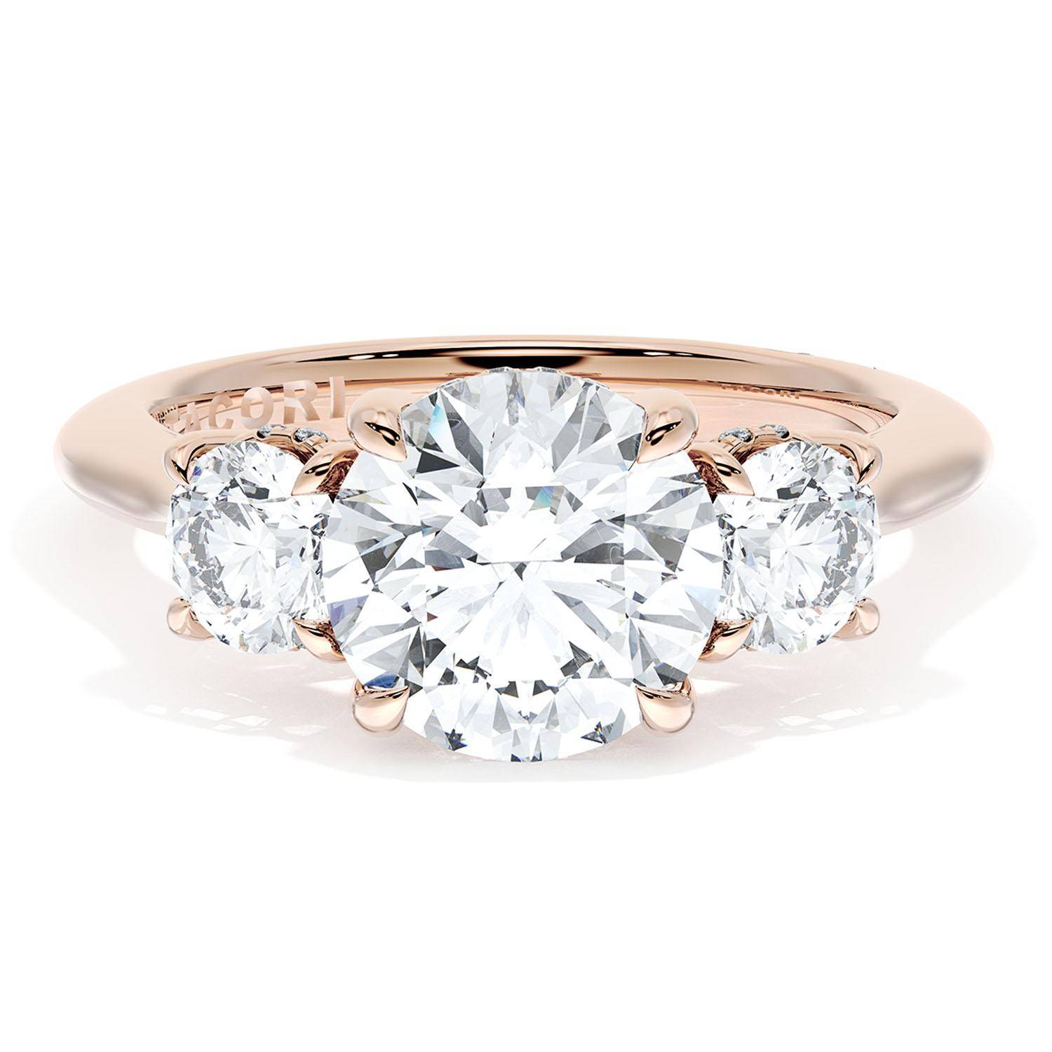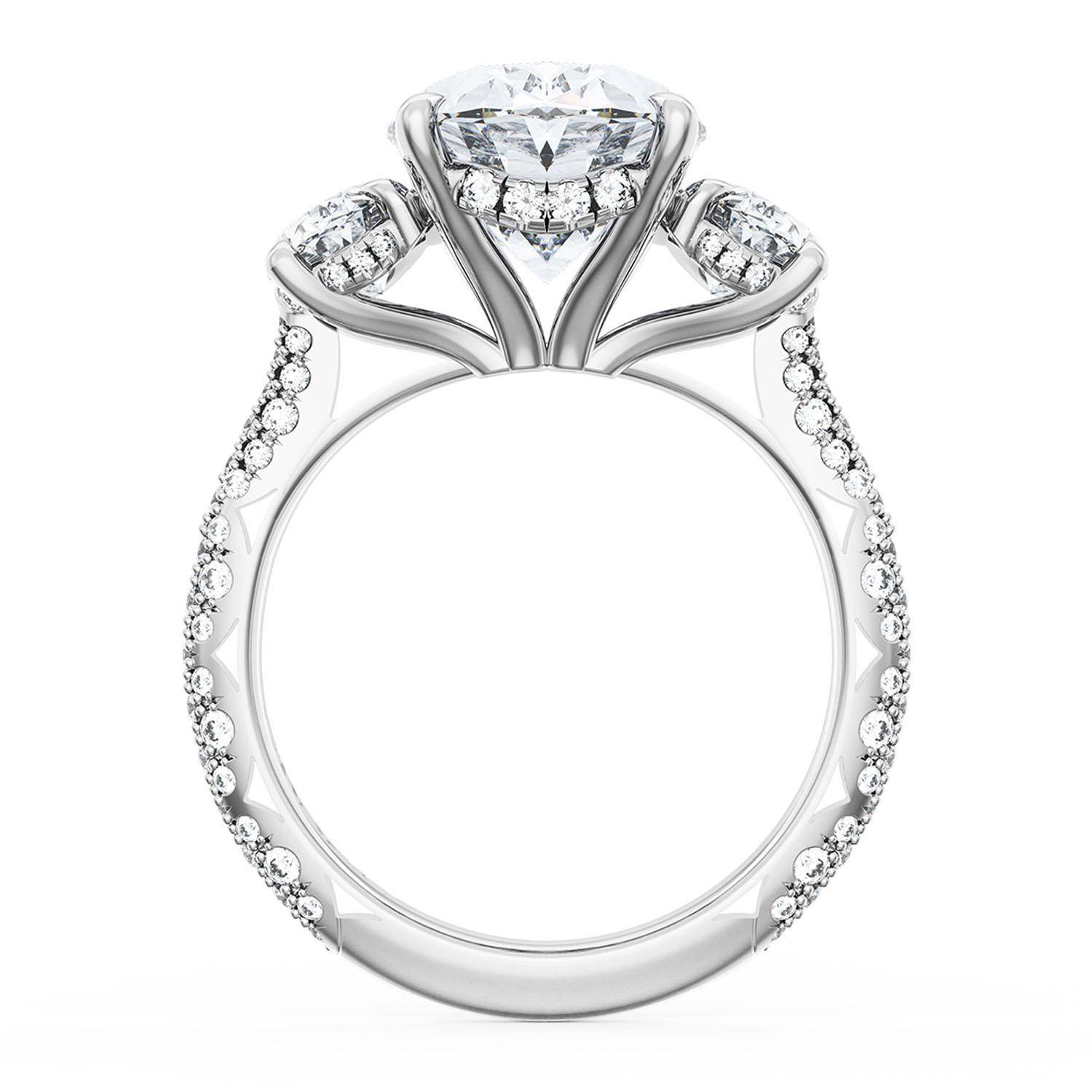 This 3-stone ring features a round brilliant center and matching round side stones, each accented with a hidden bloom. The Founder's Crescent Fabric wraps around the ceiling of the ring and continues for 3/4 diamond coverage.