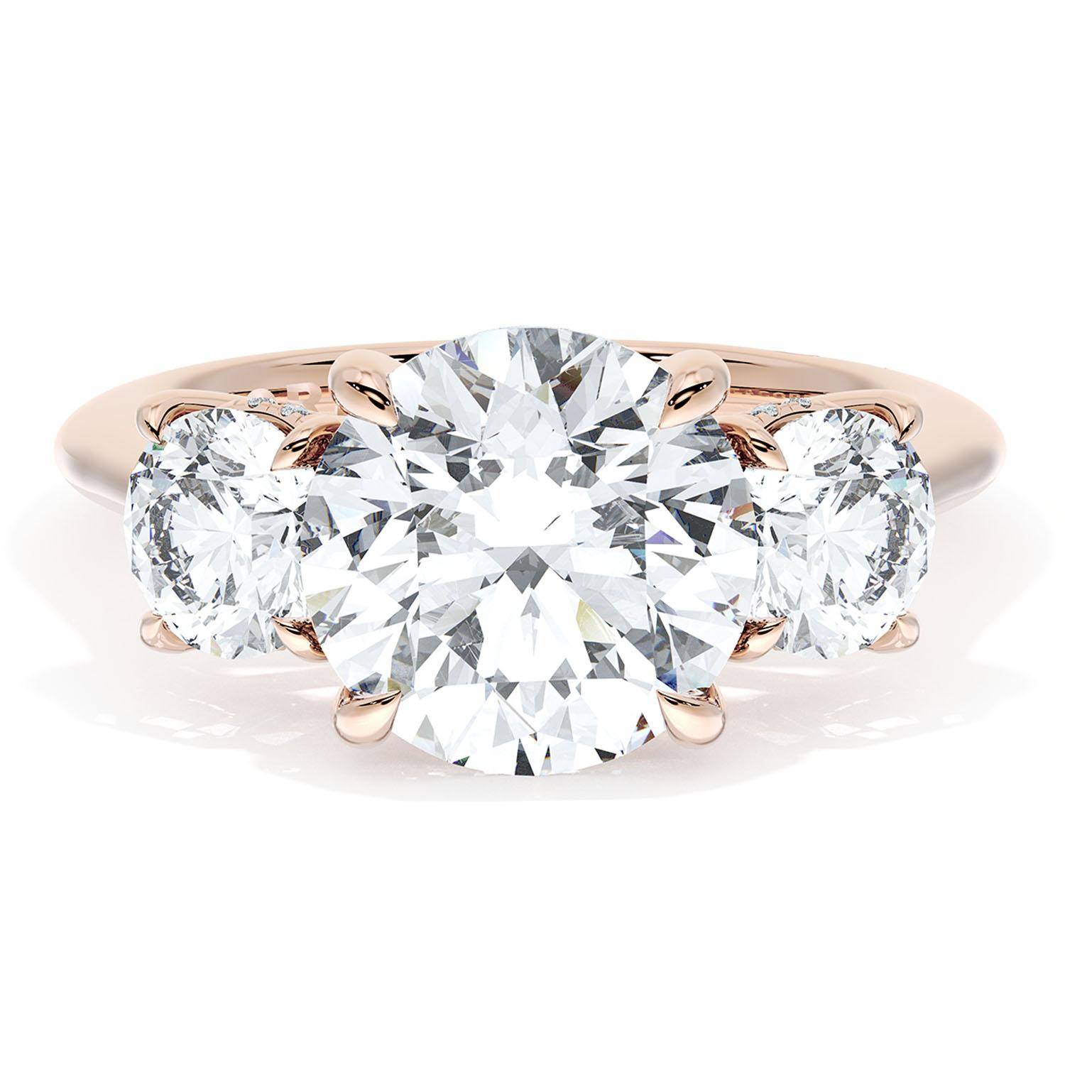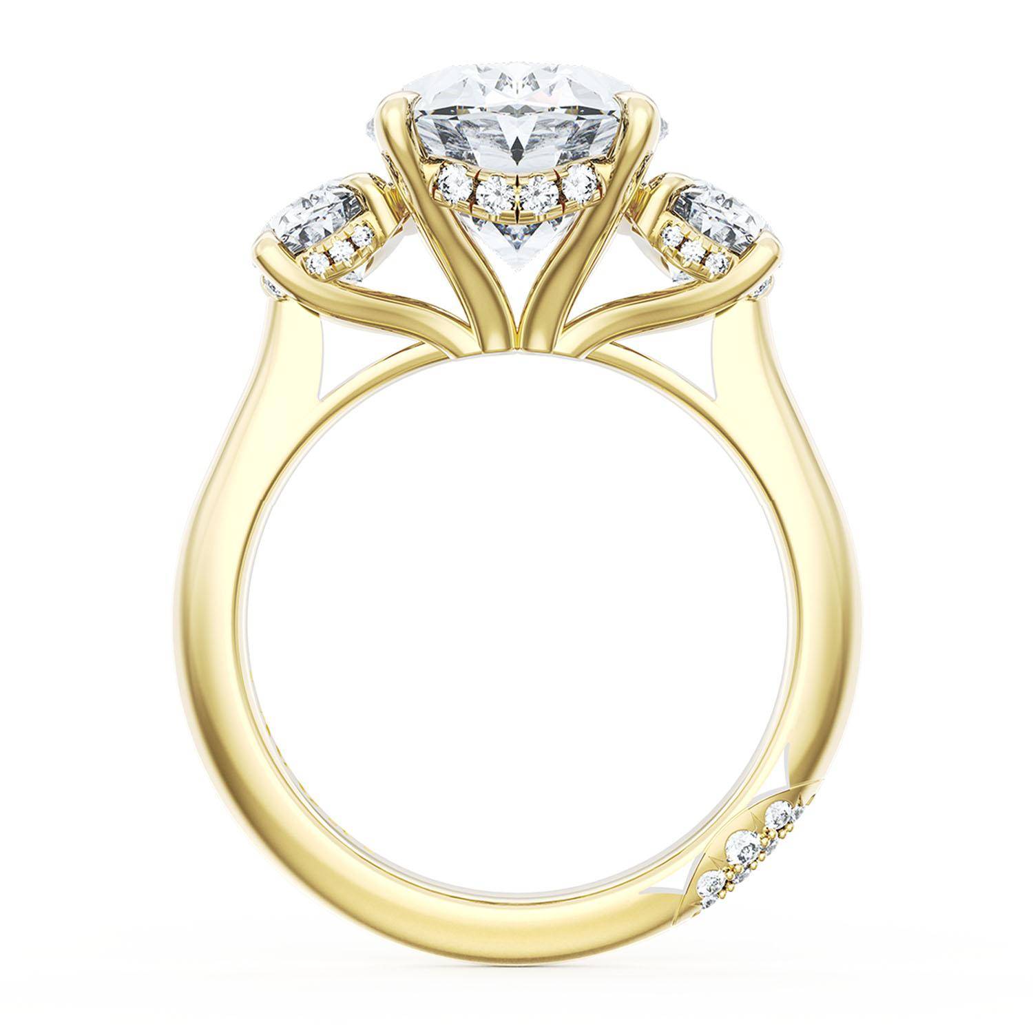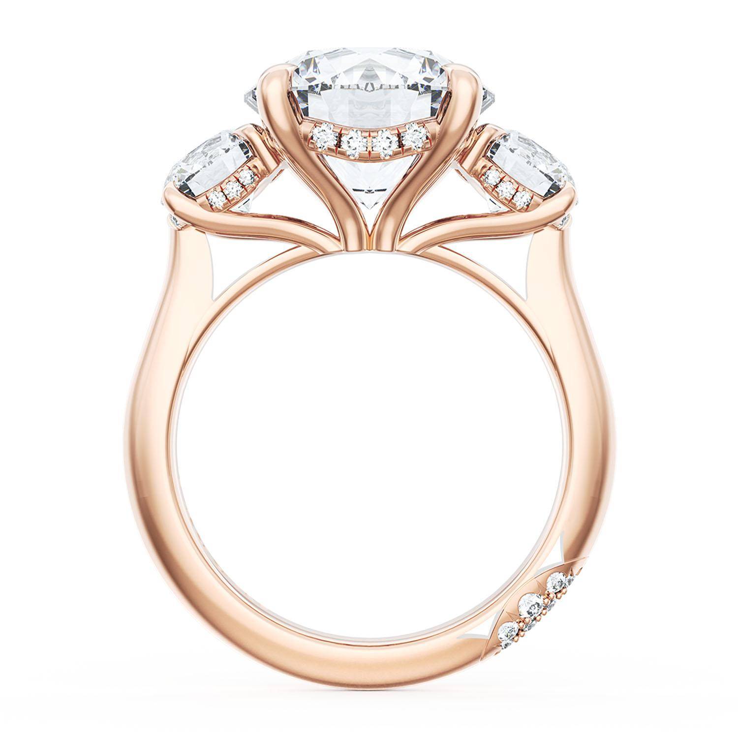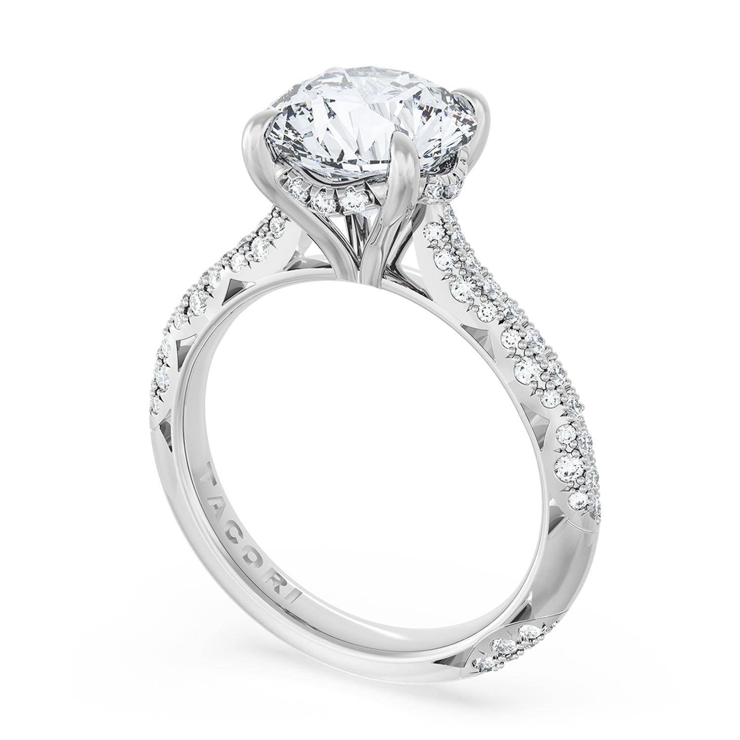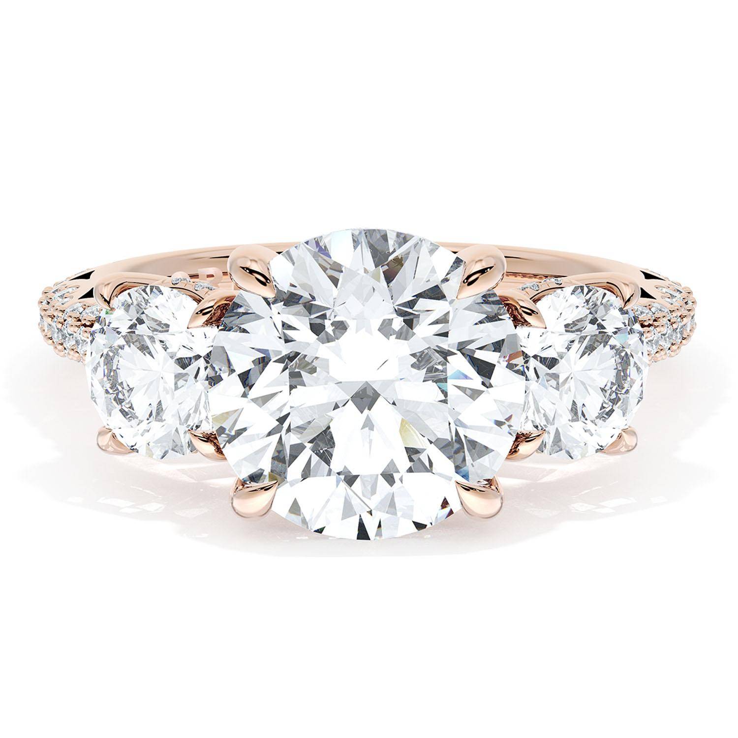 This 3-stone ring features a round brilliant center and matching round side stones, each accented with a hidden bloom. The Founder's Crescent Fabric wraps around the ceiling of the ring and continues for 3/4 diamond coverage.