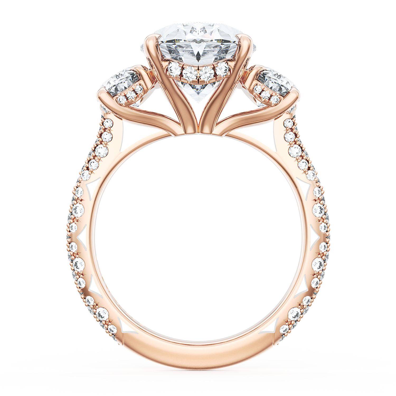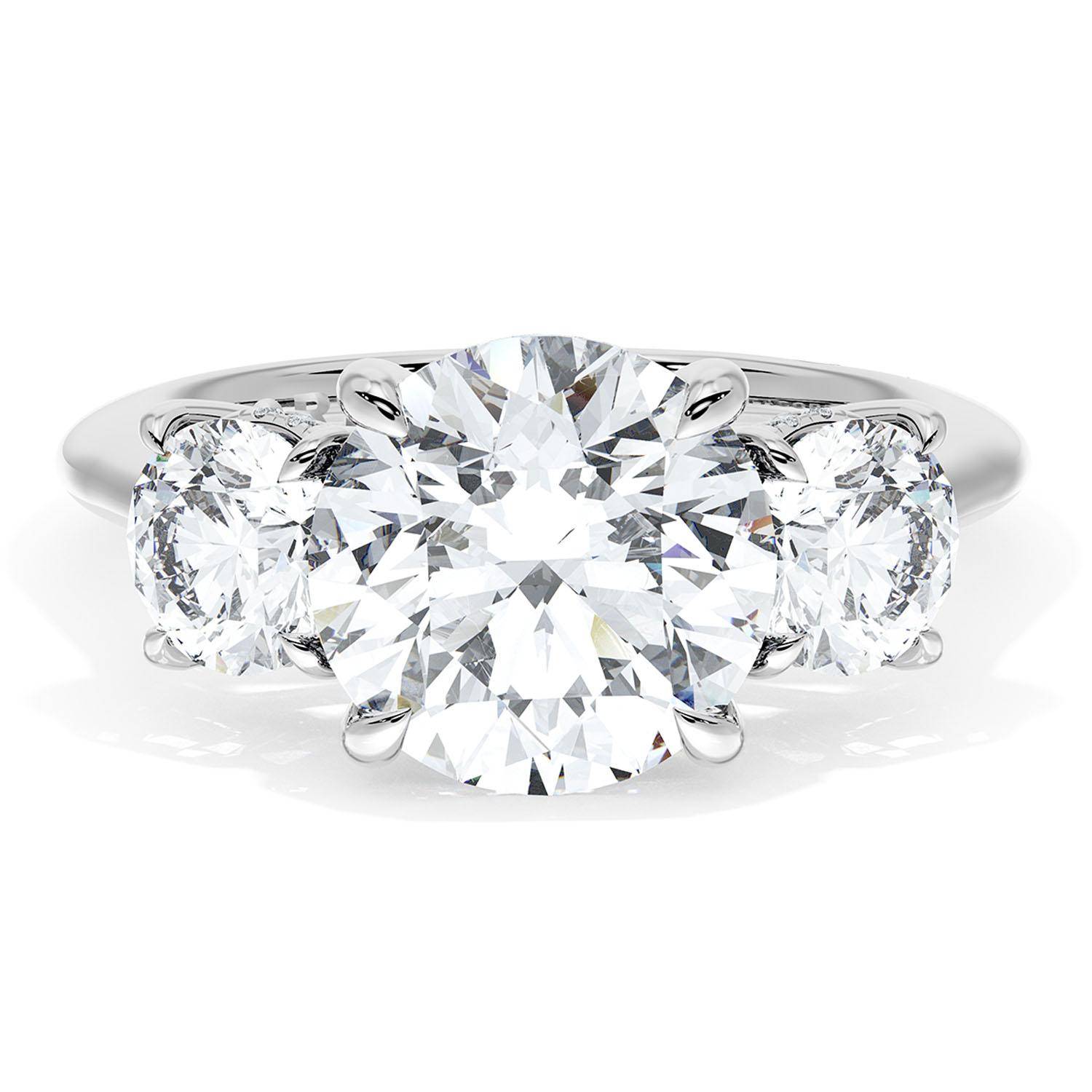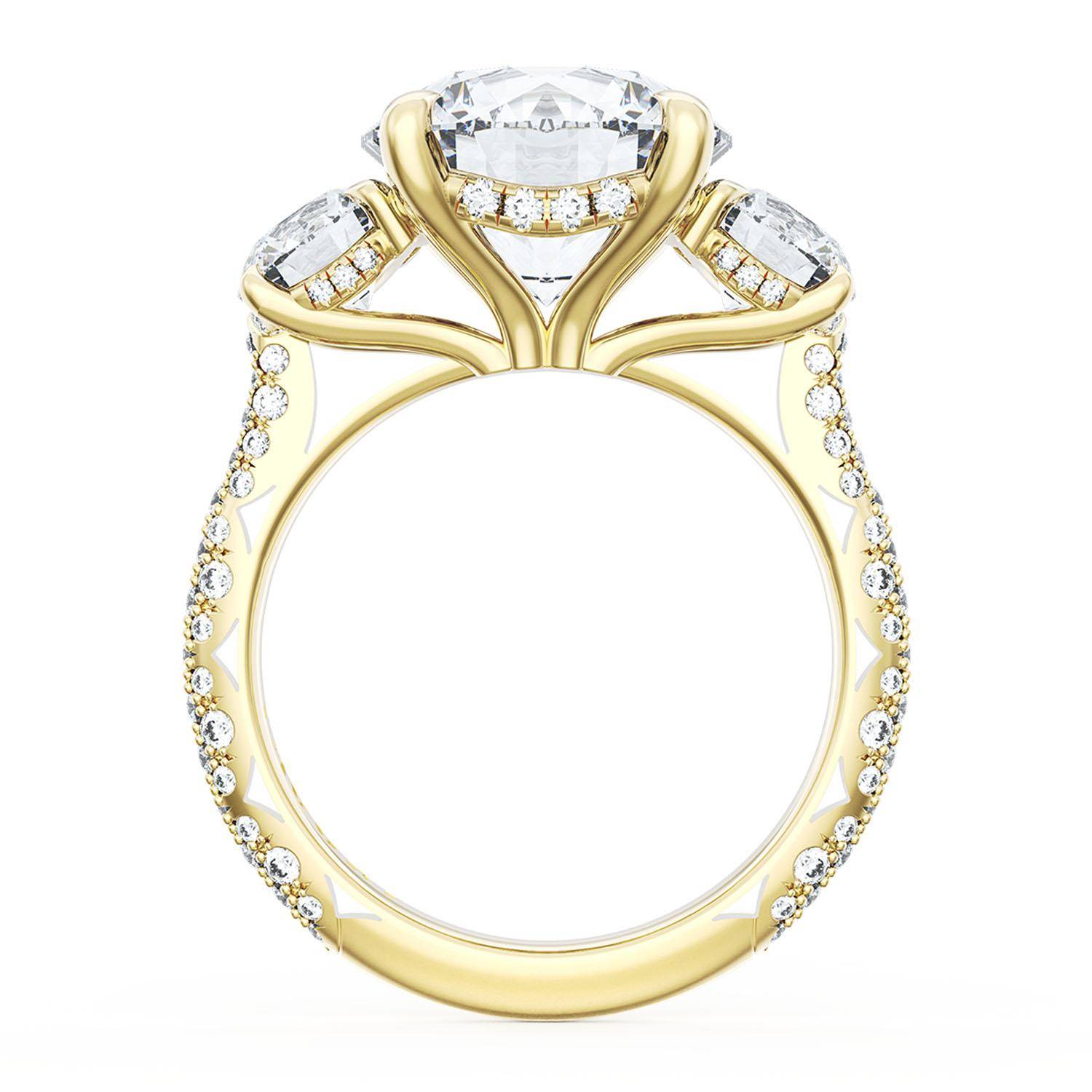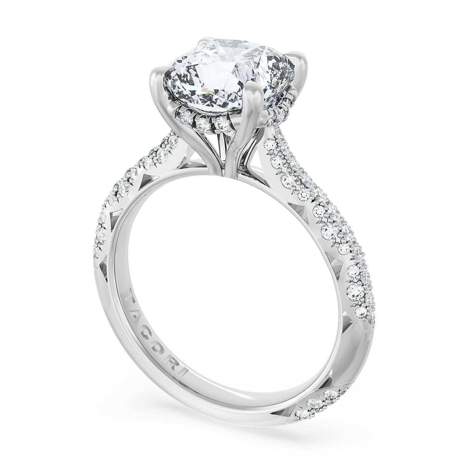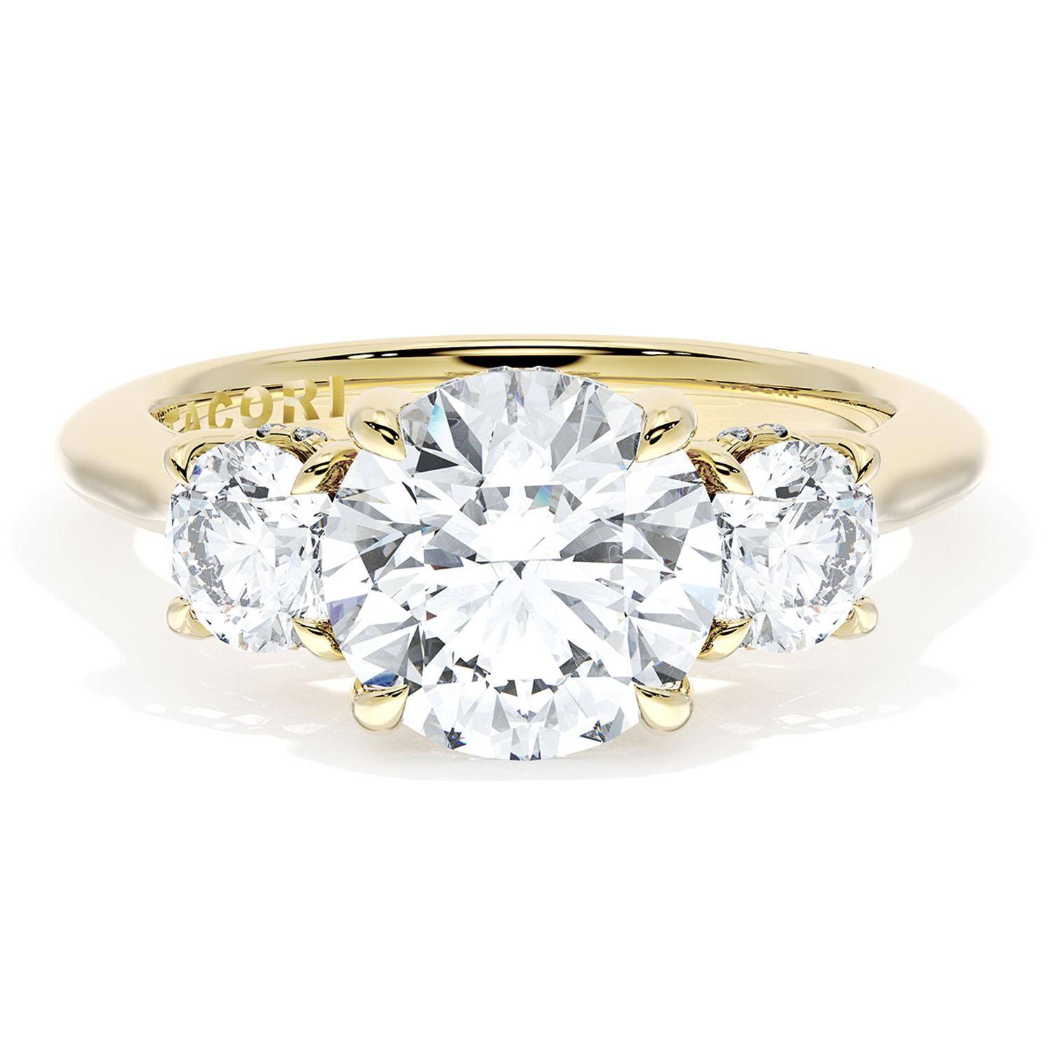 This 3-stone ring features a round brilliant center and matching round side stones, each accented with a hidden bloom. The Founder's Crescent Fabric wraps around the ceiling of the ring and continues for 3/4 diamond coverage.