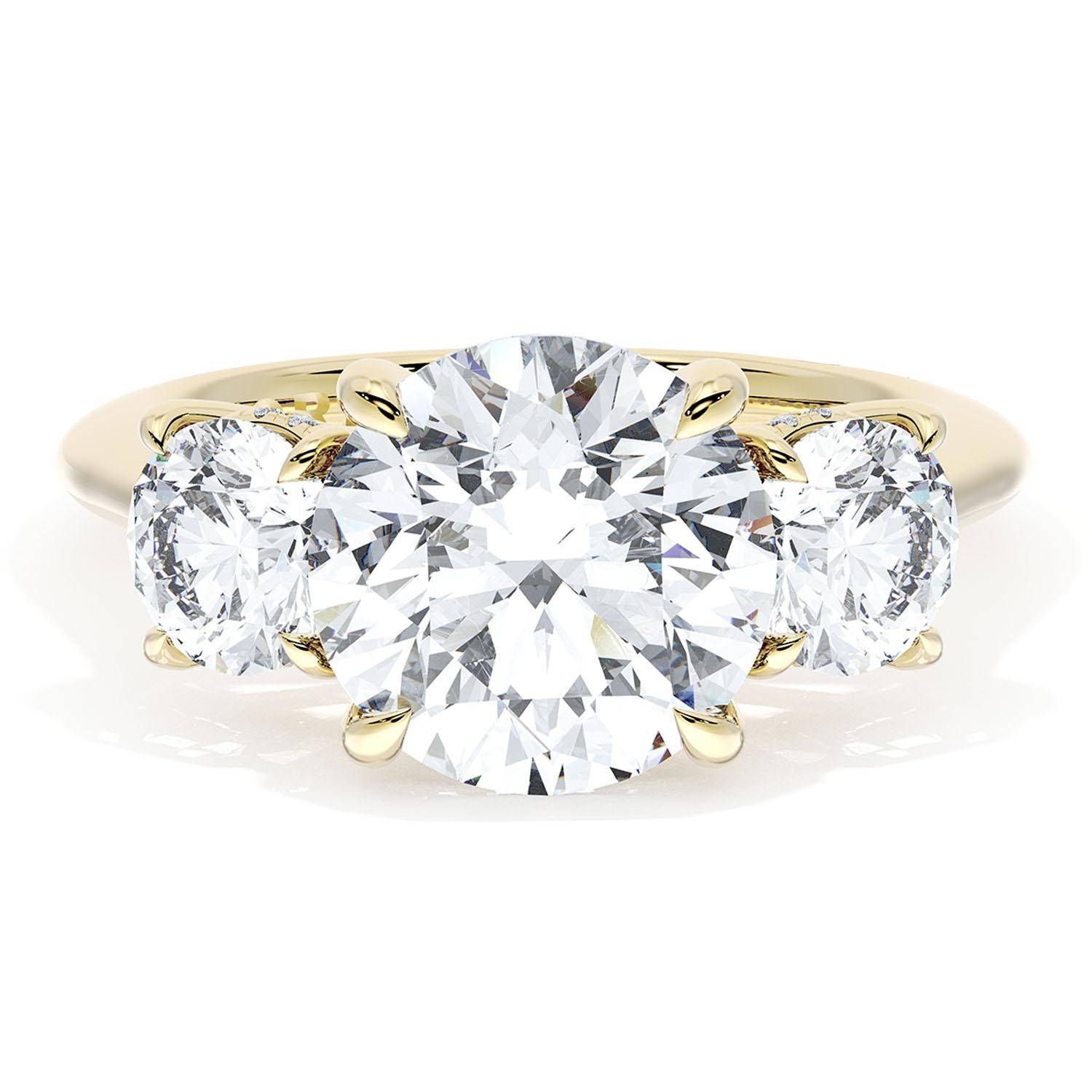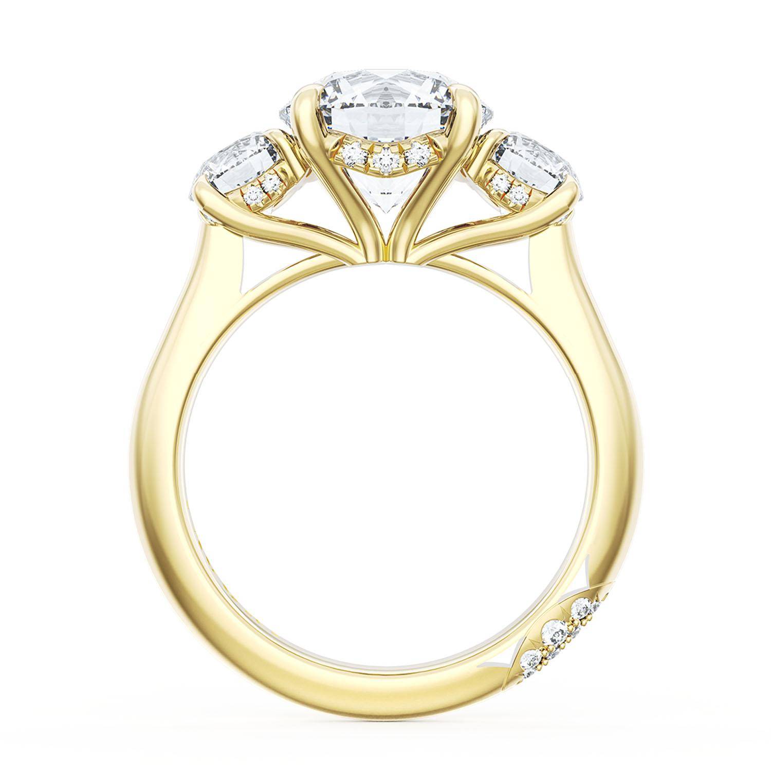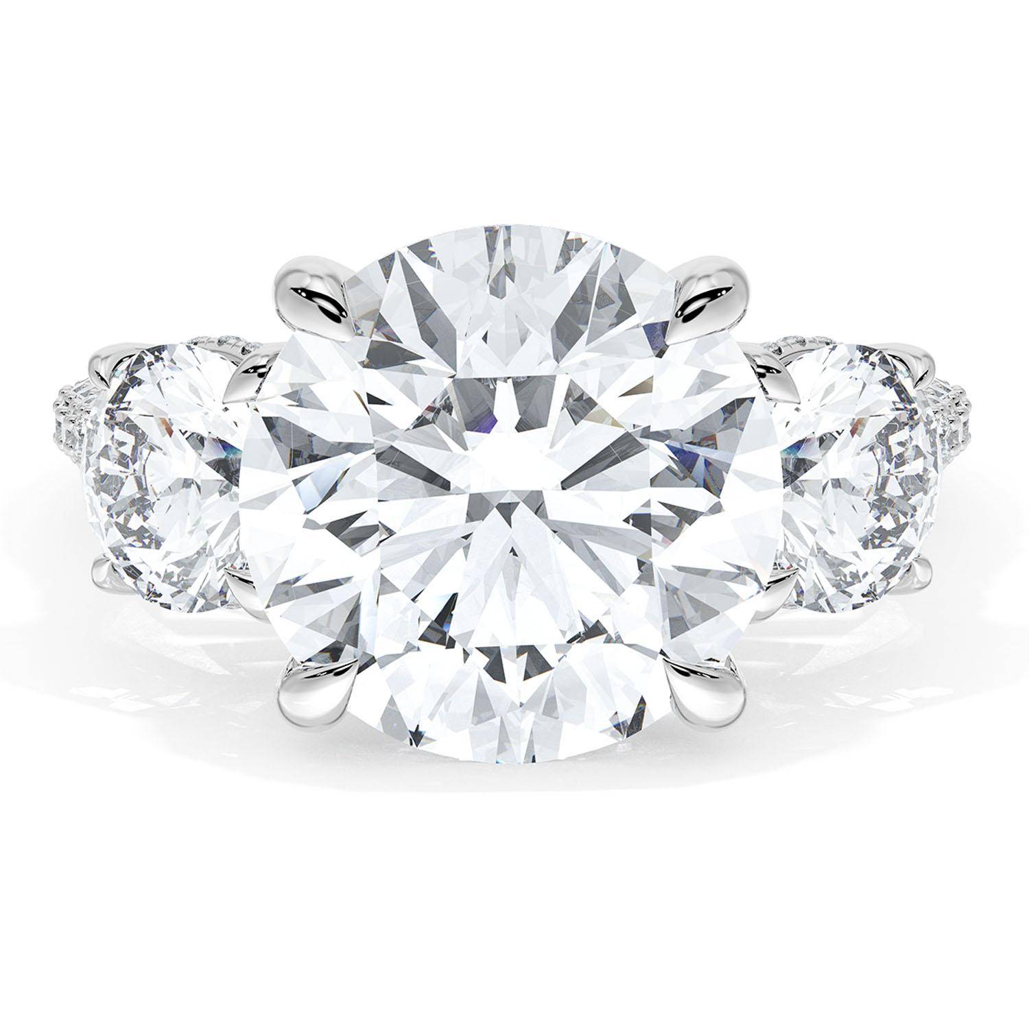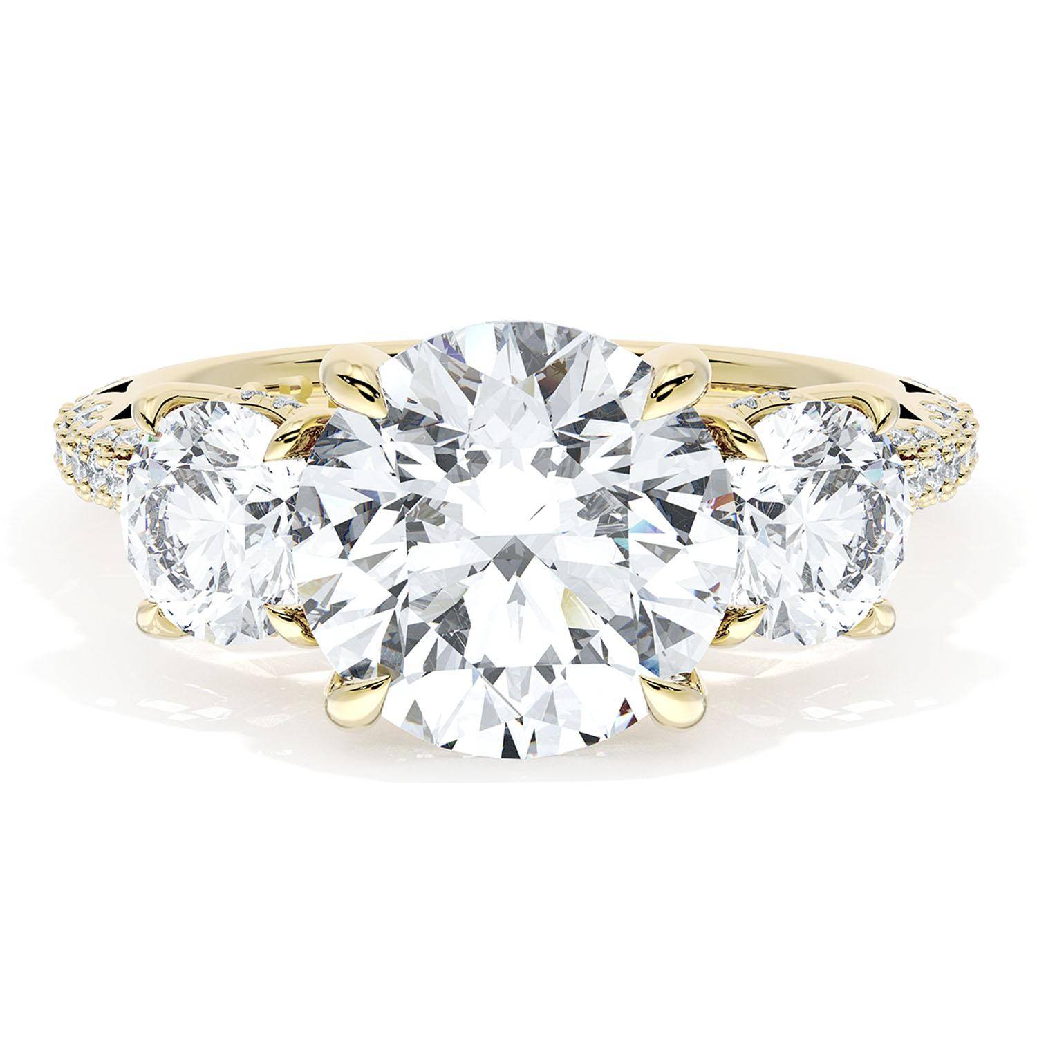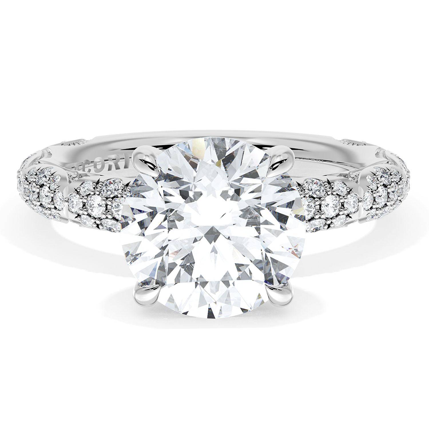 This 3-stone ring features a round brilliant center and matching round side stones, each accented with a hidden bloom. The Founder's Crescent Fabric wraps around the ceiling of the ring and continues for 3/4 diamond coverage.
