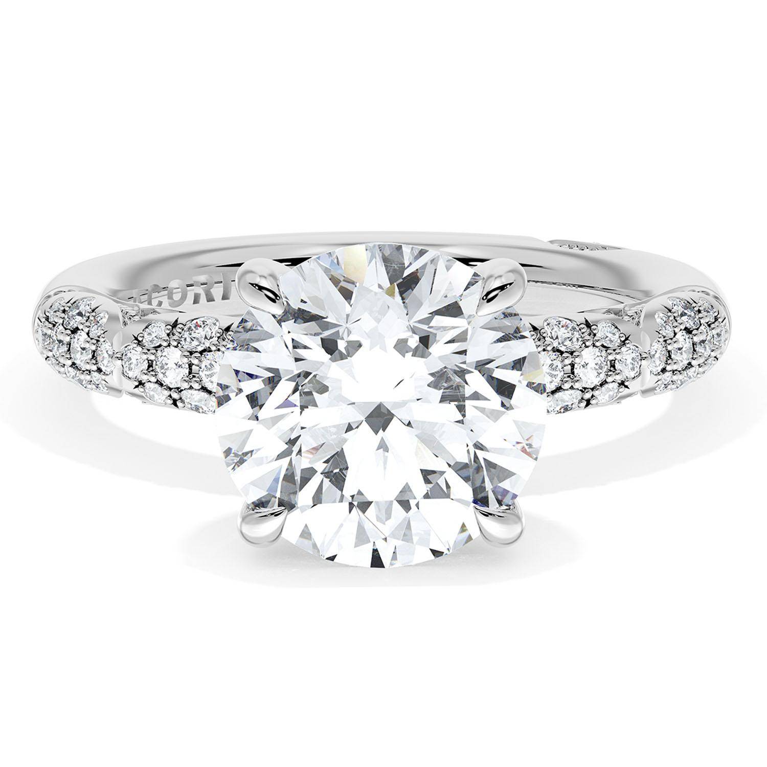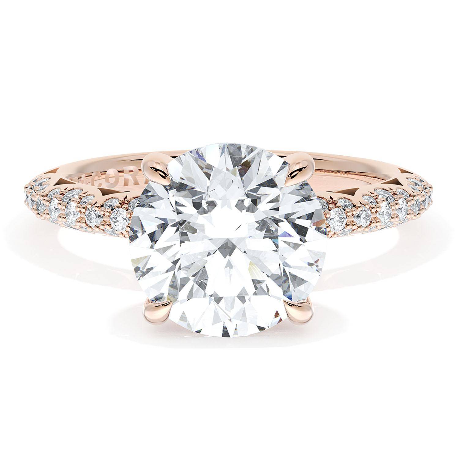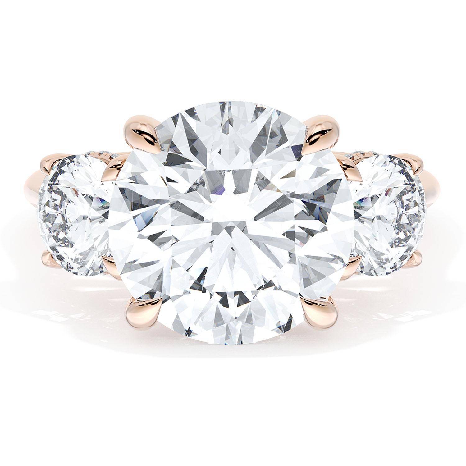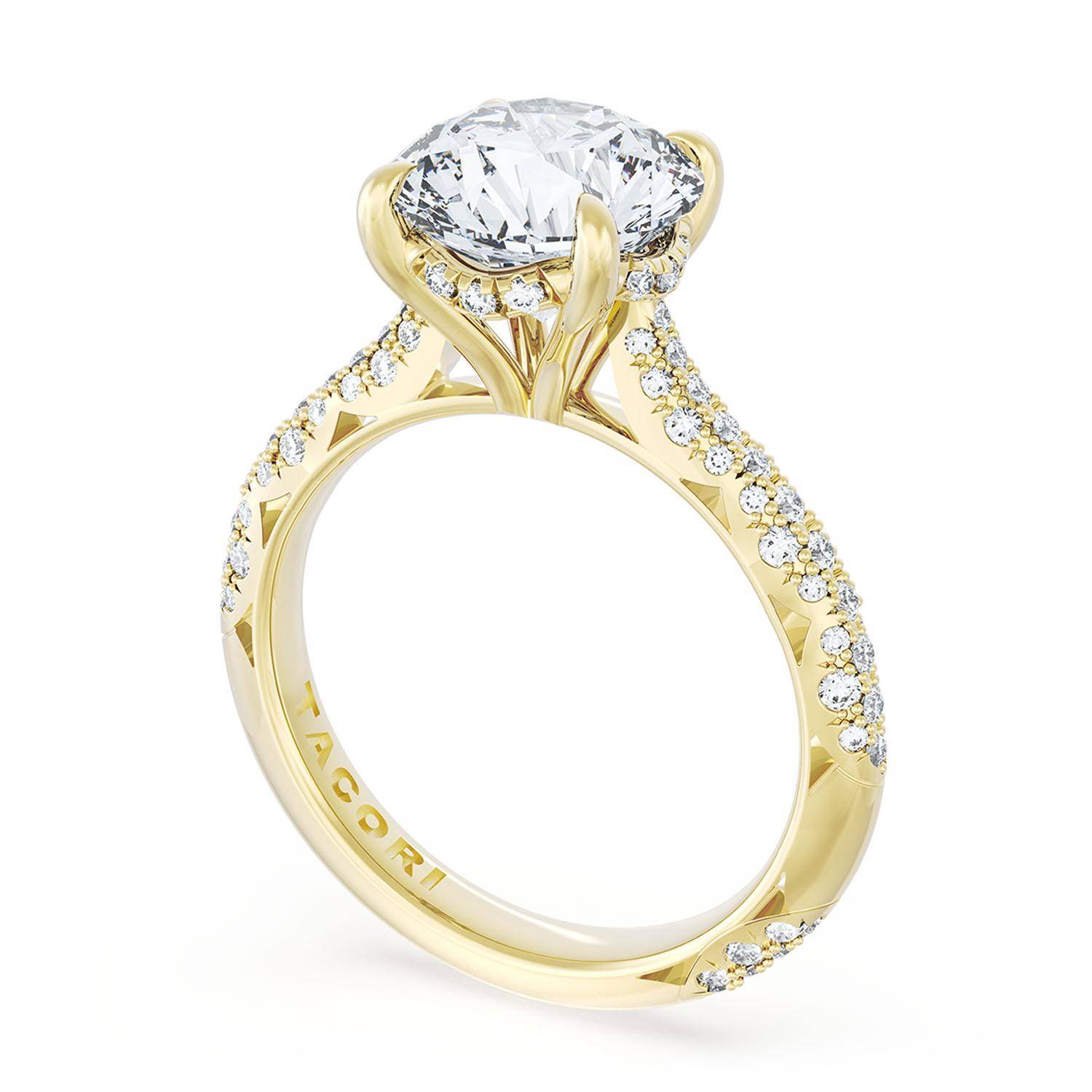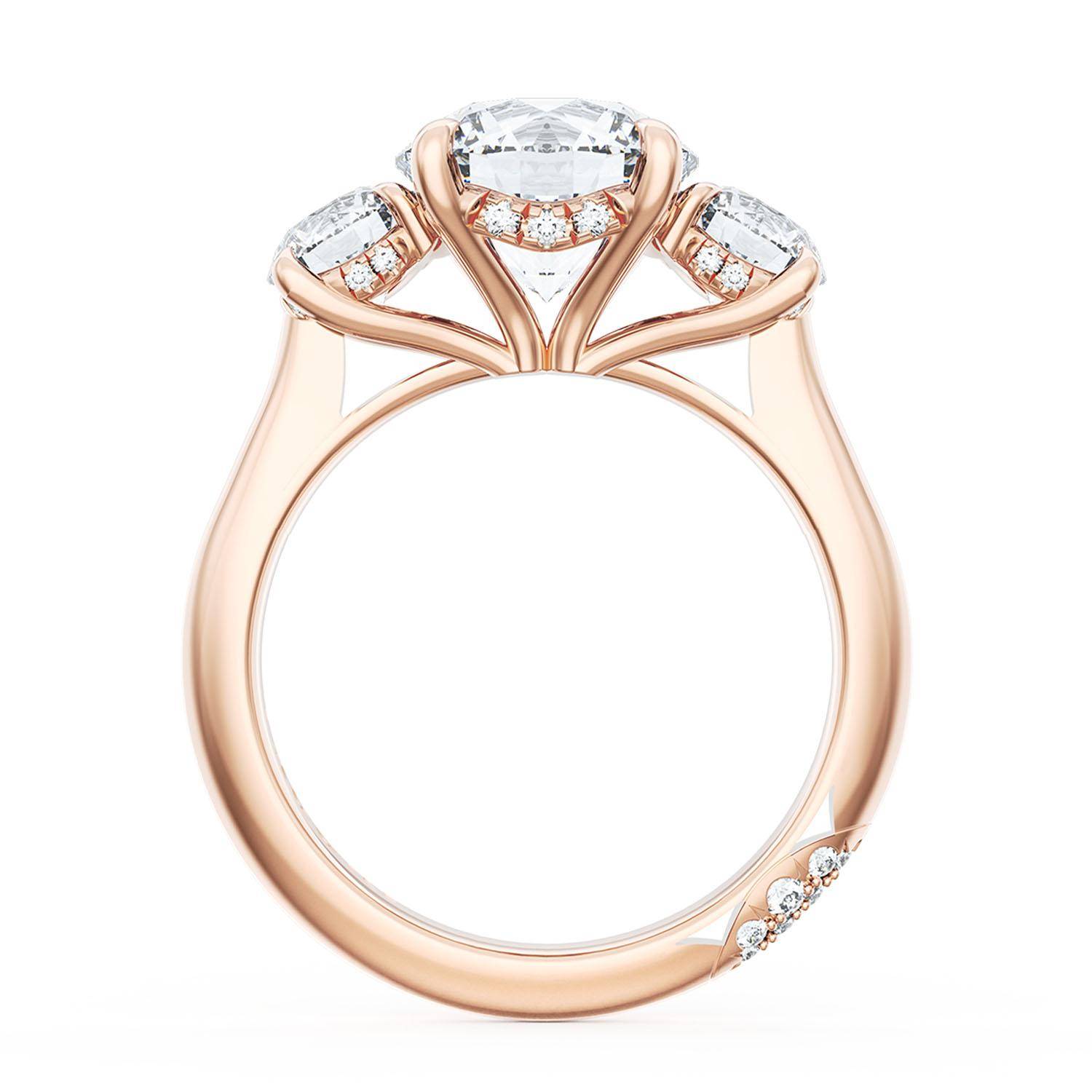 This 3-stone ring features a round brilliant center and matching round side stones, each accented with a hidden bloom. The Founder's Crescent Fabric wraps around the ceiling of the ring and continues for 3/4 diamond coverage.