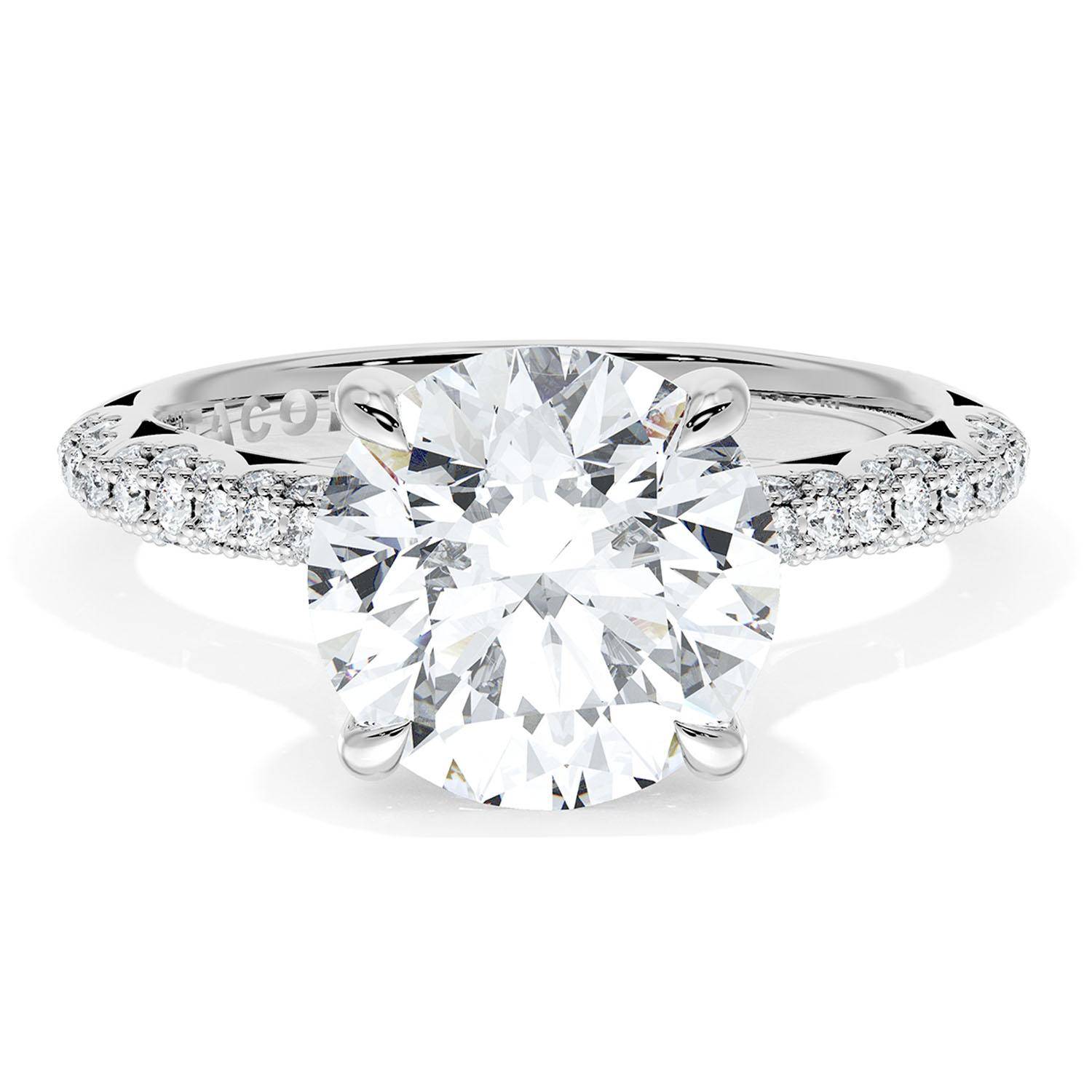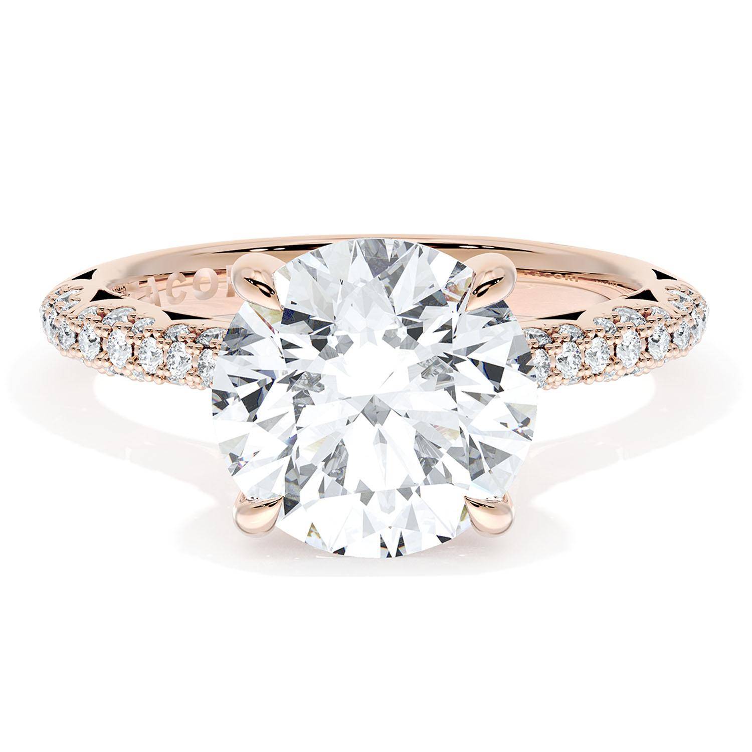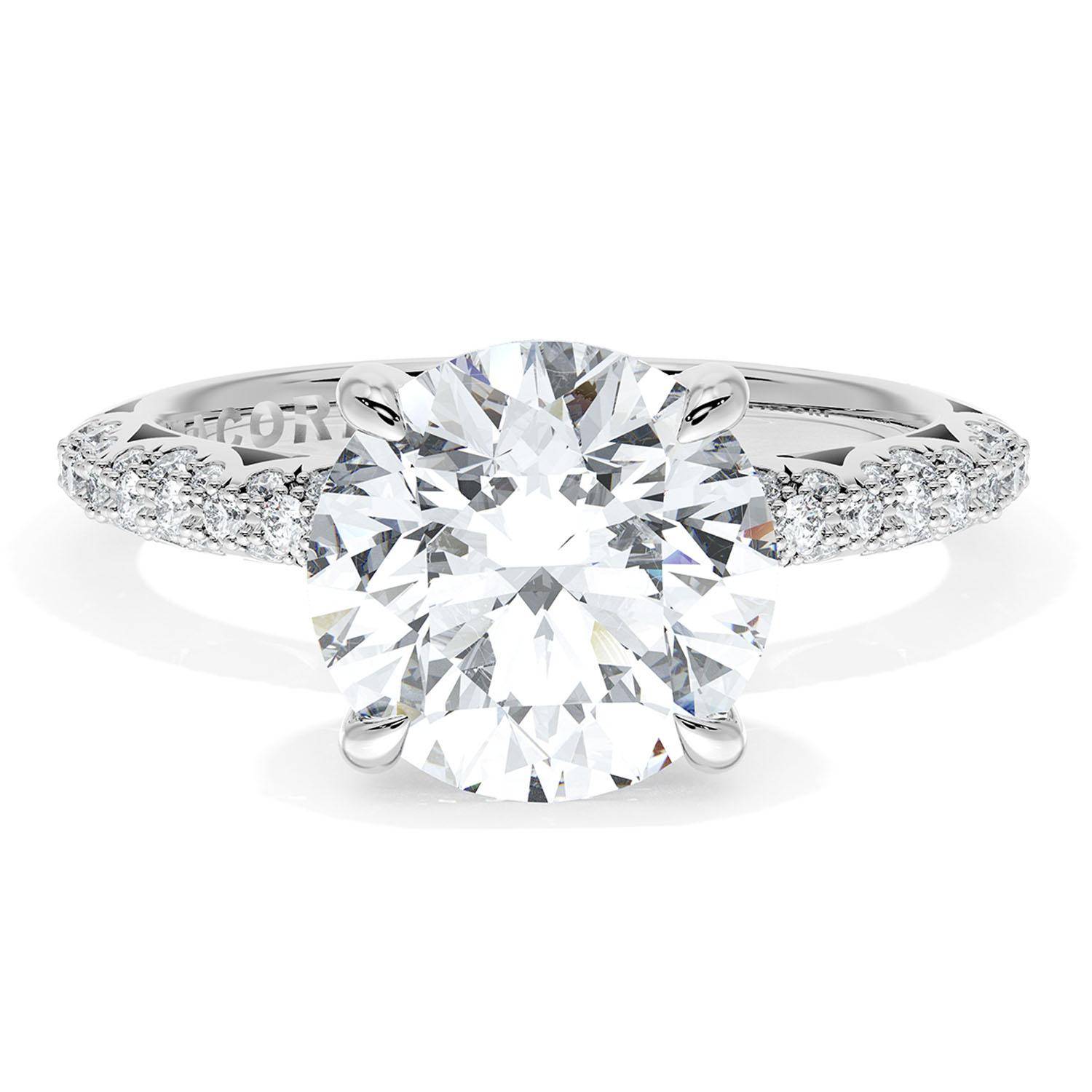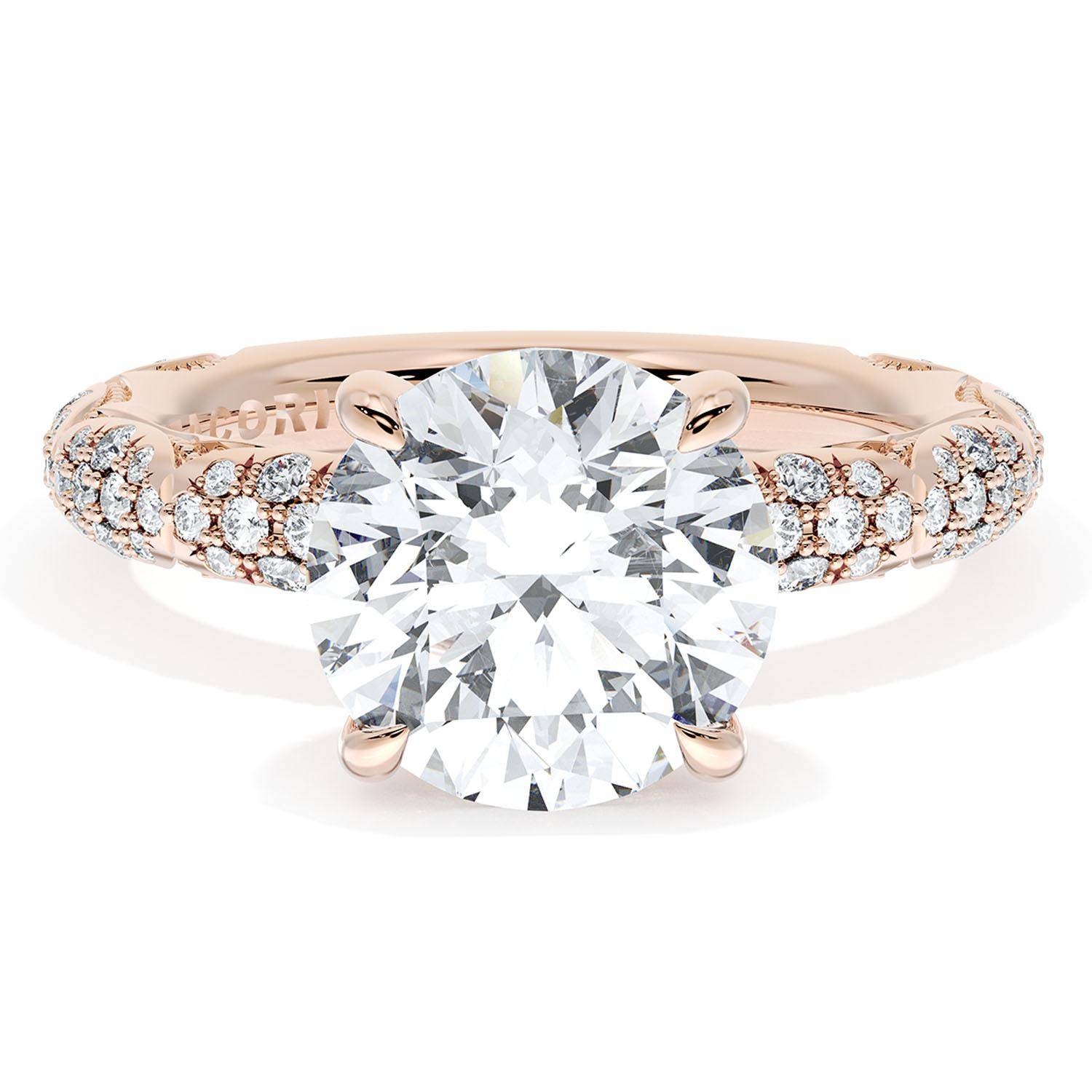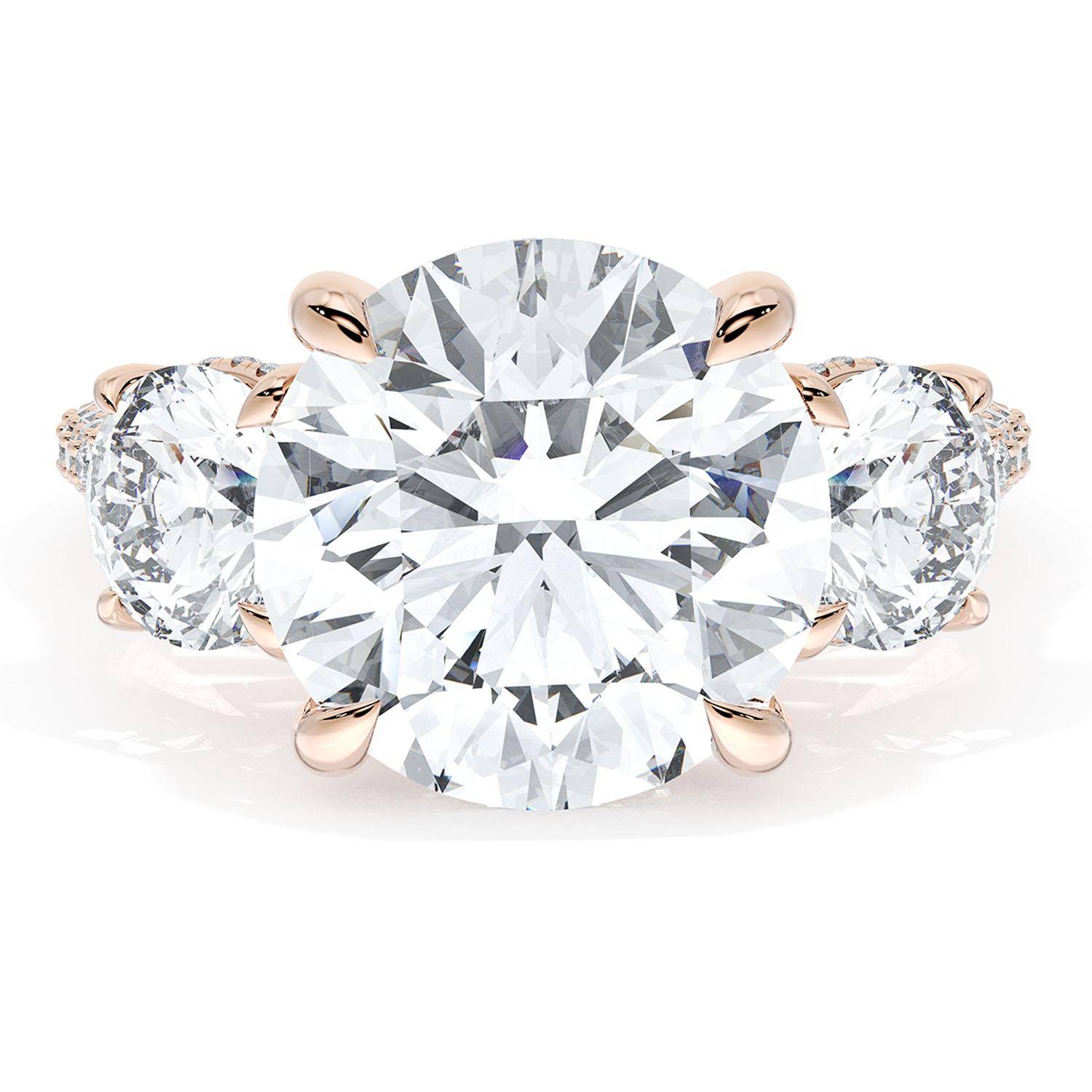 This 3-stone ring features a round brilliant center and matching round side stones, each accented with a hidden bloom. The Founder's Crescent Fabric wraps around the ceiling of the ring and continues for 3/4 diamond coverage.