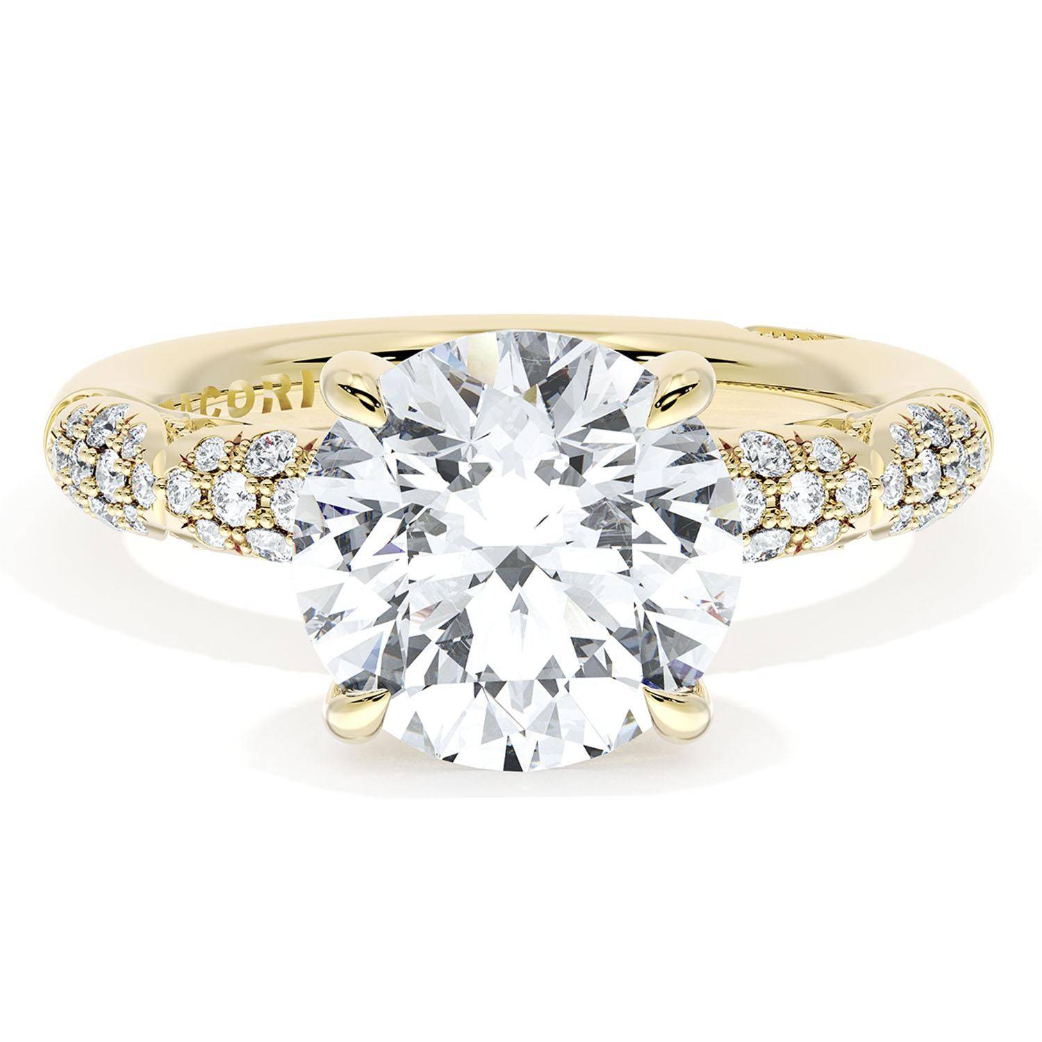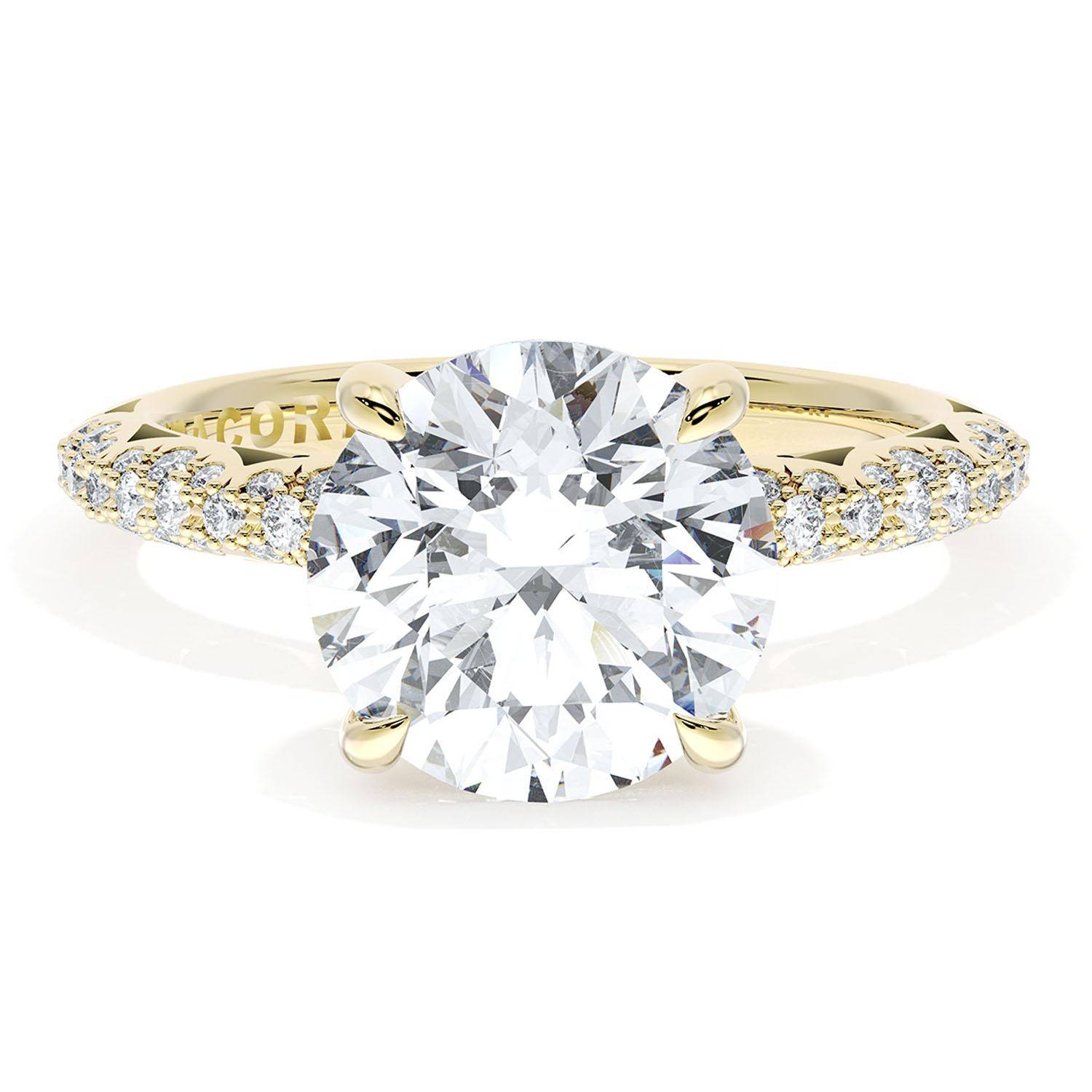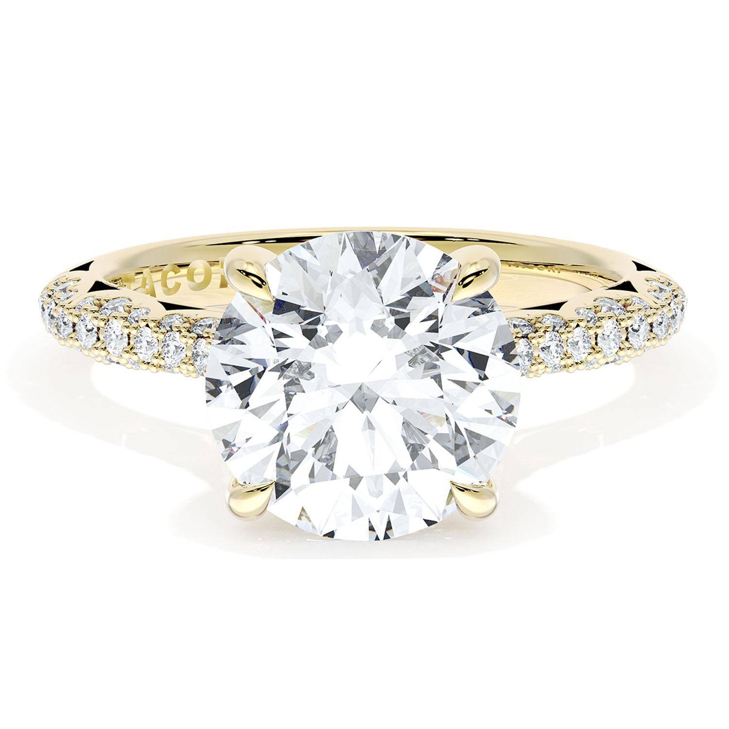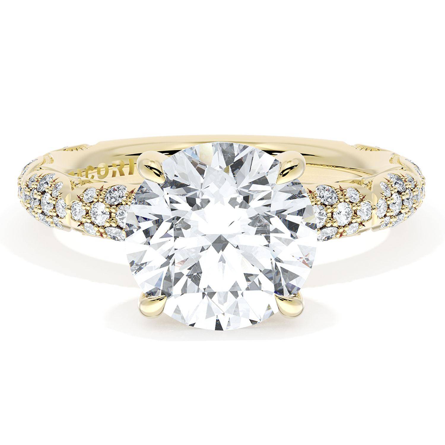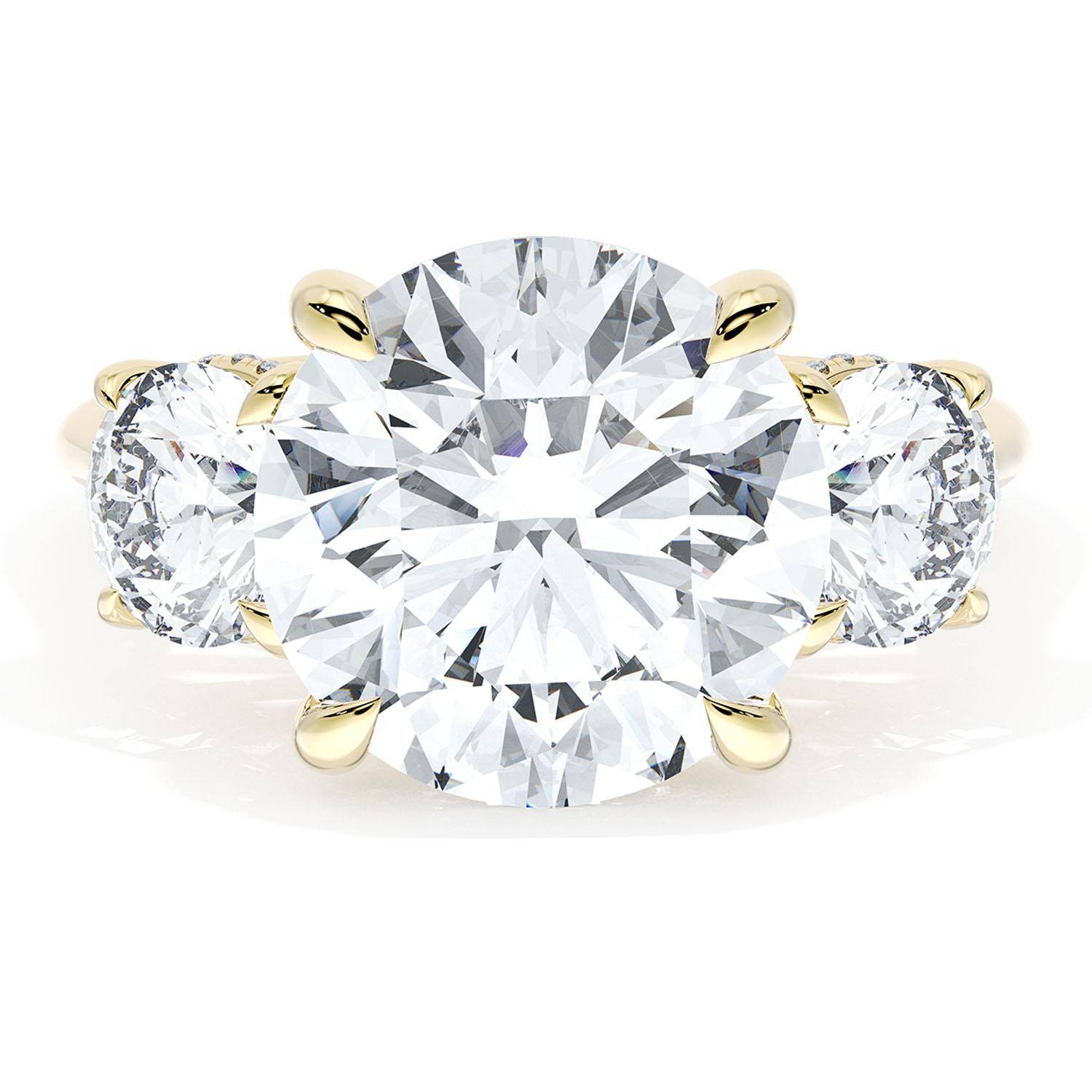 This 3-stone ring features a round brilliant center and matching round side stones, each accented with a hidden bloom. The Founder's Crescent Fabric wraps around the ceiling of the ring and continues for 3/4 diamond coverage.