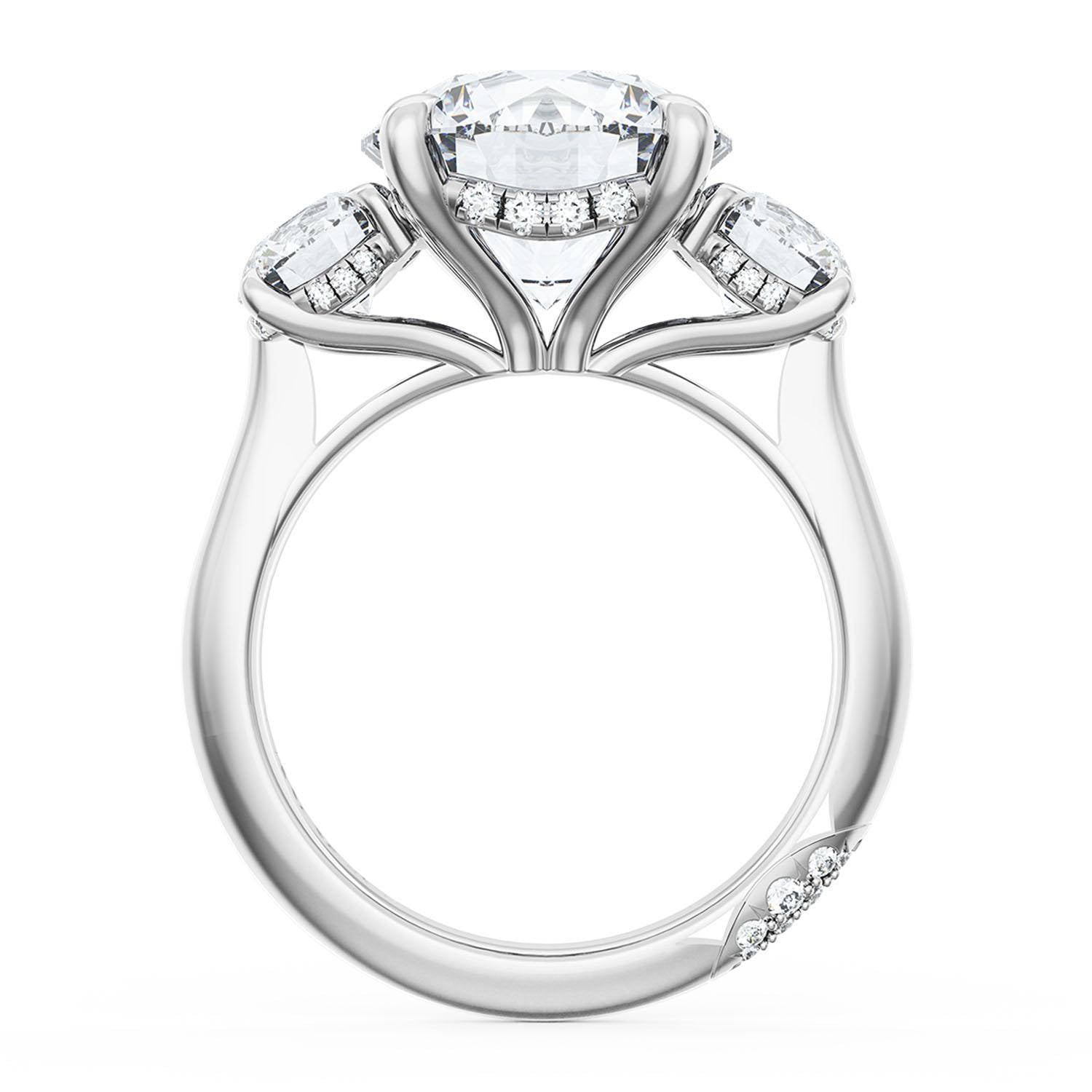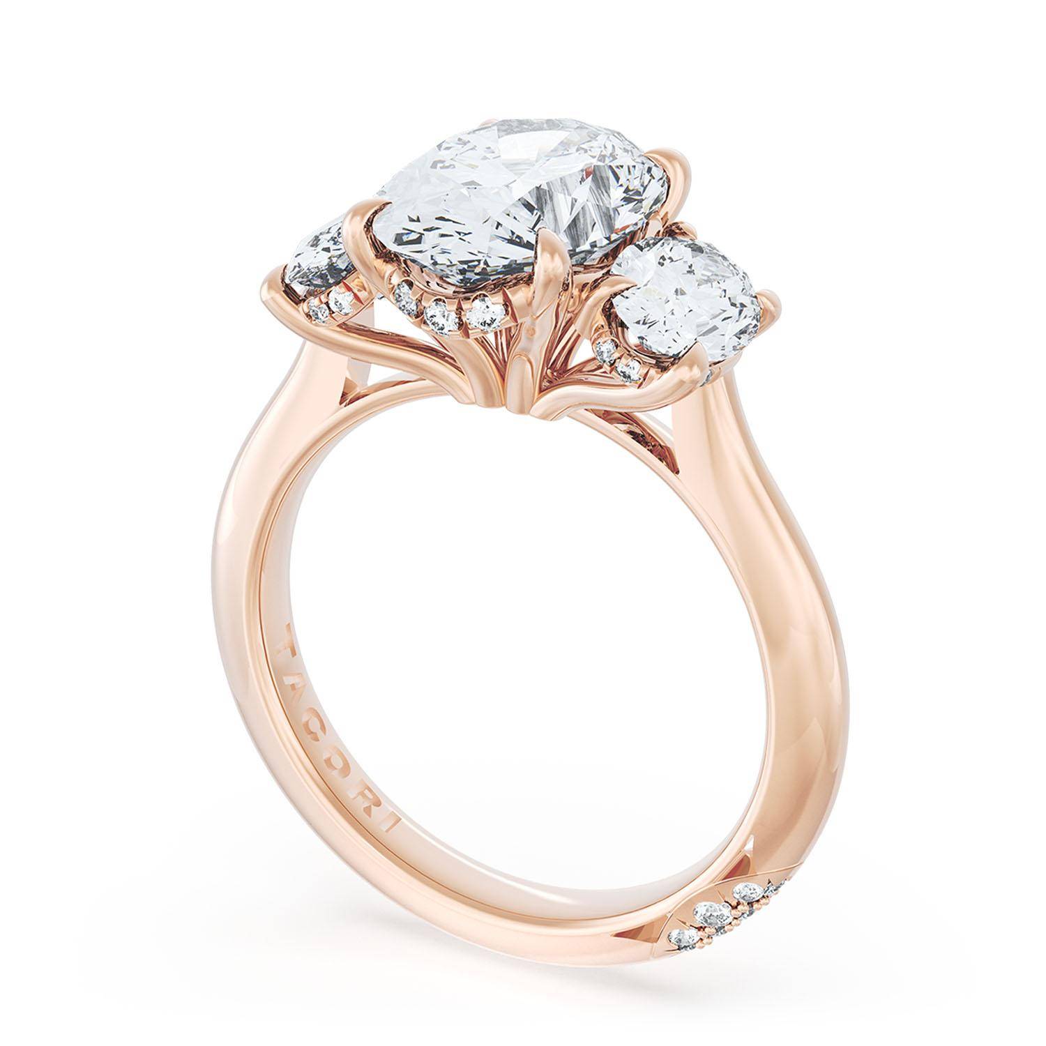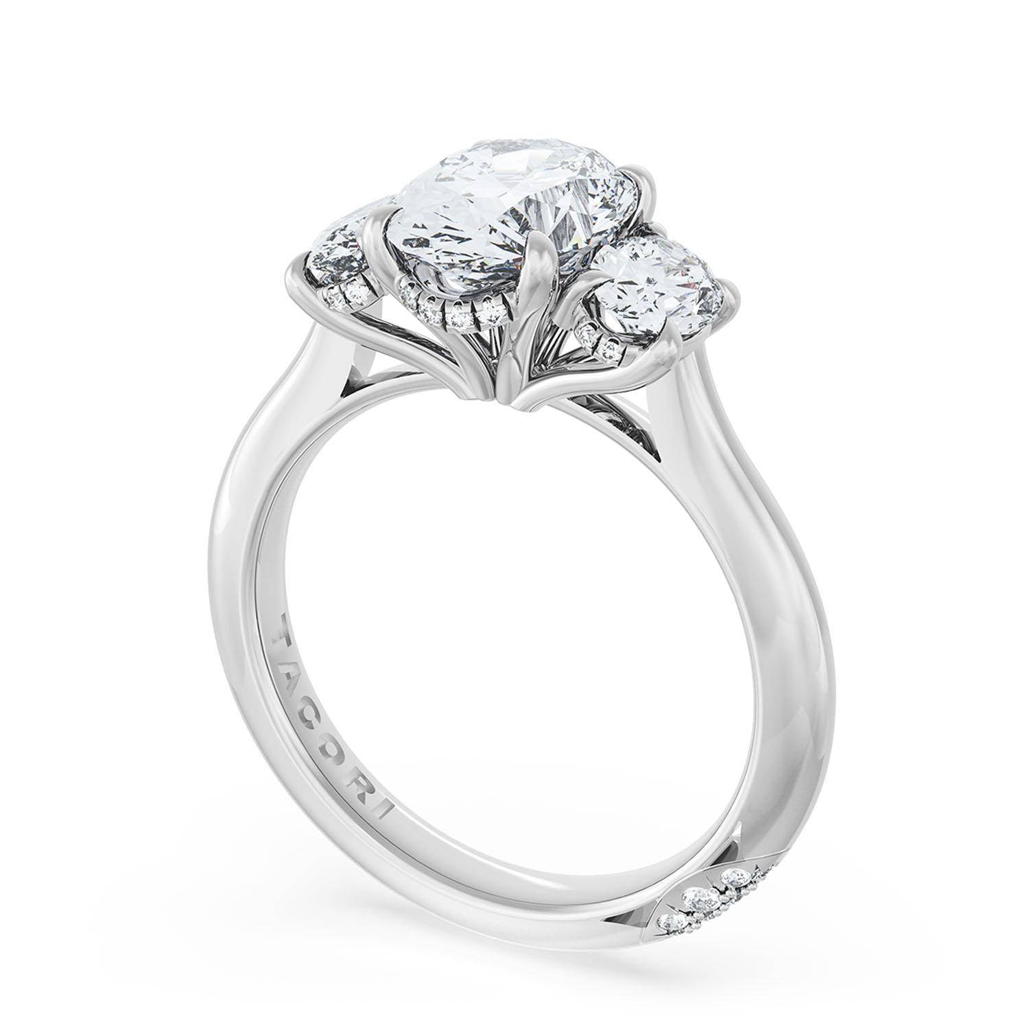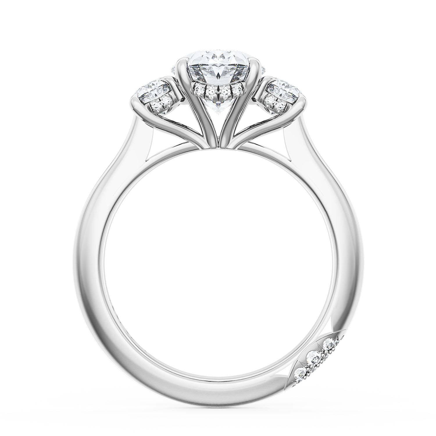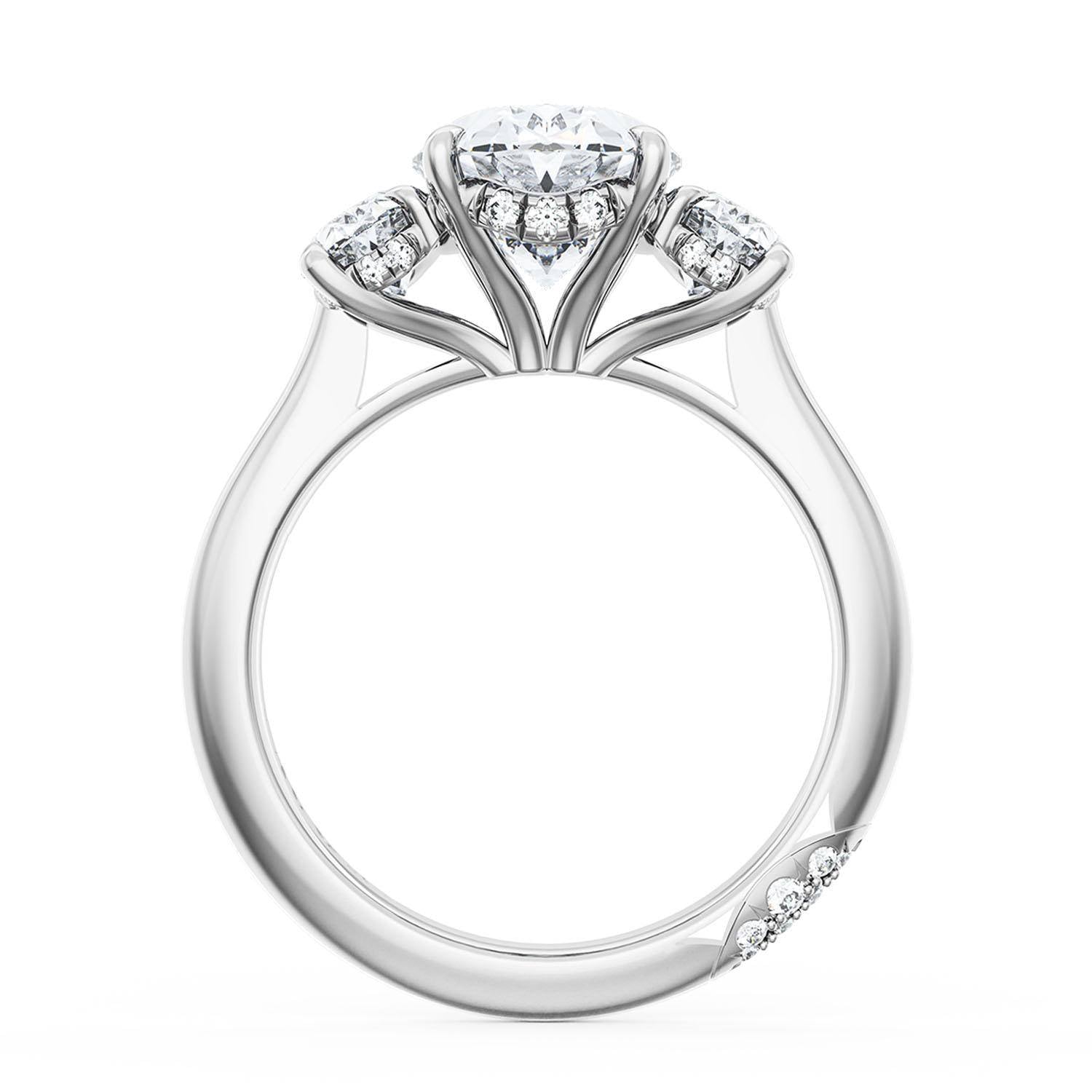 This 3-stone ring features an oval center and matching oval side stones, each accented with a hidden bloom. The Founder's Crescent Fabric wraps around the ceiling of the ring and continues for 3/4 diamond coverage.