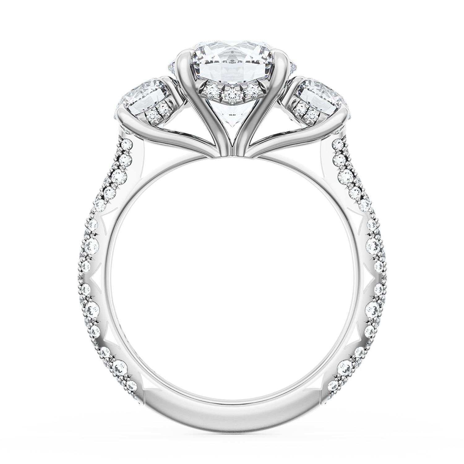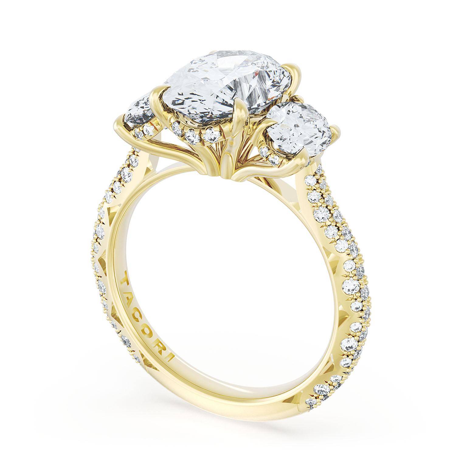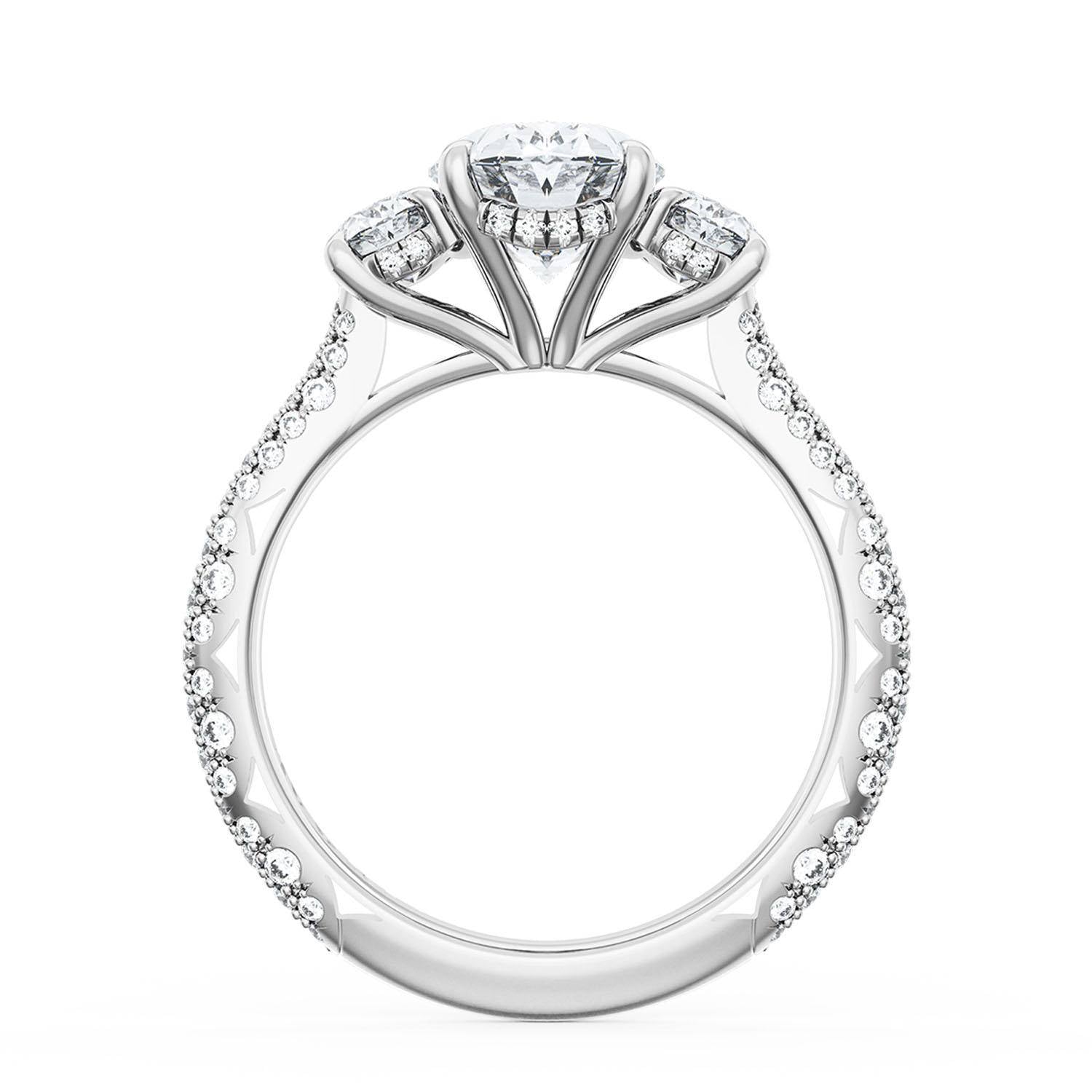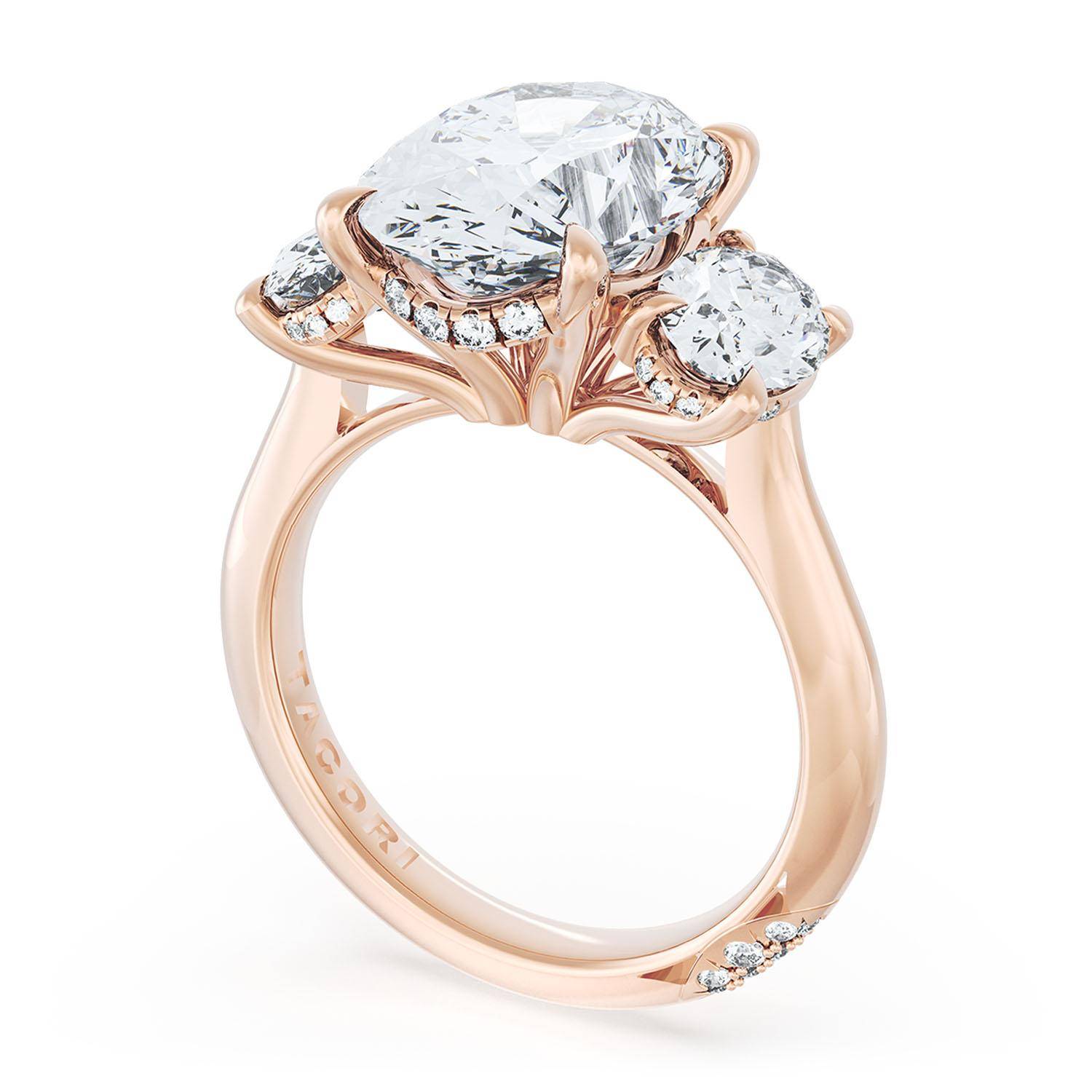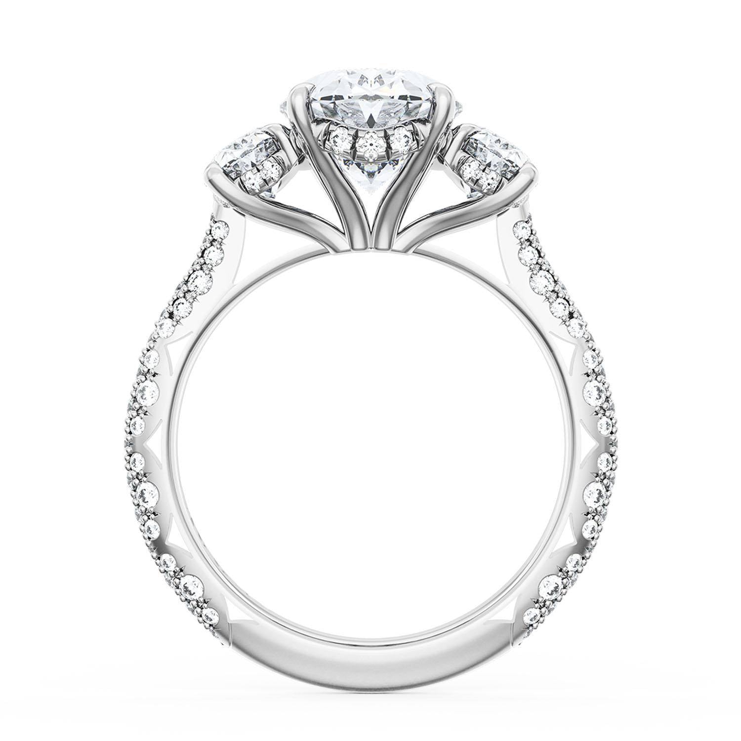 This 3-stone ring features an oval center and matching oval side stones, each accented with a hidden bloom. The Founder's Crescent Fabric wraps around the ceiling of the ring and continues for 3/4 diamond coverage.