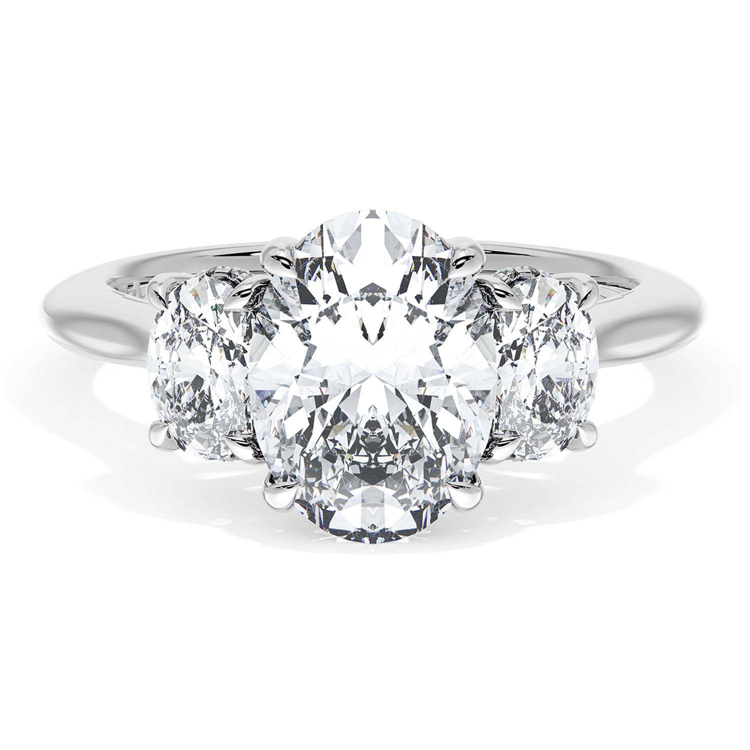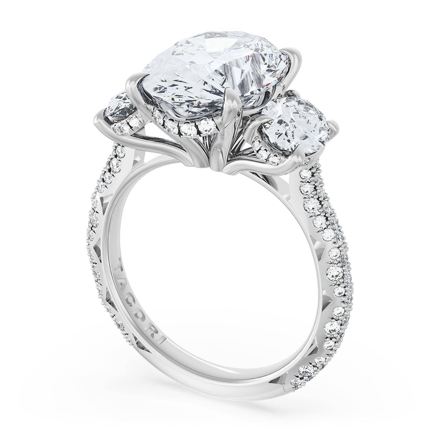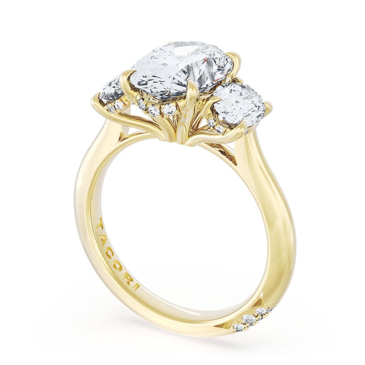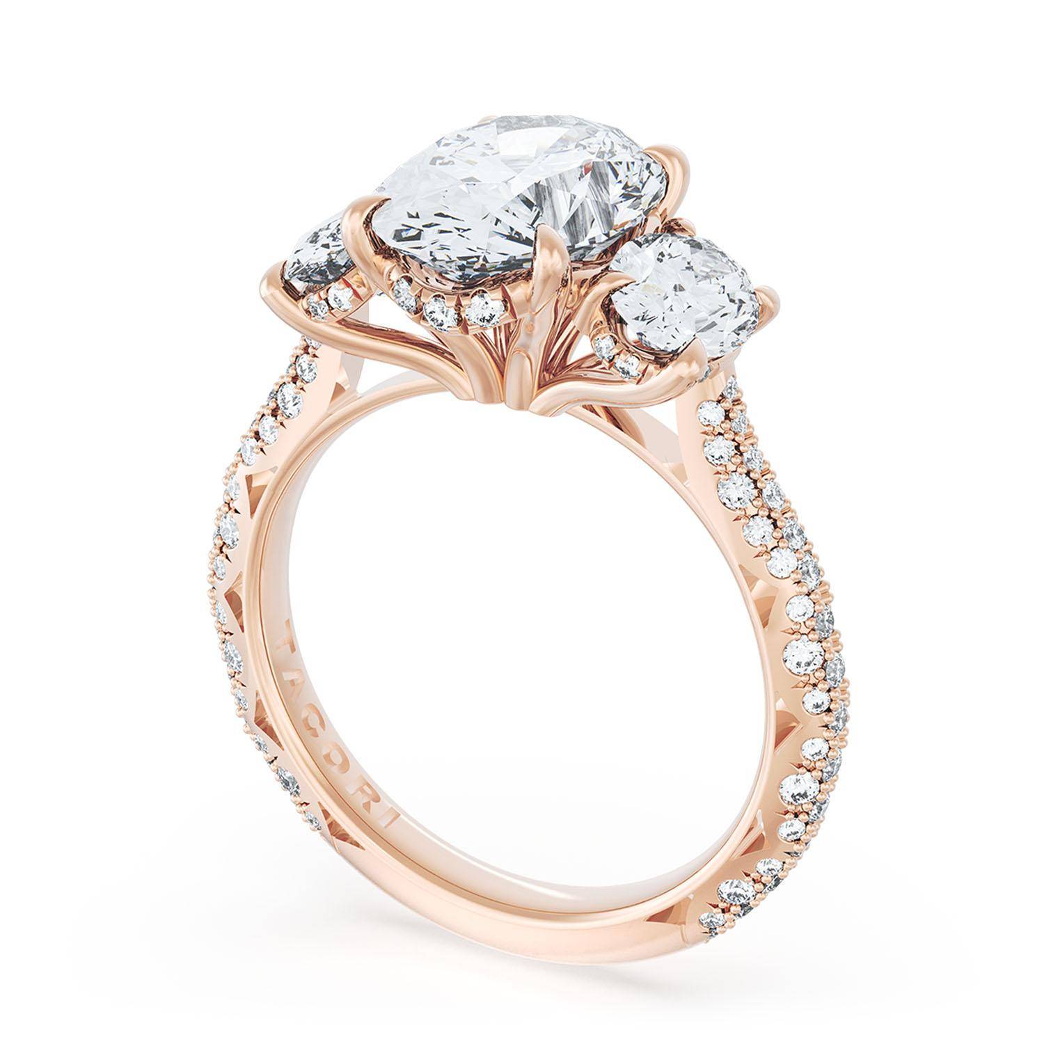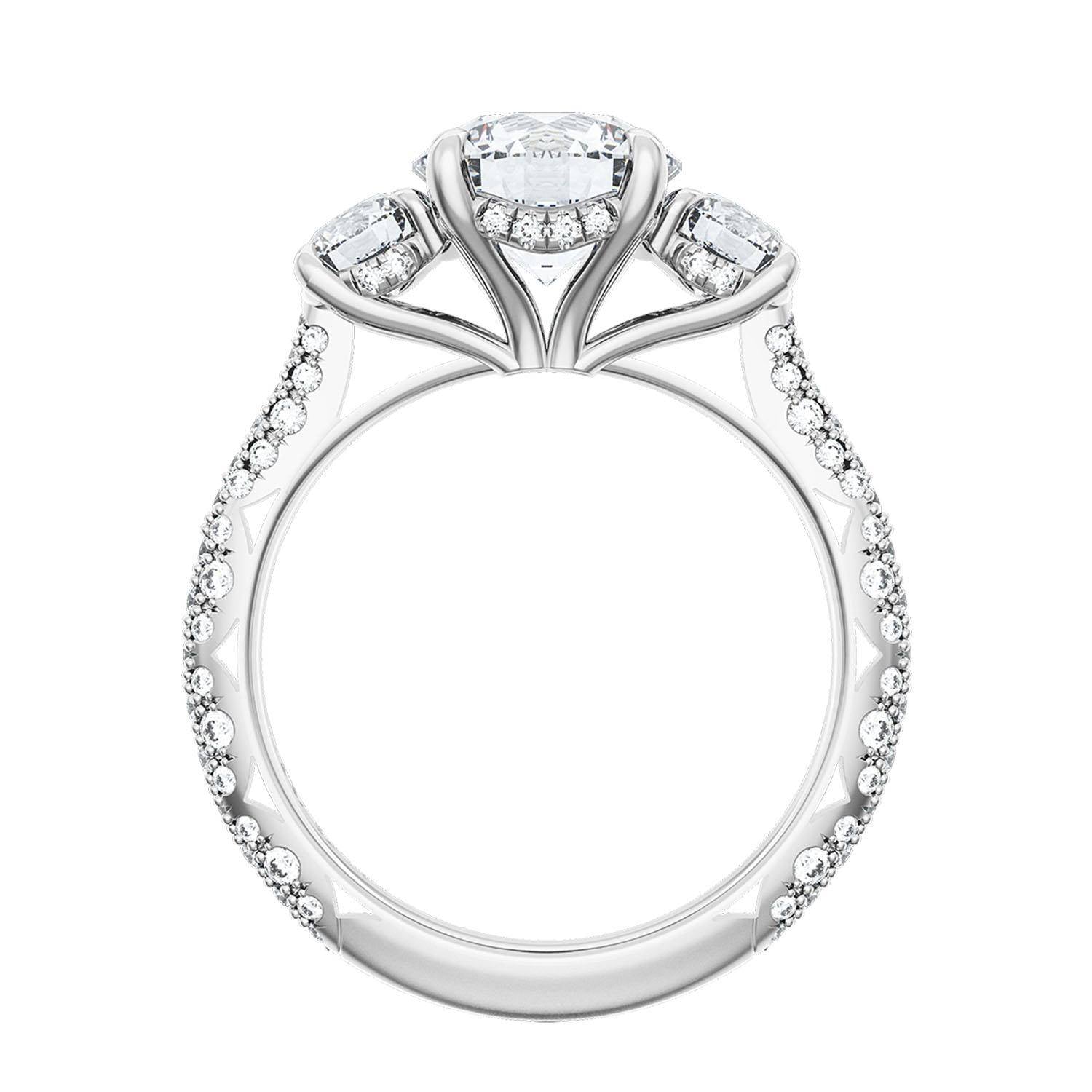 This 3-stone ring features an oval center and matching oval side stones, each accented with a hidden bloom. The Founder's Crescent Fabric wraps around the ceiling of the ring and continues for 3/4 diamond coverage.