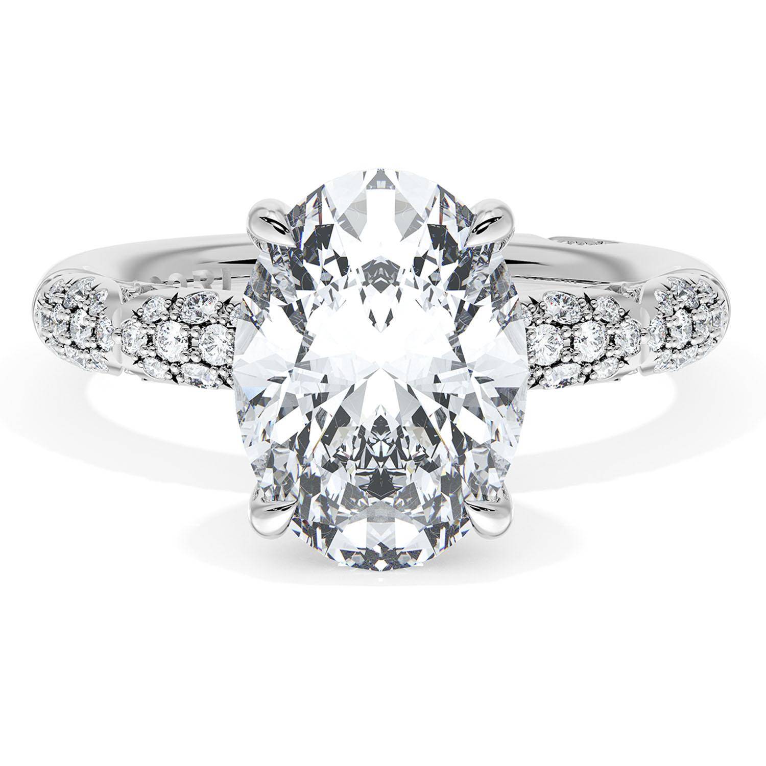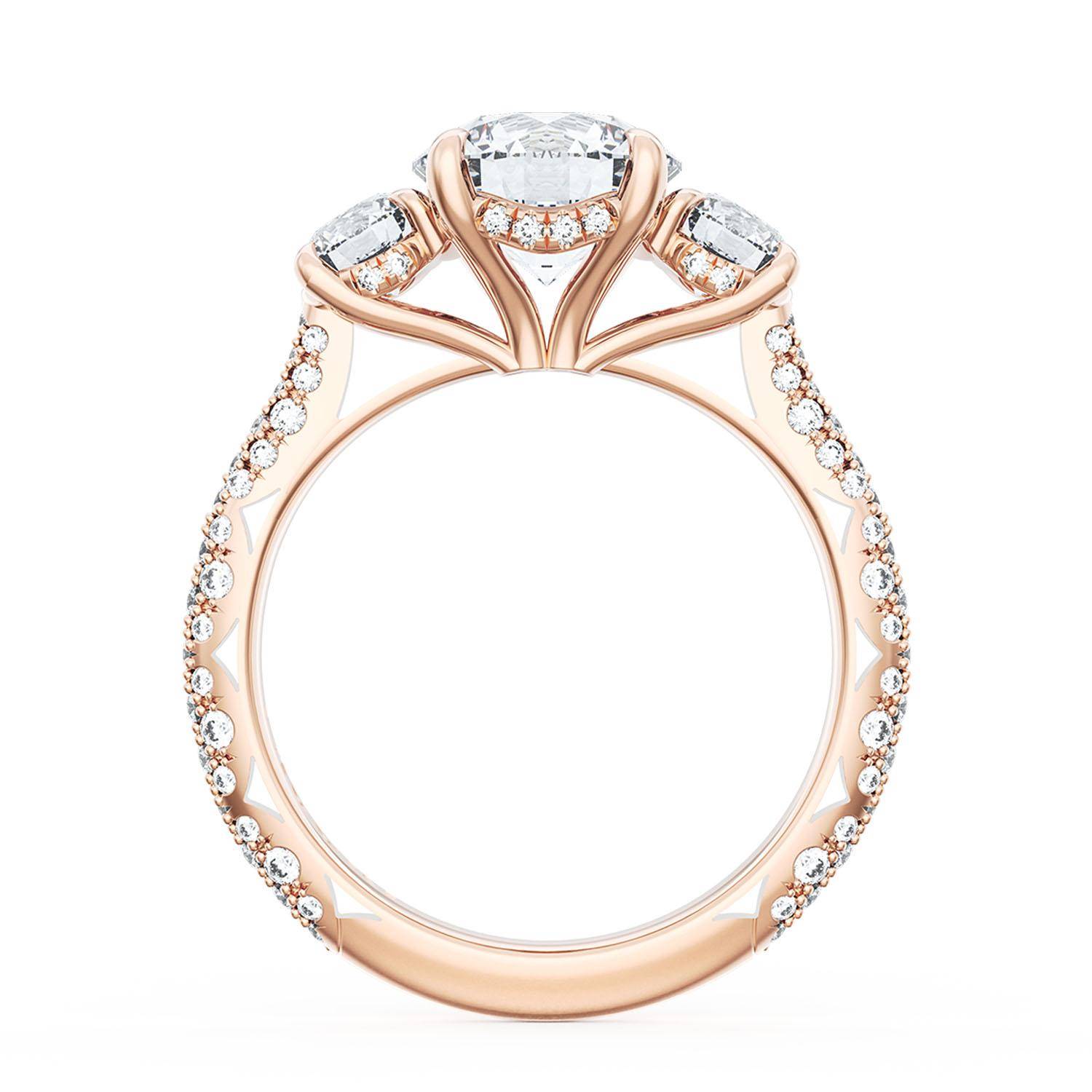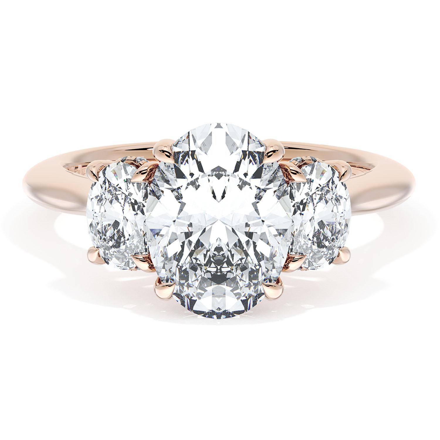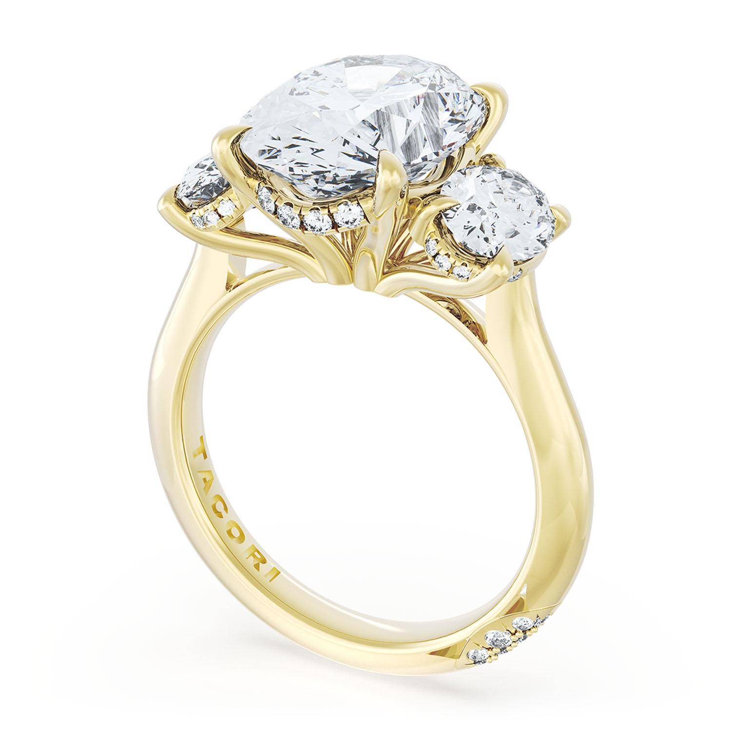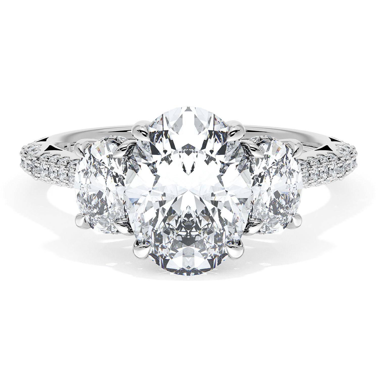 This 3-stone ring features an oval center and matching oval side stones, each accented with a hidden bloom. The Founder's Crescent Fabric wraps around the ceiling of the ring and continues for 3/4 diamond coverage.