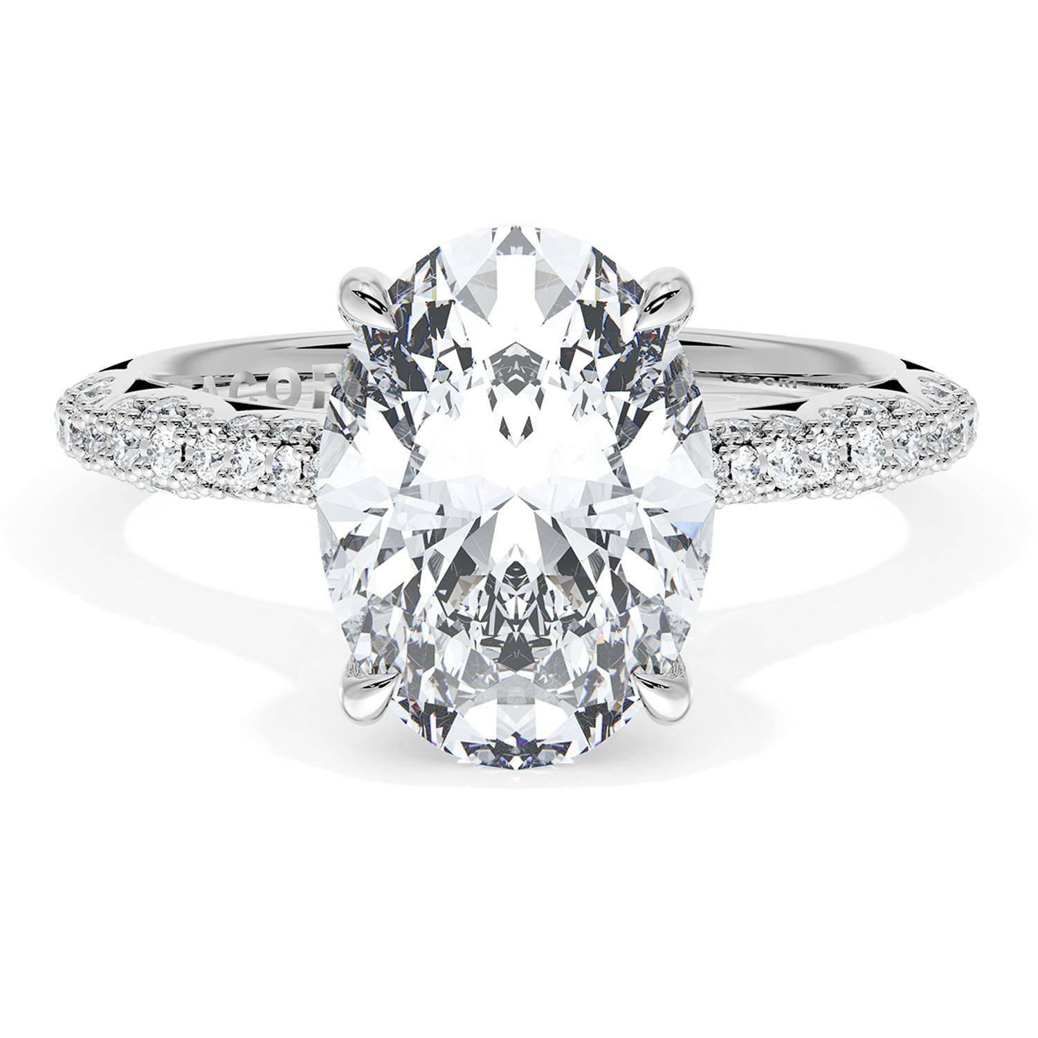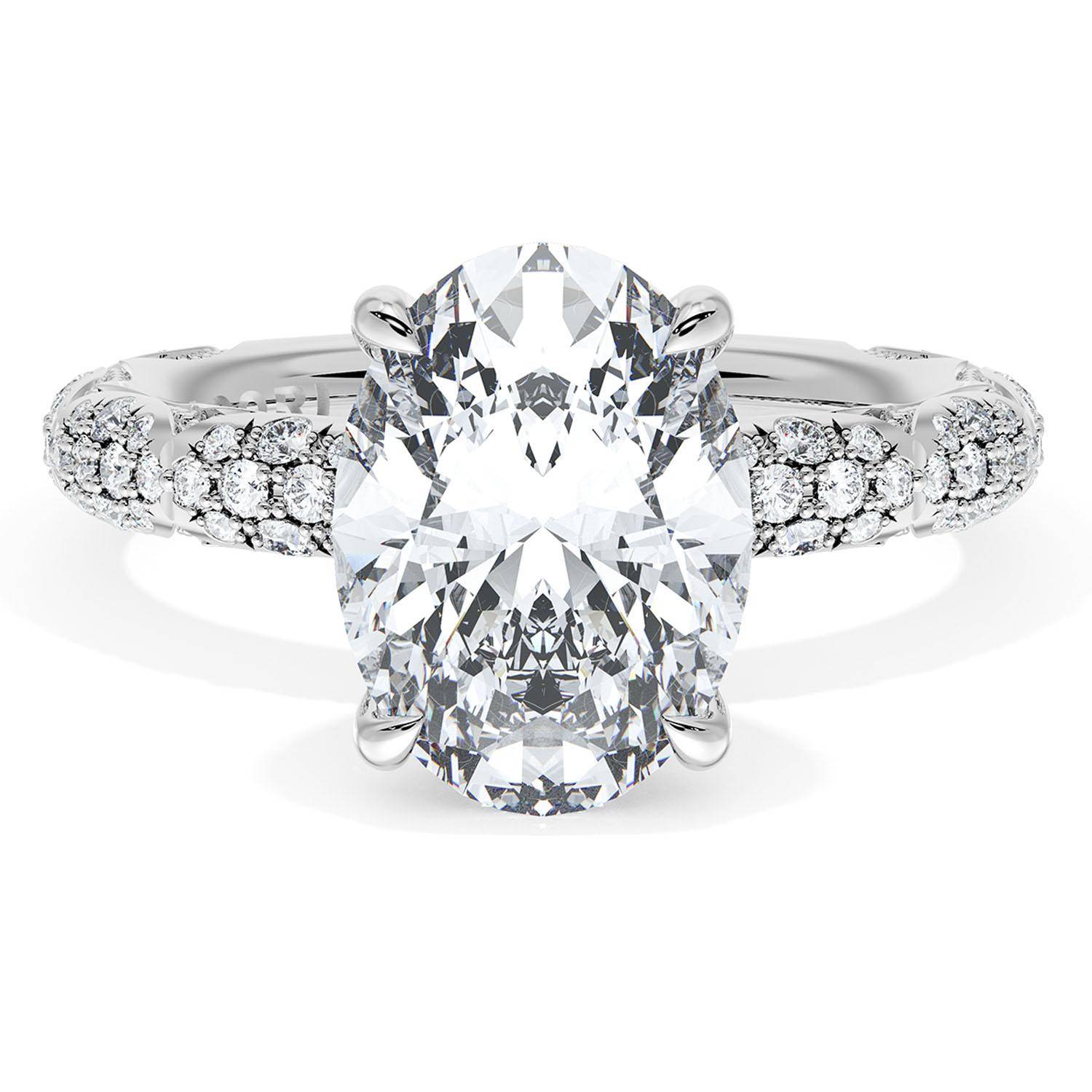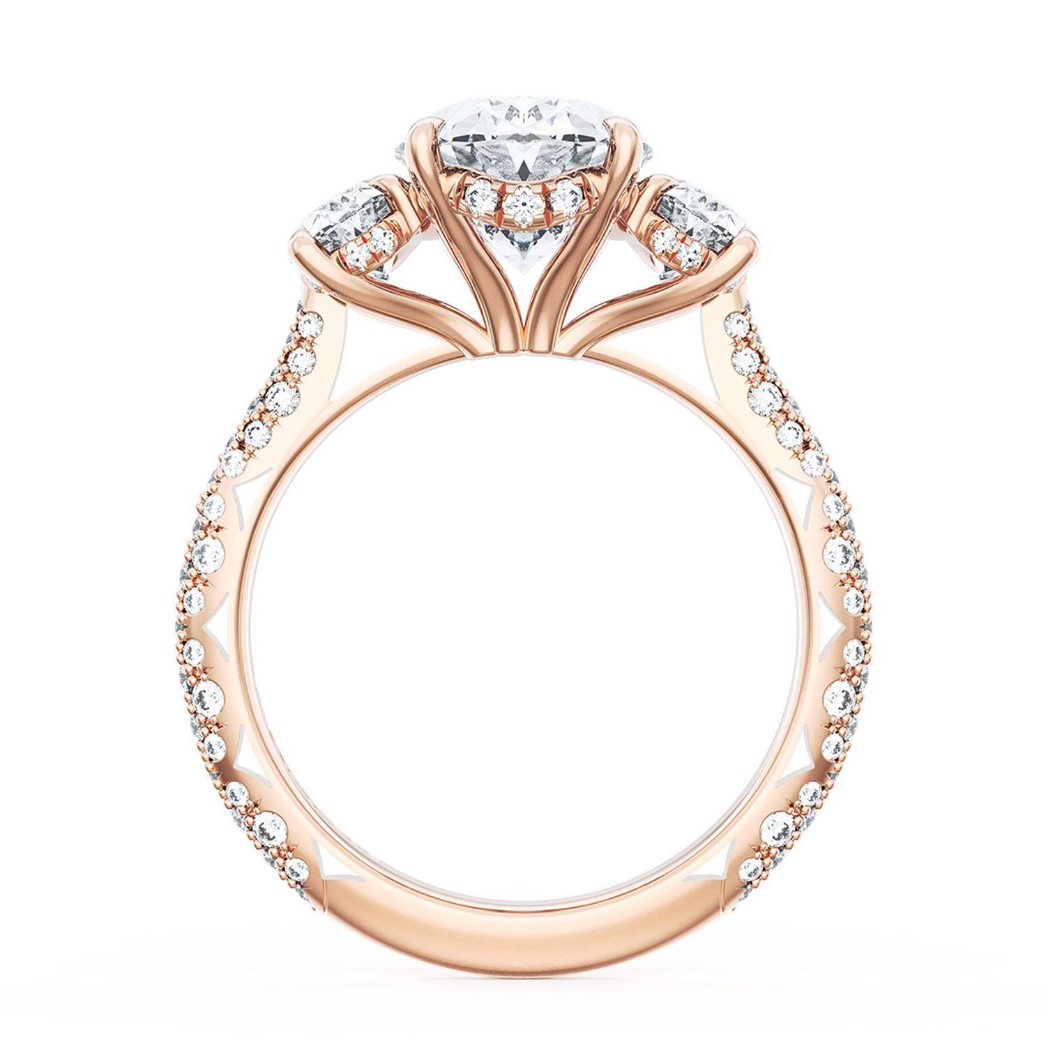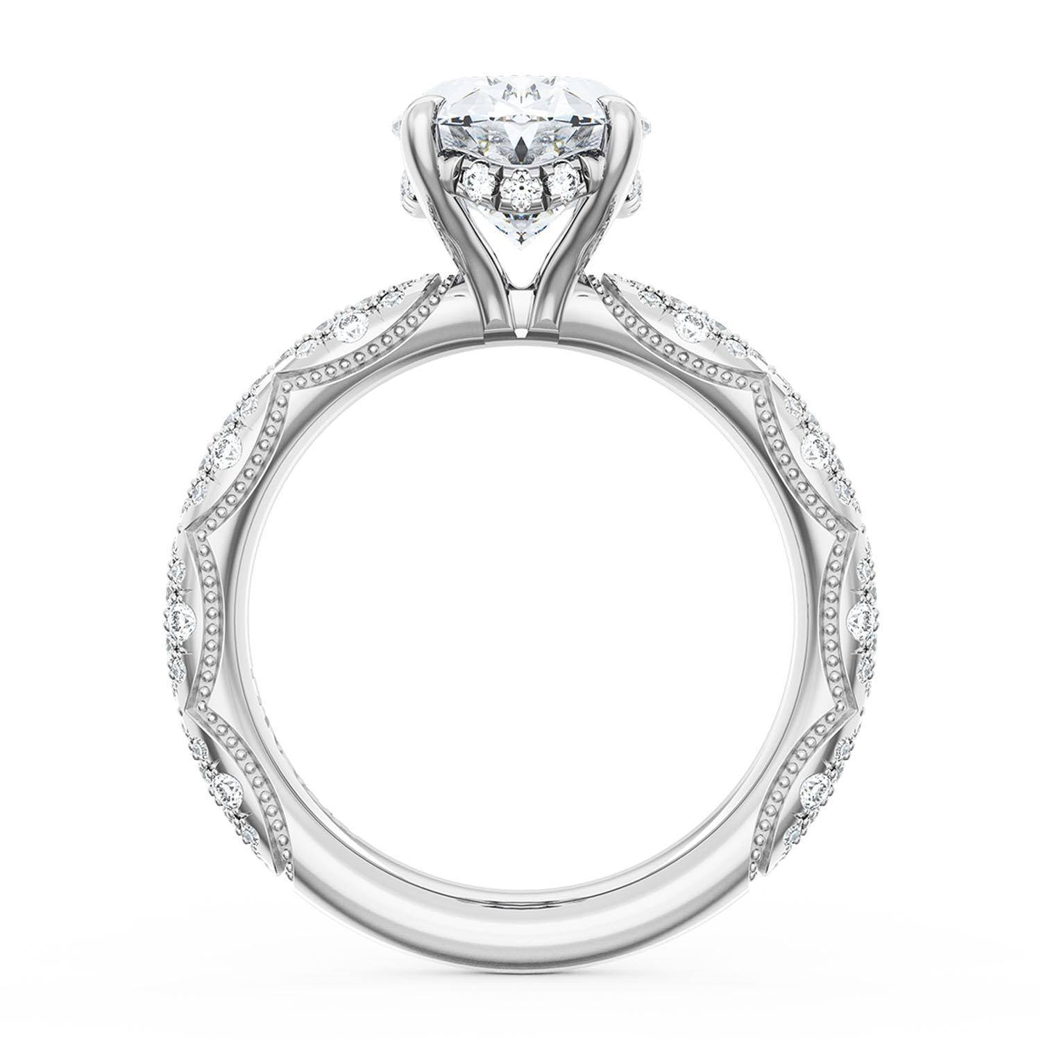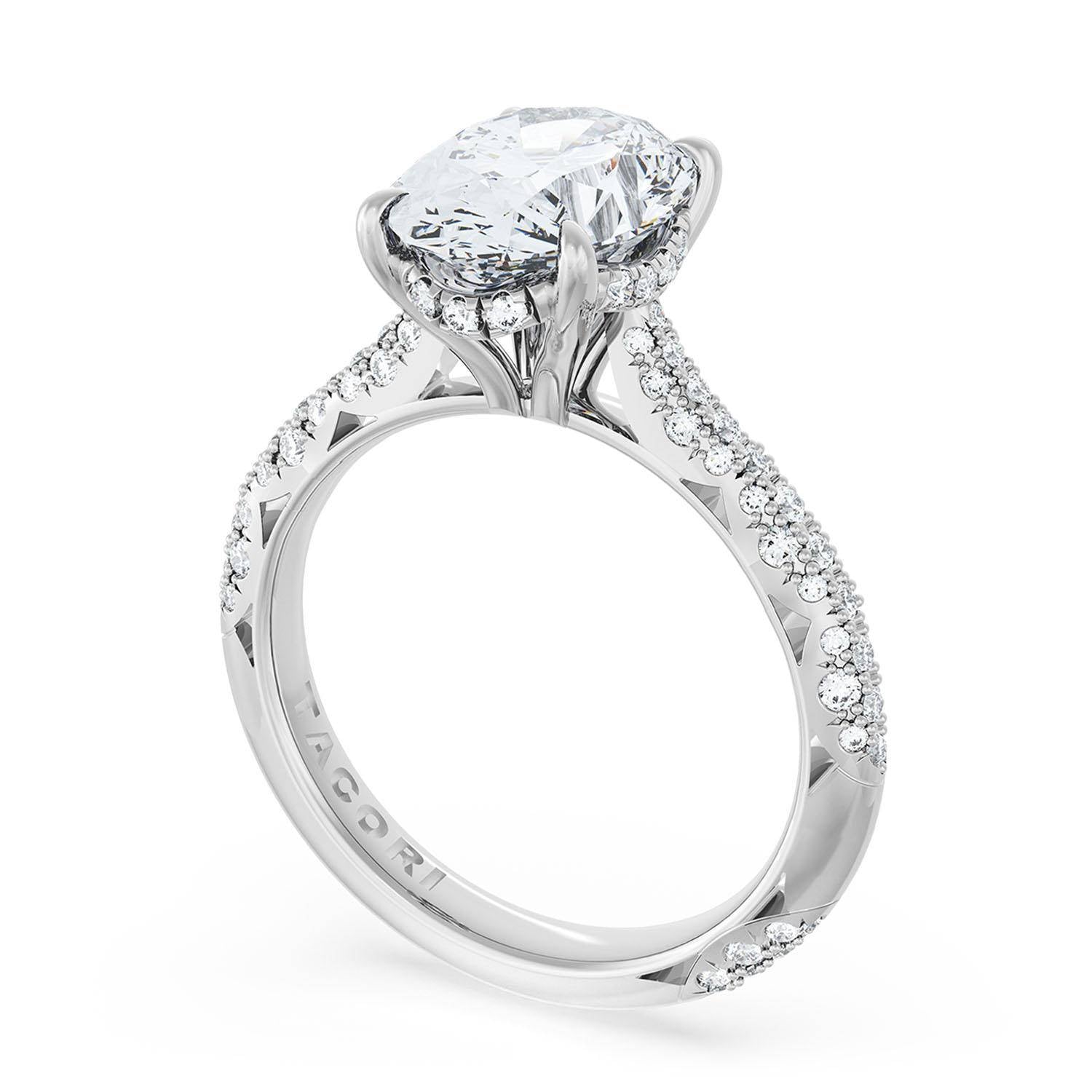 This 3-stone ring features an oval center and matching oval side stones, each accented with a hidden bloom. The Founder's Crescent Fabric wraps around the ceiling of the ring and continues for 3/4 diamond coverage.
