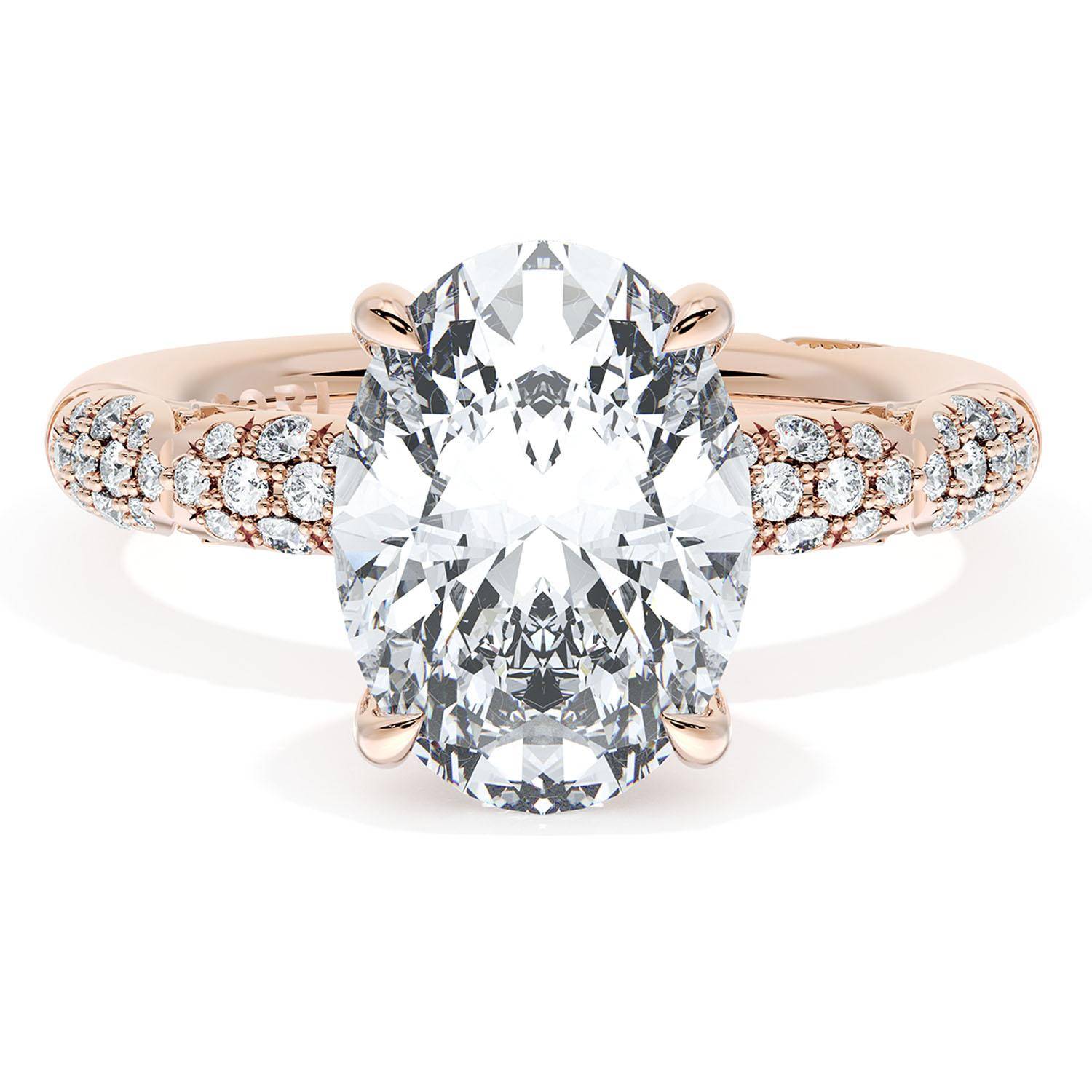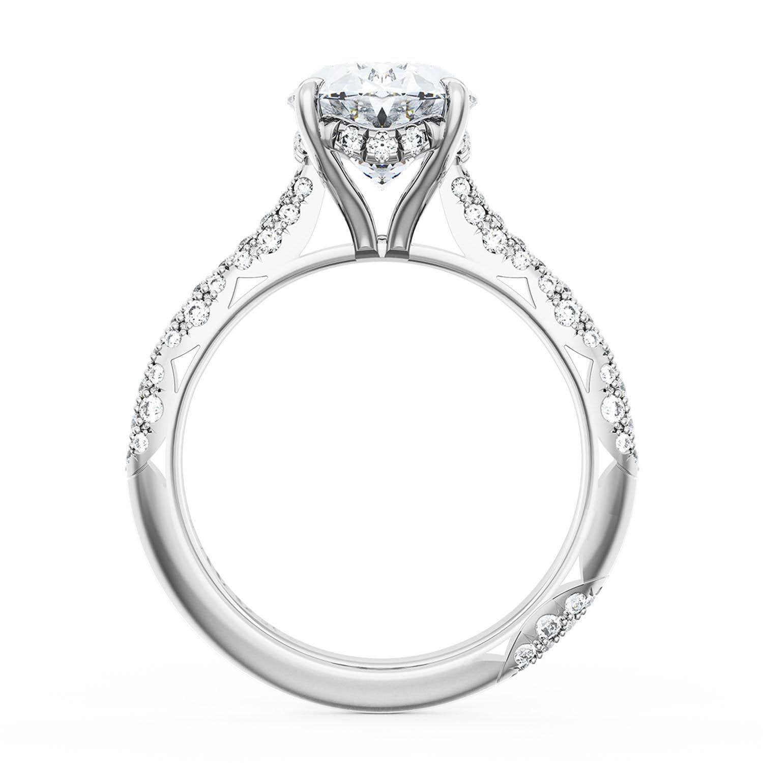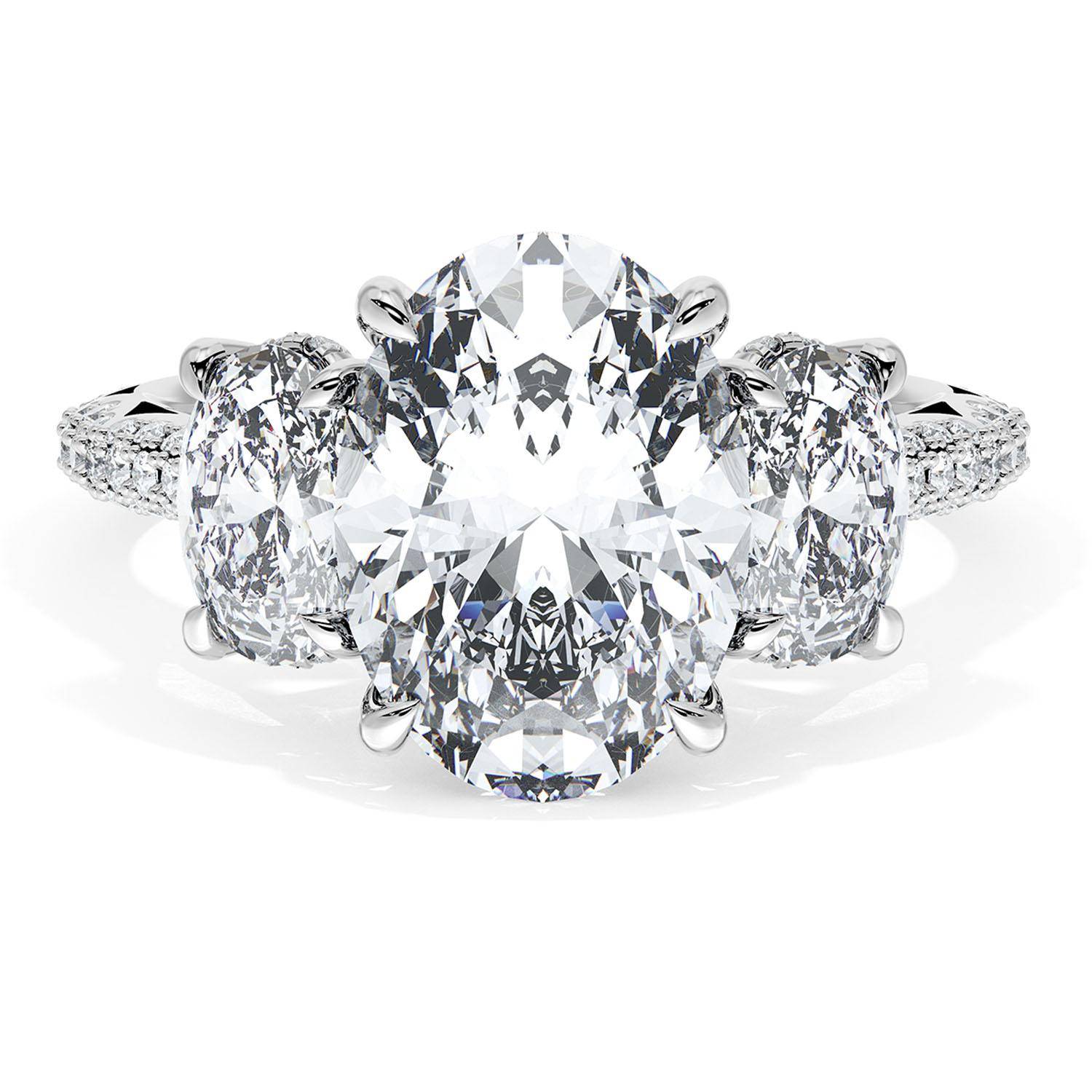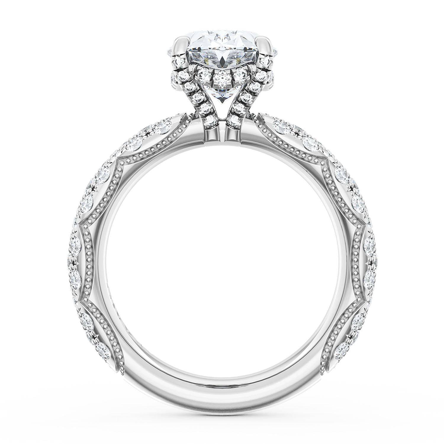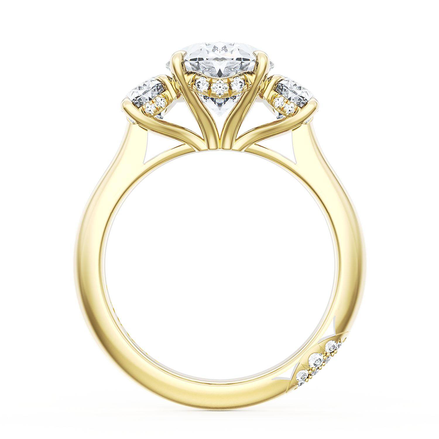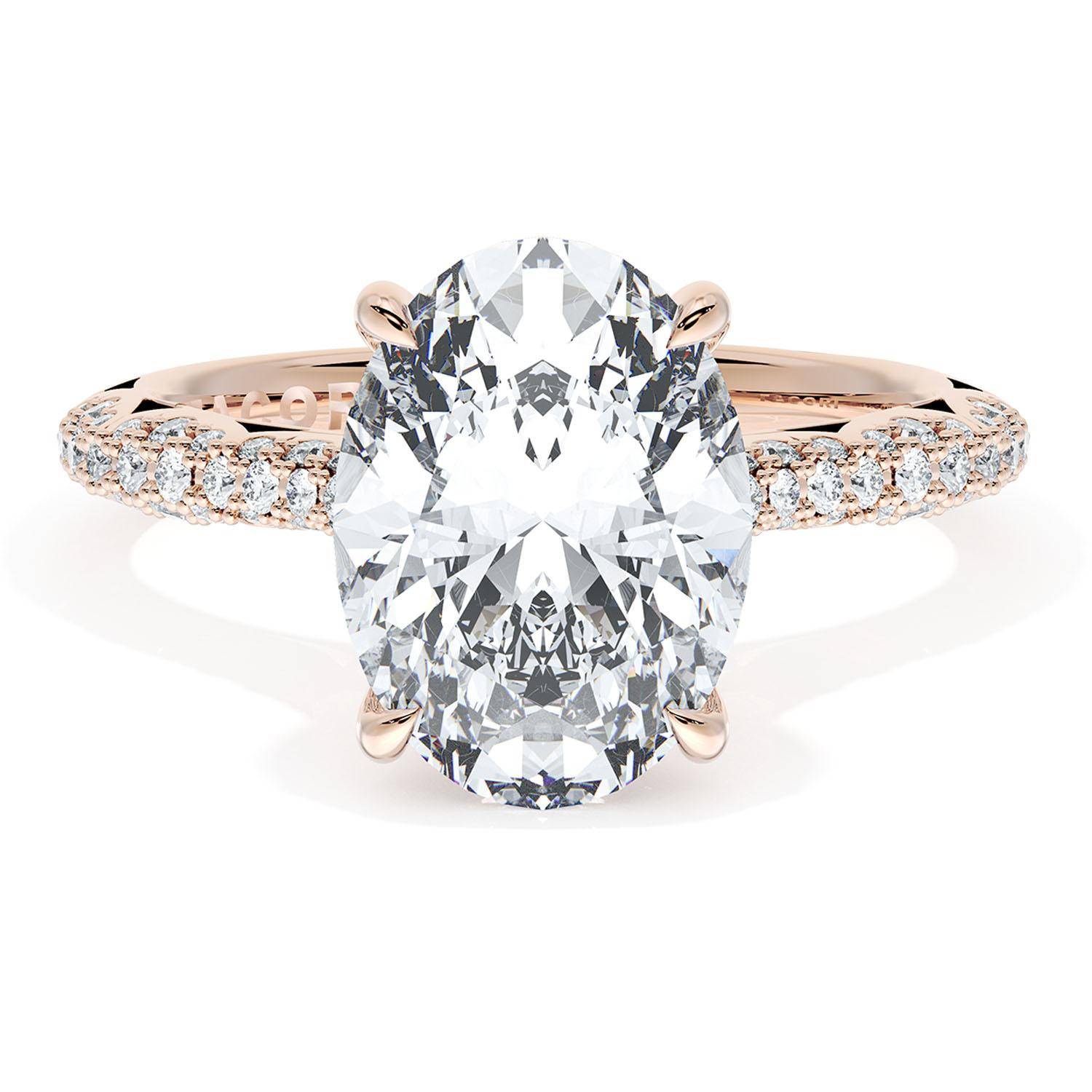 This 3-stone ring features an oval center and matching oval side stones, each accented with a hidden bloom. The Founder's Crescent Fabric wraps around the ceiling of the ring and continues for 3/4 diamond coverage.