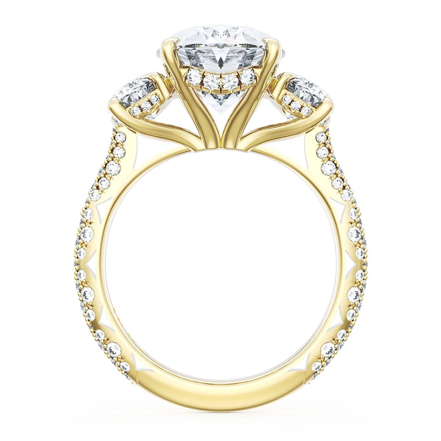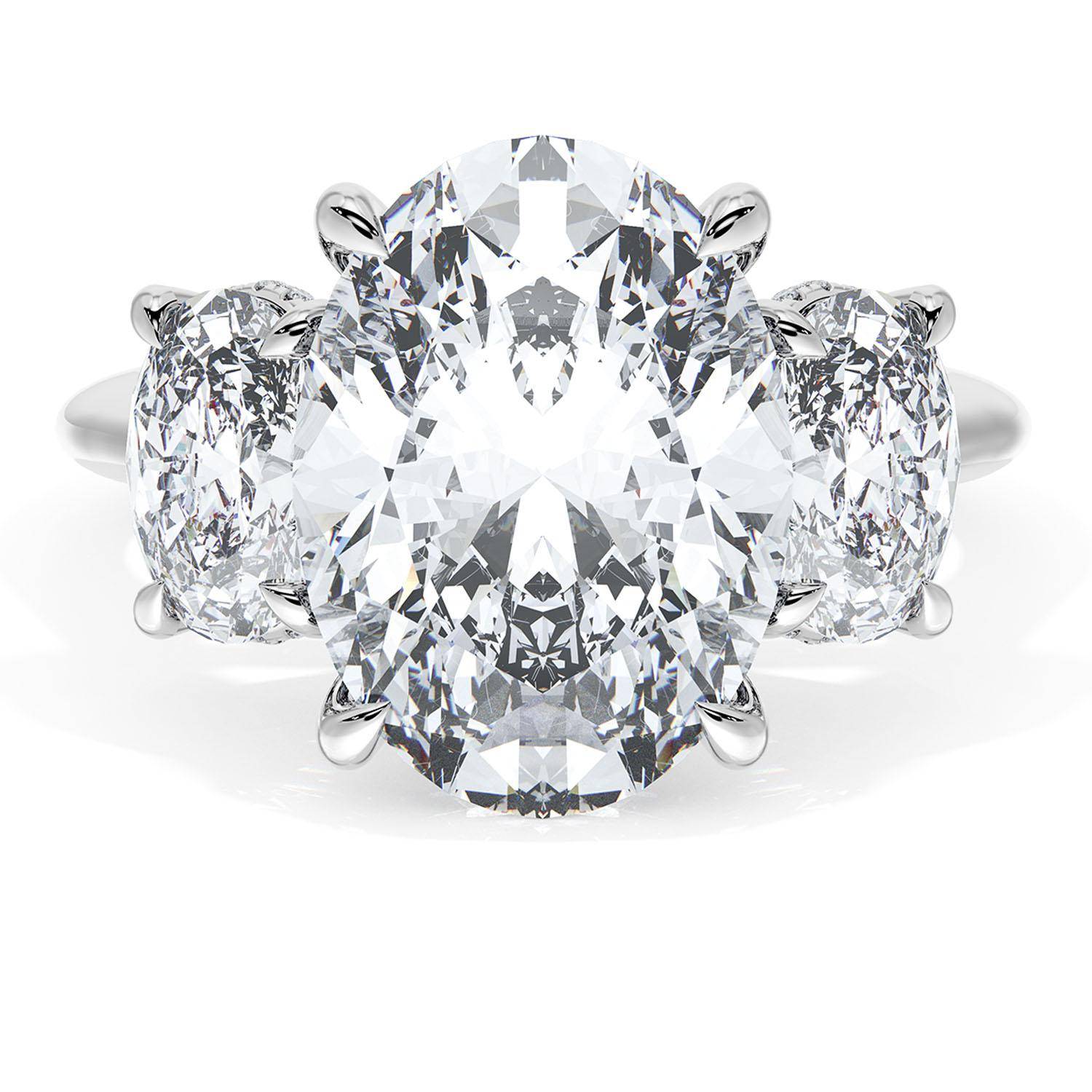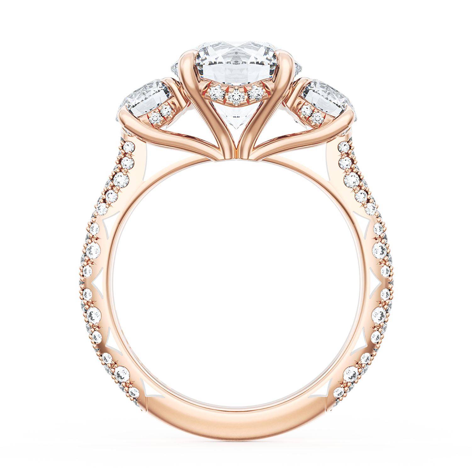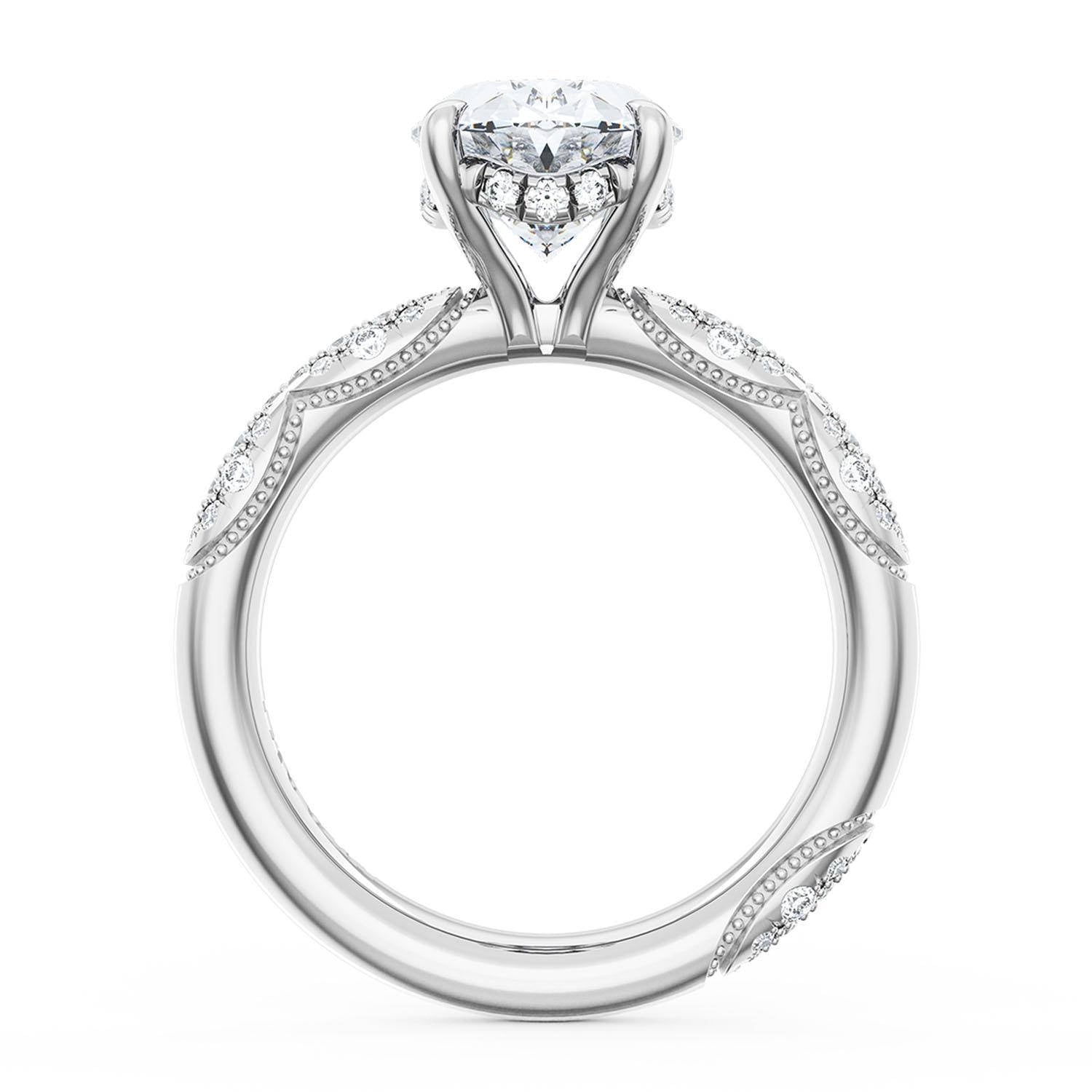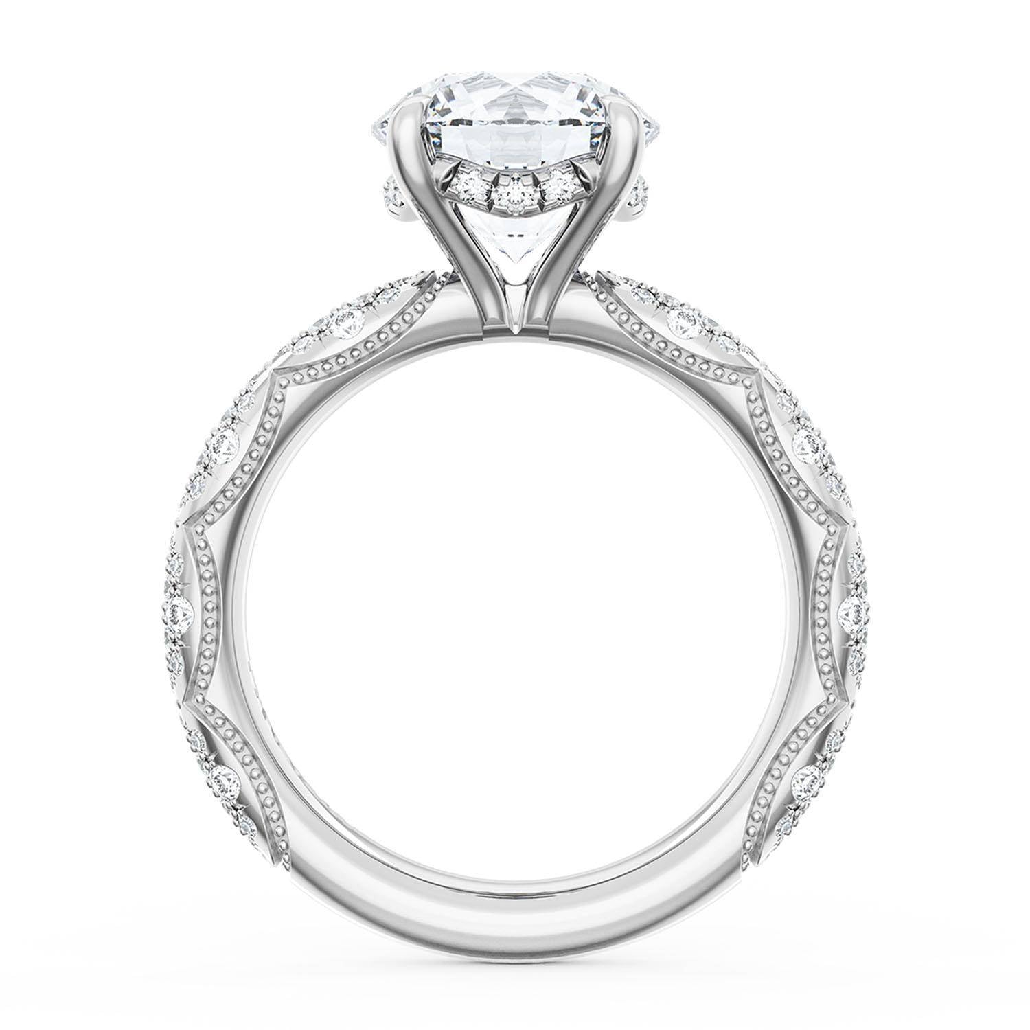 This 3-stone ring features an oval center and matching oval side stones, each accented with a hidden bloom. The Founder's Crescent Fabric wraps around the ceiling of the ring and continues for 3/4 diamond coverage.