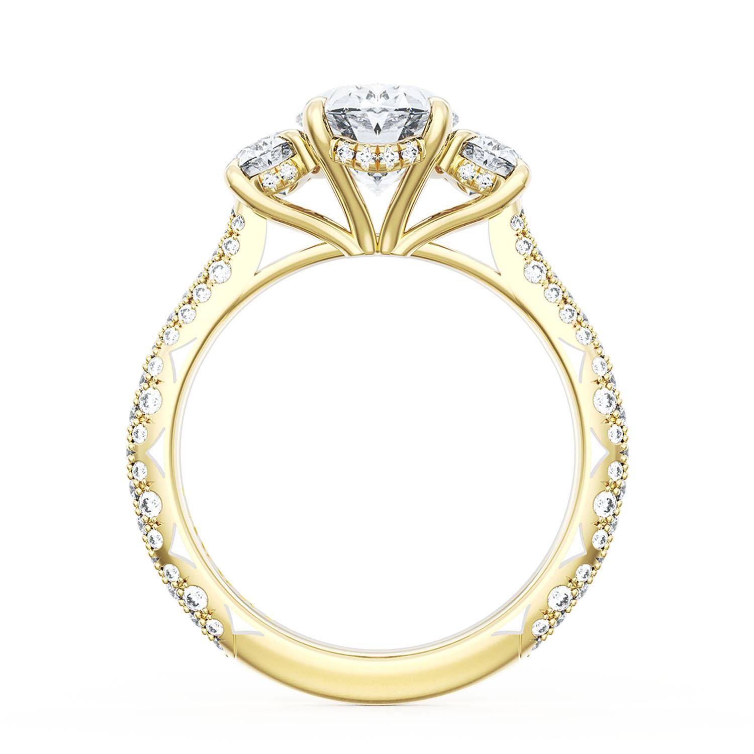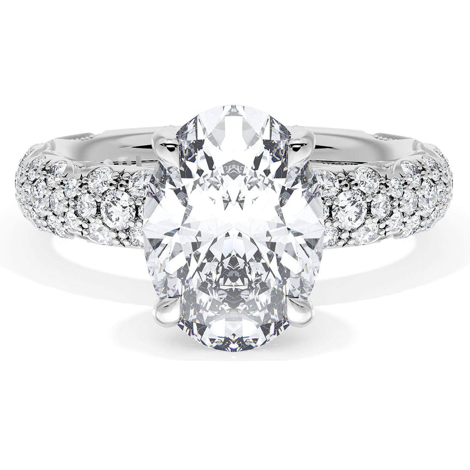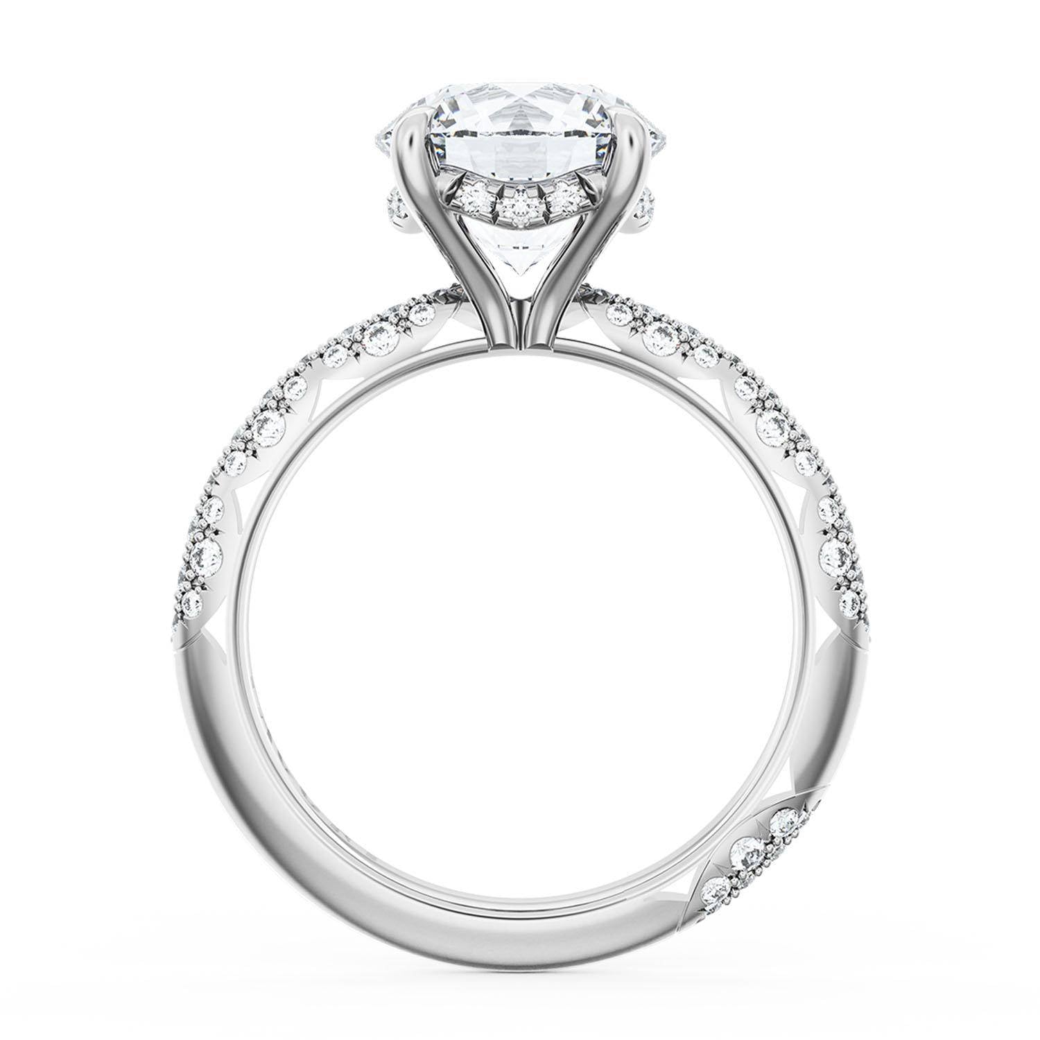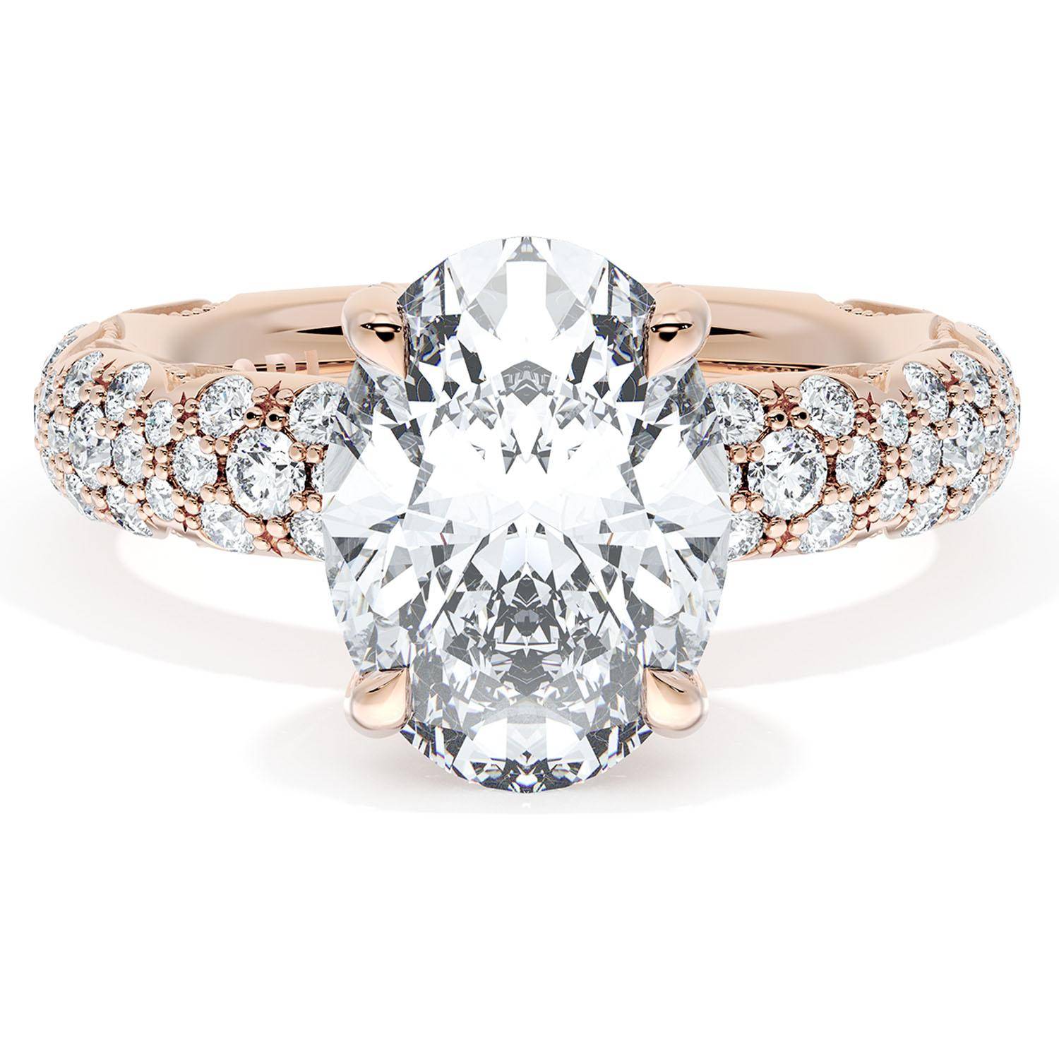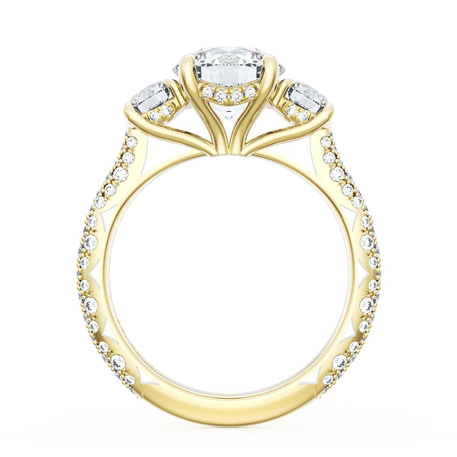 This 3-stone ring features an oval center and matching oval side stones, each accented with a hidden bloom. The Founder's Crescent Fabric wraps around the ceiling of the ring and continues for 3/4 diamond coverage.