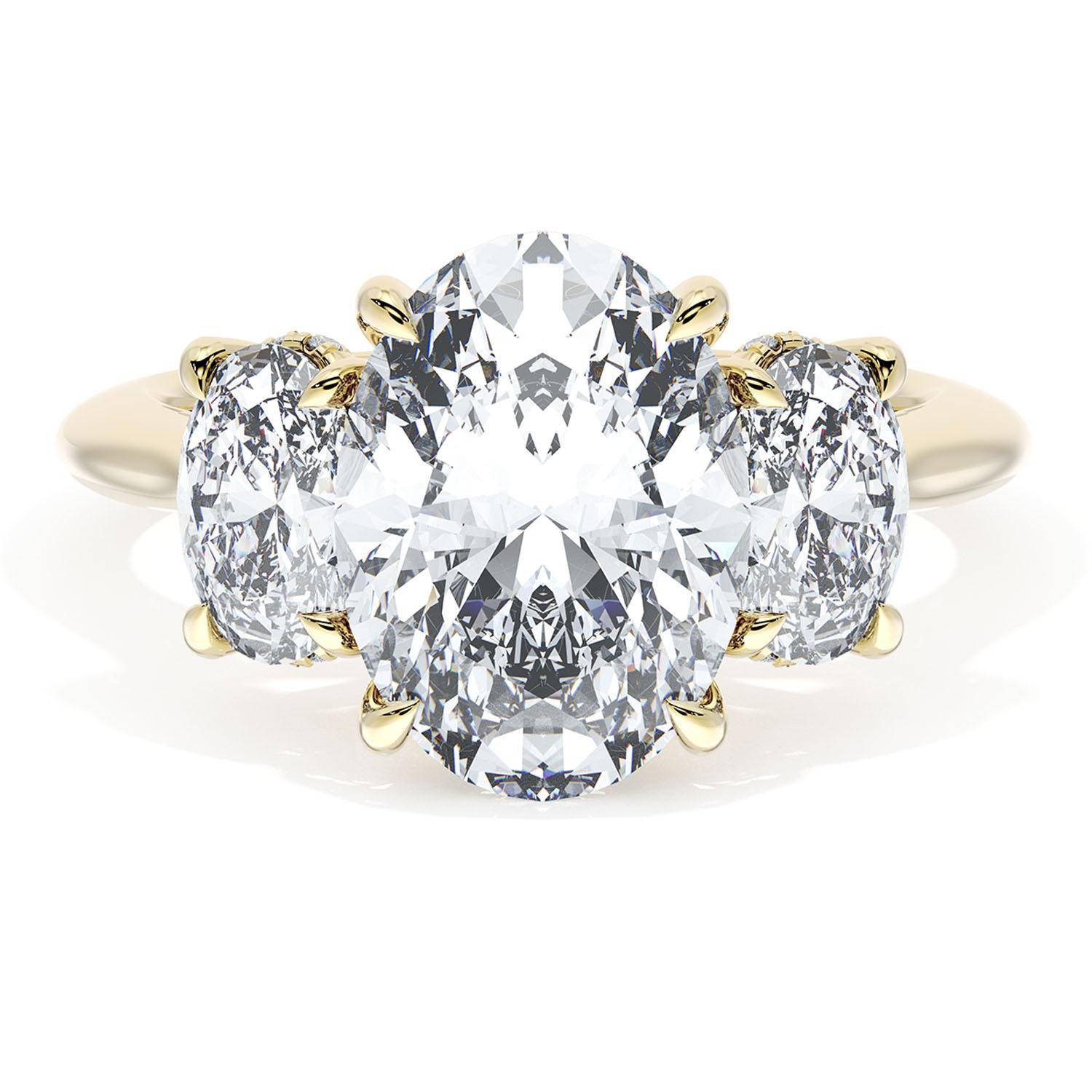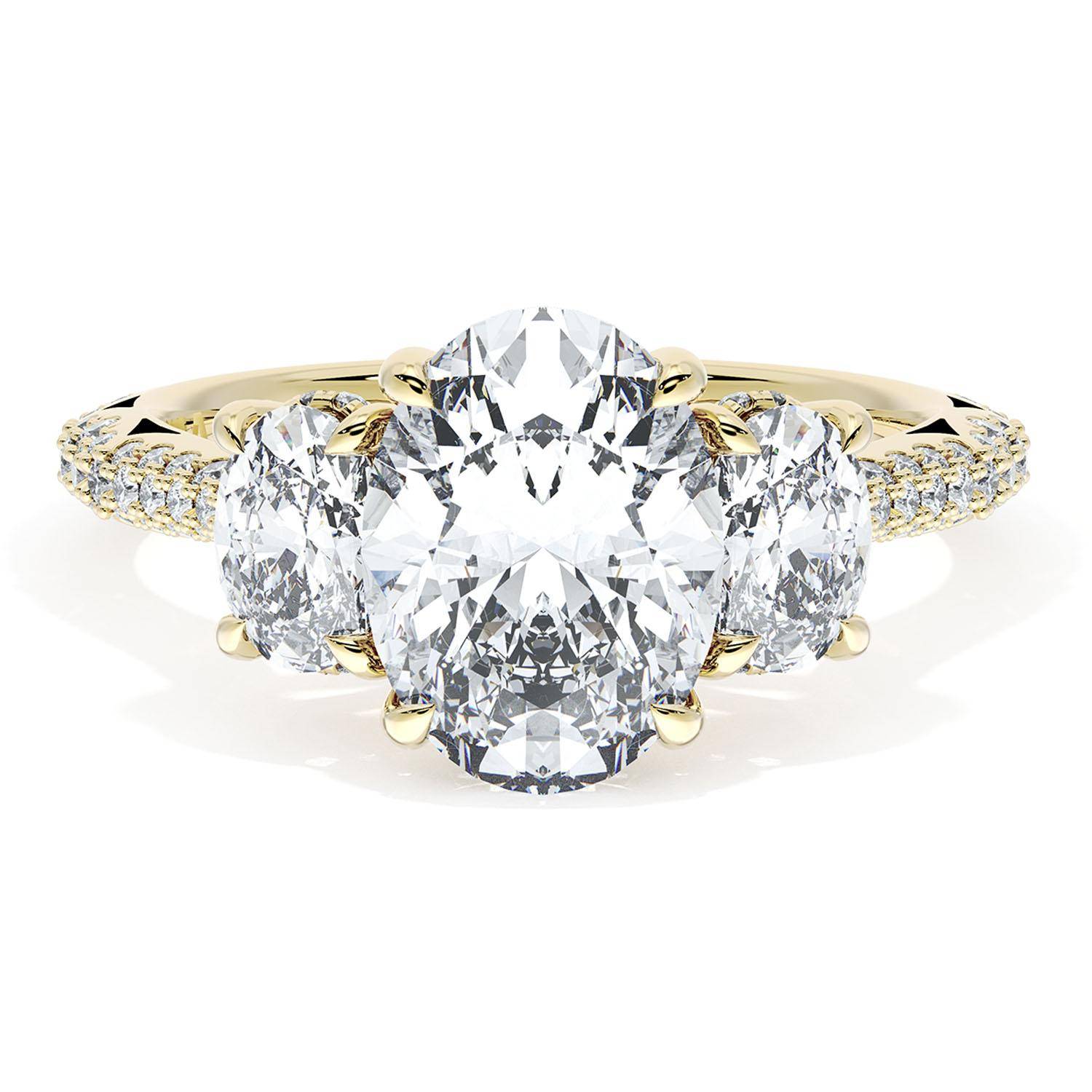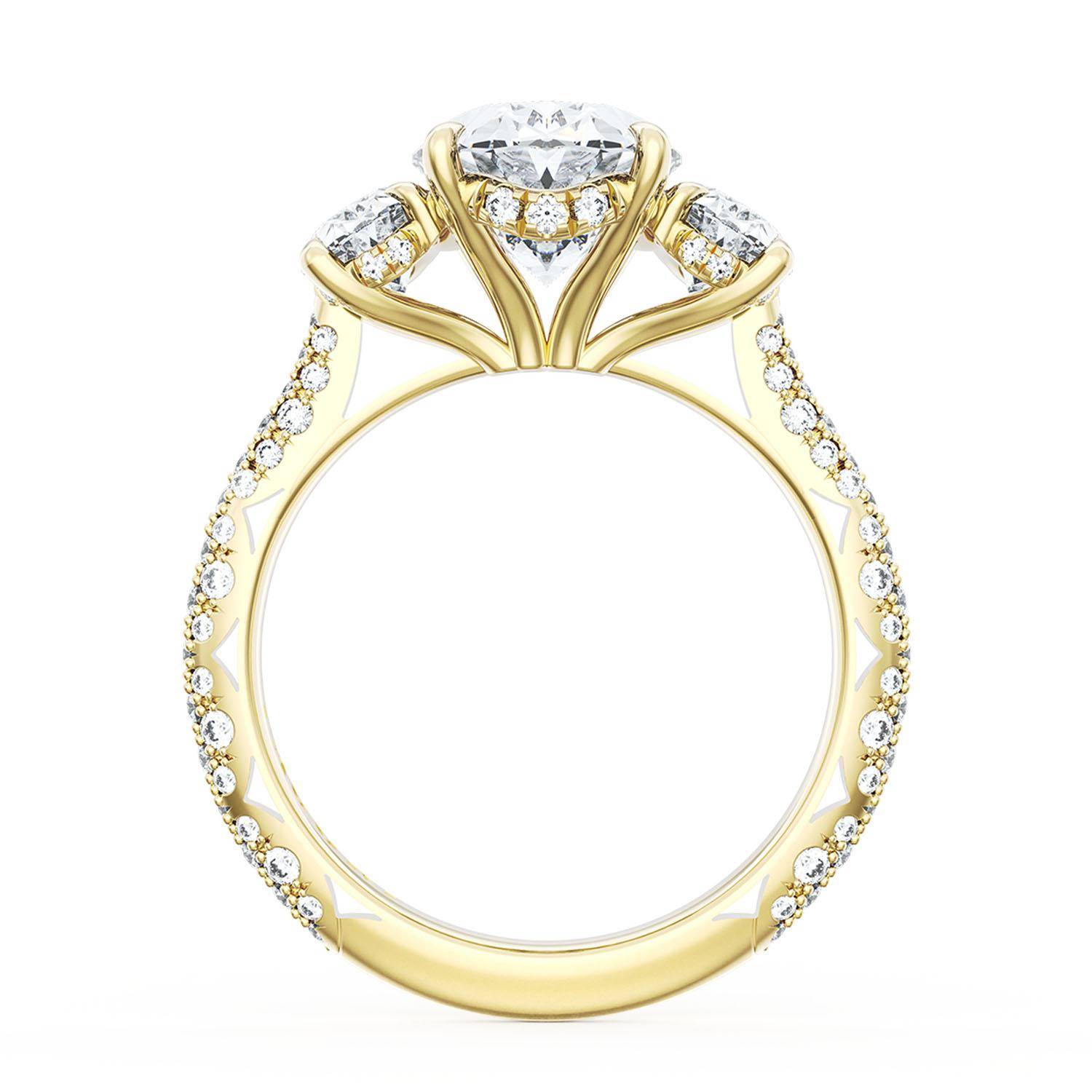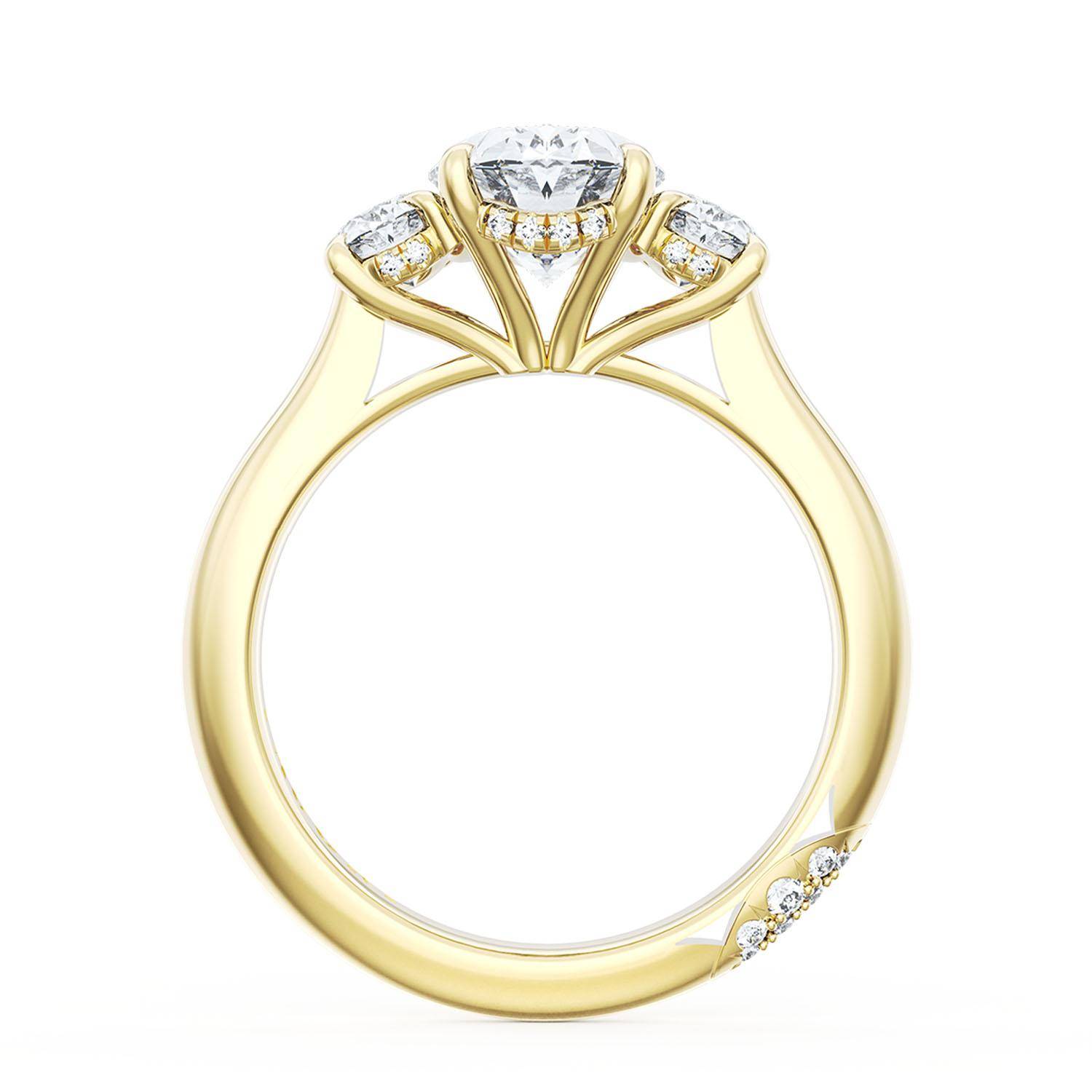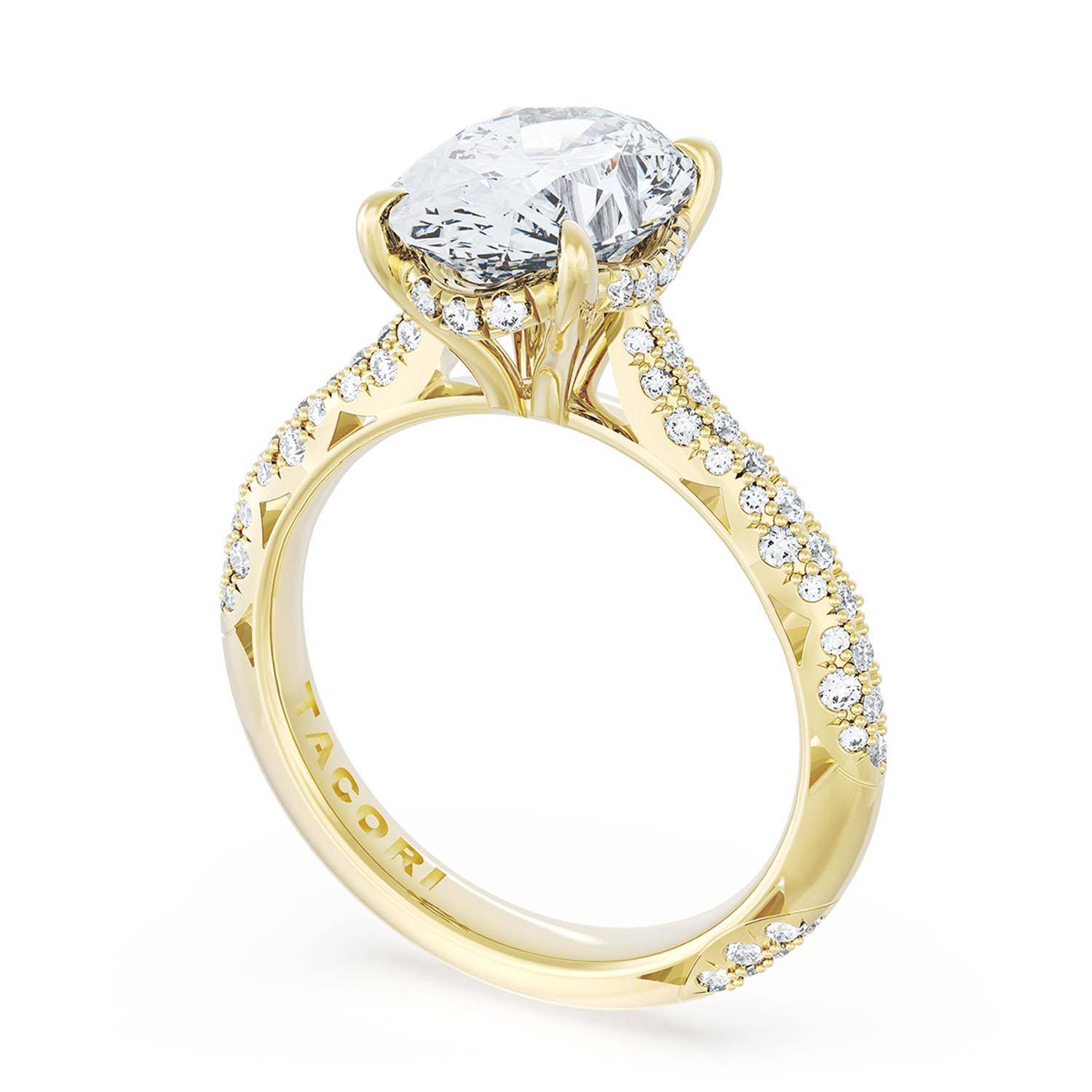 This 3-stone ring features an oval center and matching oval side stones, each accented with a hidden bloom. The Founder's Crescent Fabric wraps around the ceiling of the ring and continues for 3/4 diamond coverage.