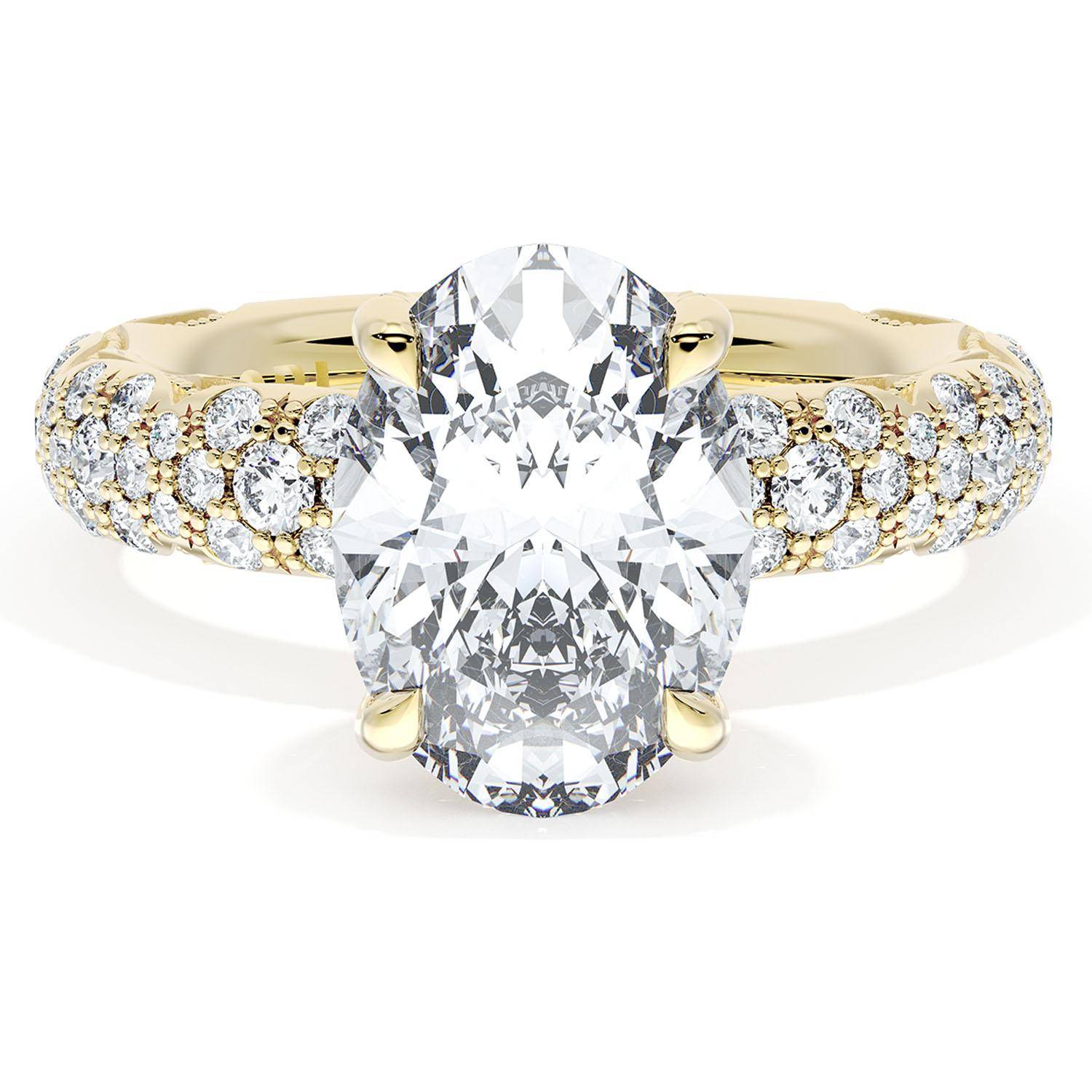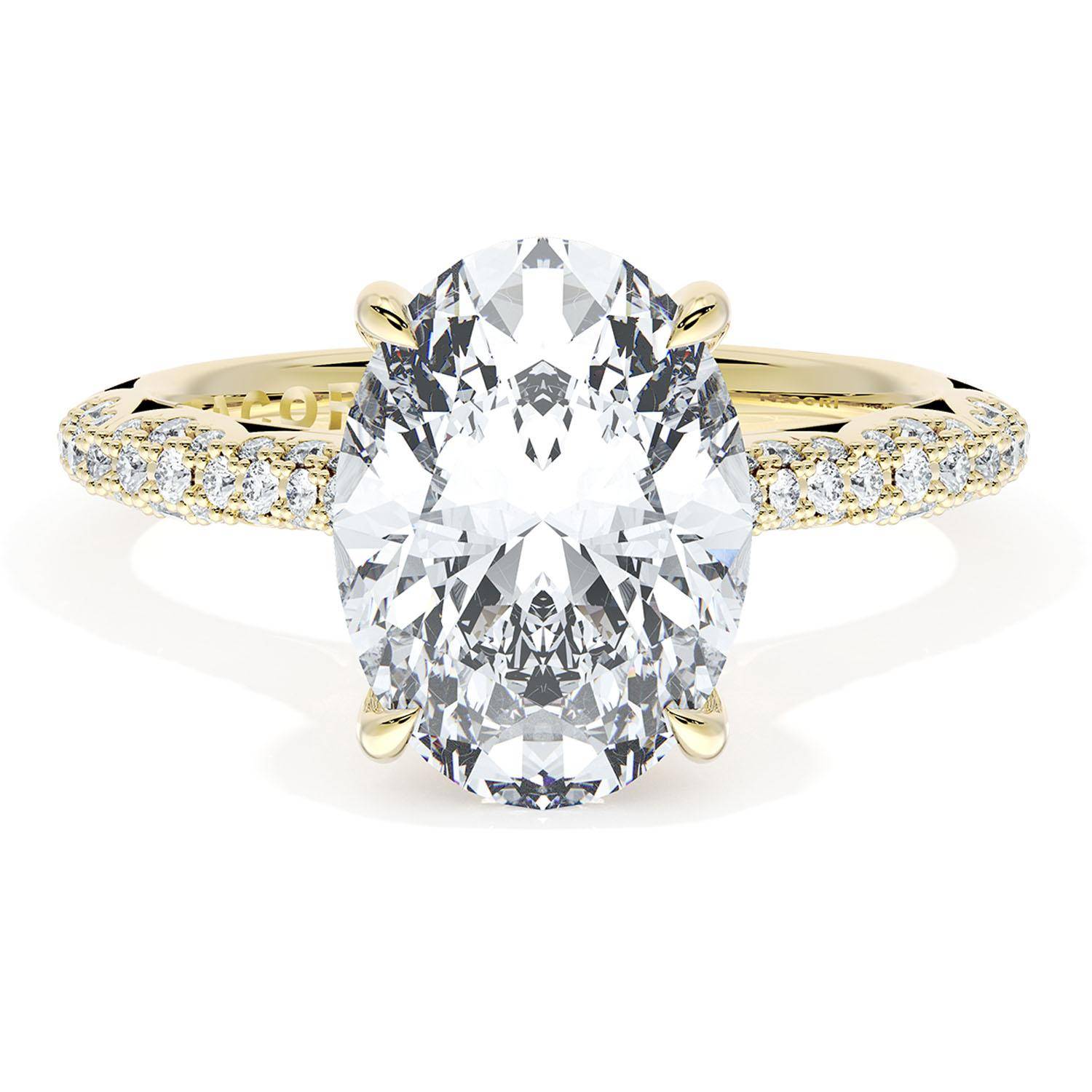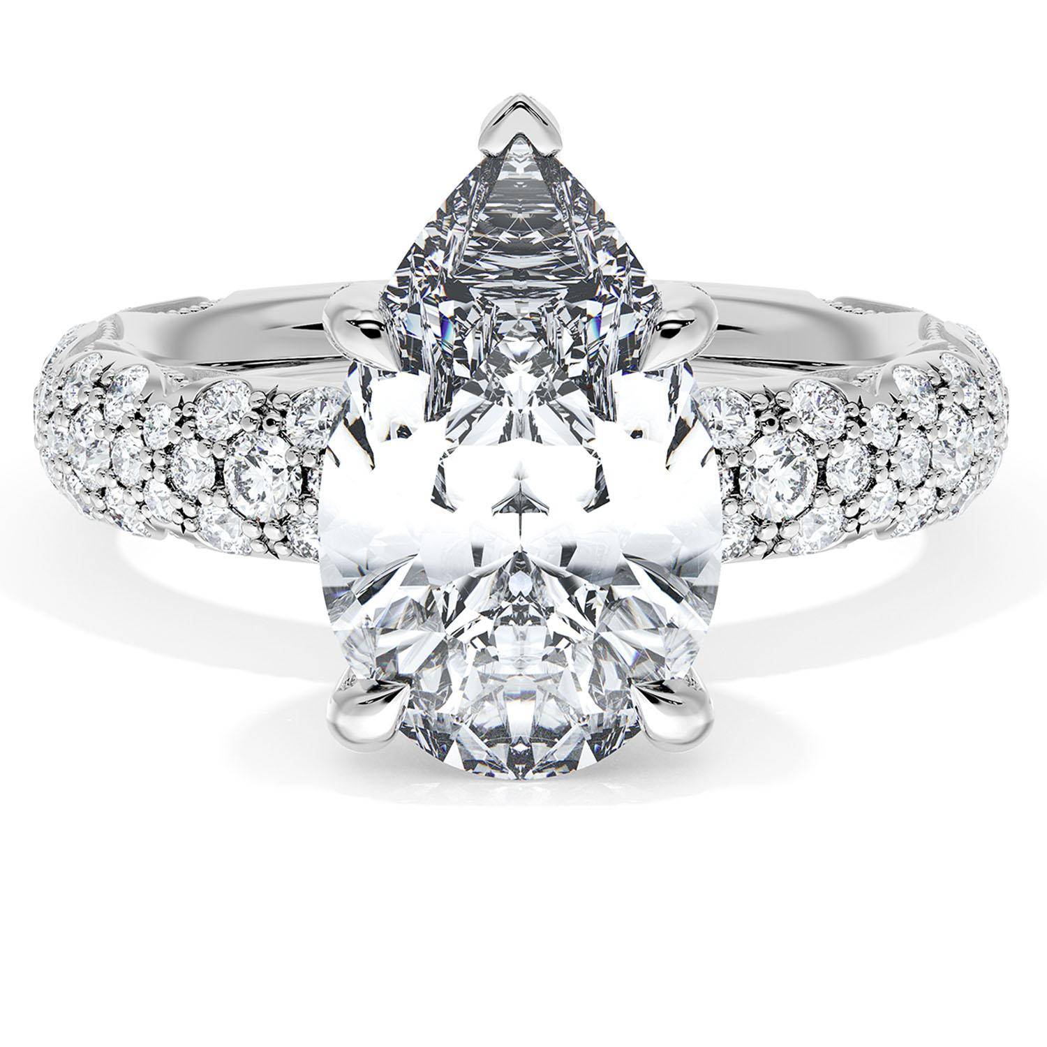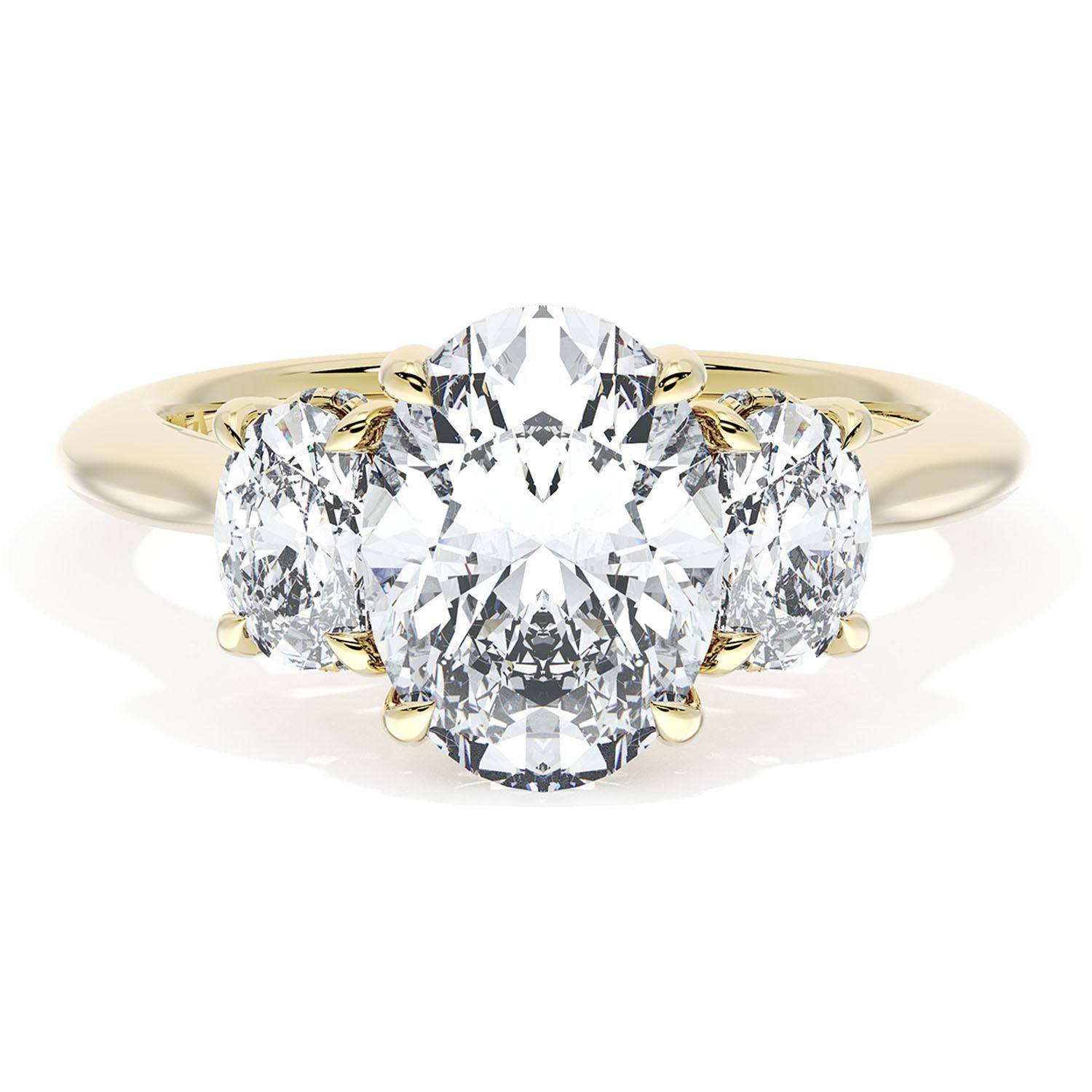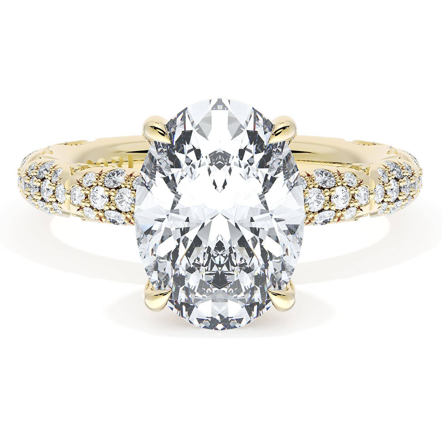 This 3-stone ring features an oval center and matching oval side stones, each accented with a hidden bloom. The Founder's Crescent Fabric wraps around the ceiling of the ring and continues for 3/4 diamond coverage.