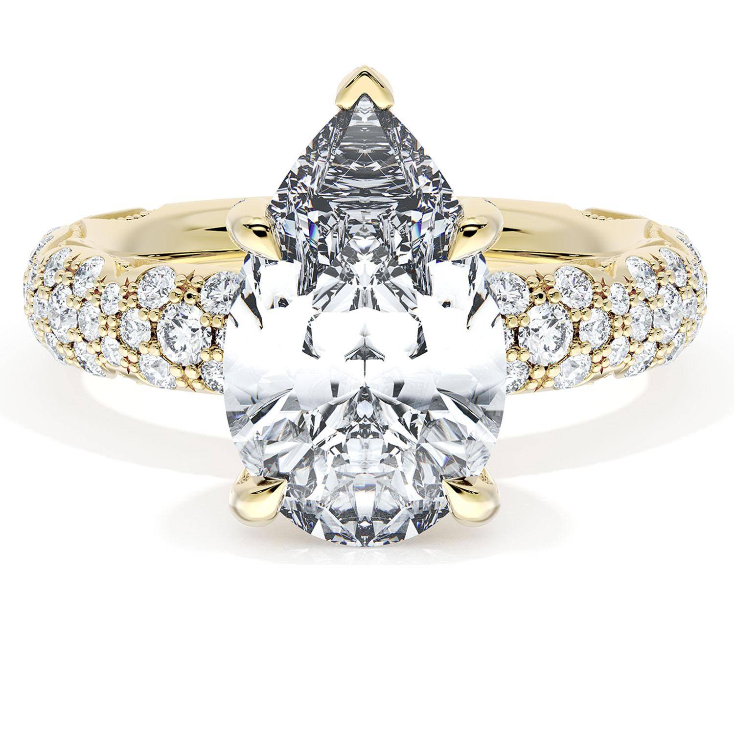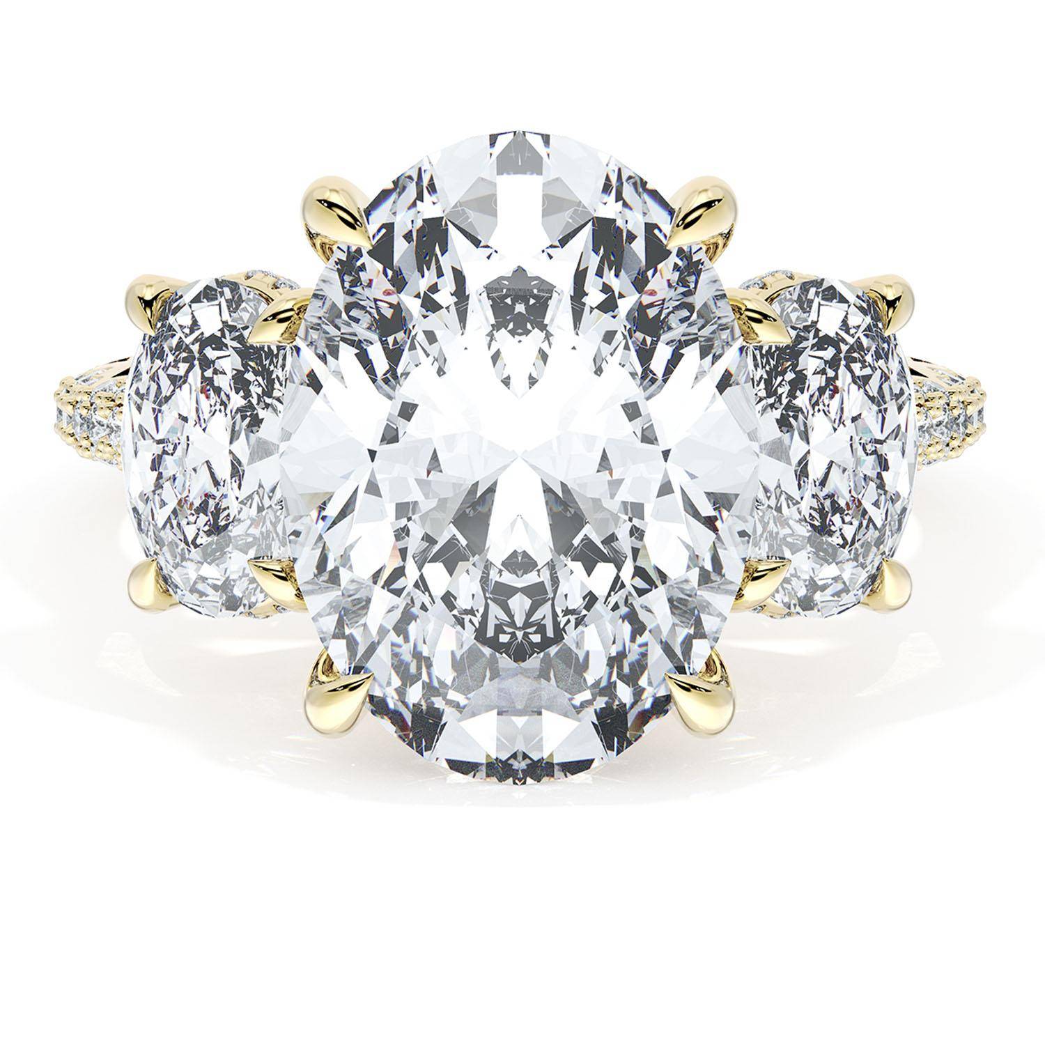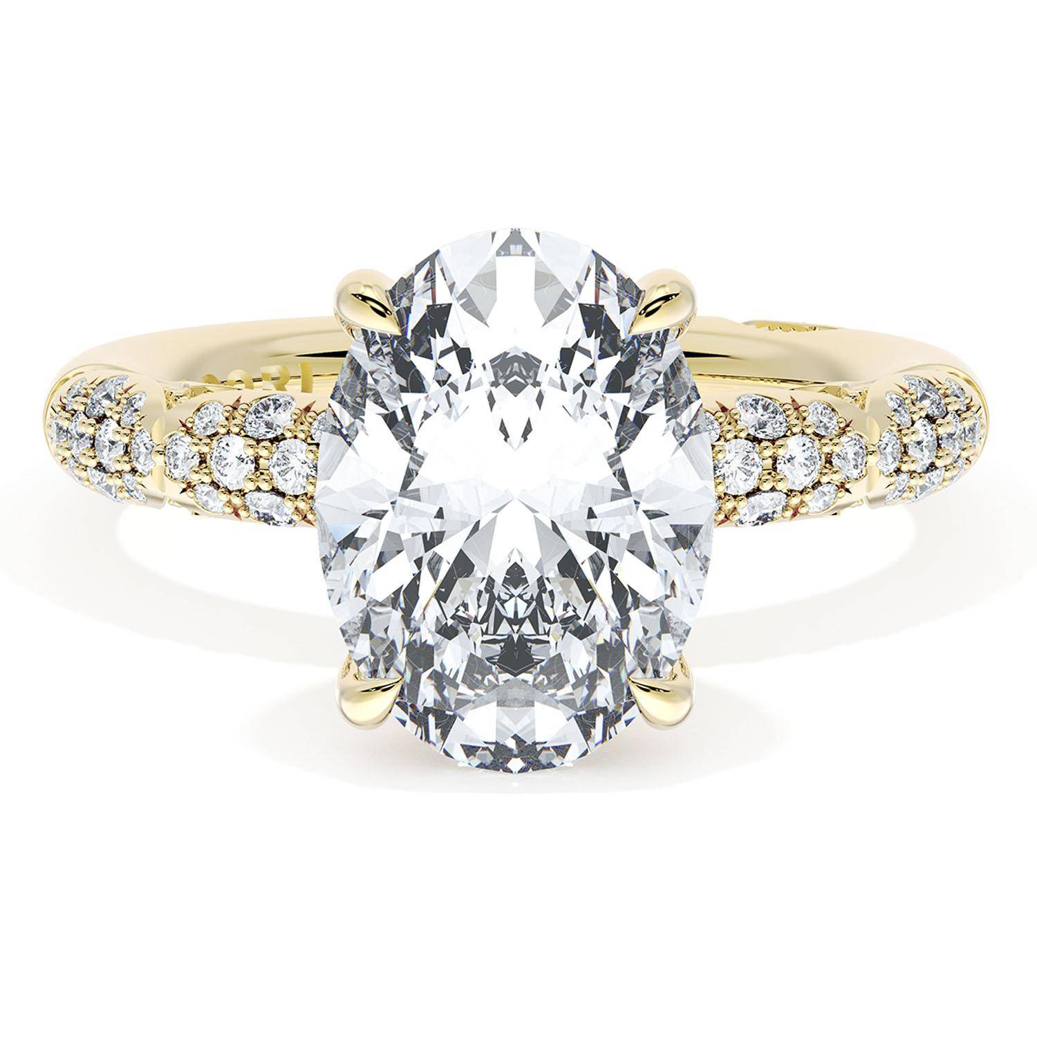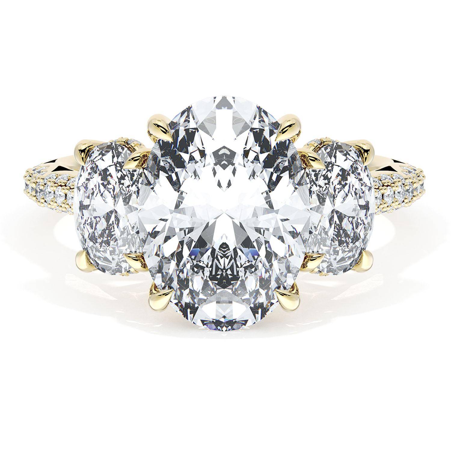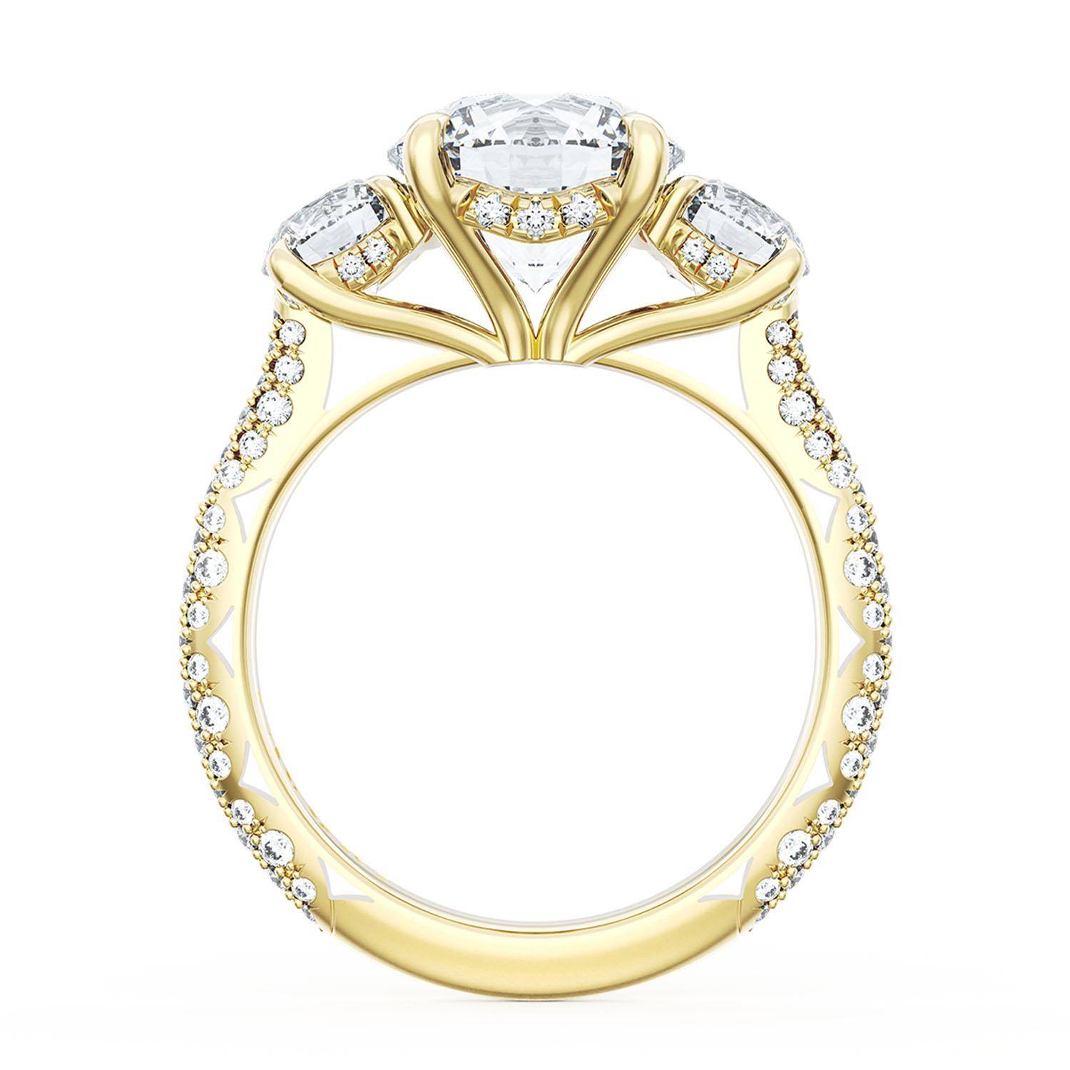 This 3-stone ring features an oval center and matching oval side stones, each accented with a hidden bloom. The Founder's Crescent Fabric wraps around the ceiling of the ring and continues for 3/4 diamond coverage.