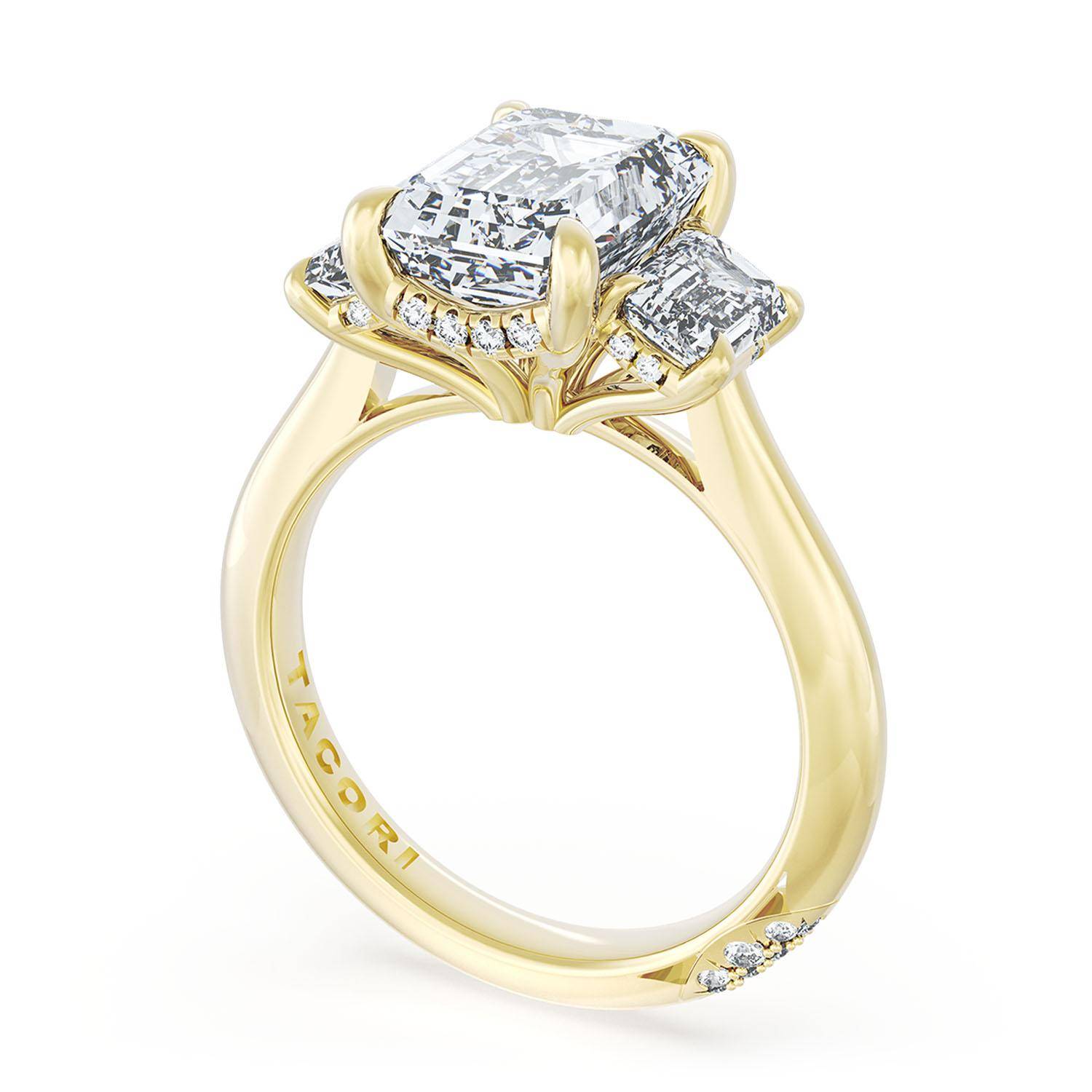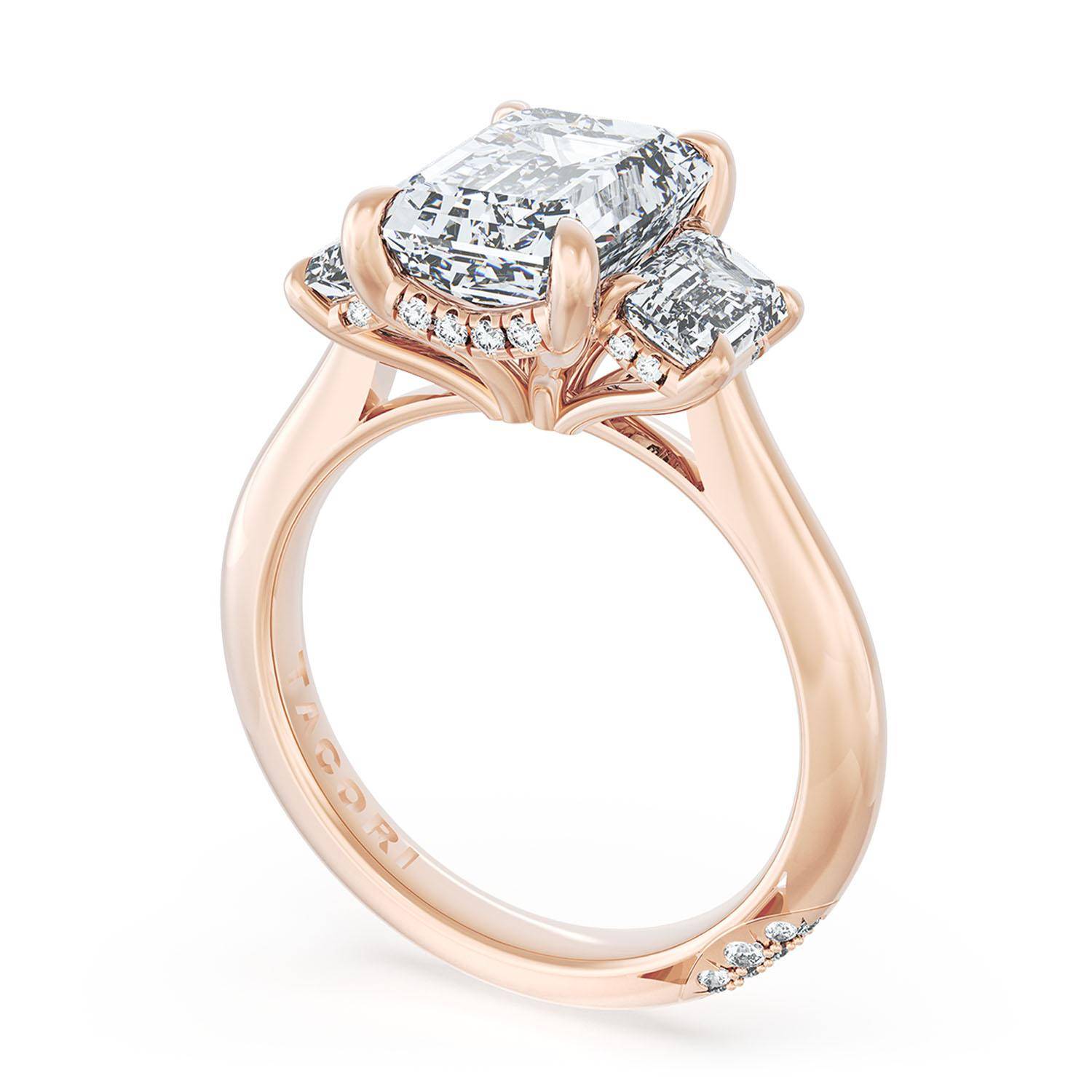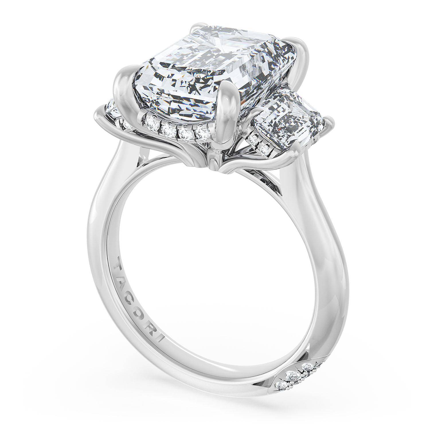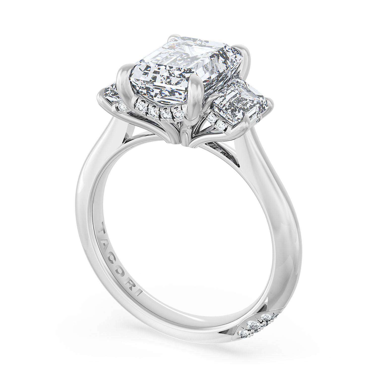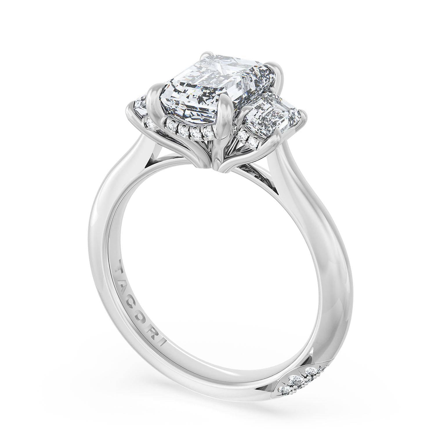This 3-stone ring features an emerald center and matching emerald side stones, each accented with a hidden bloom. The Founder's Crescent Fabric wraps around the ceiling of the ring and continues for 3/4 diamond coverage.