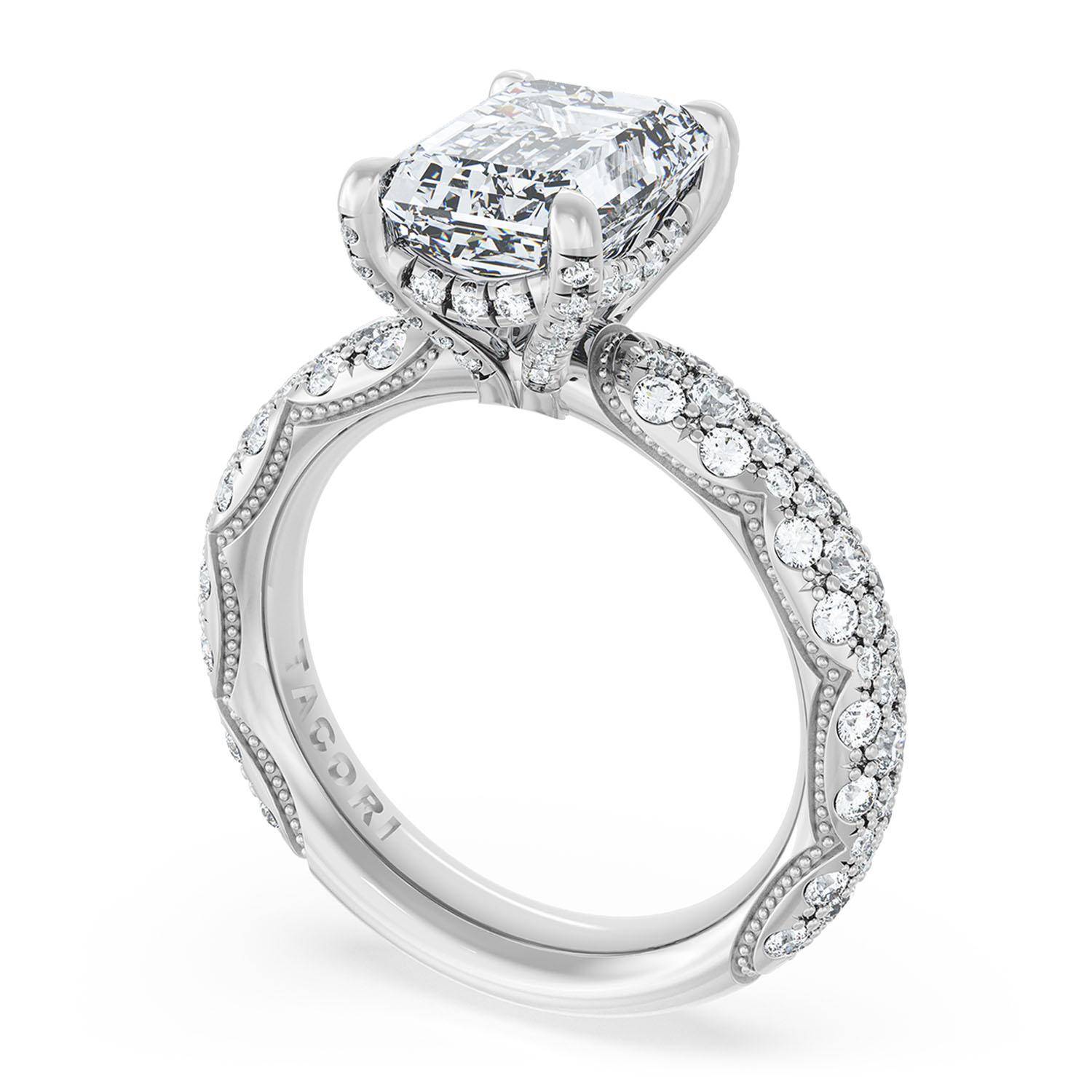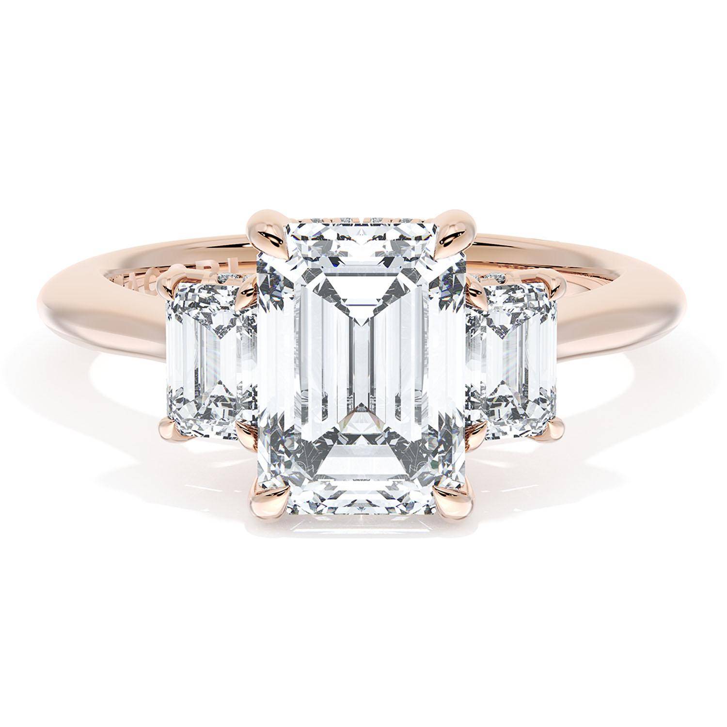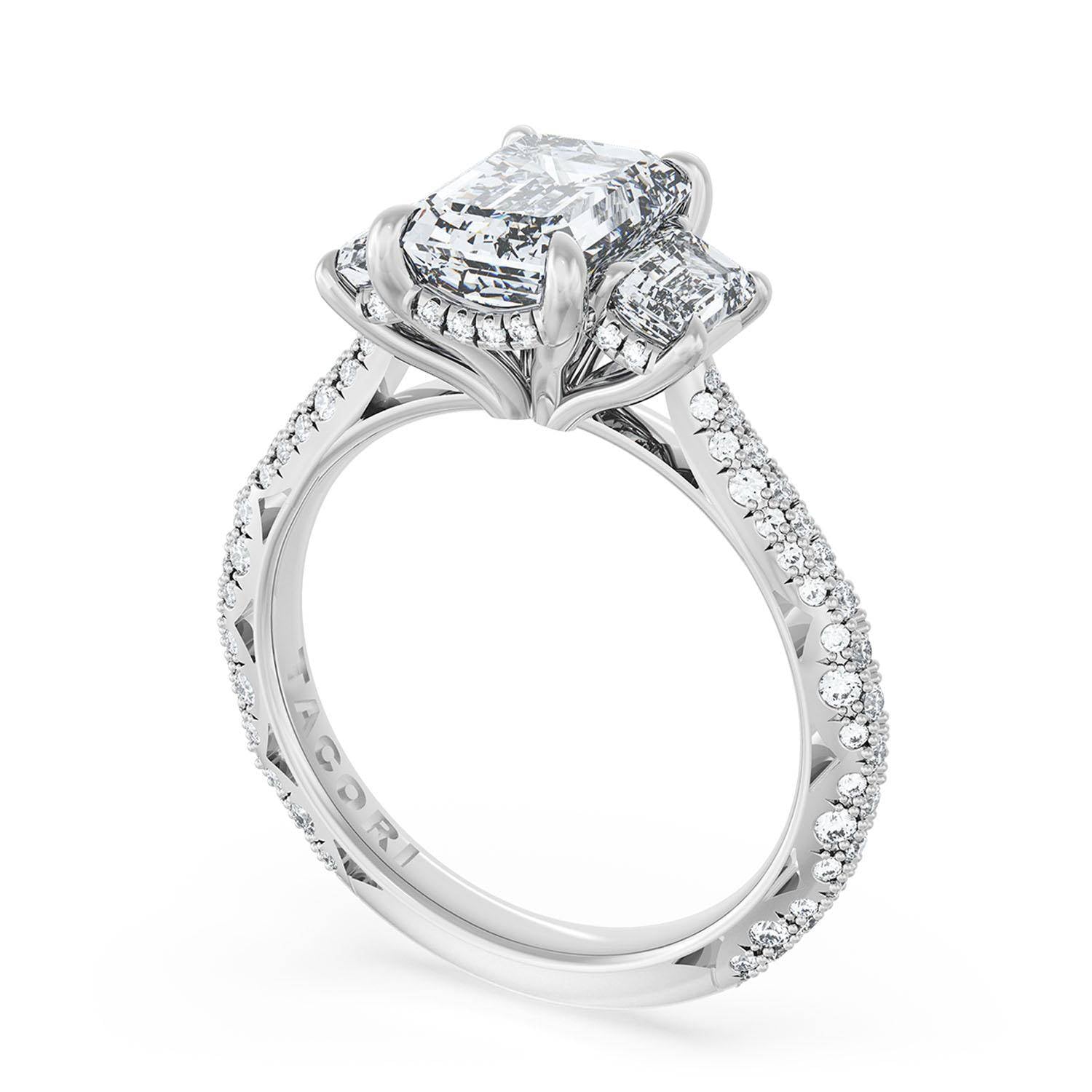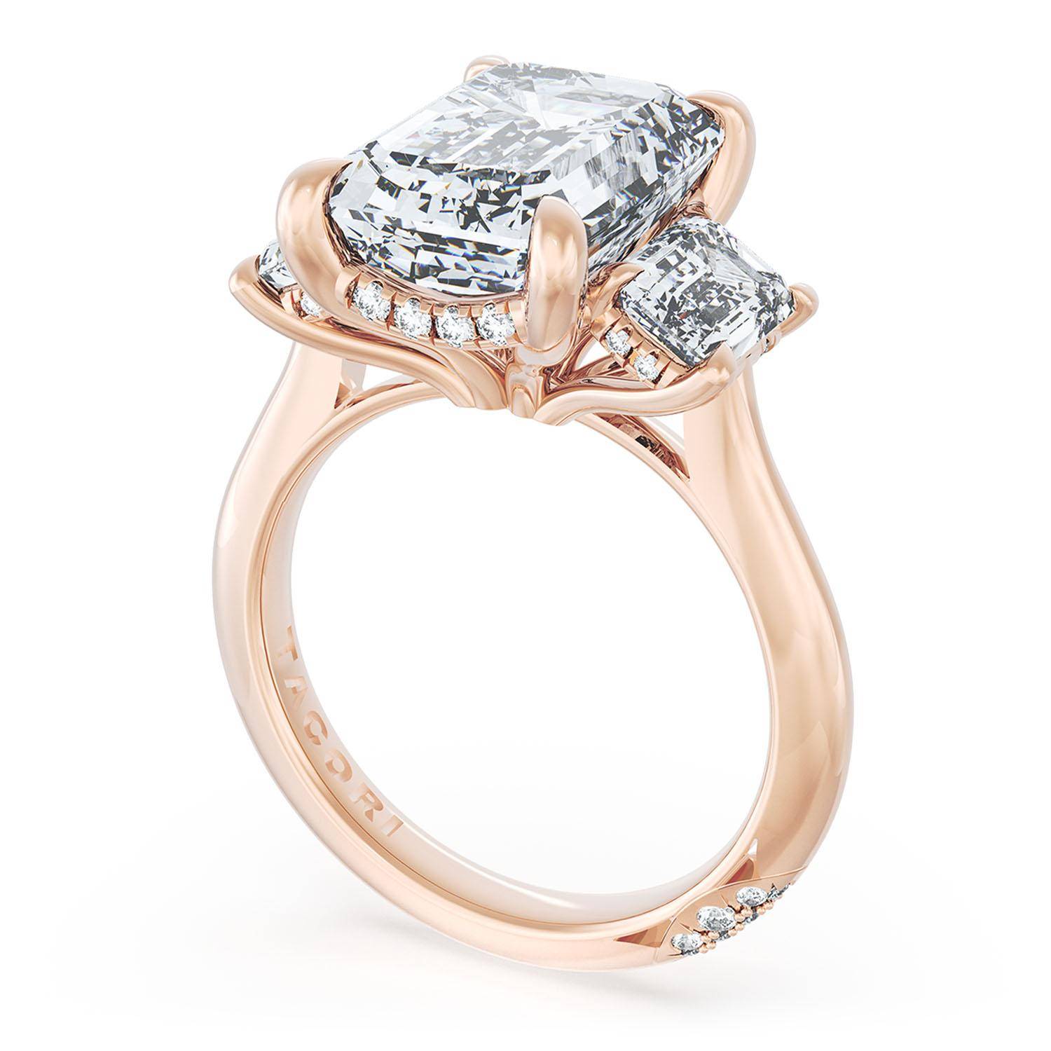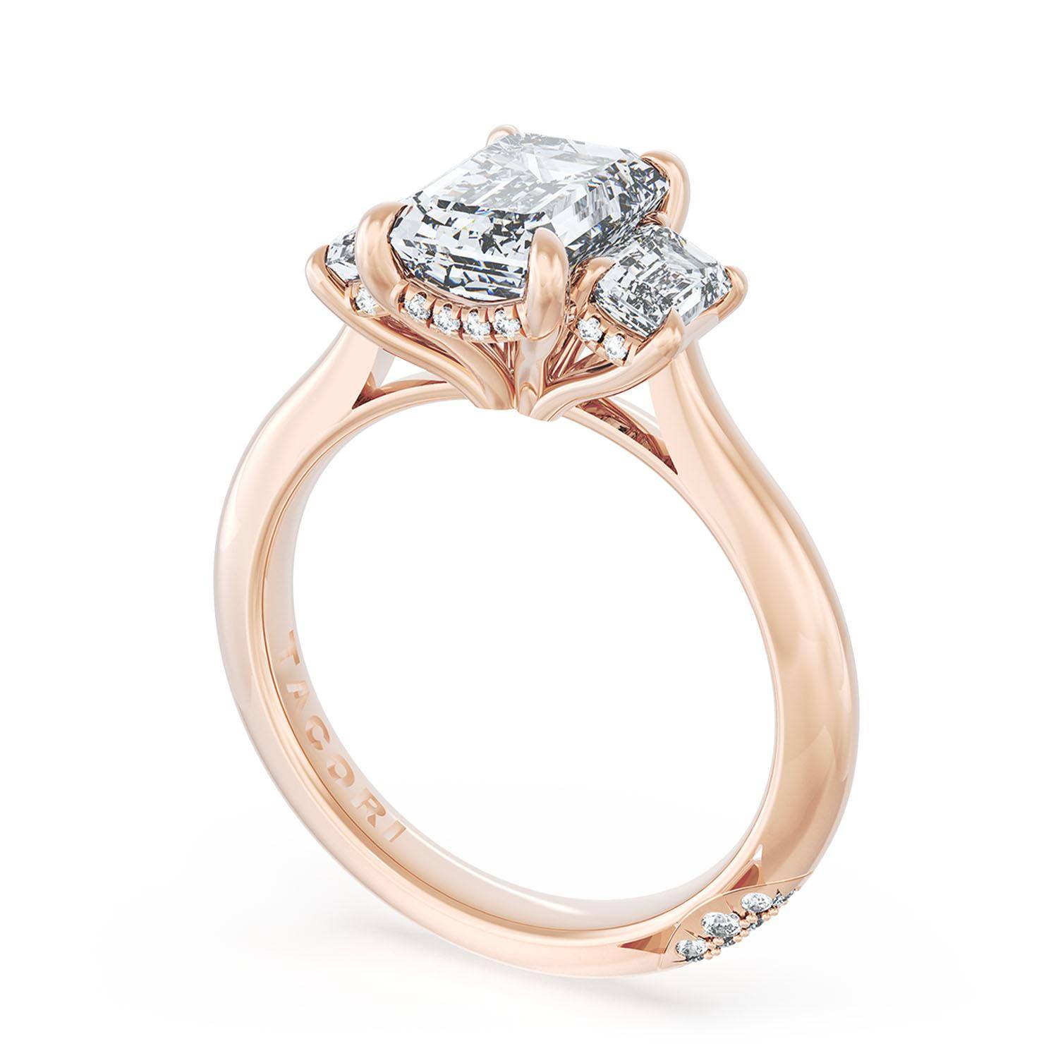 This 3-stone ring features an emerald center and matching emerald side stones, each accented with a hidden bloom. The Founder's Crescent Fabric wraps around the ceiling of the ring and continues for 3/4 diamond coverage.