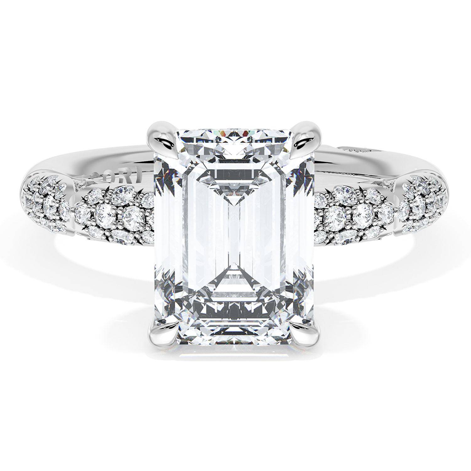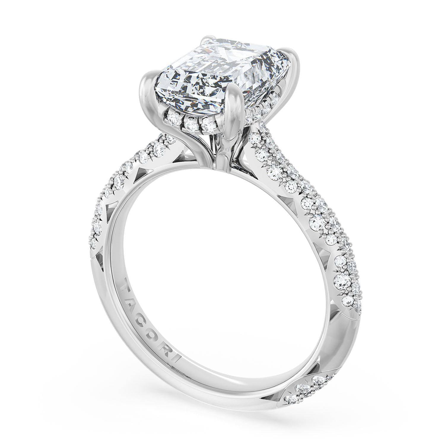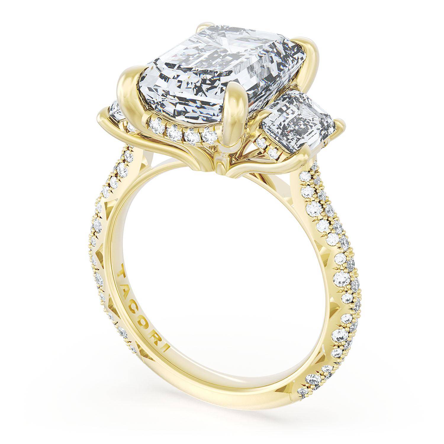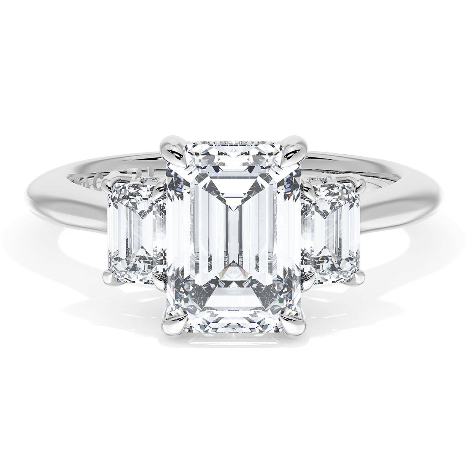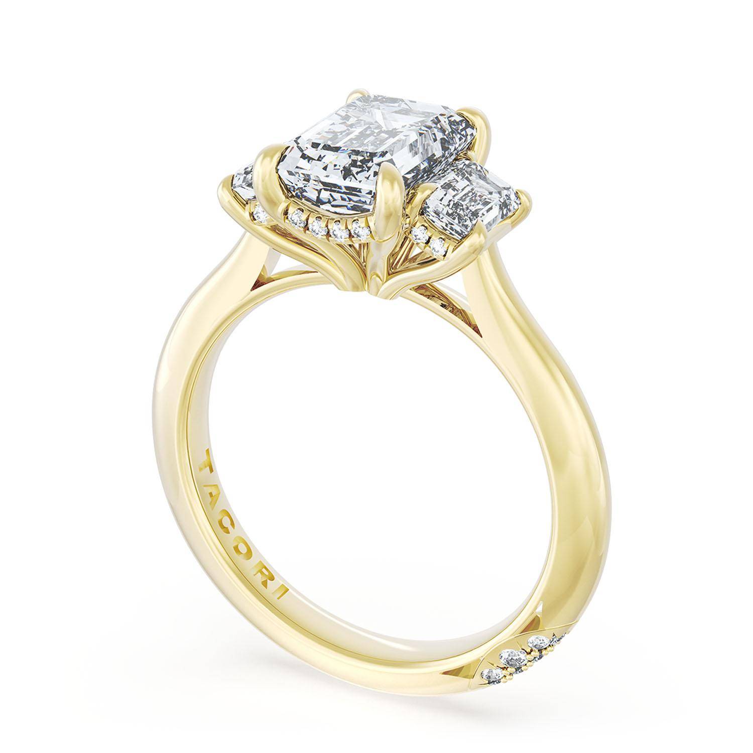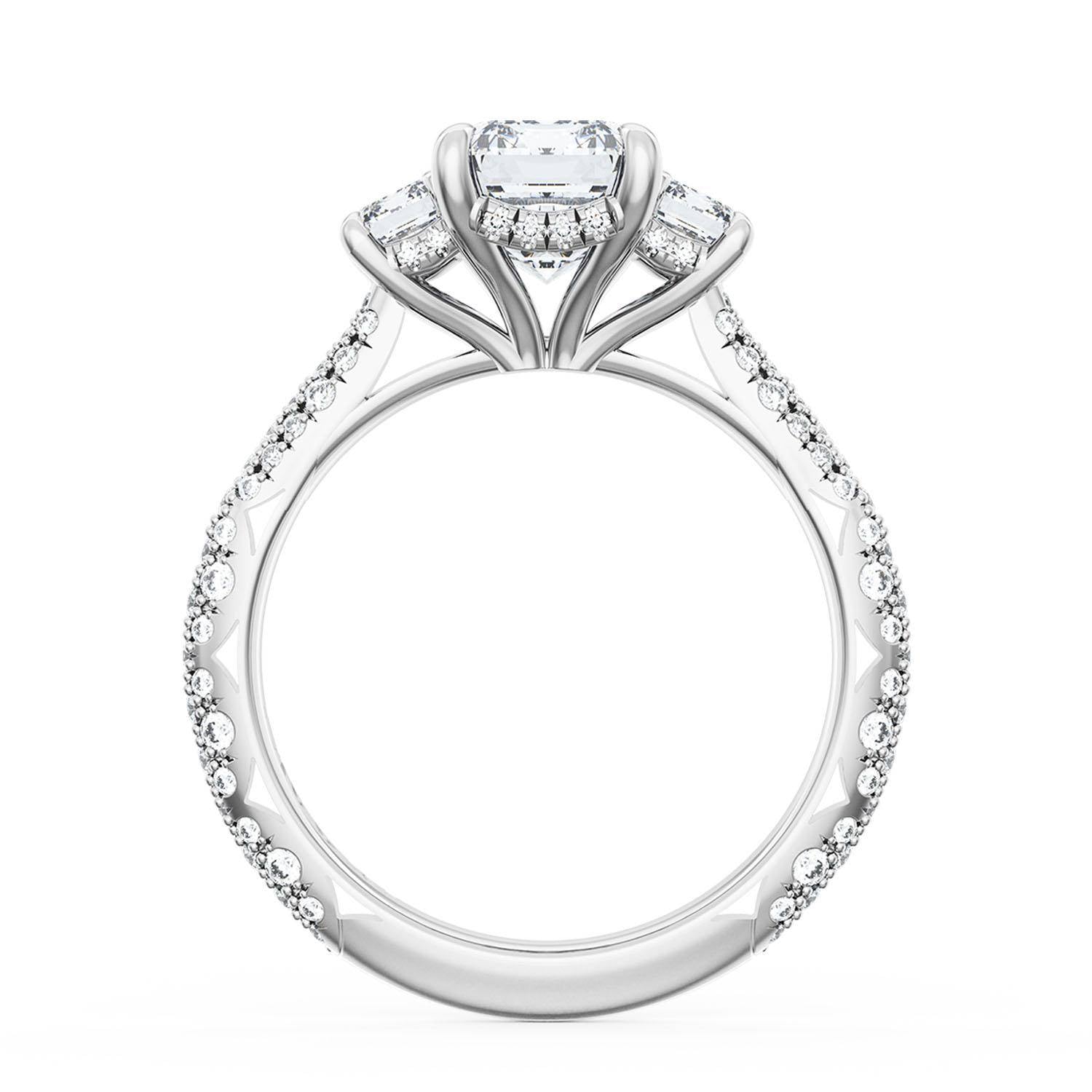 This 3-stone ring features an emerald center and matching emerald side stones, each accented with a hidden bloom. The Founder's Crescent Fabric wraps around the ceiling of the ring and continues for 3/4 diamond coverage.