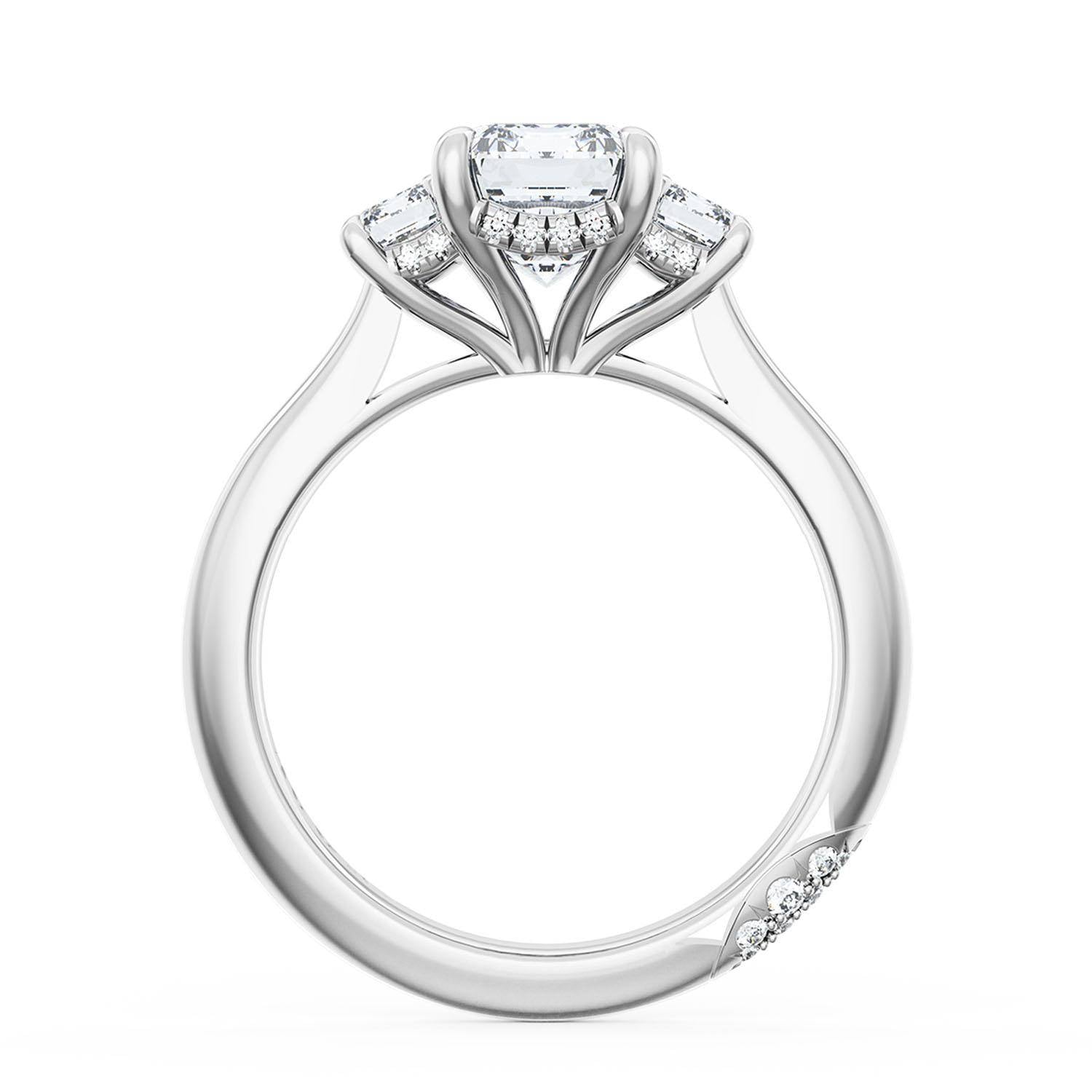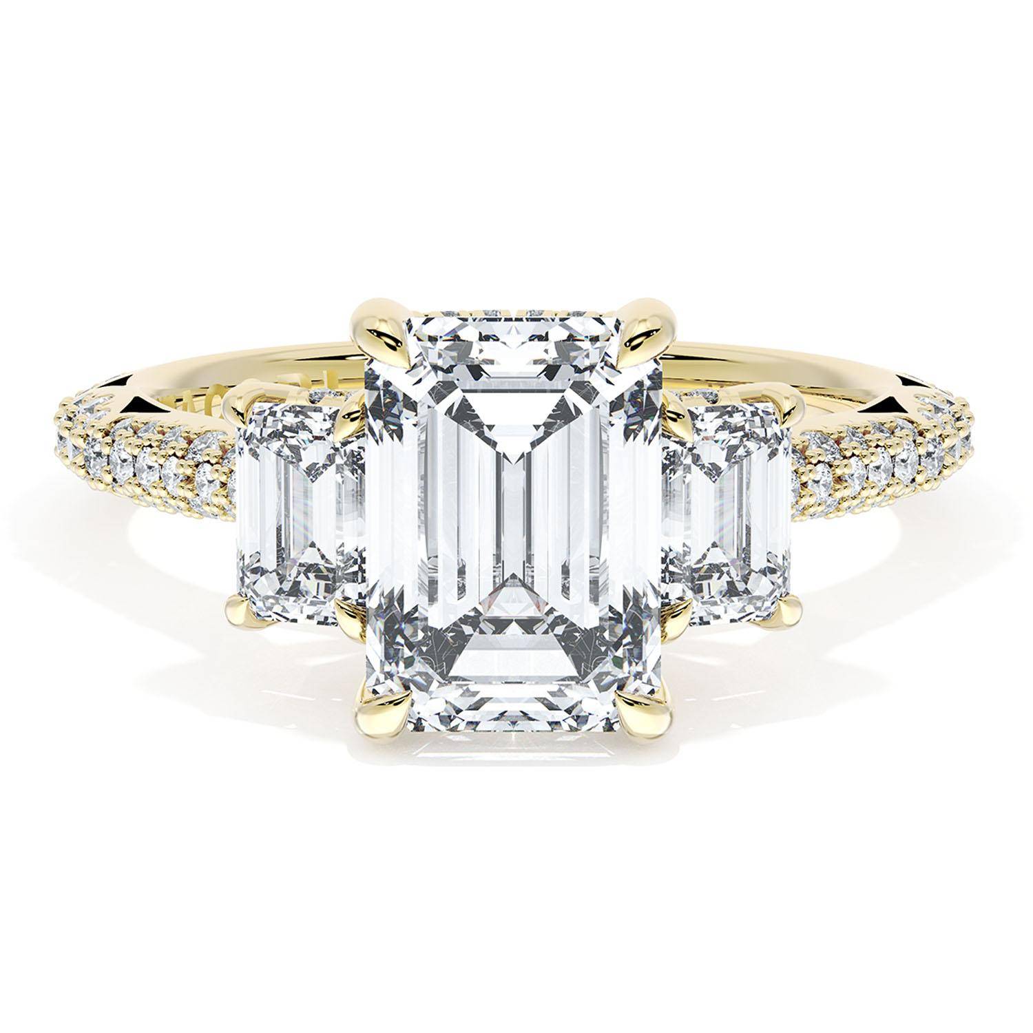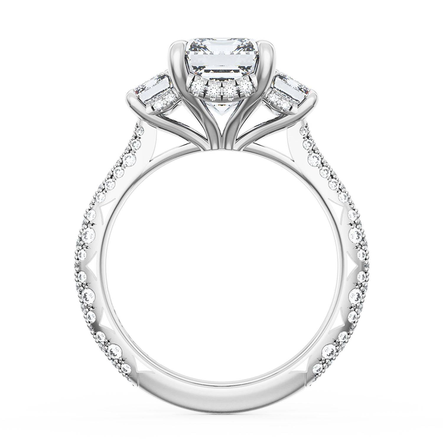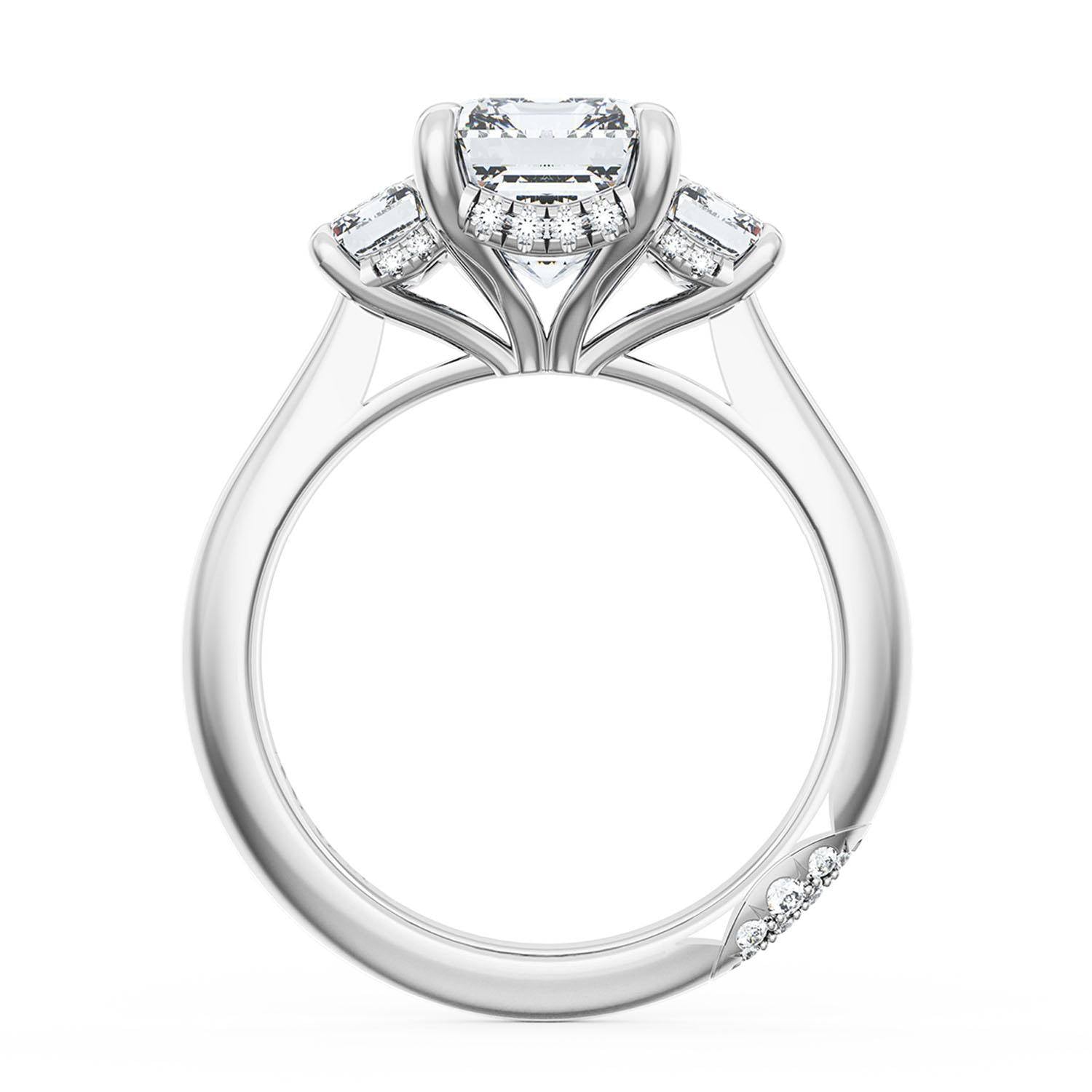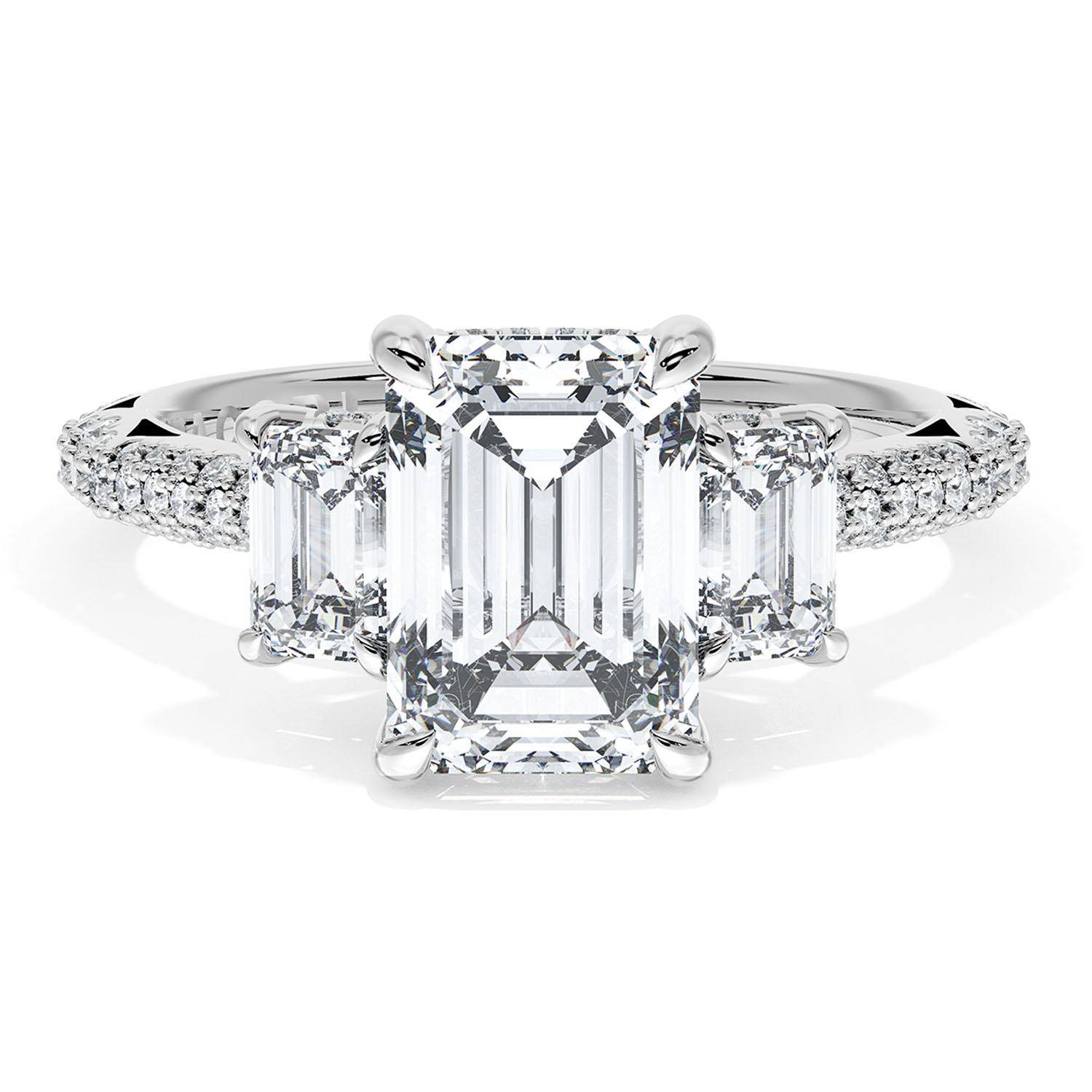 This 3-stone ring features an emerald center and matching emerald side stones, each accented with a hidden bloom. The Founder's Crescent Fabric wraps around the ceiling of the ring and continues for 3/4 diamond coverage.