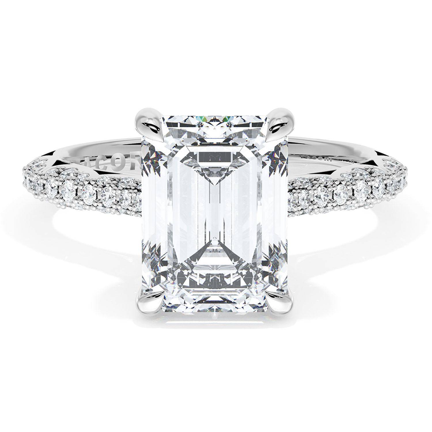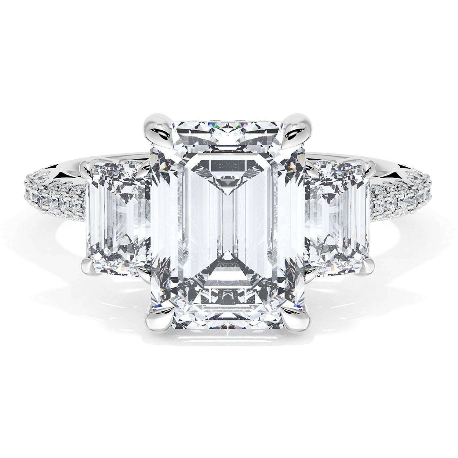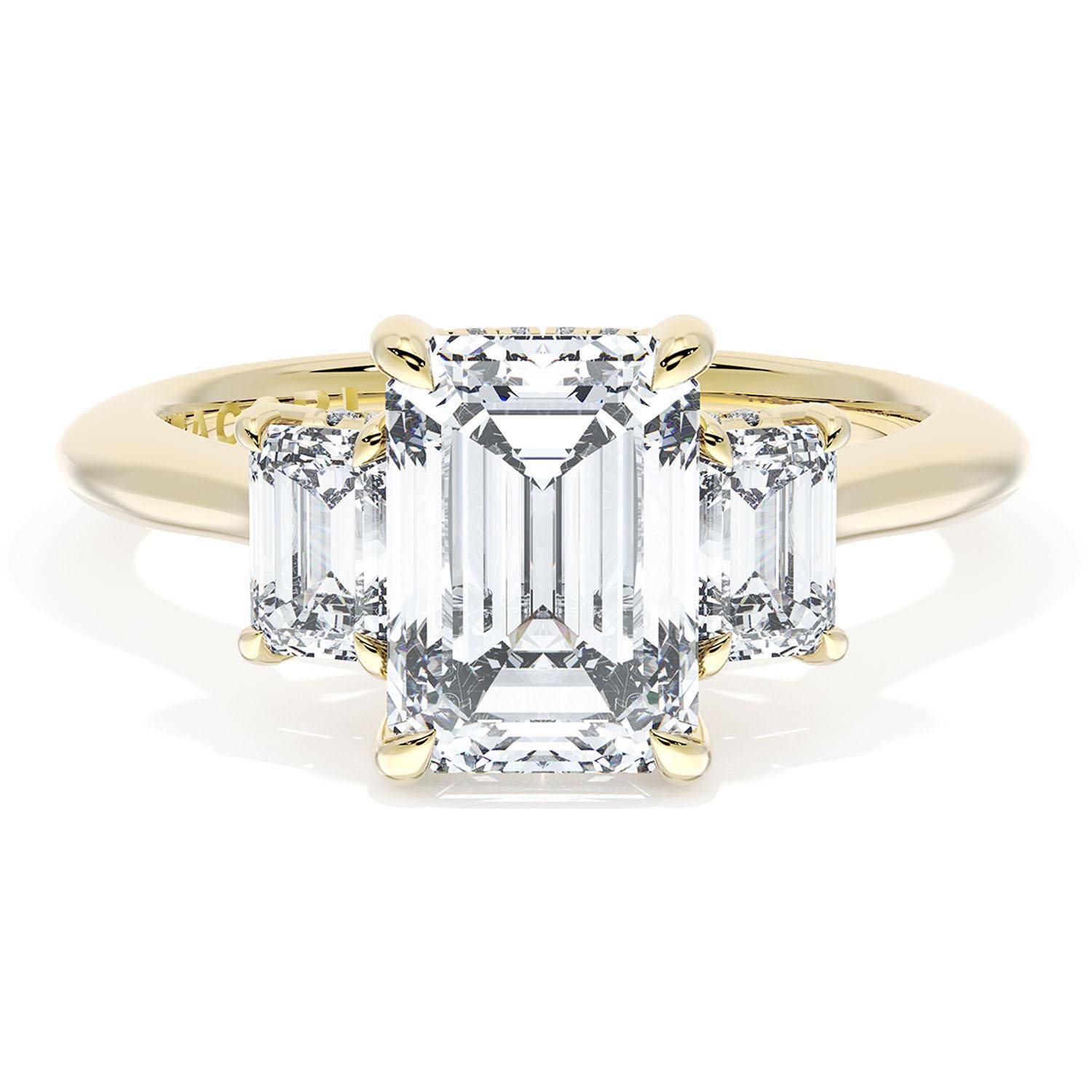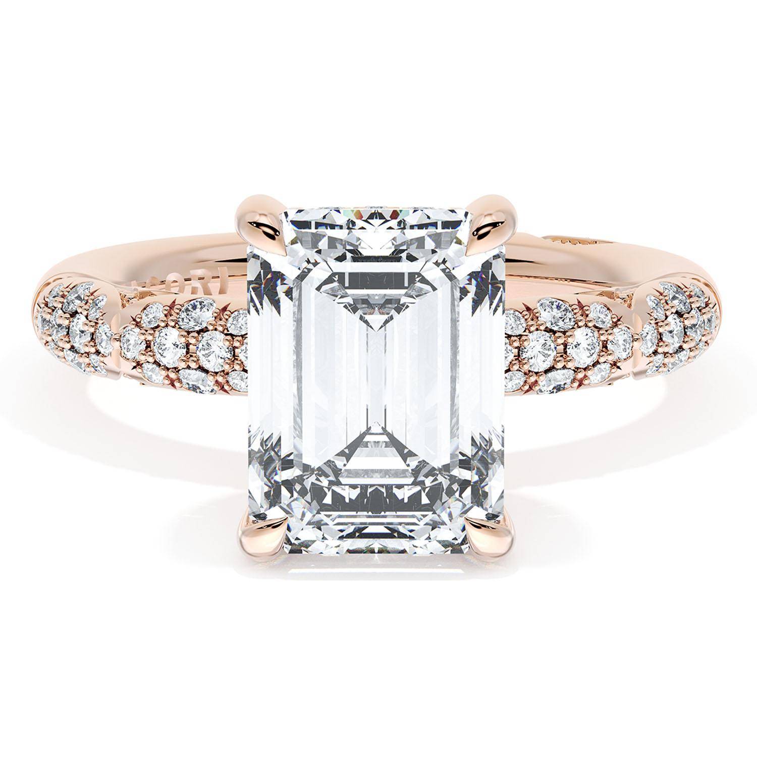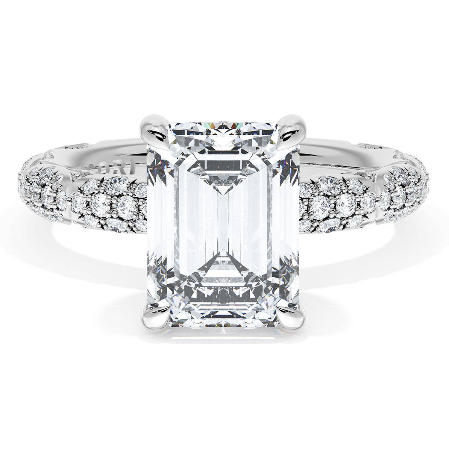 This 3-stone ring features an emerald center and matching emerald side stones, each accented with a hidden bloom. The Founder's Crescent Fabric wraps around the ceiling of the ring and continues for 3/4 diamond coverage.