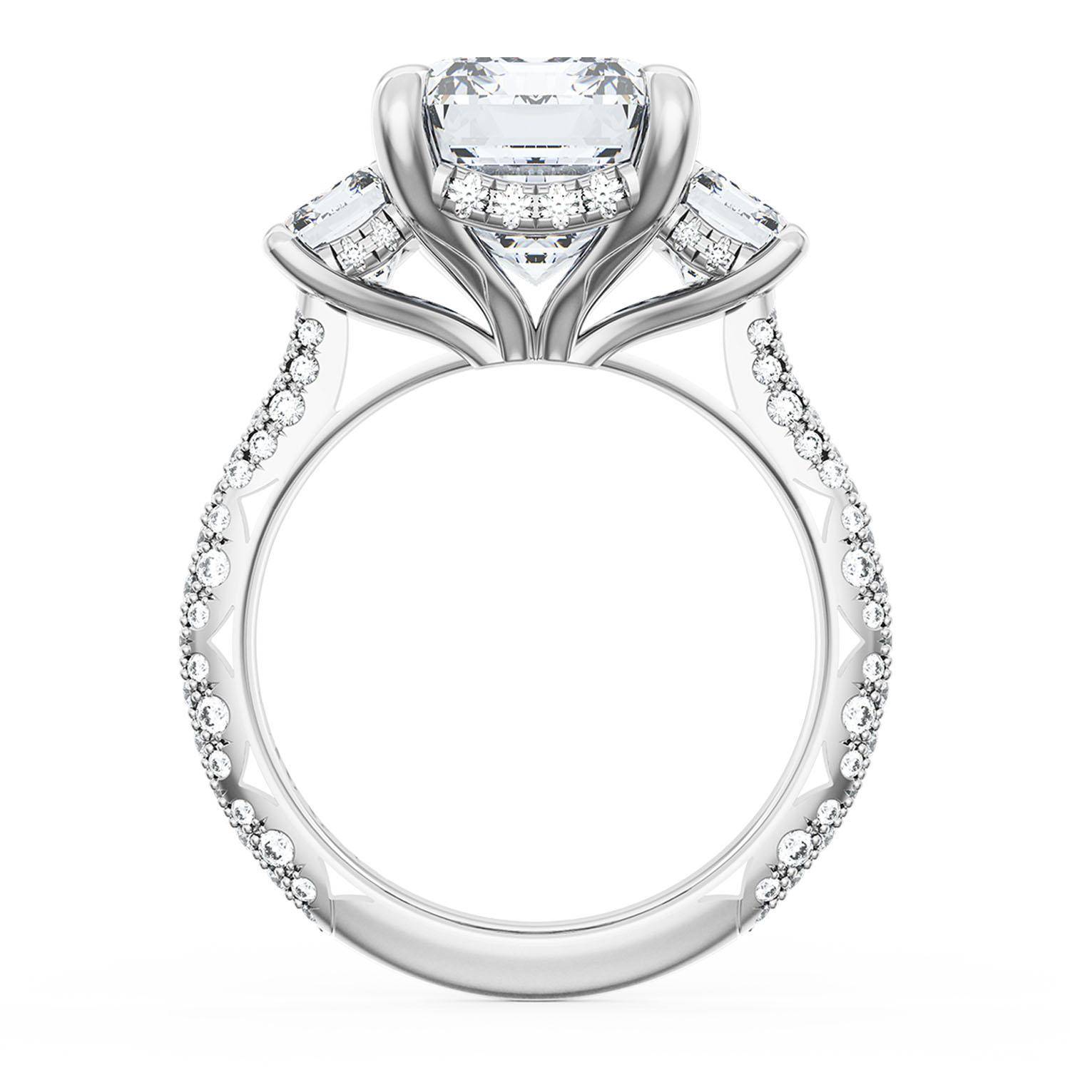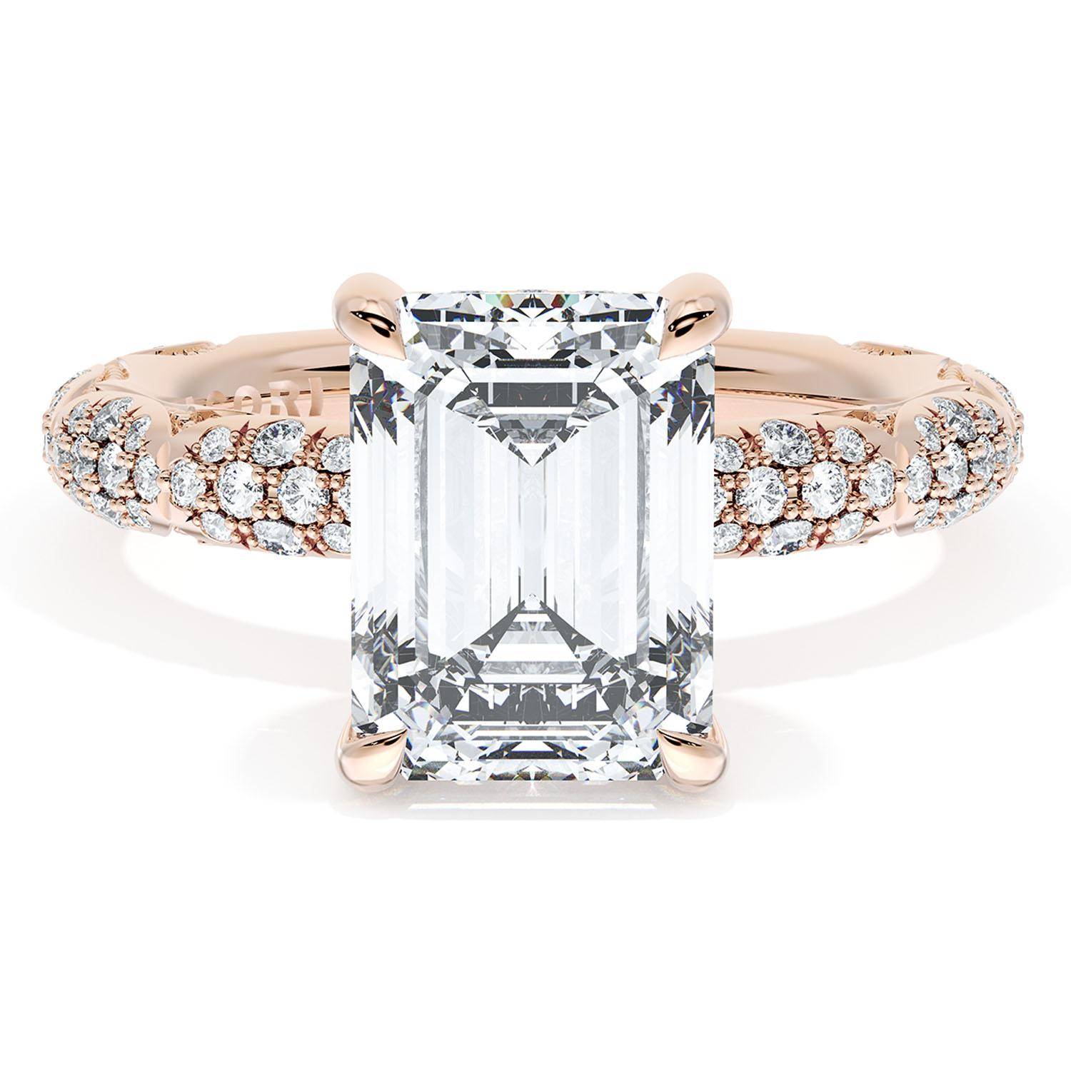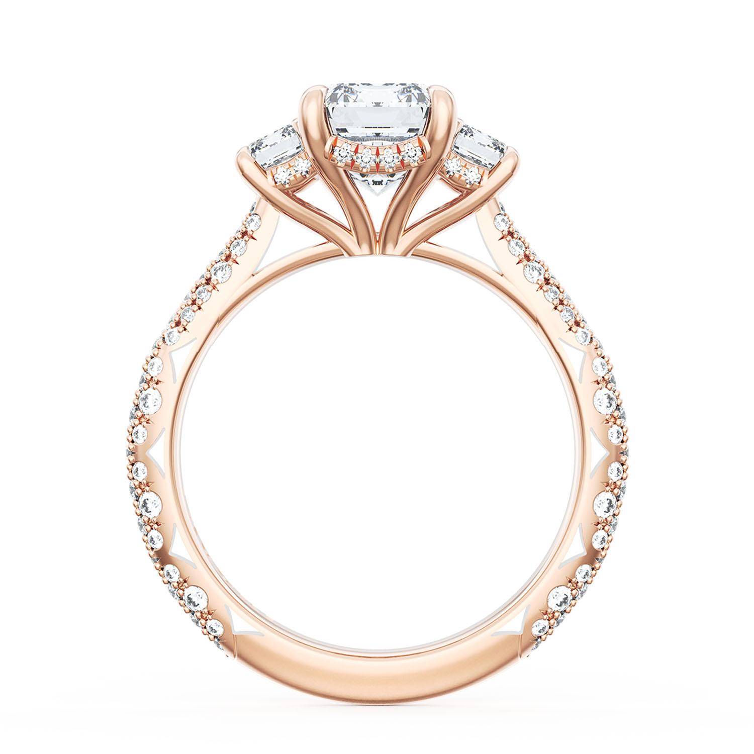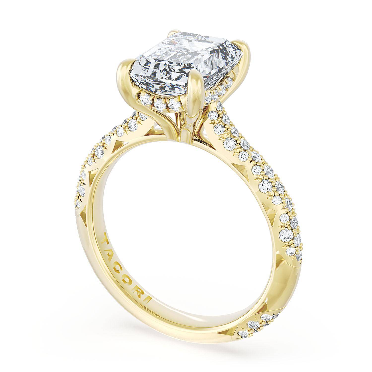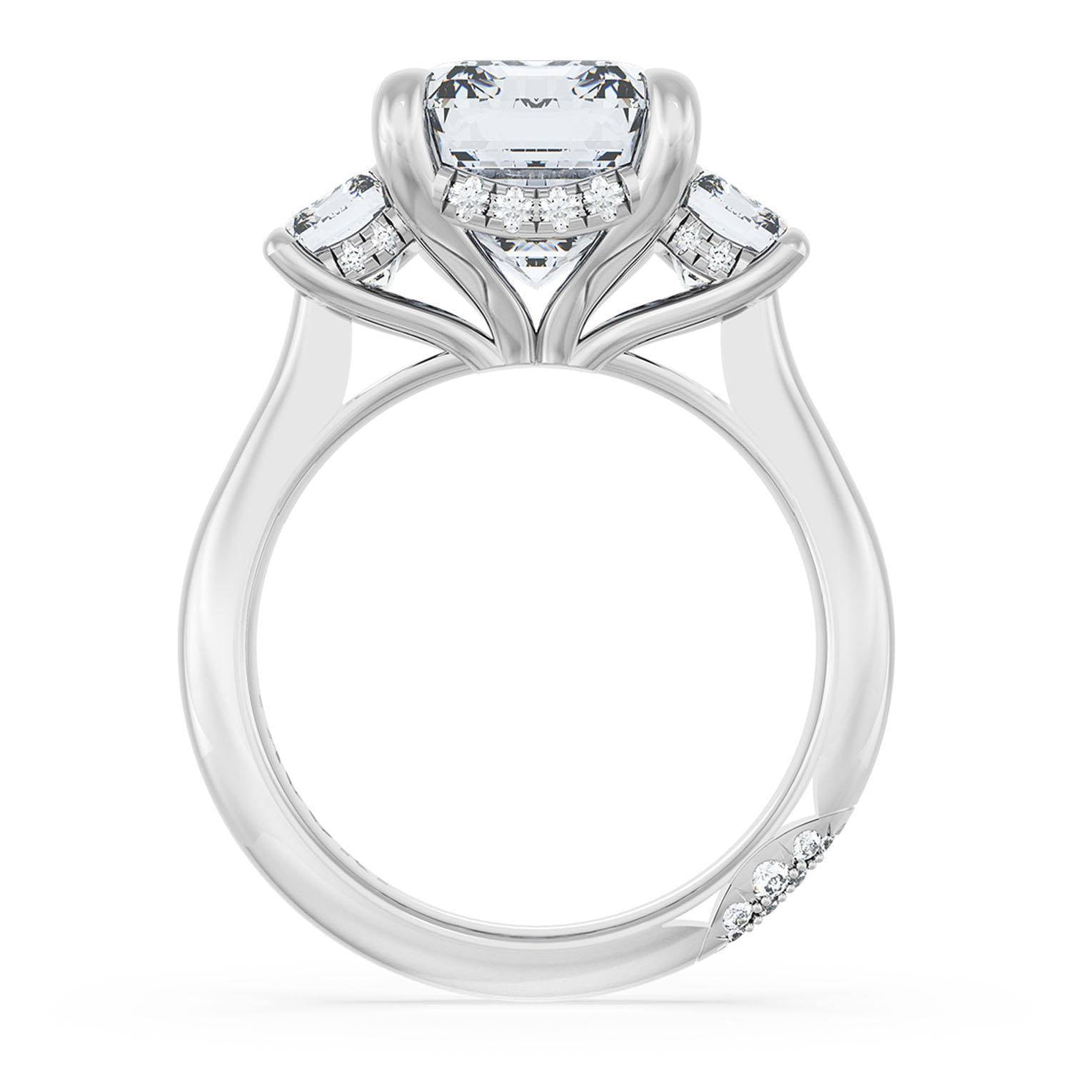 This 3-stone ring features an emerald center and matching emerald side stones, each accented with a hidden bloom. The Founder's Crescent Fabric wraps around the ceiling of the ring and continues for 3/4 diamond coverage.