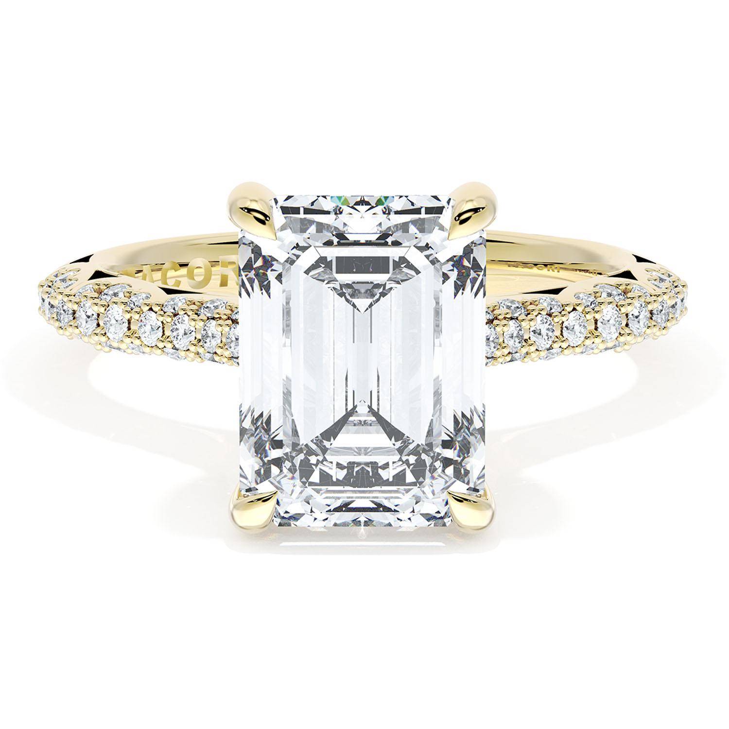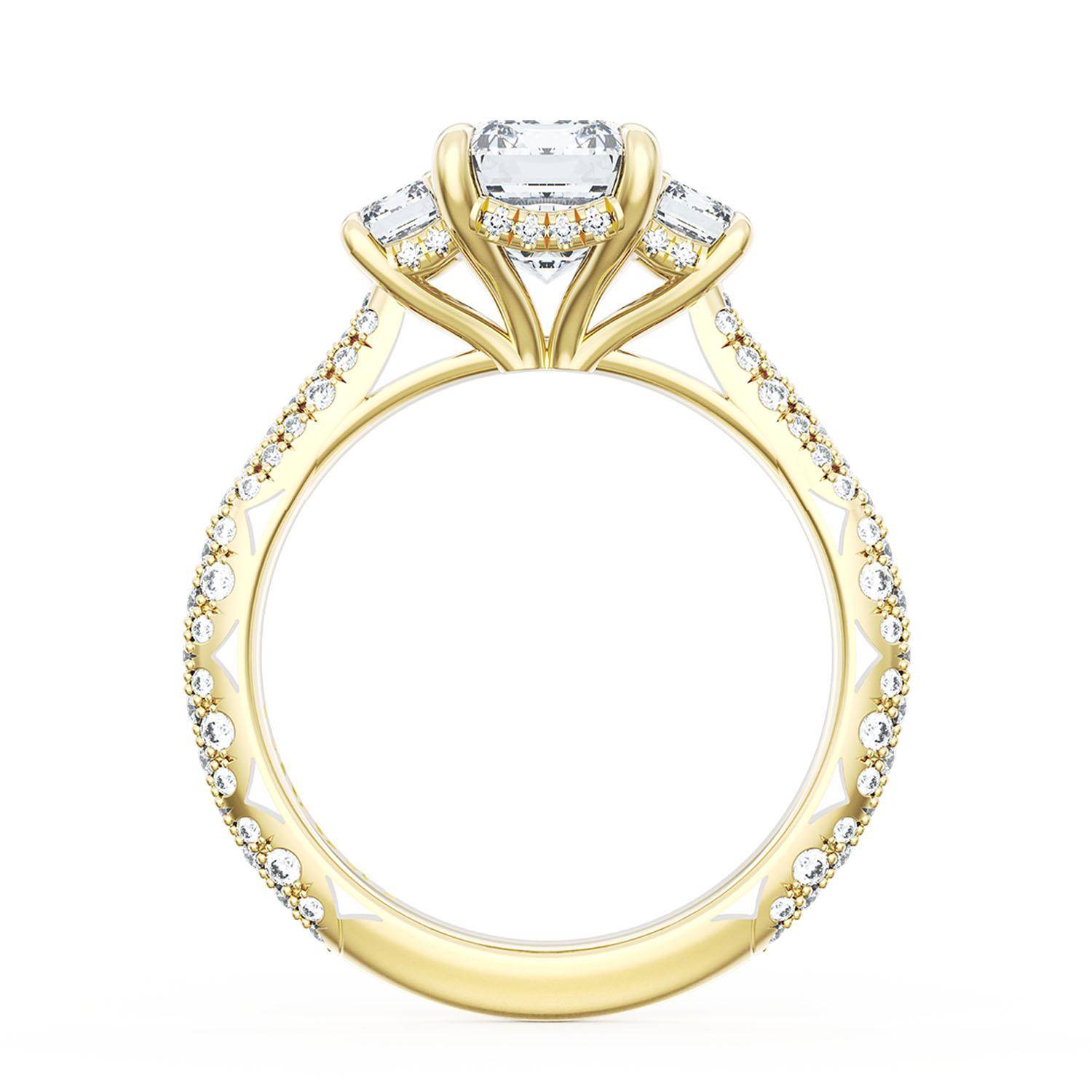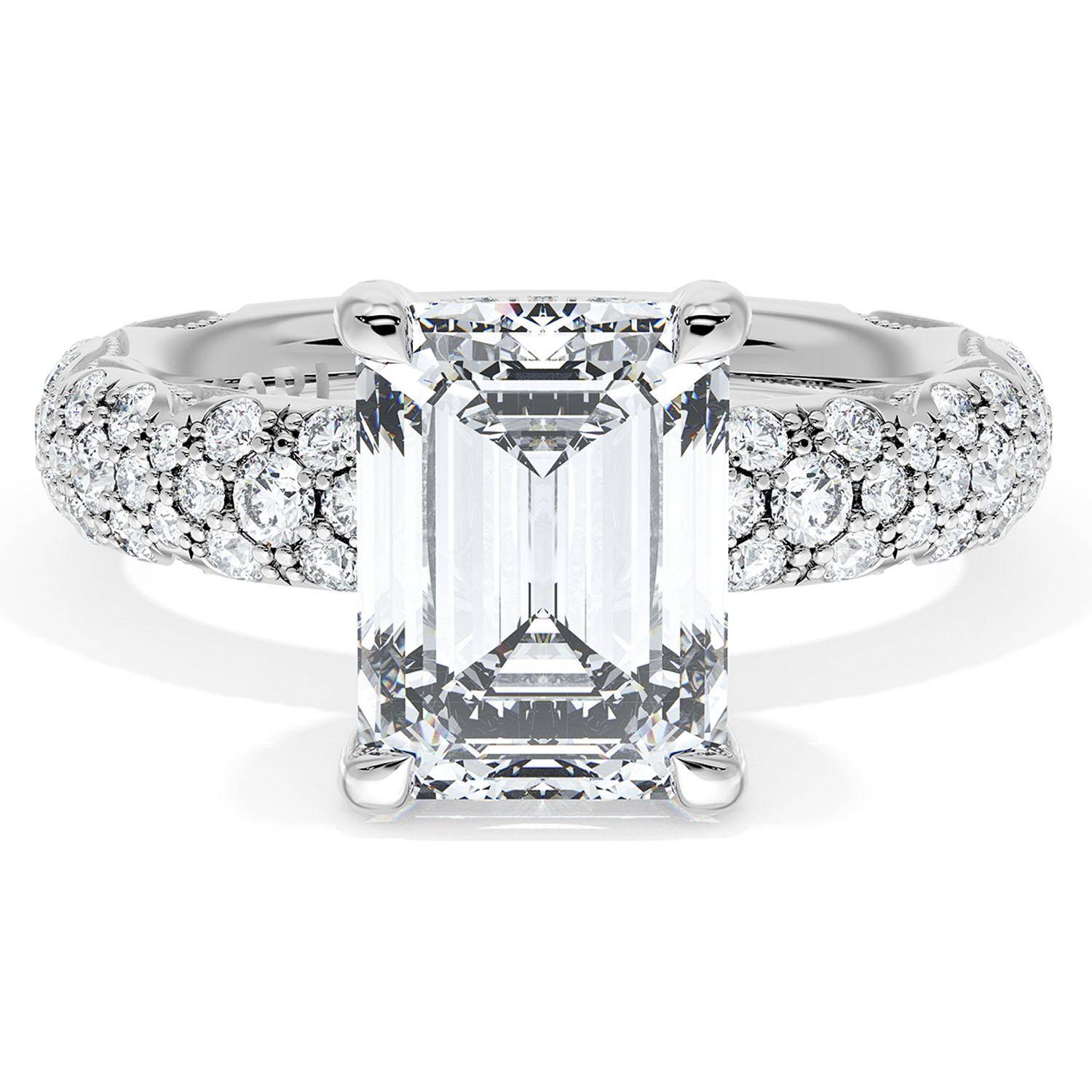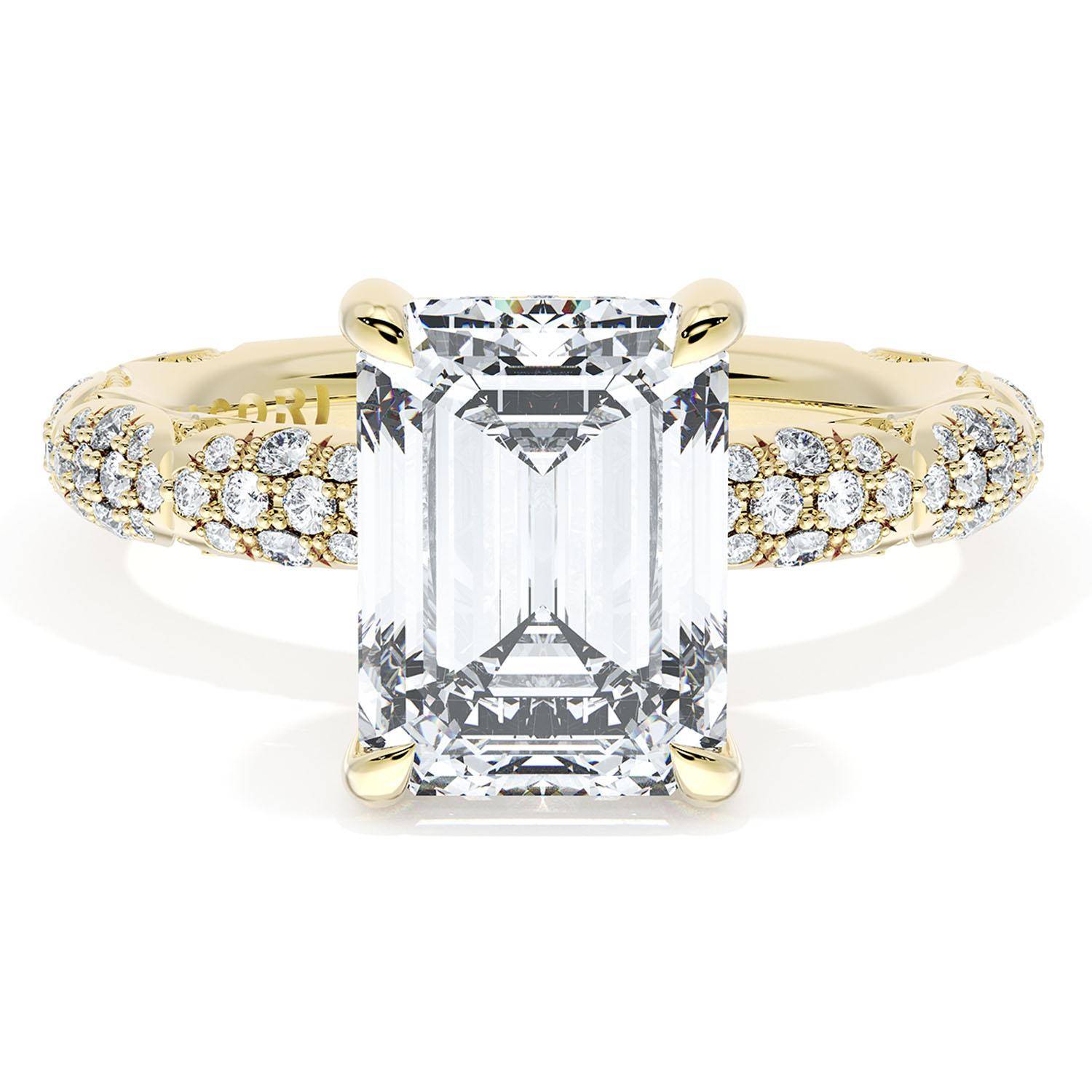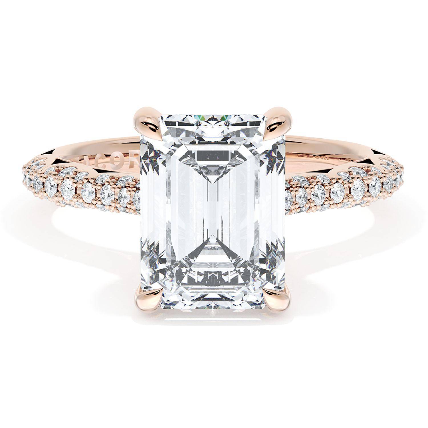 This 3-stone ring features an emerald center and matching emerald side stones, each accented with a hidden bloom. The Founder's Crescent Fabric wraps around the ceiling of the ring and continues for 3/4 diamond coverage.