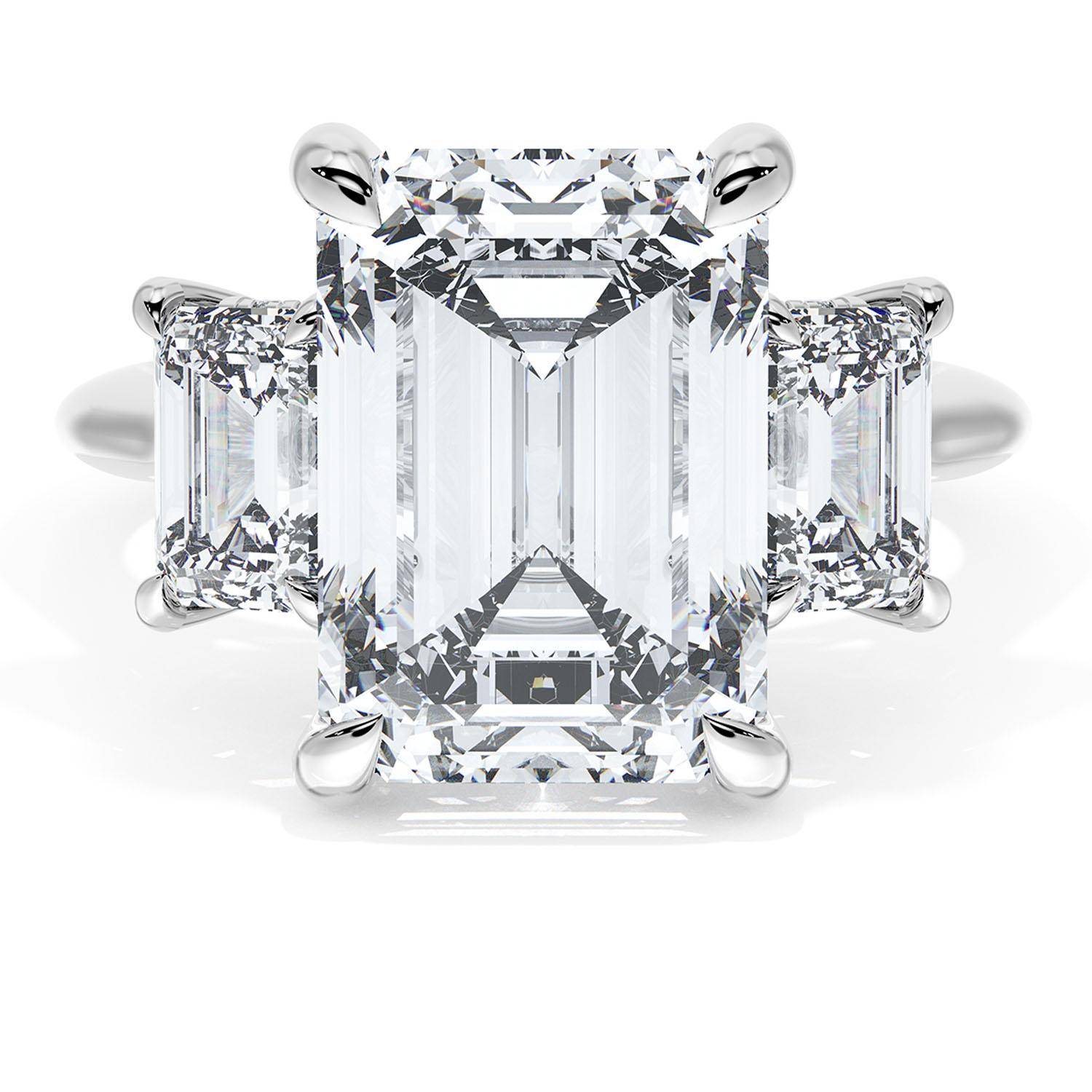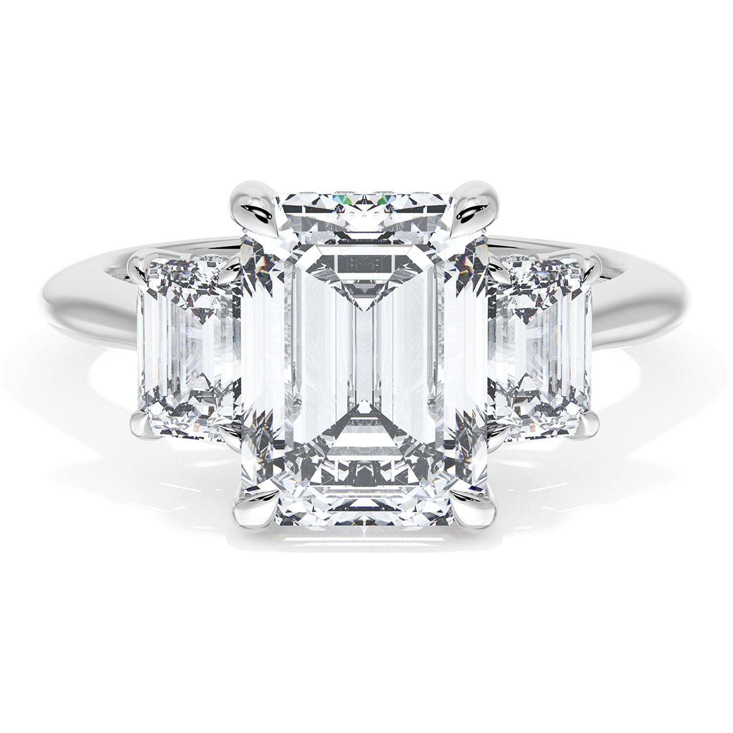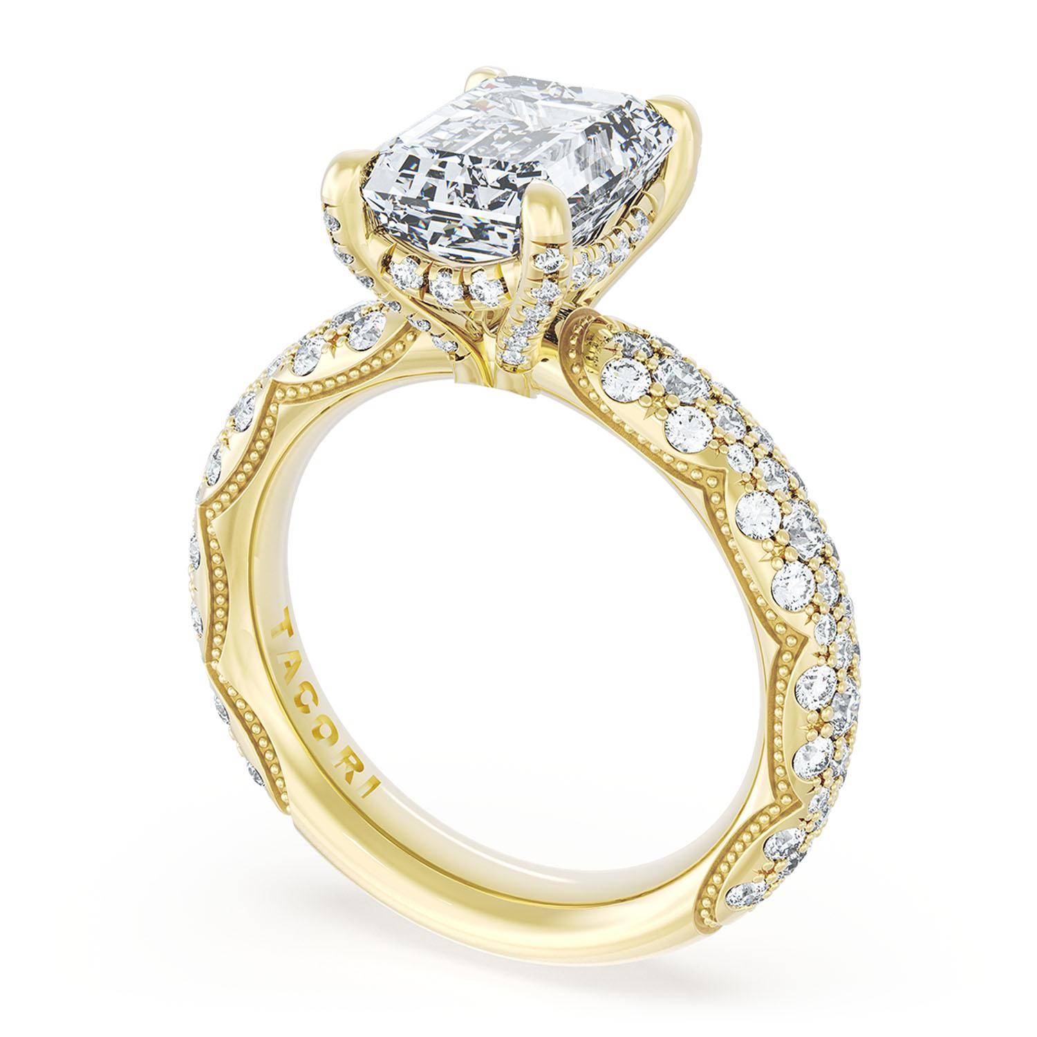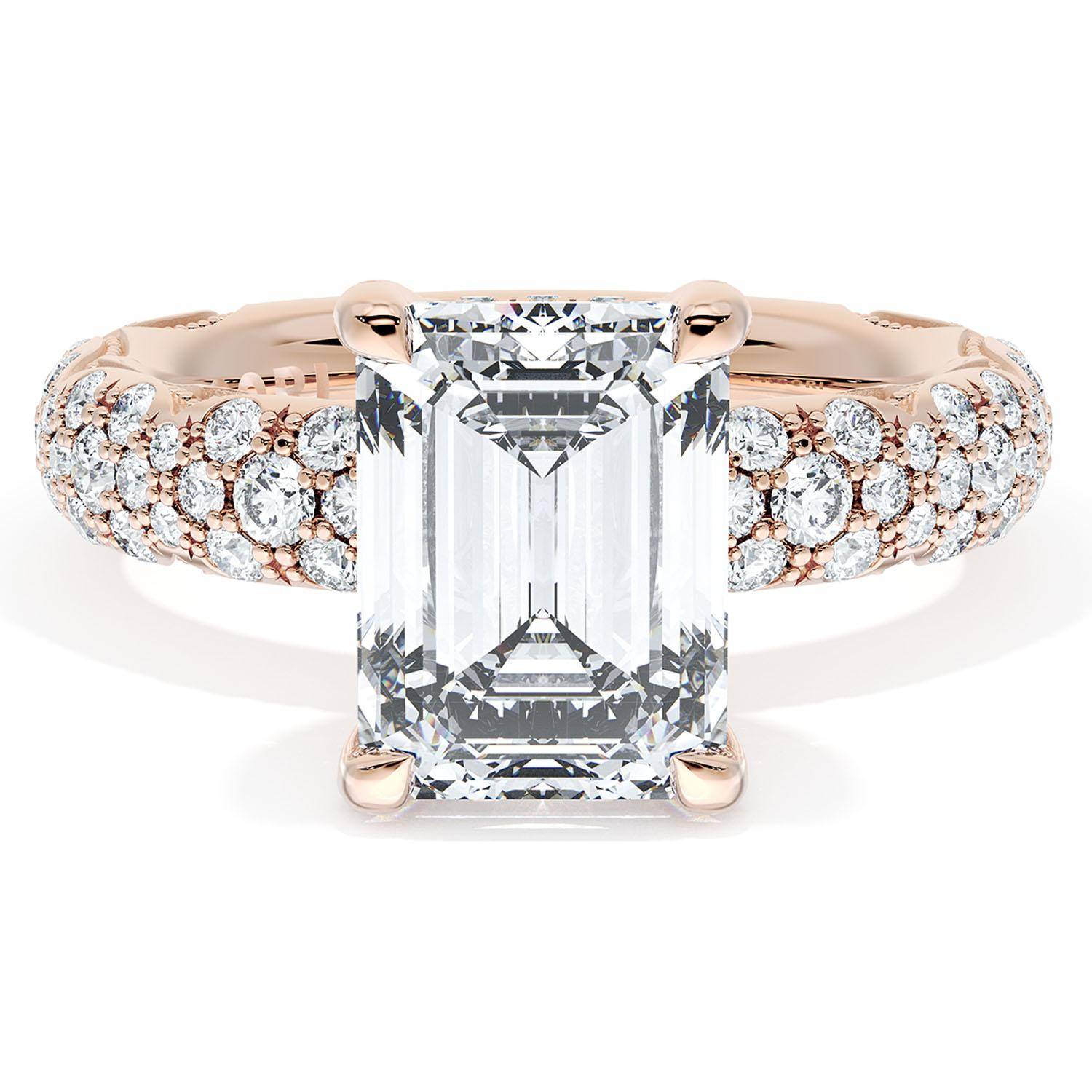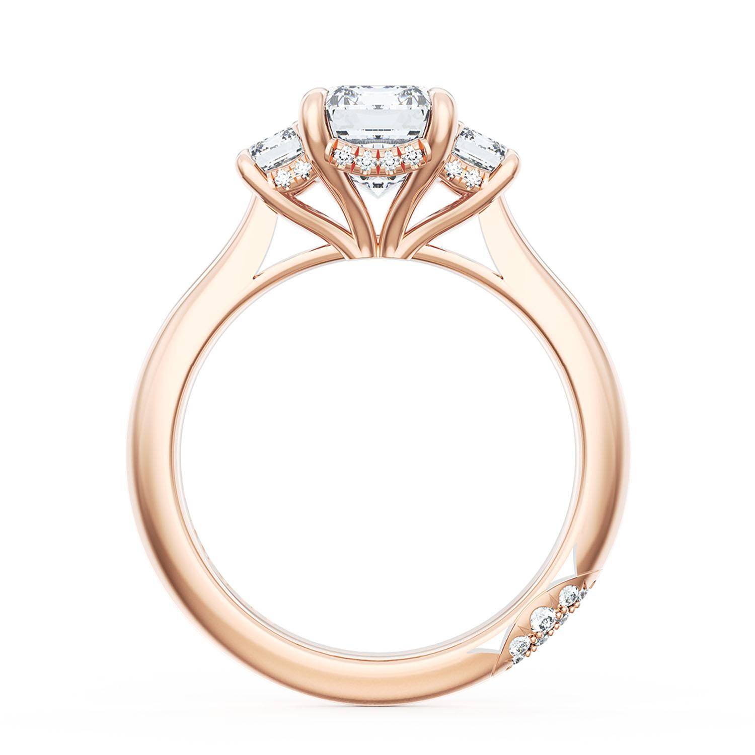 This 3-stone ring features an emerald center and matching emerald side stones, each accented with a hidden bloom. The Founder's Crescent Fabric wraps around the ceiling of the ring and continues for 3/4 diamond coverage.